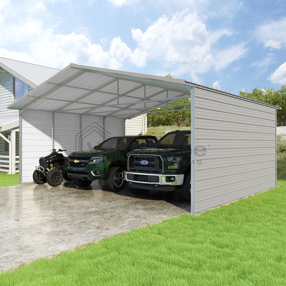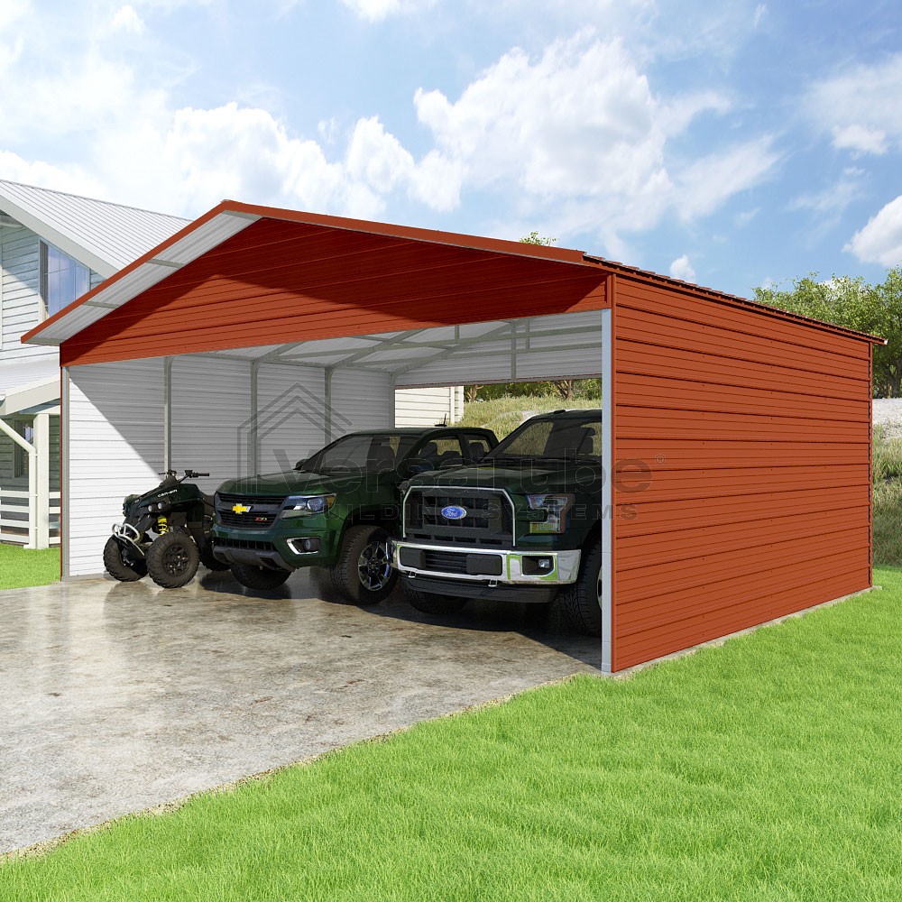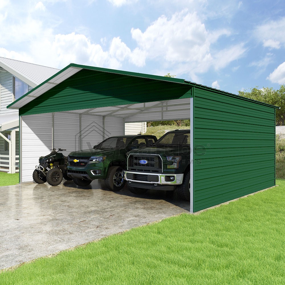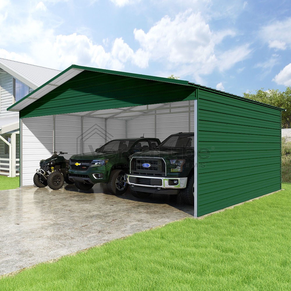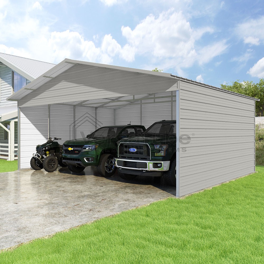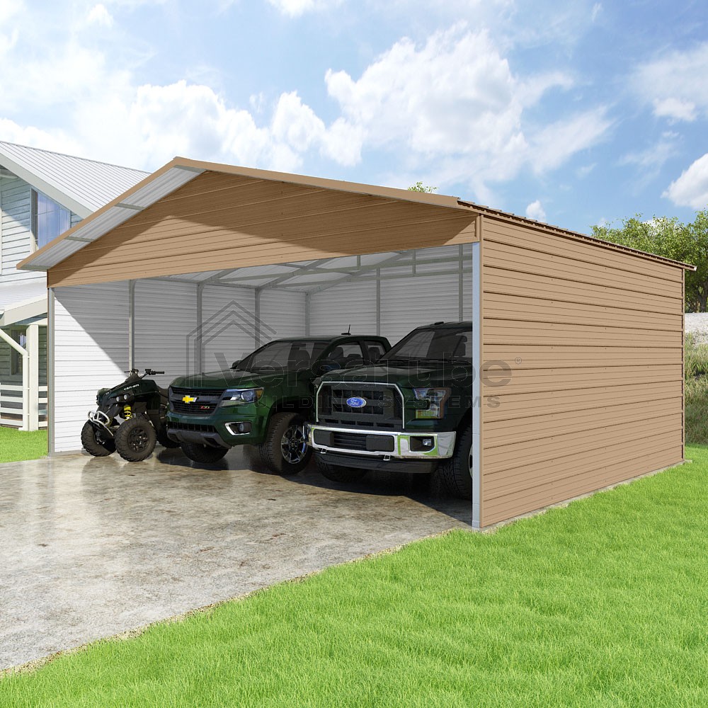 Pinnacle Series DIY carport kit features vertical sheet metal roof panels with ridge cap, gable and eave trim for an A-frame roof style and extended coverage on both ends.