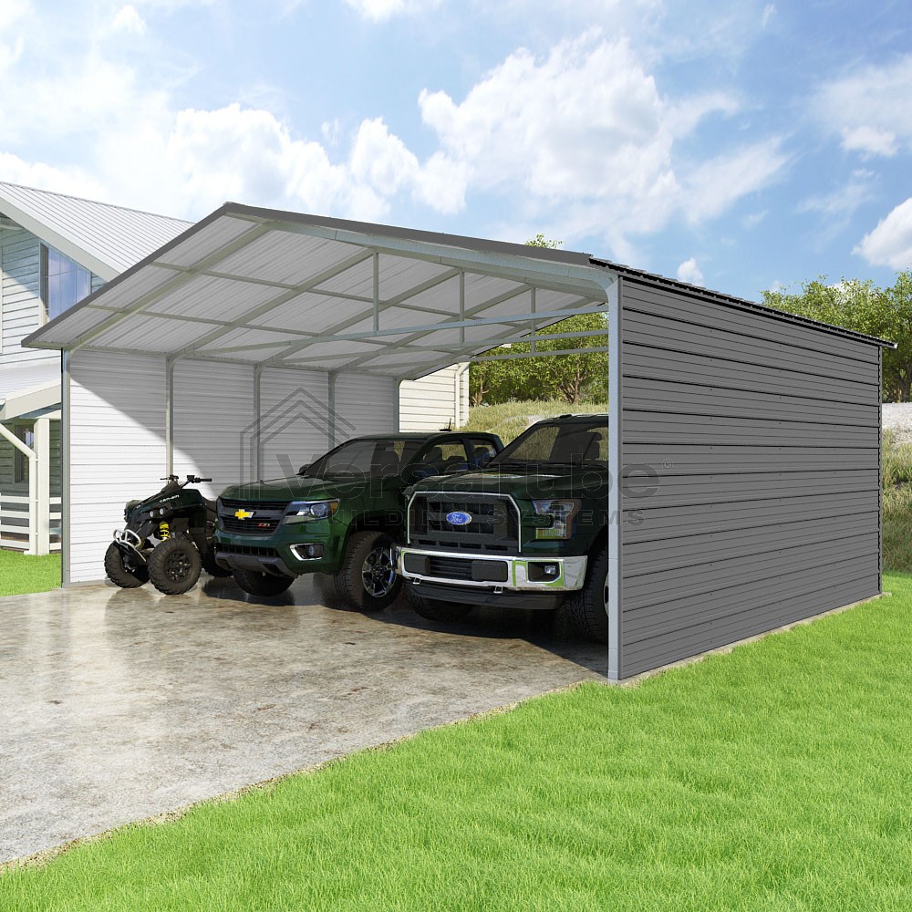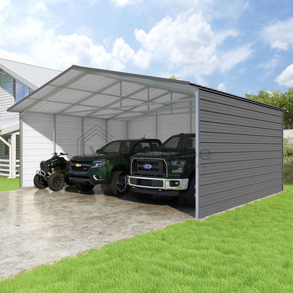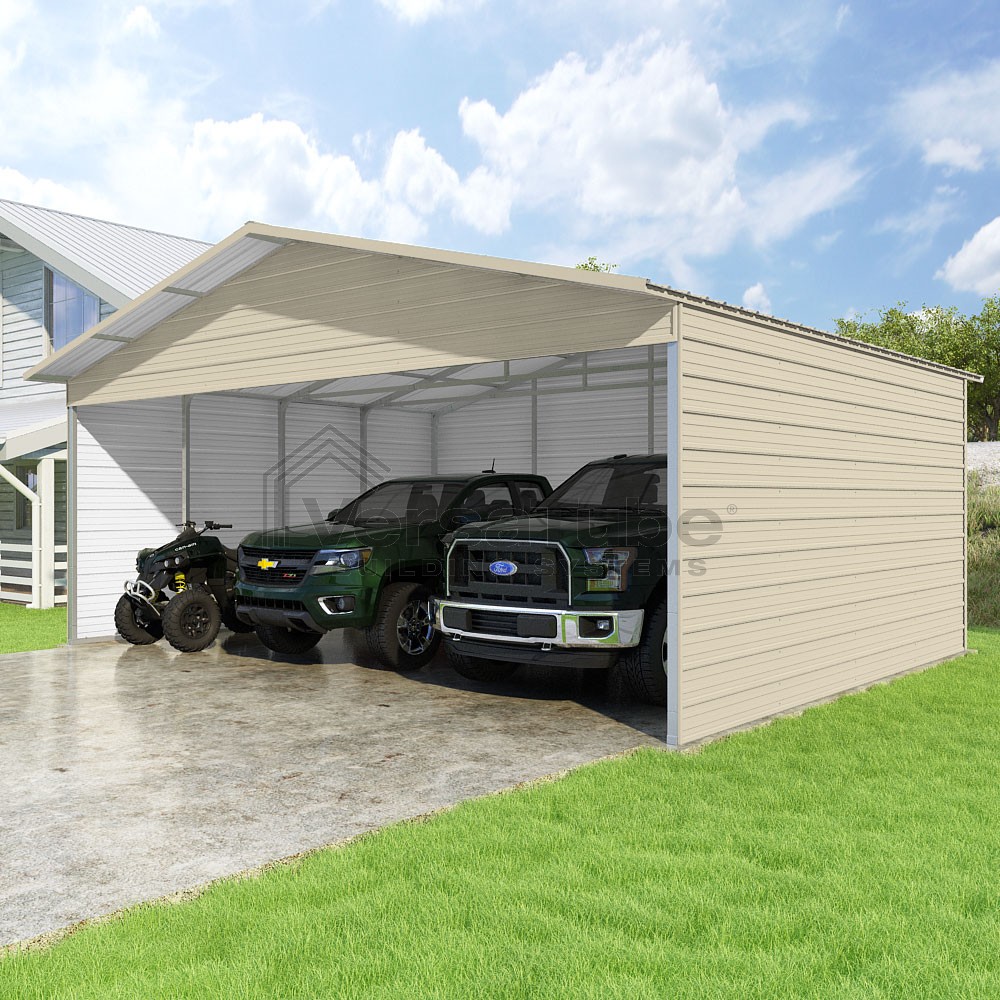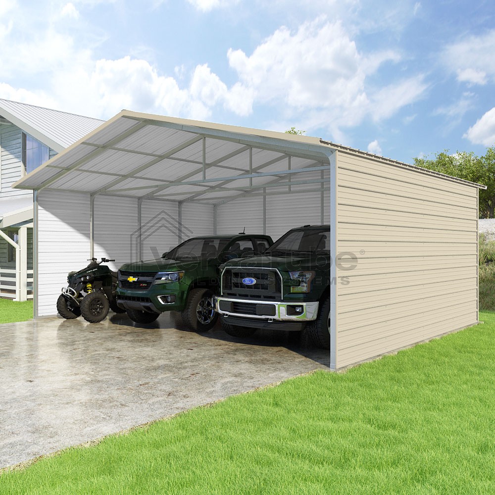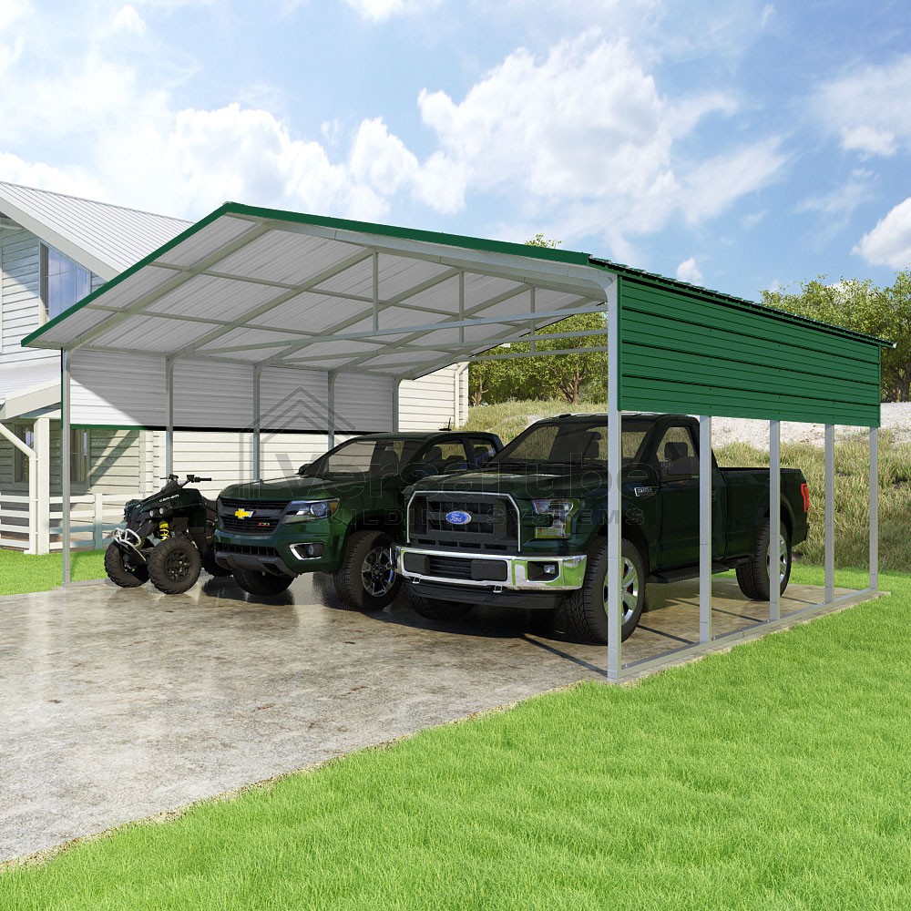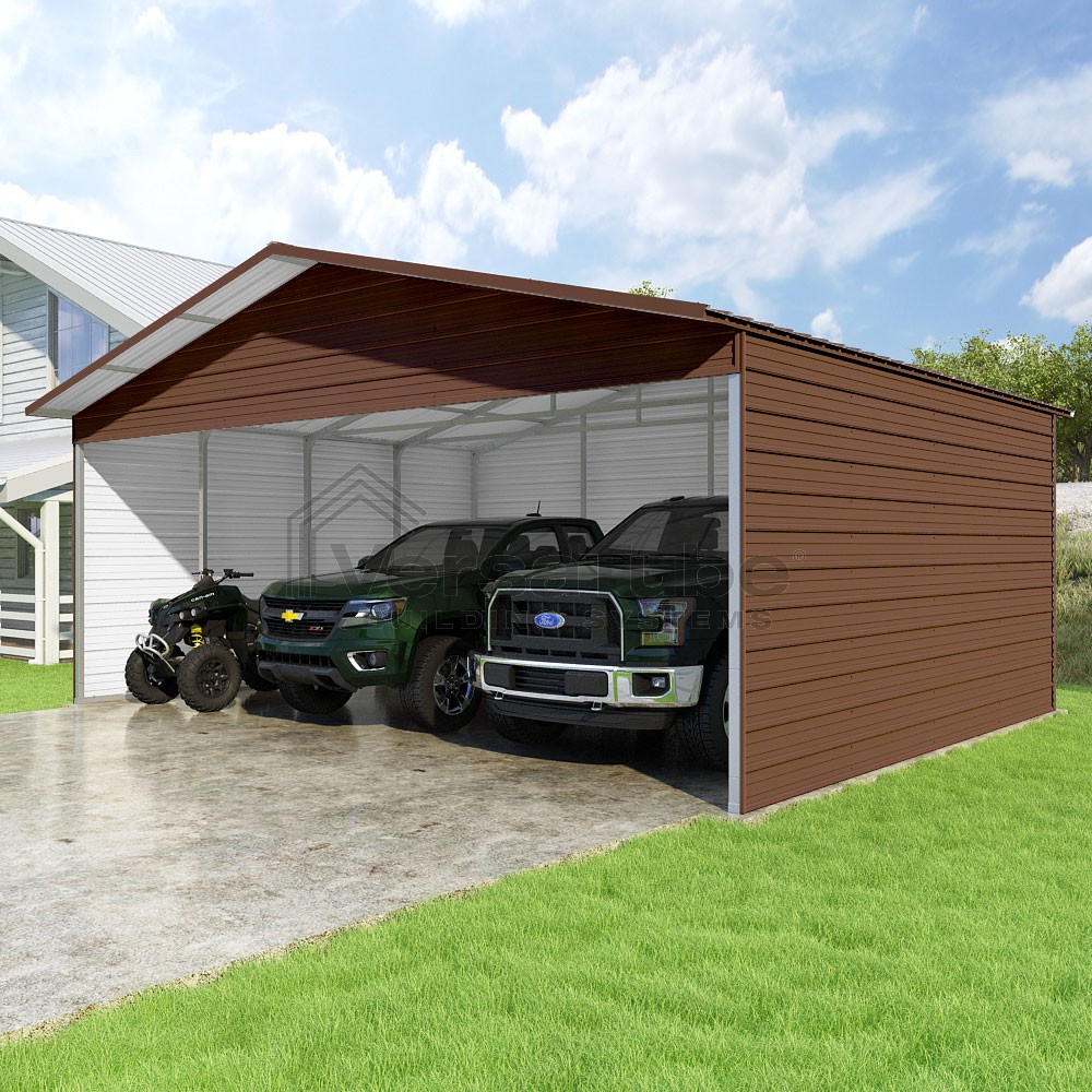 Pinnacle Series DIY carport kit features vertical sheet metal roof panels with ridge cap, gable and eave trim for an A-frame roof style and extended coverage on both ends.