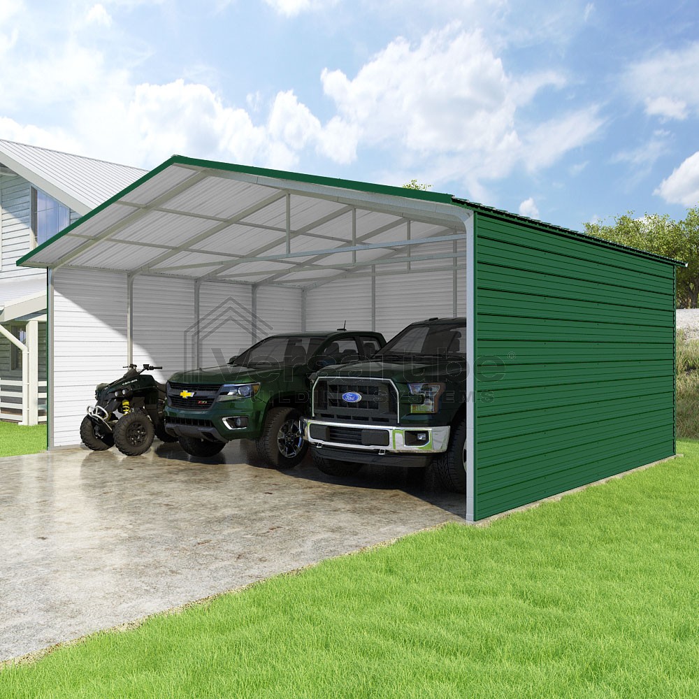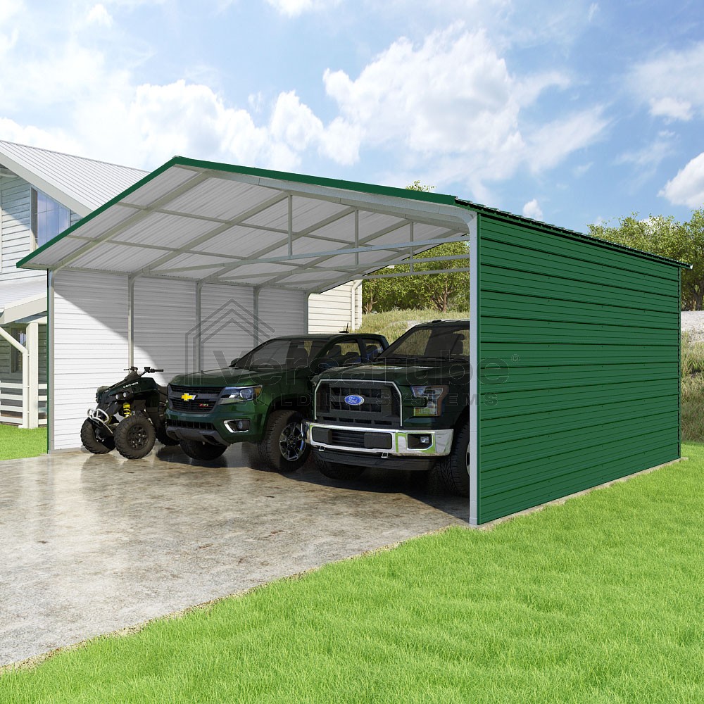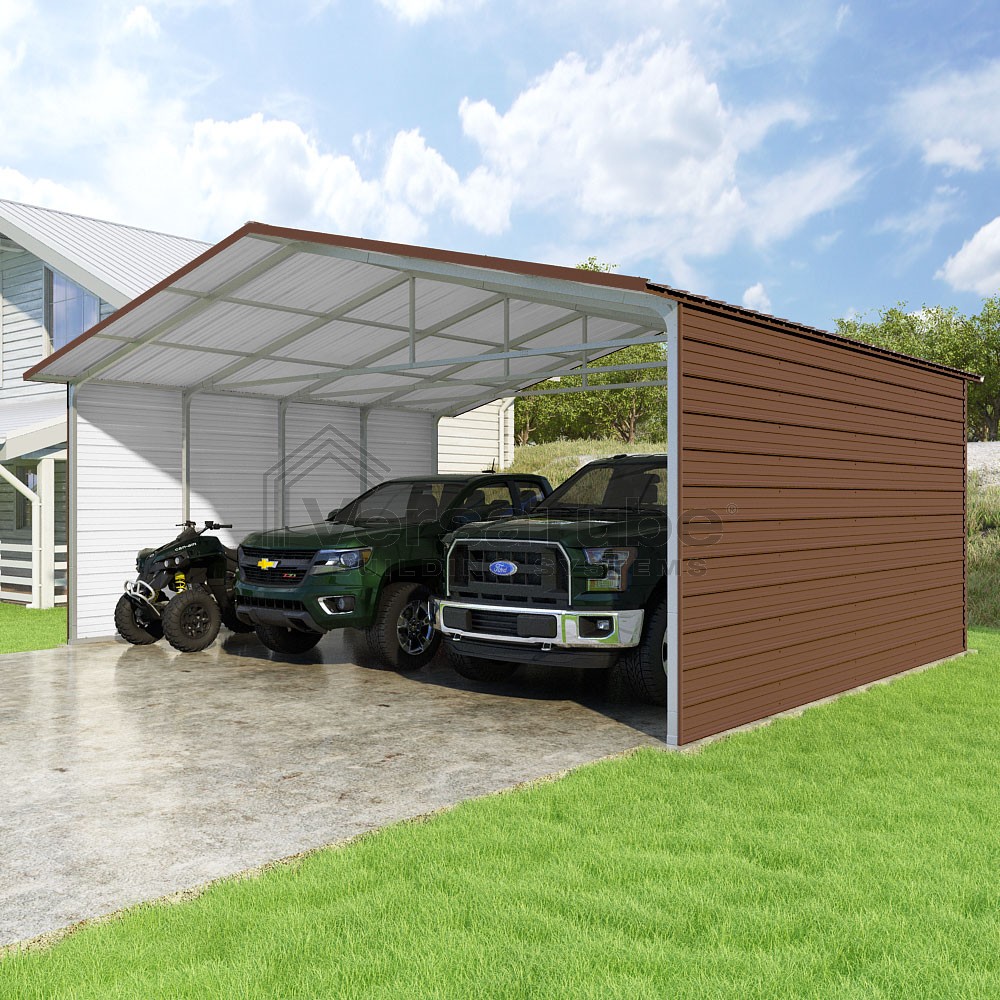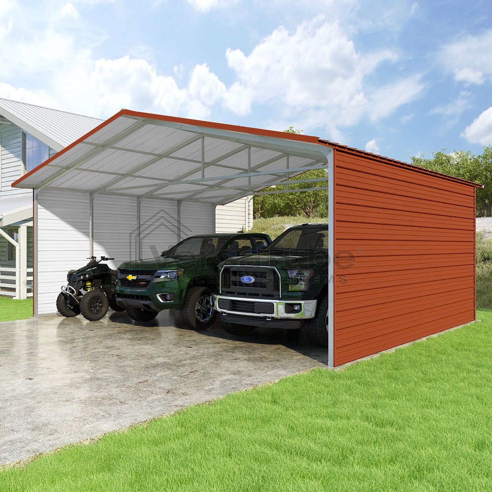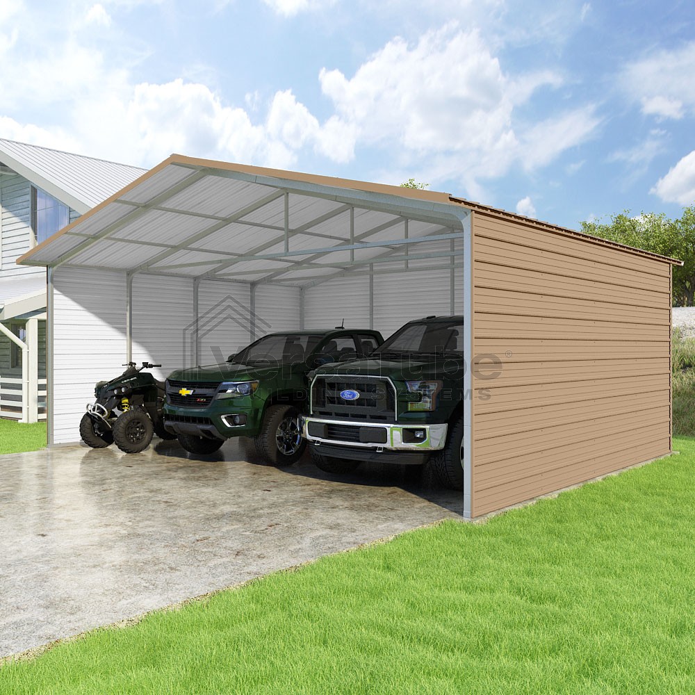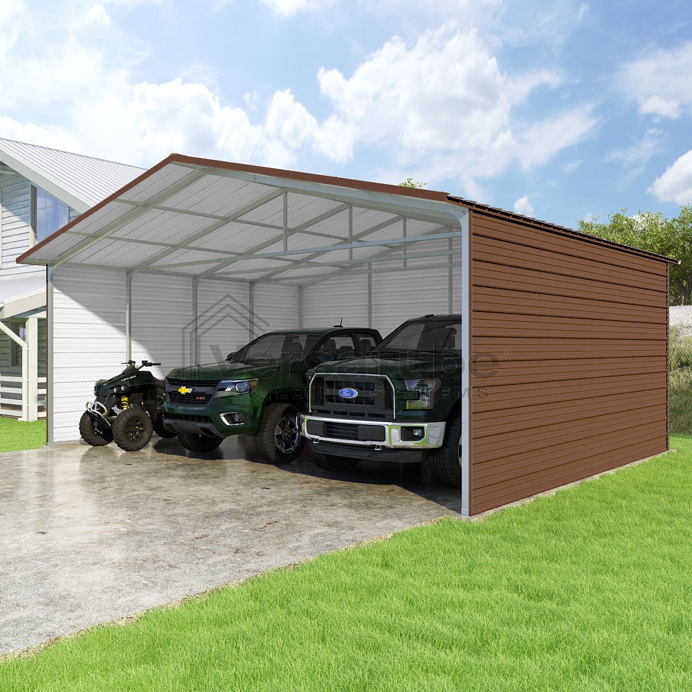 Pinnacle Series DIY carport kit features vertical sheet metal roof panels with ridge cap, gable and eave trim for an A-frame roof style and extended coverage on both ends.