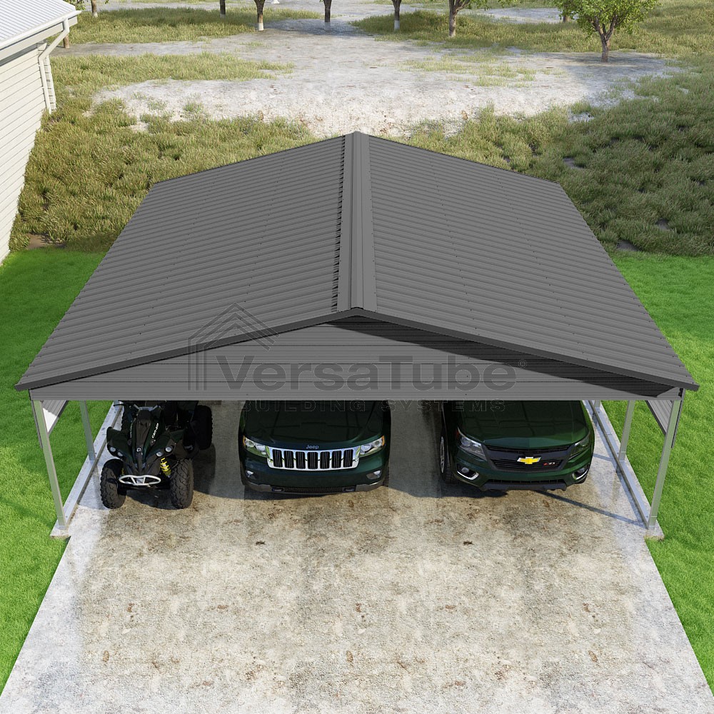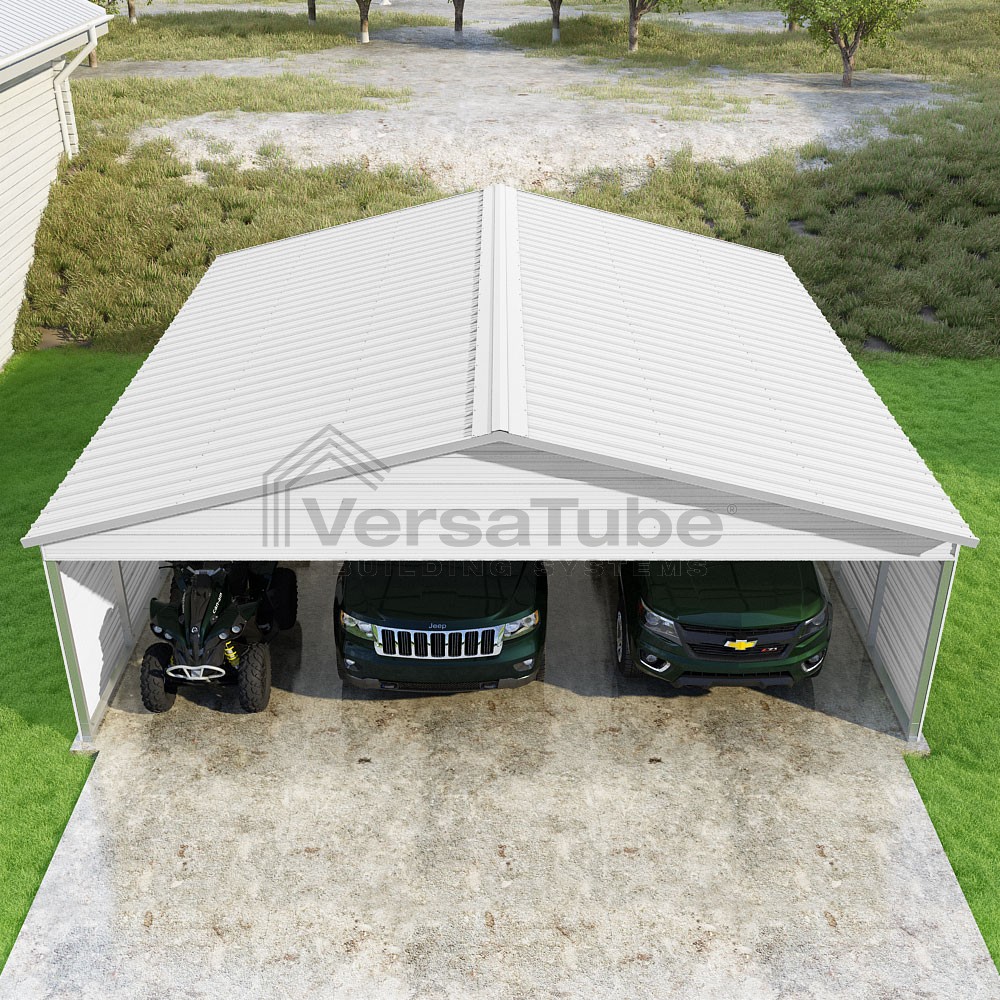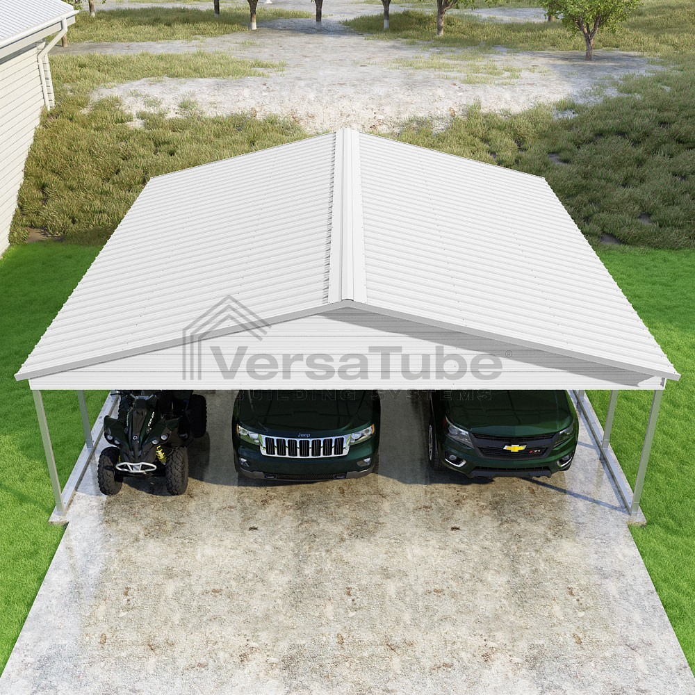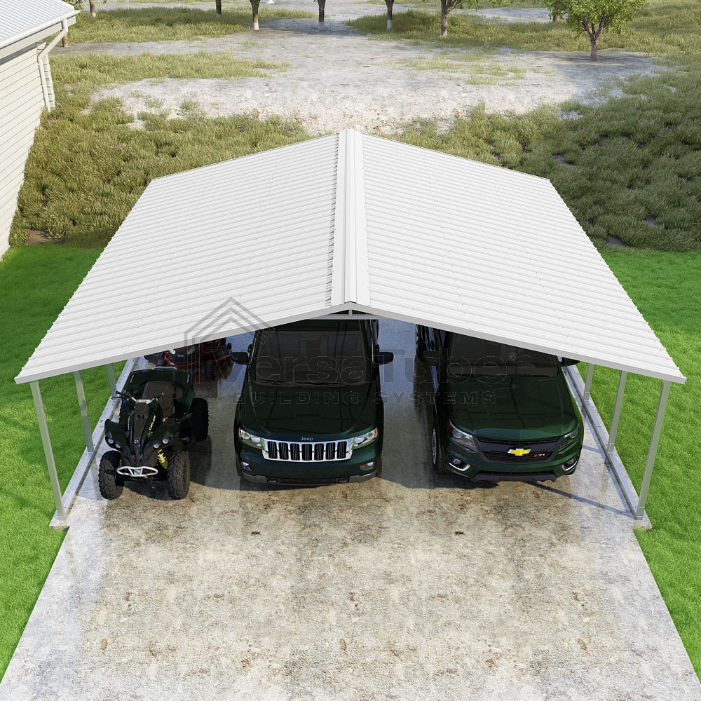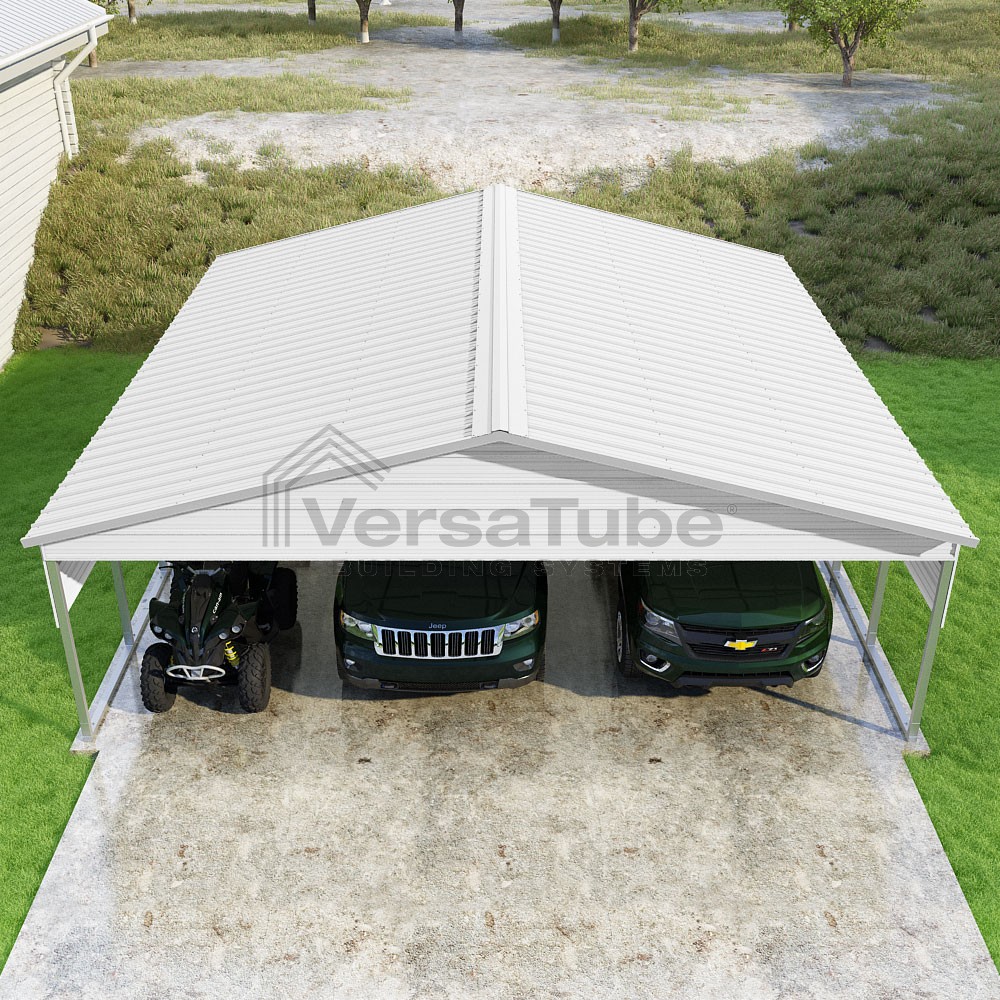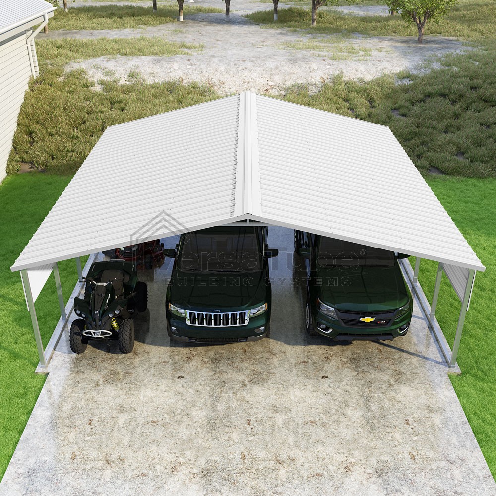 Pinnacle Series DIY carport kit features vertical sheet metal roof panels with ridge cap, gable and eave trim for an A-frame roof style and extended coverage on both ends.