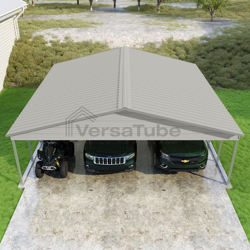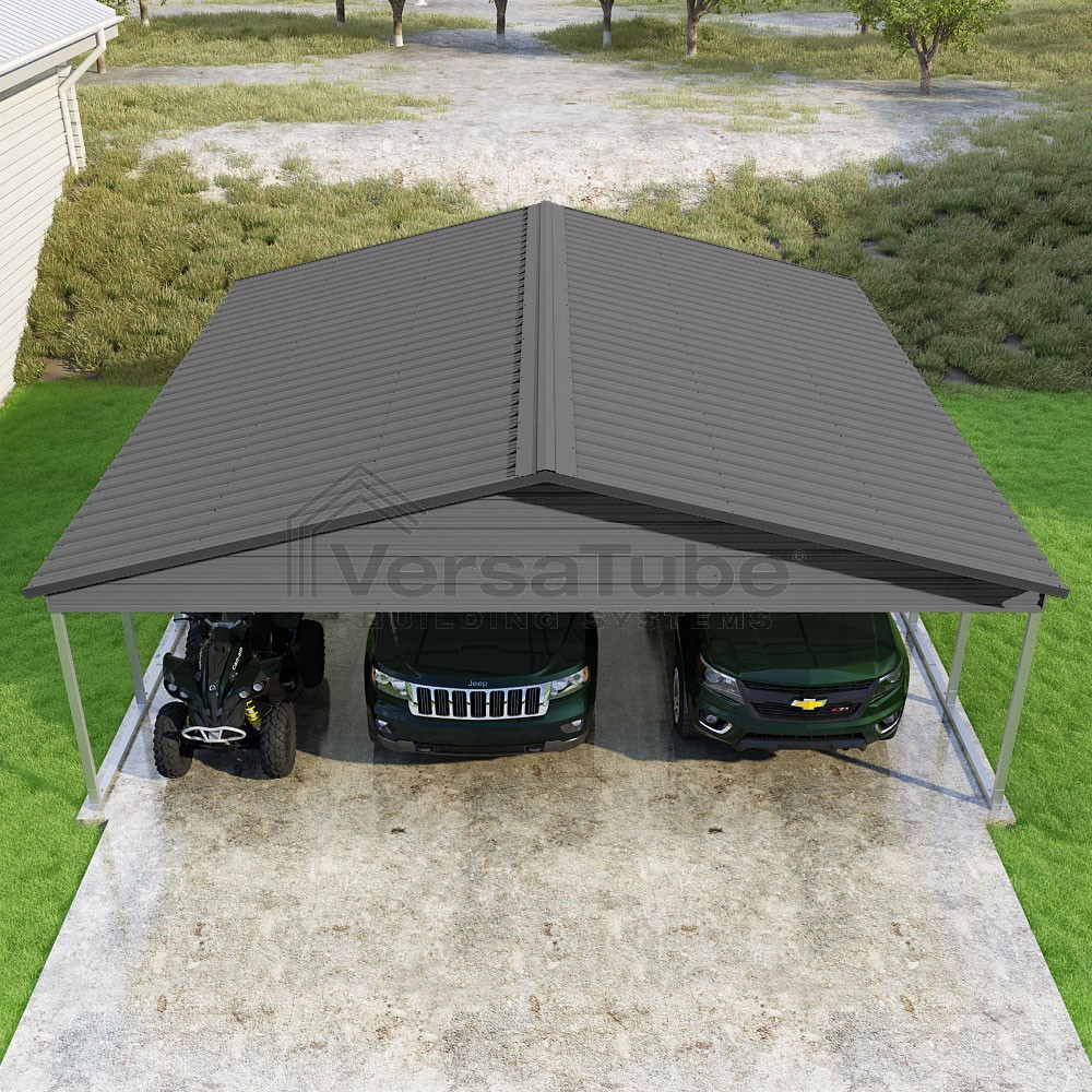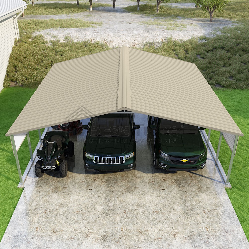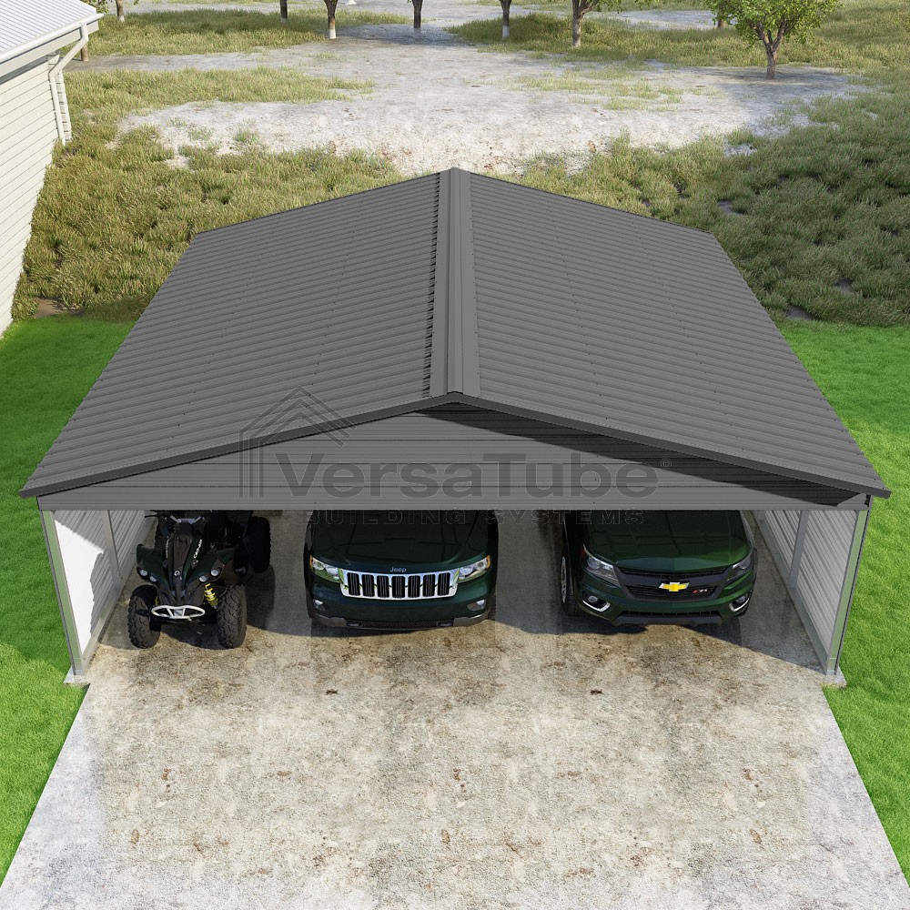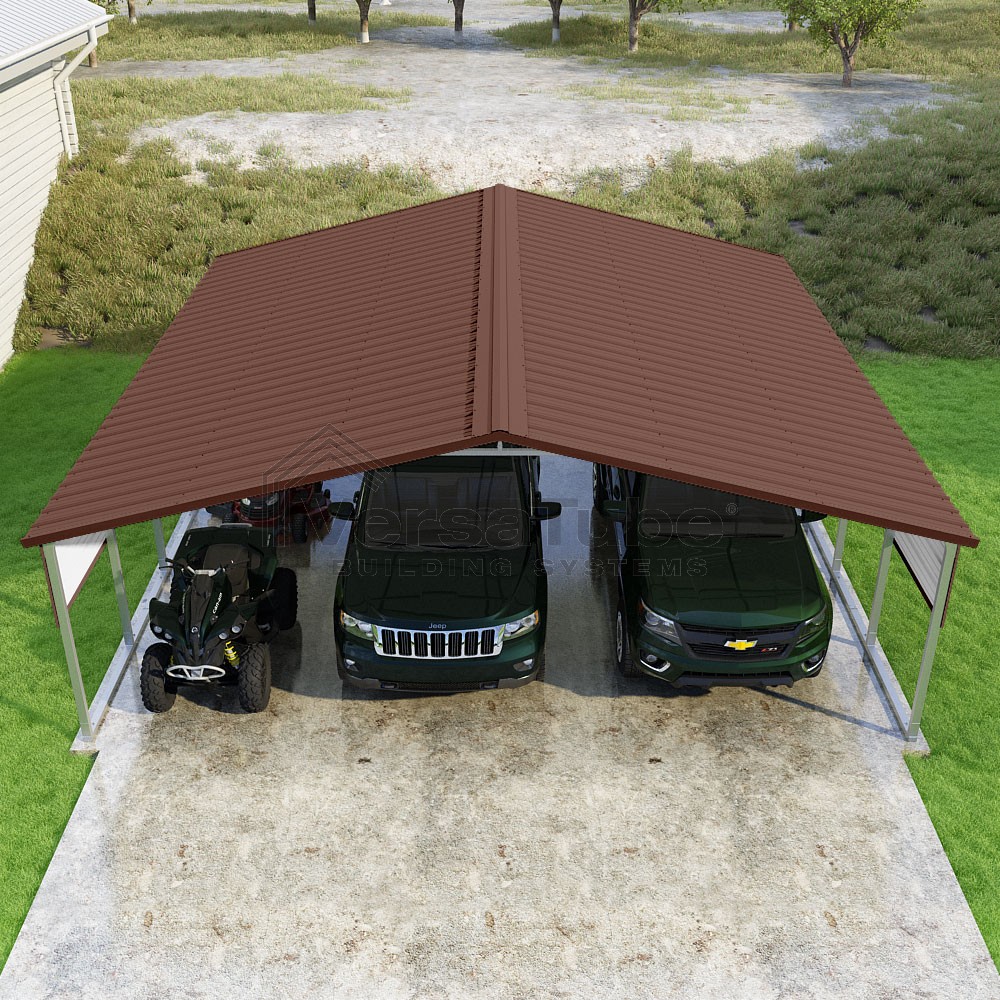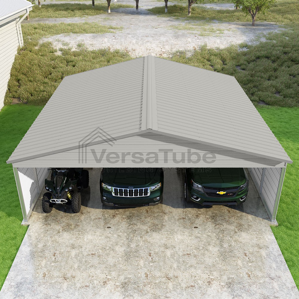 Pinnacle Series DIY carport kit features vertical sheet metal roof panels with ridge cap, gable and eave trim for an A-frame roof style and extended coverage on both ends.