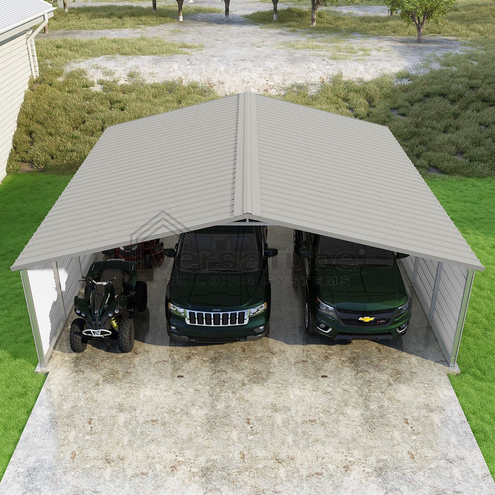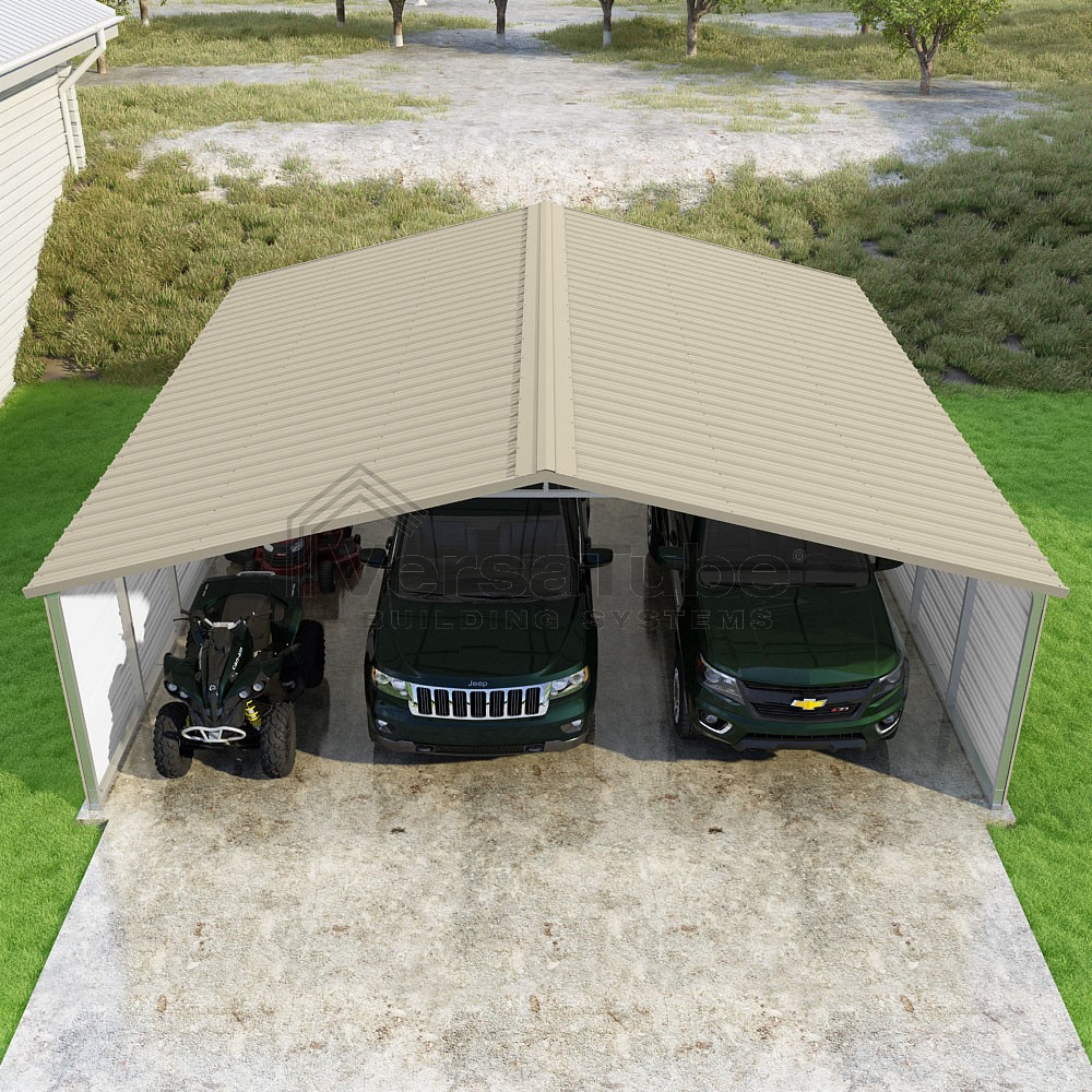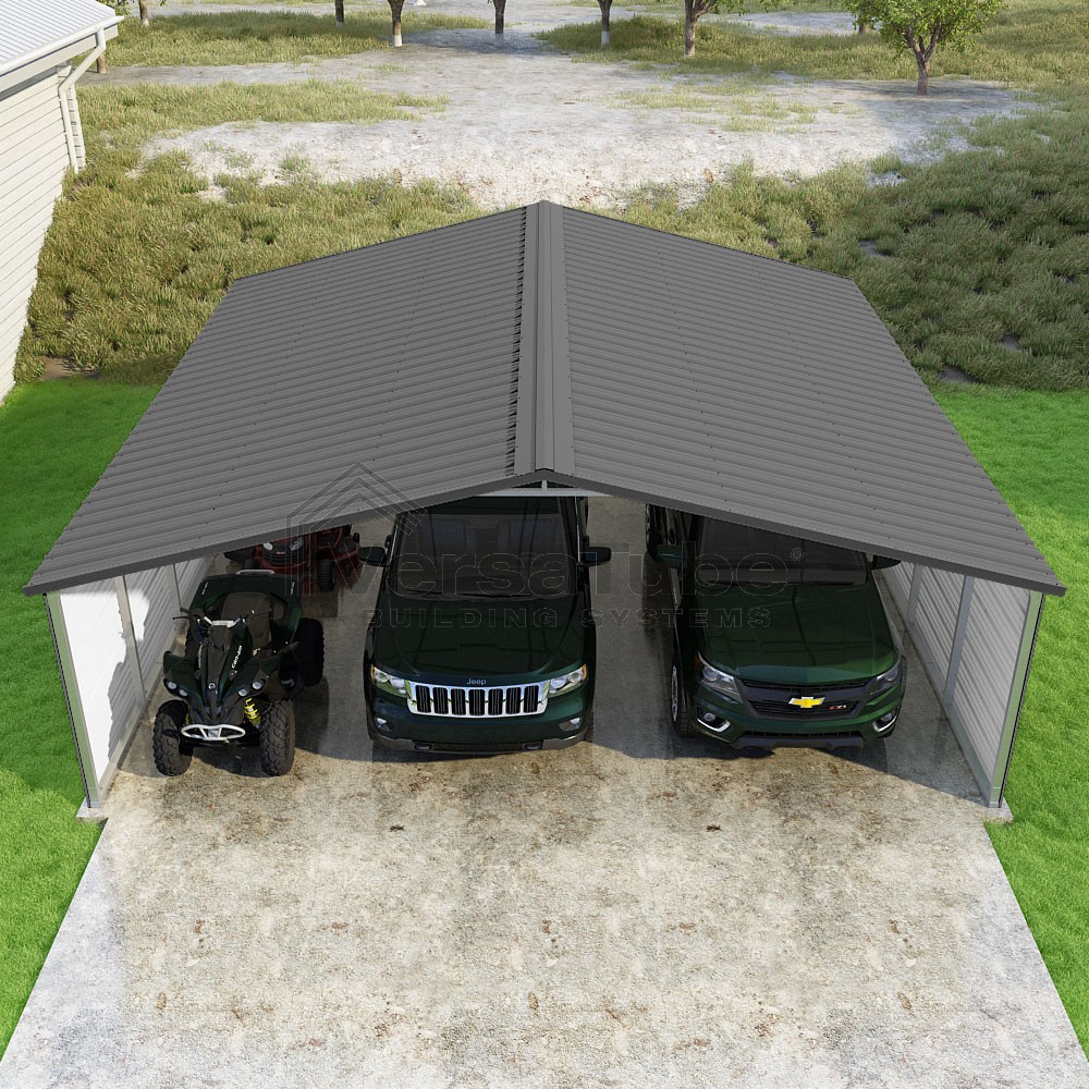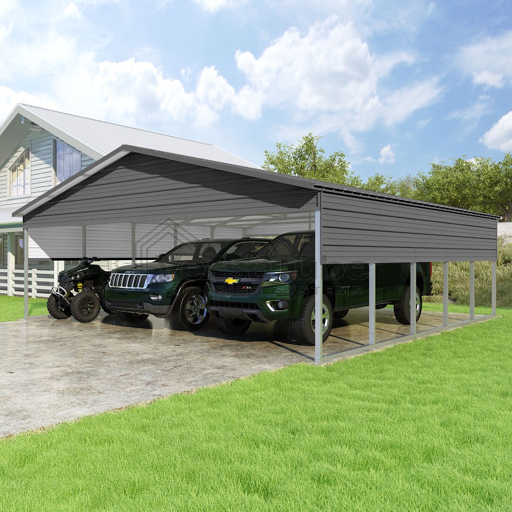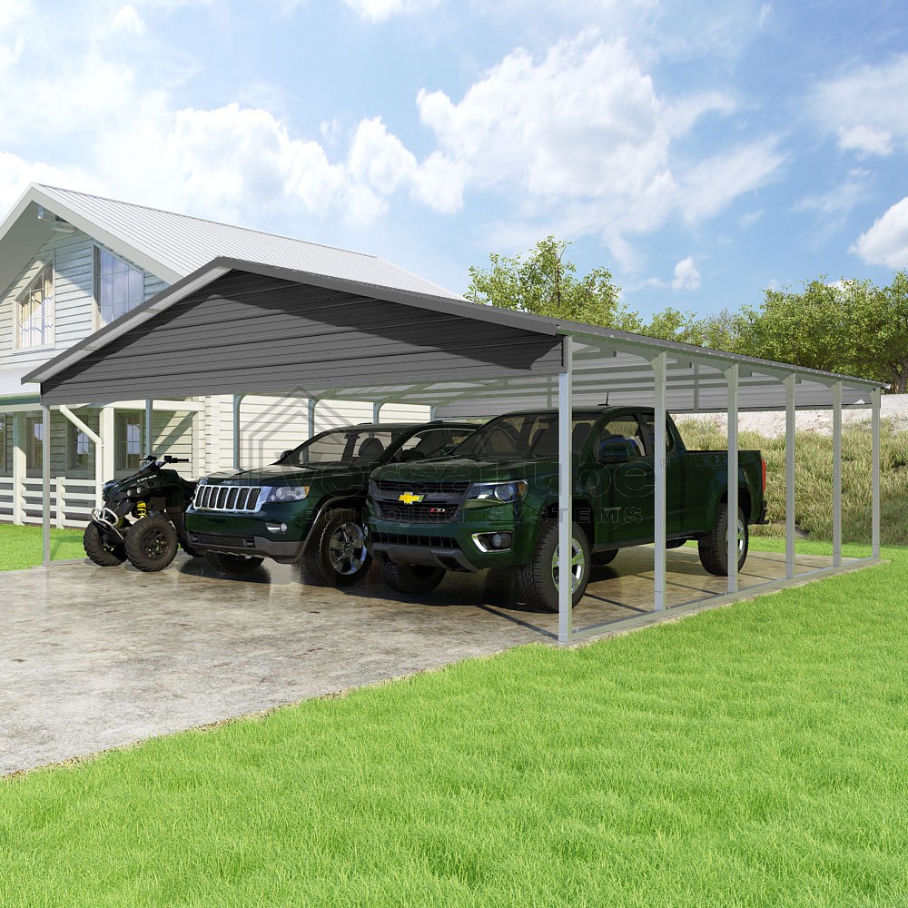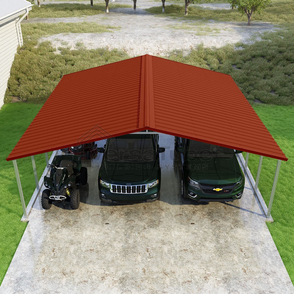 Pinnacle Series DIY carport kit features vertical sheet metal roof panels with ridge cap, gable and eave trim for an A-frame roof style and extended coverage on both ends.