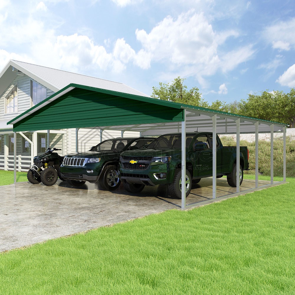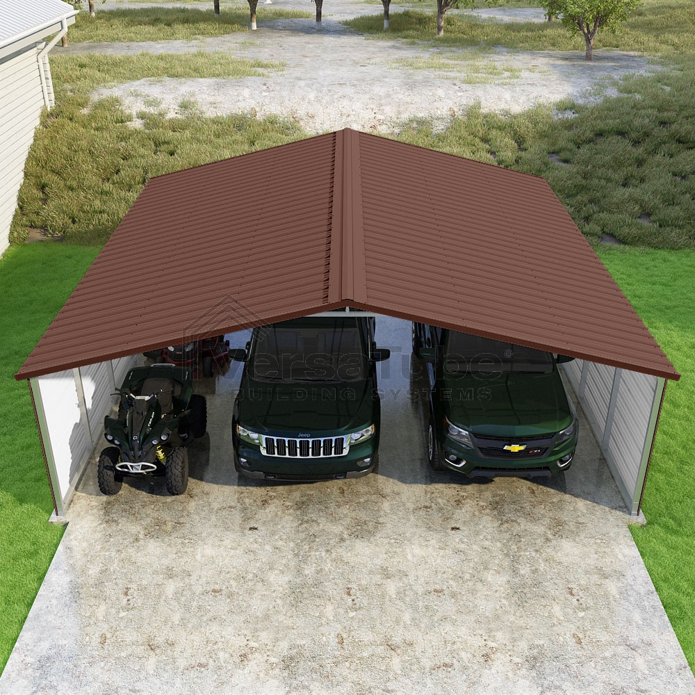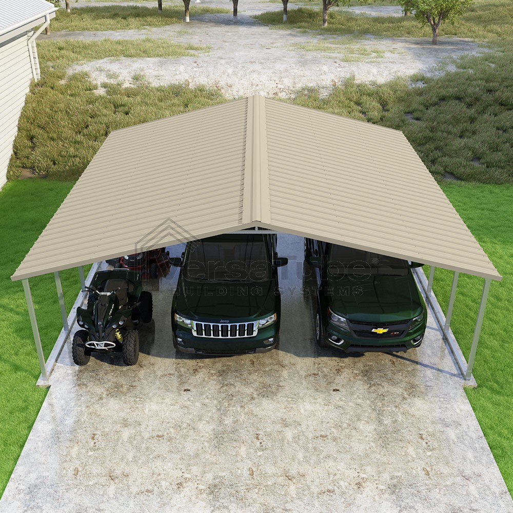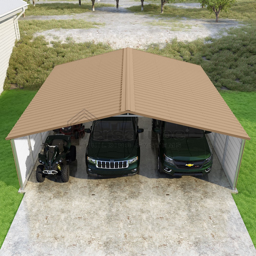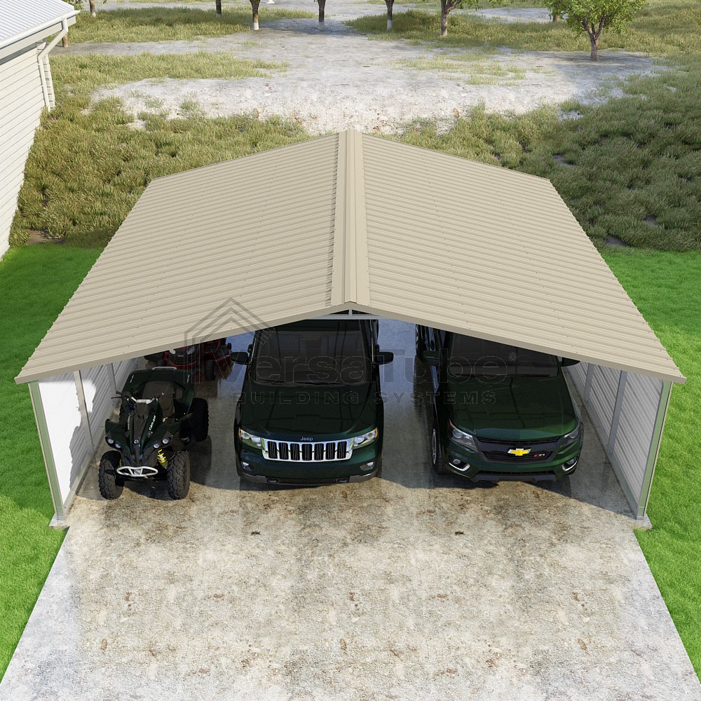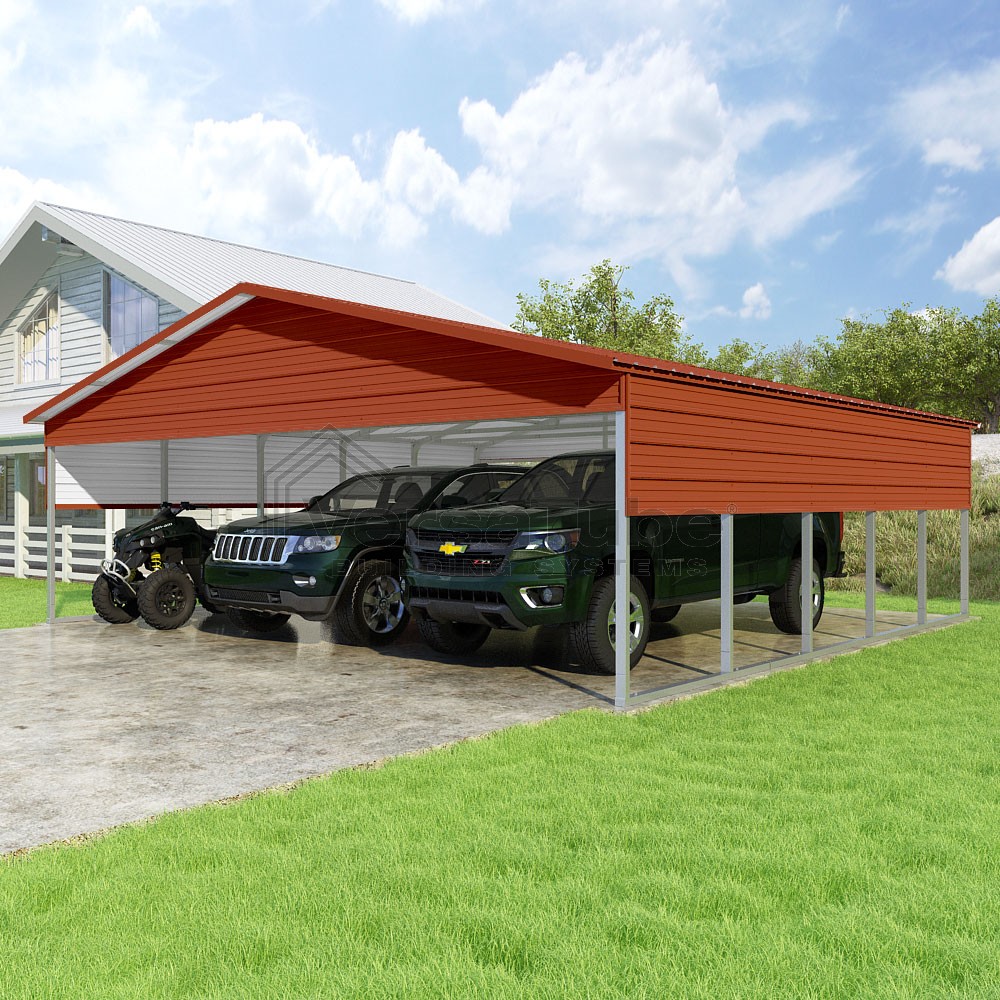 Pinnacle Series DIY carport kit features vertical sheet metal roof panels with ridge cap, gable and eave trim for an A-frame roof style and extended coverage on both ends.