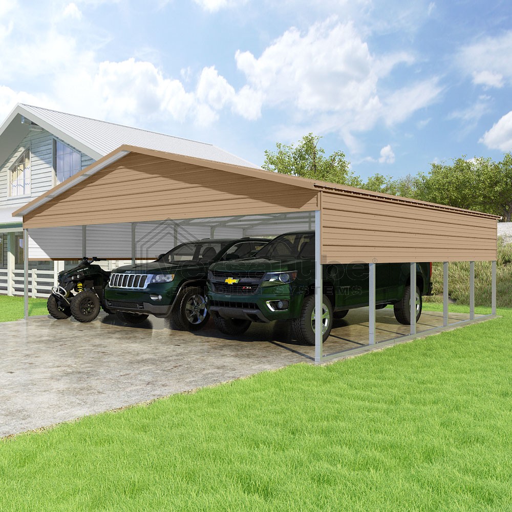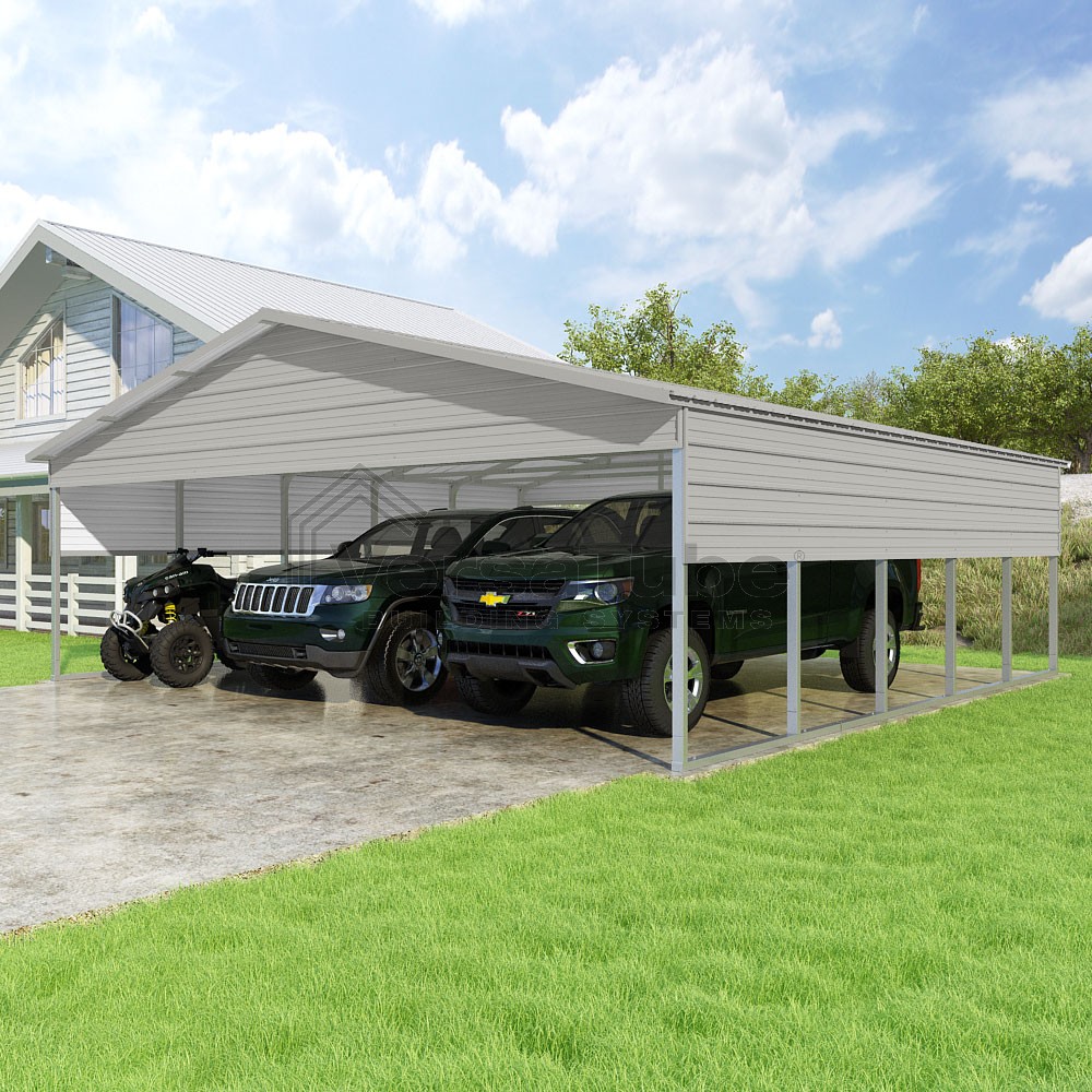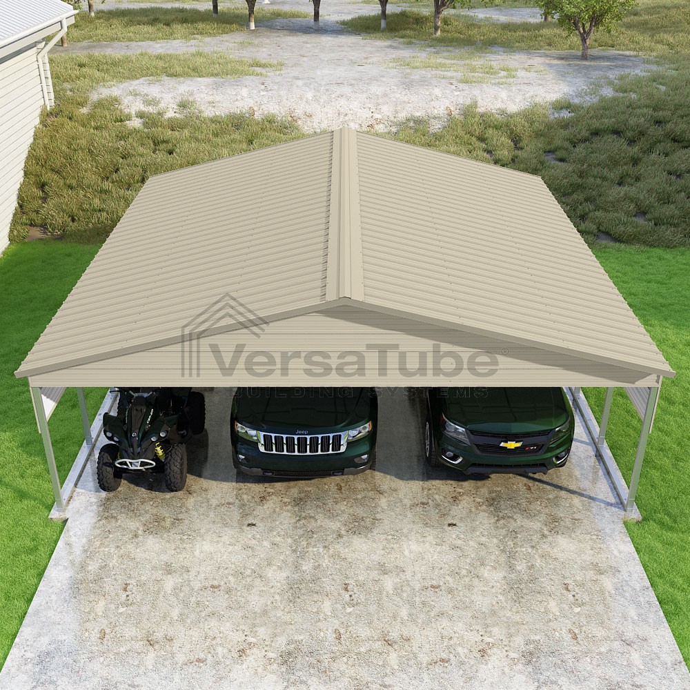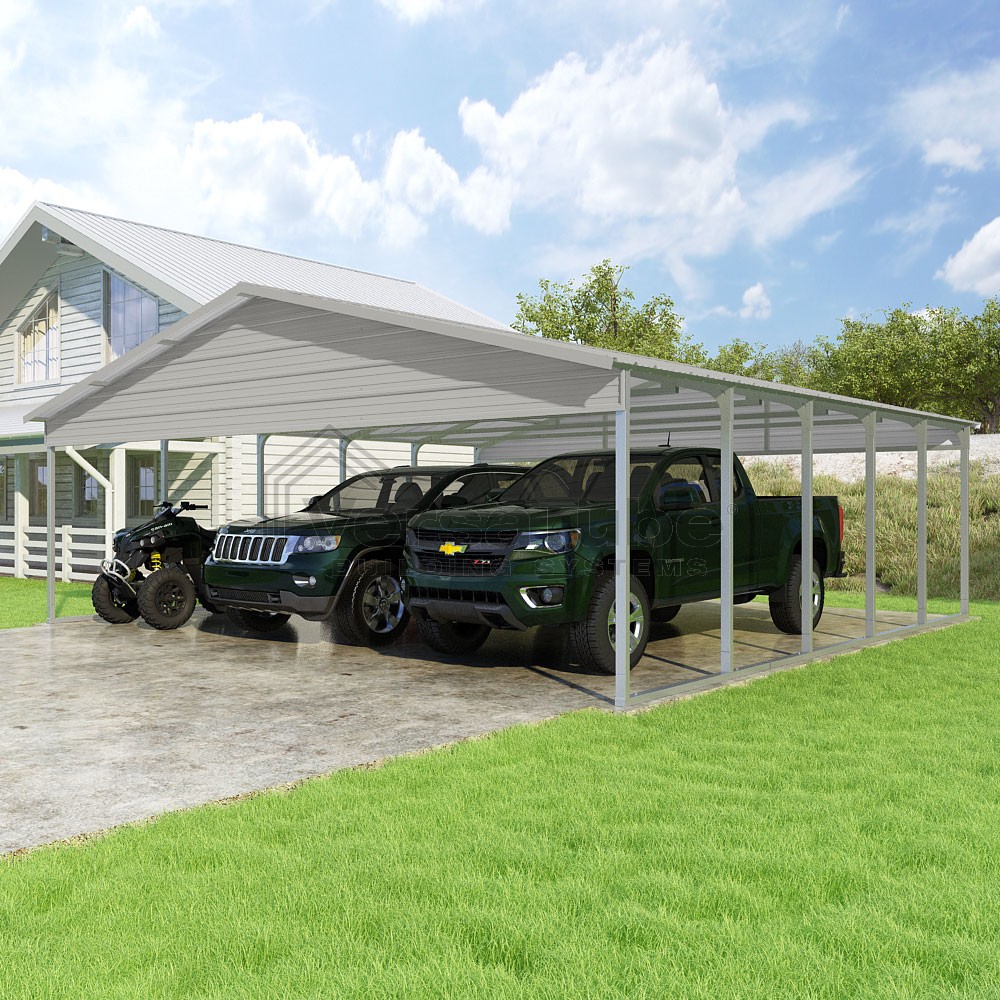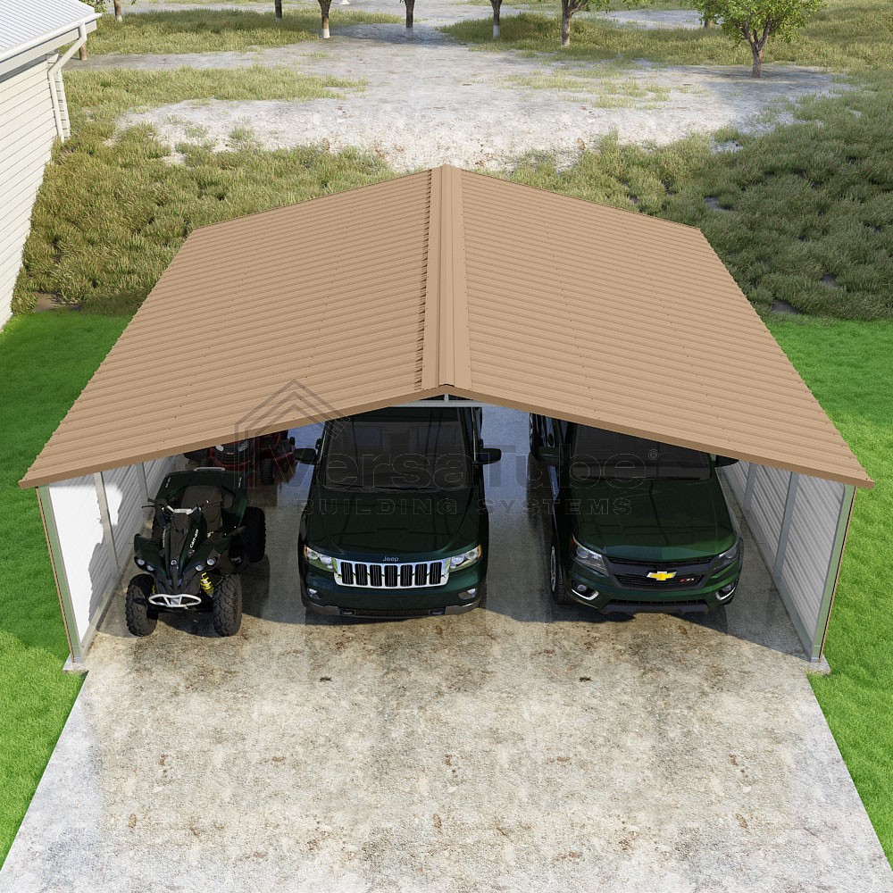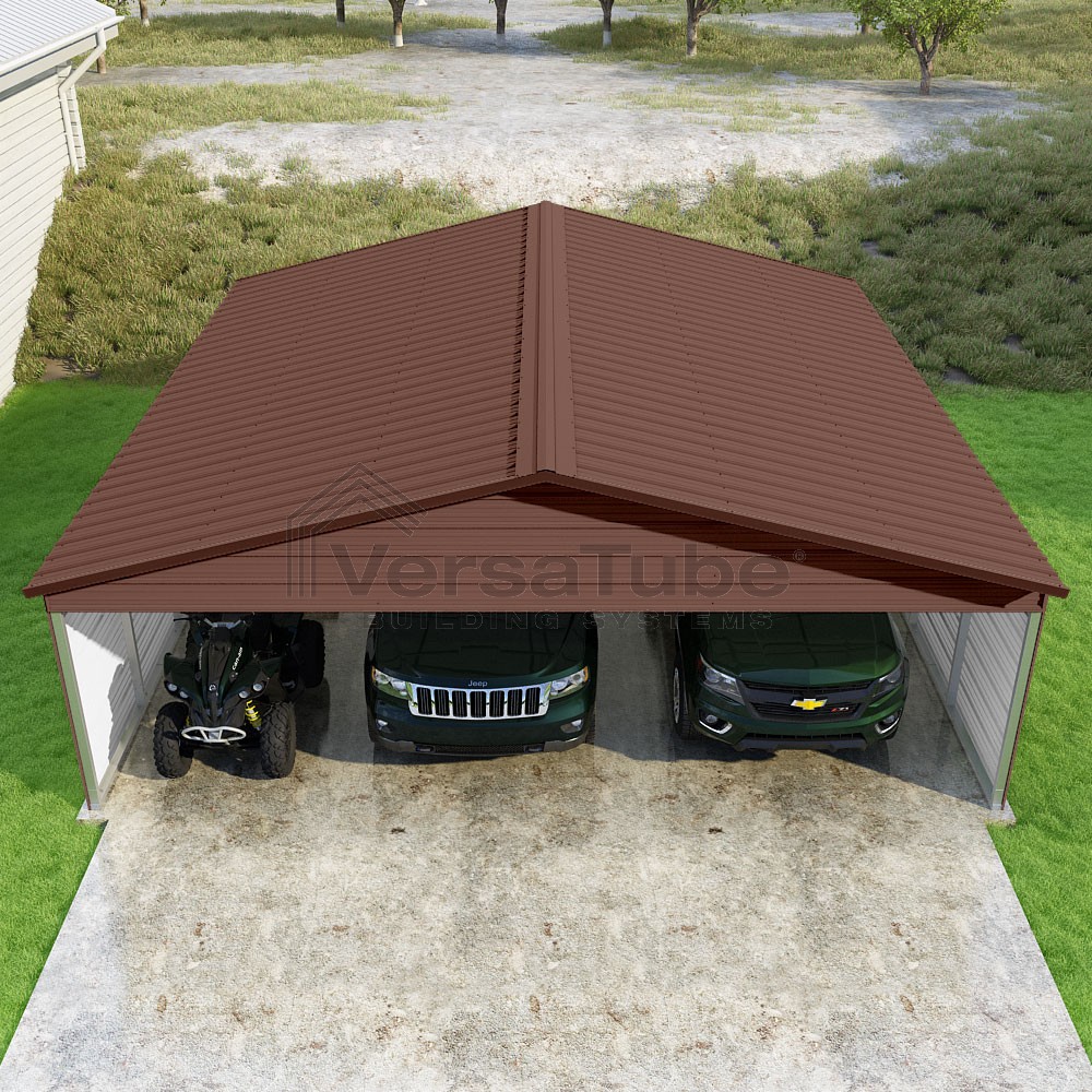 Pinnacle Series DIY carport kit features vertical sheet metal roof panels with ridge cap, gable and eave trim for an A-frame roof style and extended coverage on both ends.