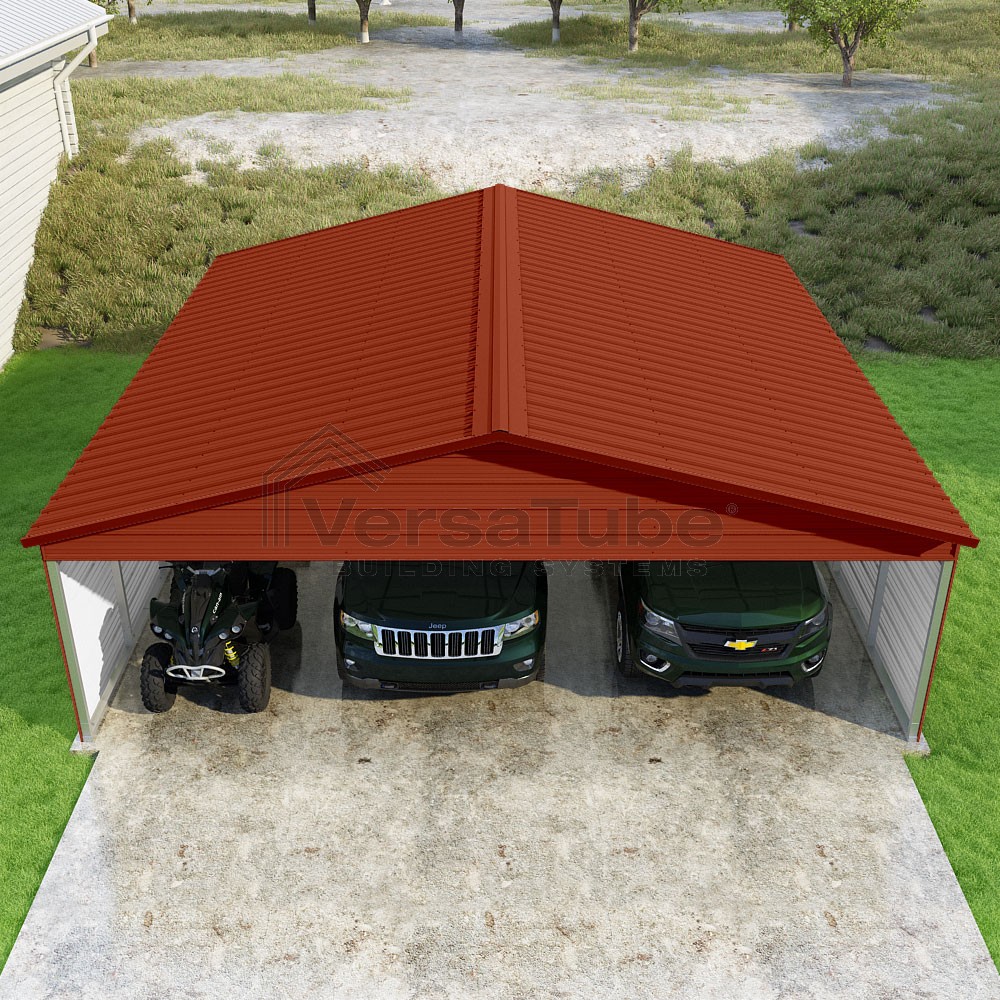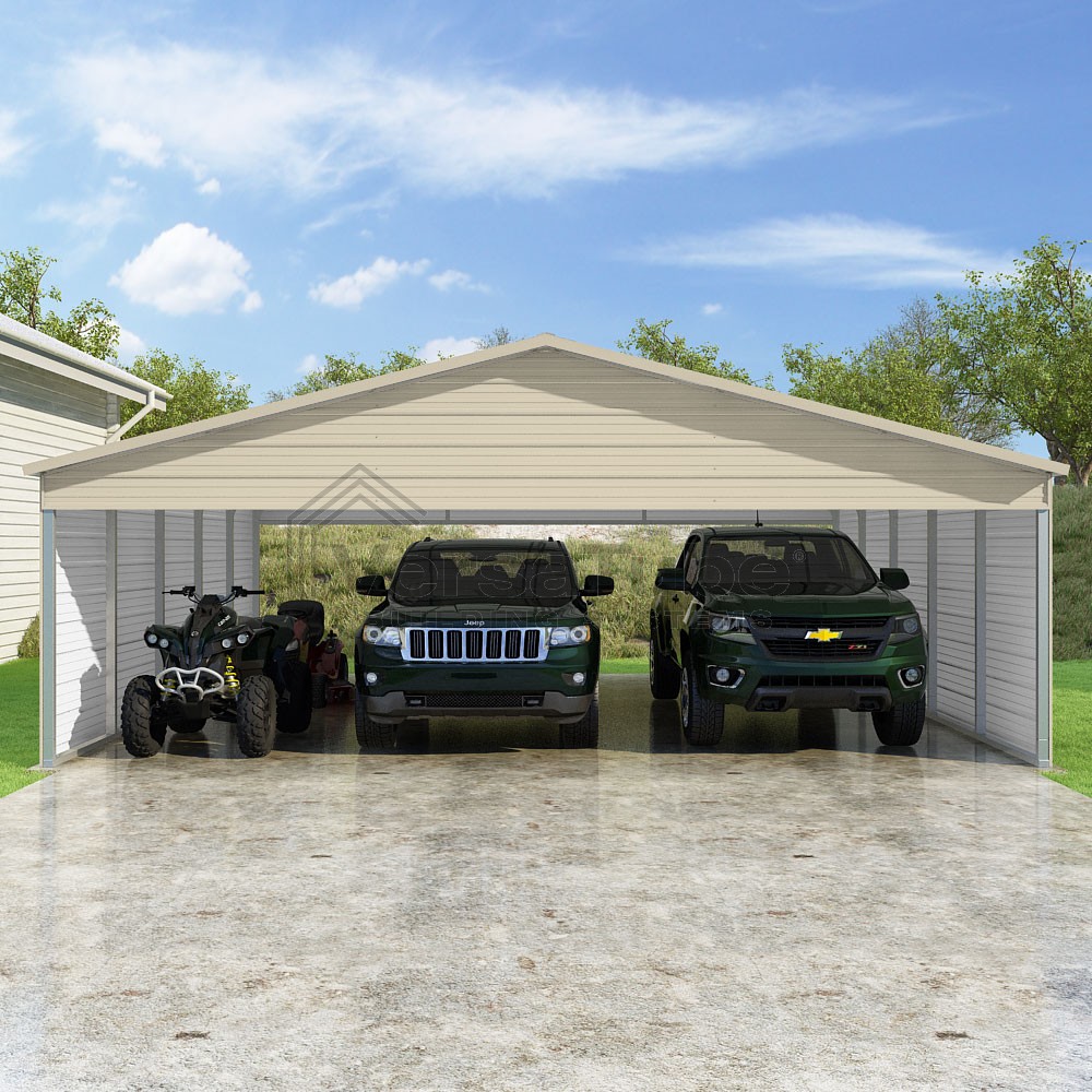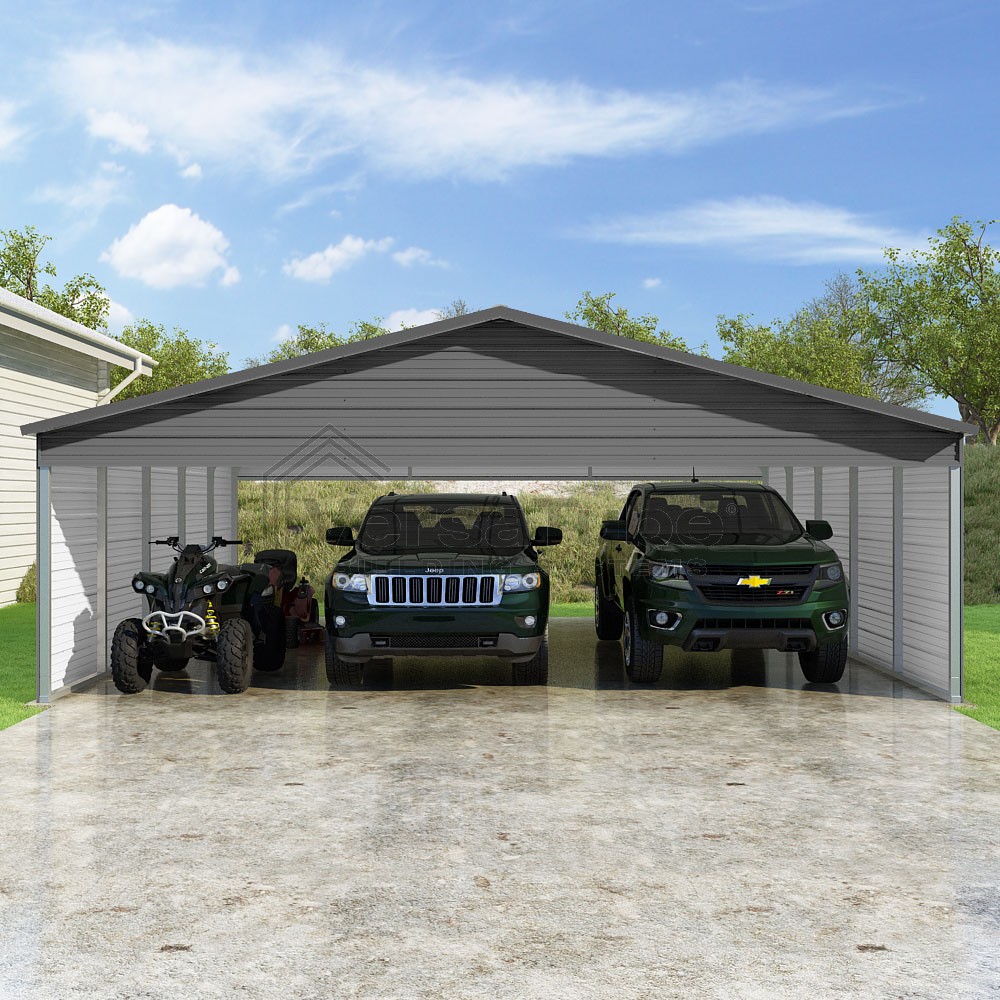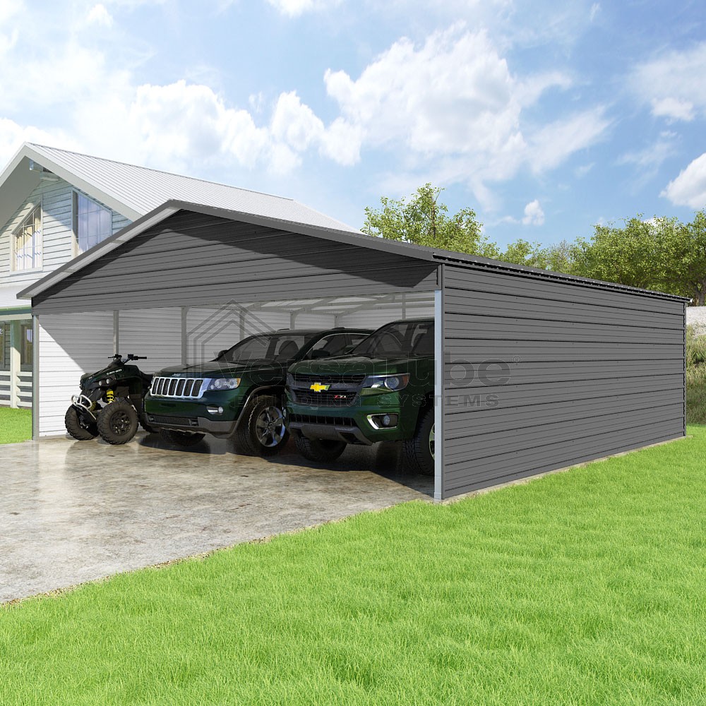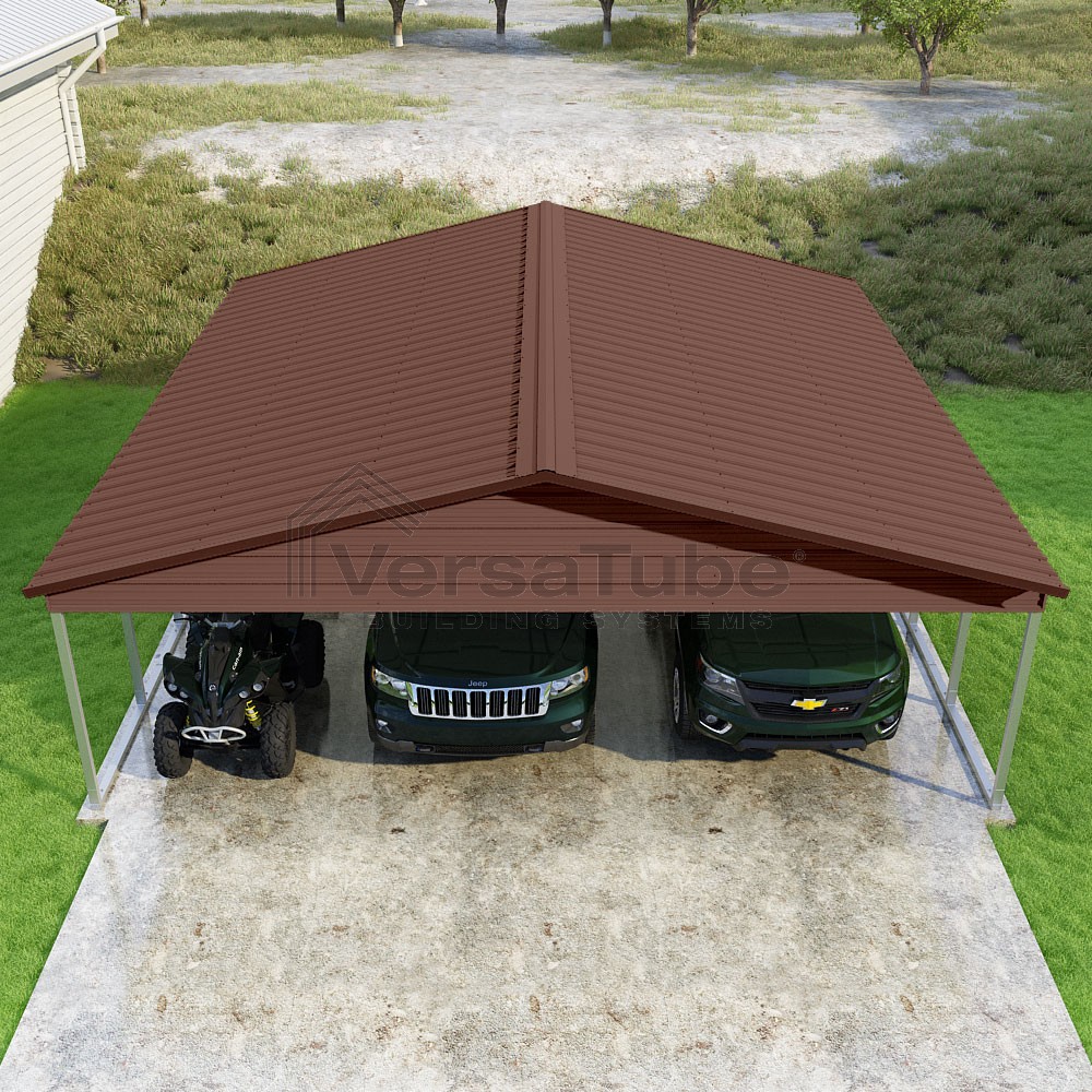 Pinnacle Series DIY carport kit features vertical sheet metal roof panels with ridge cap, gable and eave trim for an A-frame roof style and extended coverage on both ends.