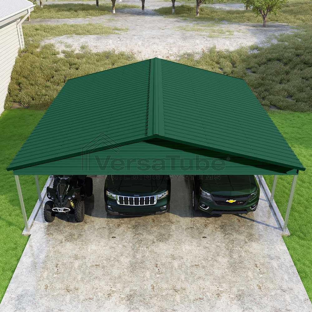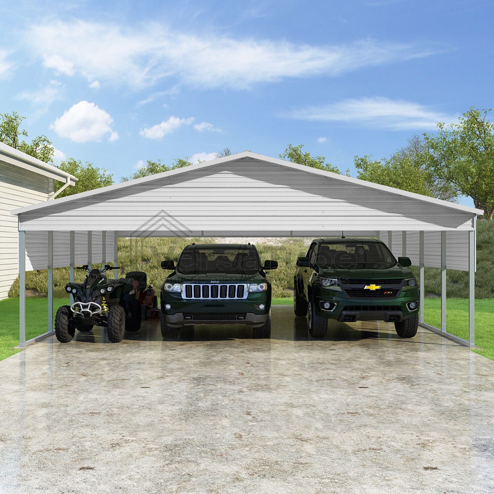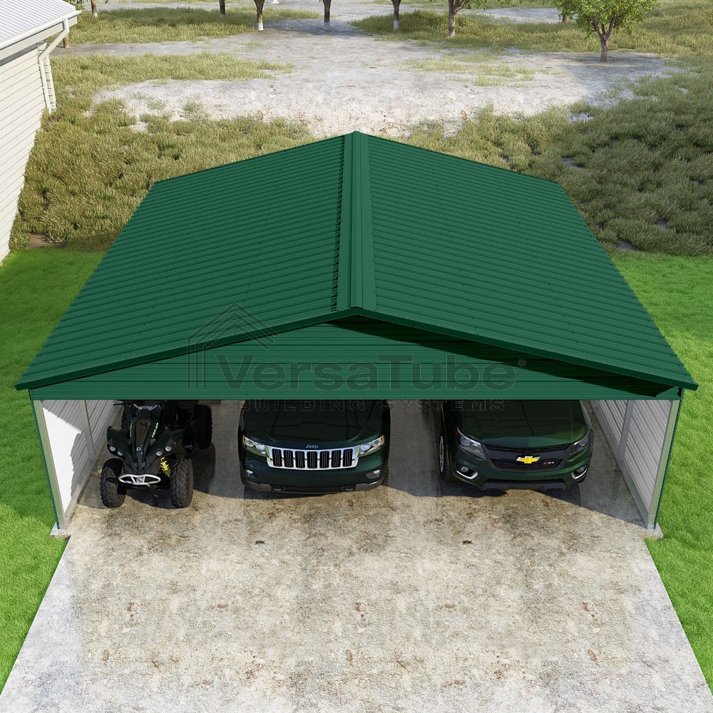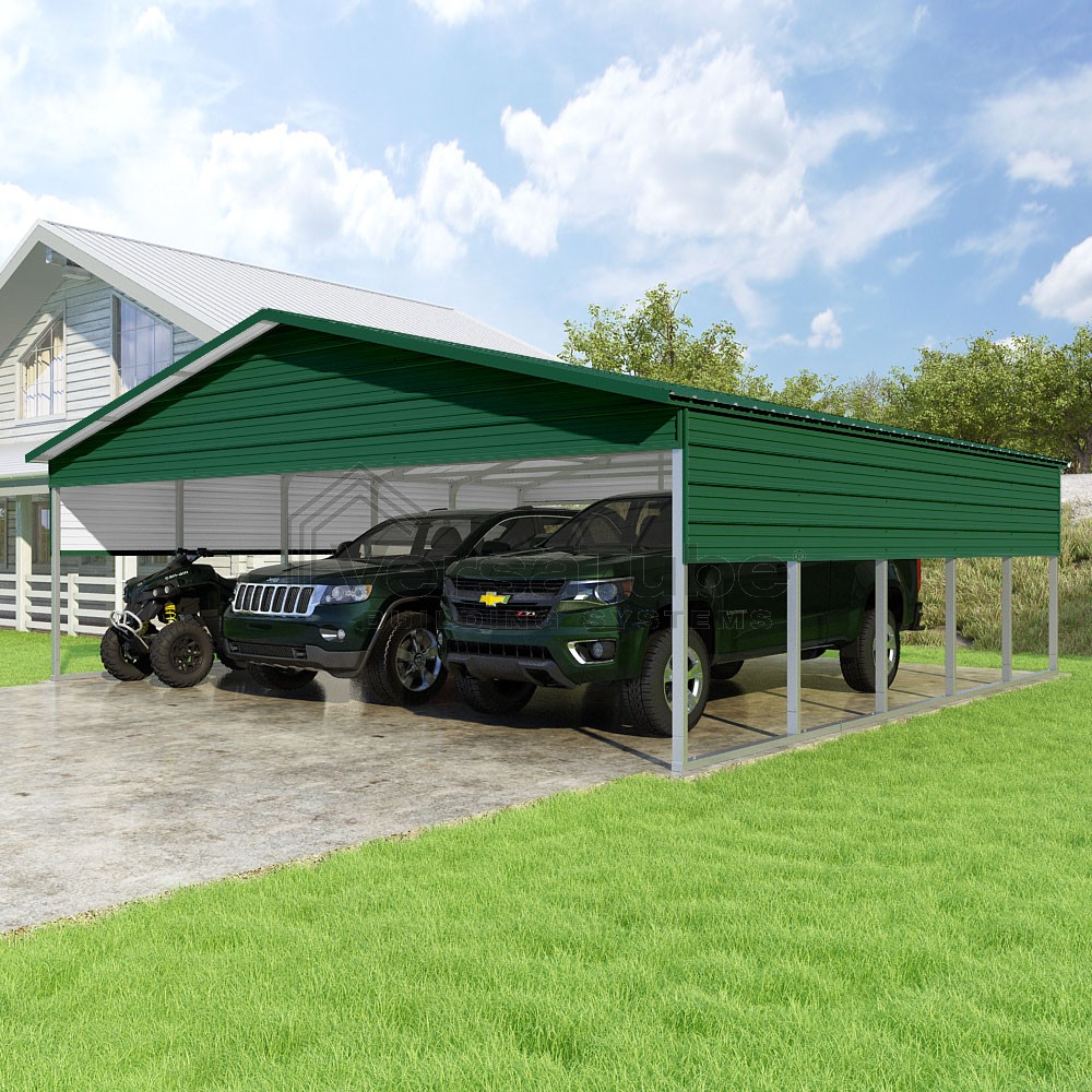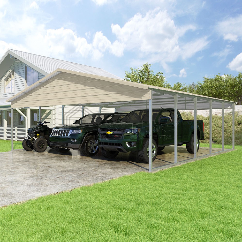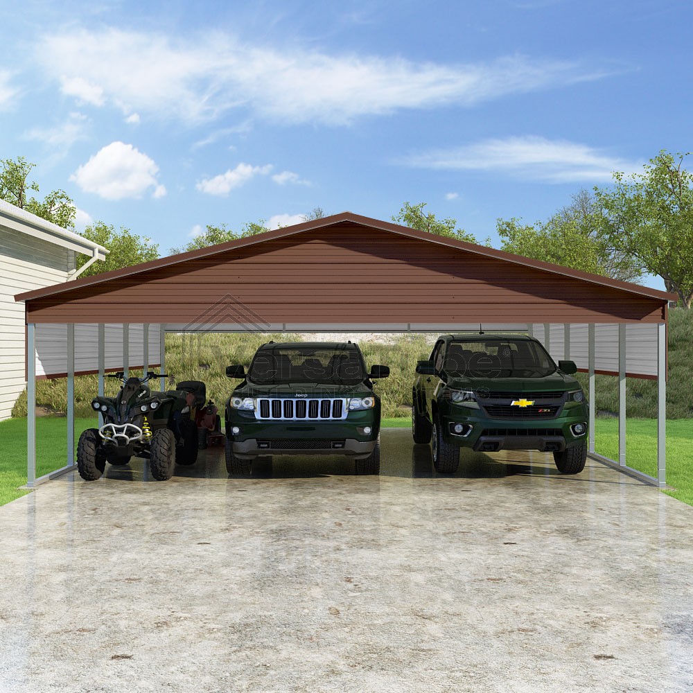 Pinnacle Series DIY carport kit features vertical sheet metal roof panels with ridge cap, gable and eave trim for an A-frame roof style and extended coverage on both ends.