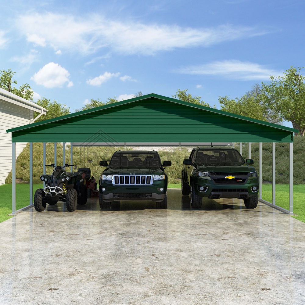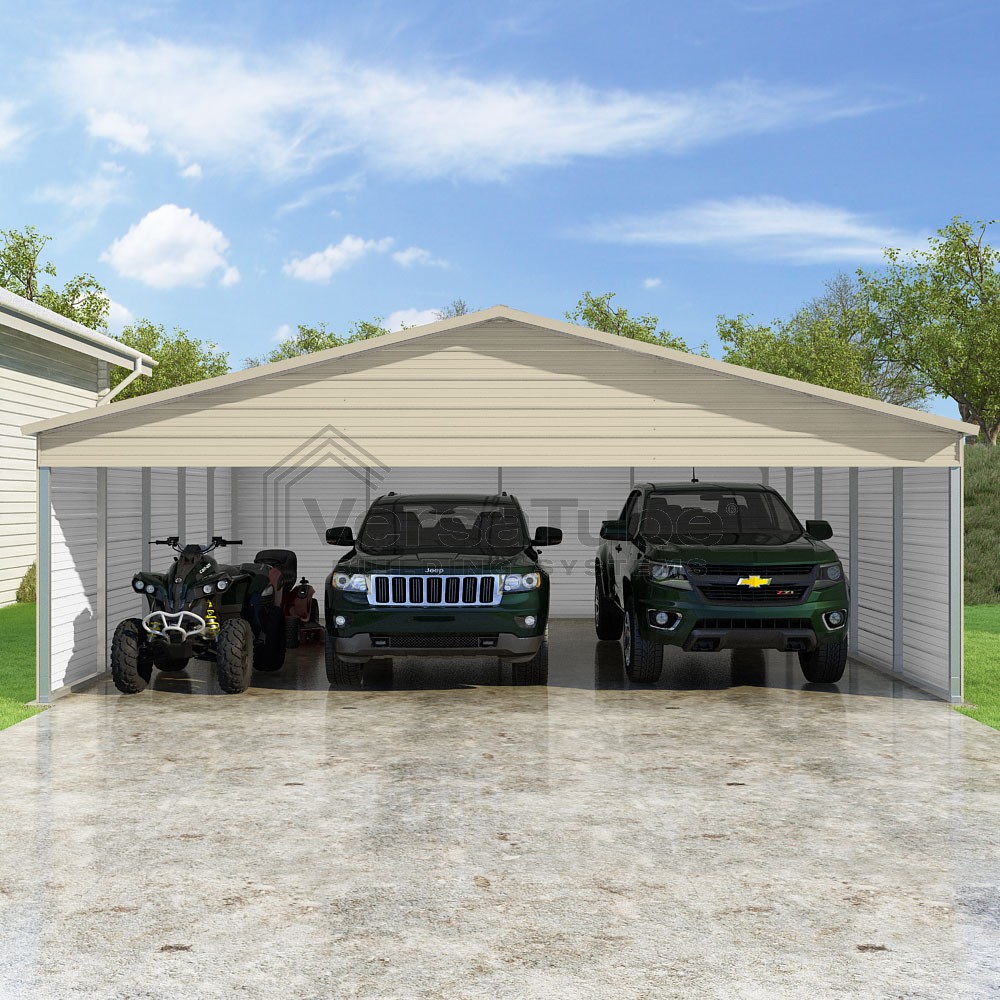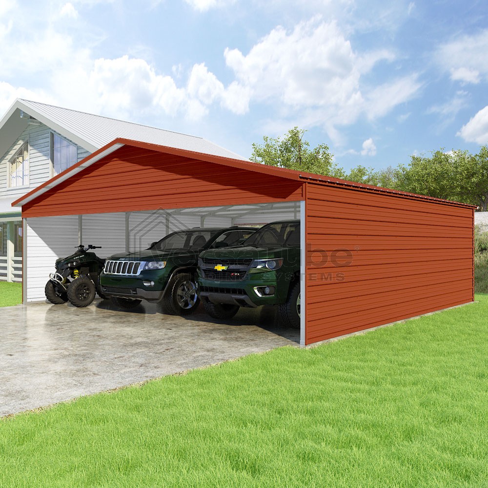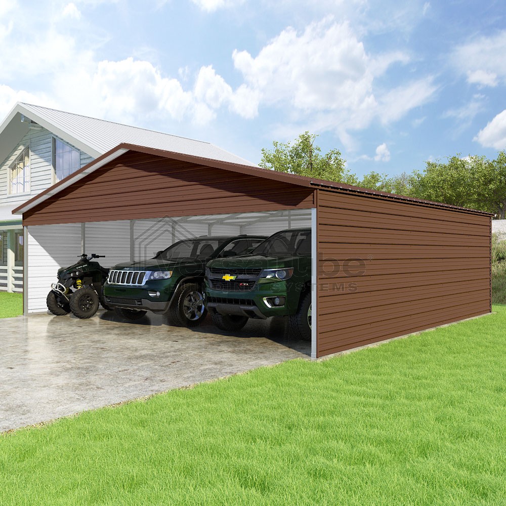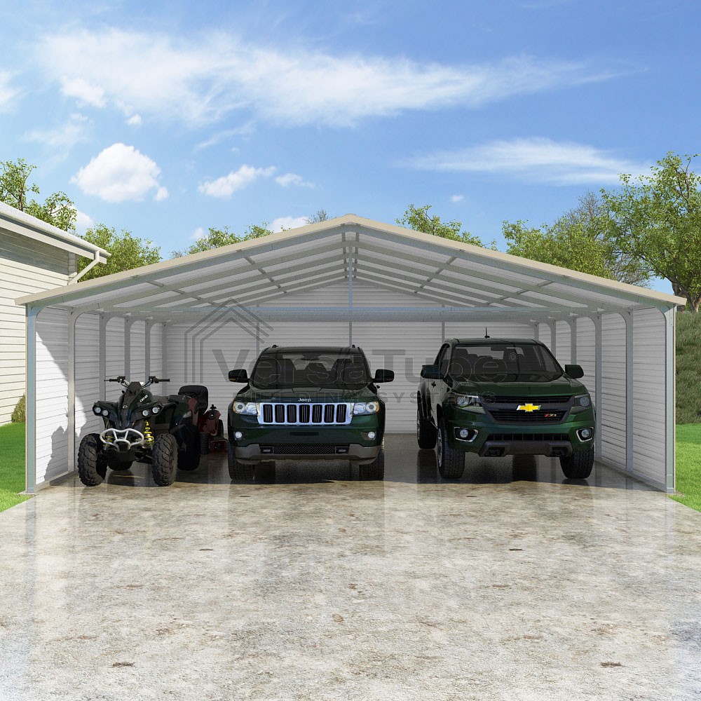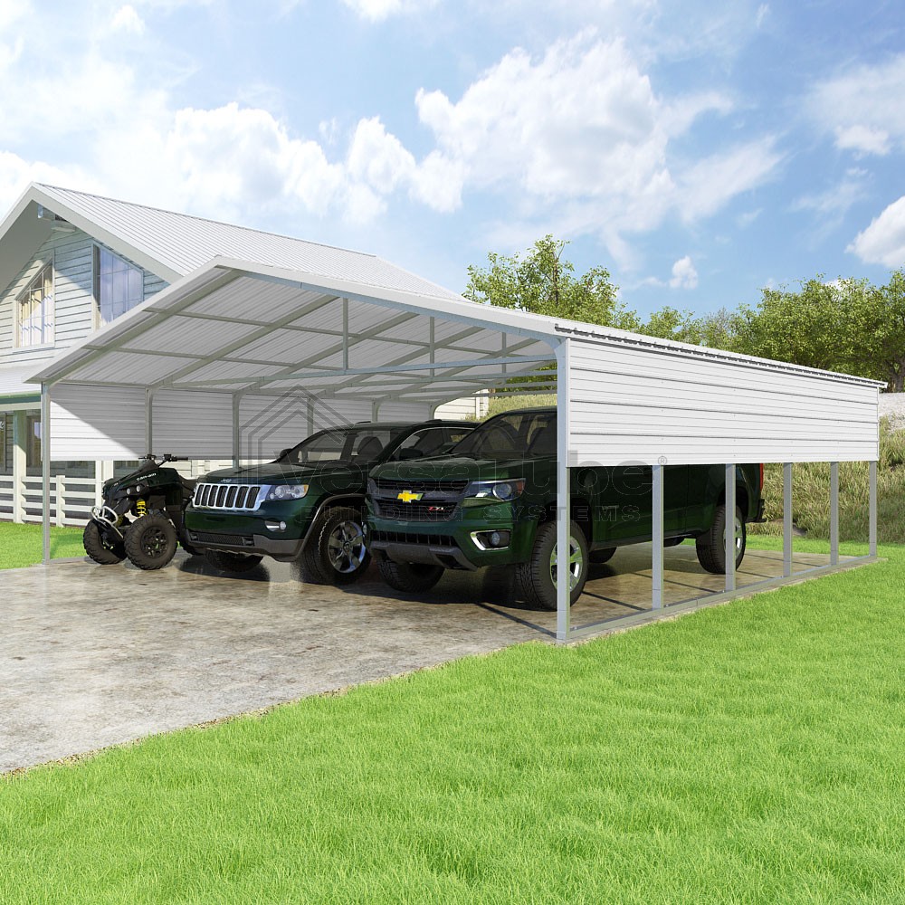 Pinnacle Series DIY carport kit features vertical sheet metal roof panels with ridge cap, gable and eave trim for an A-frame roof style and extended coverage on both ends.