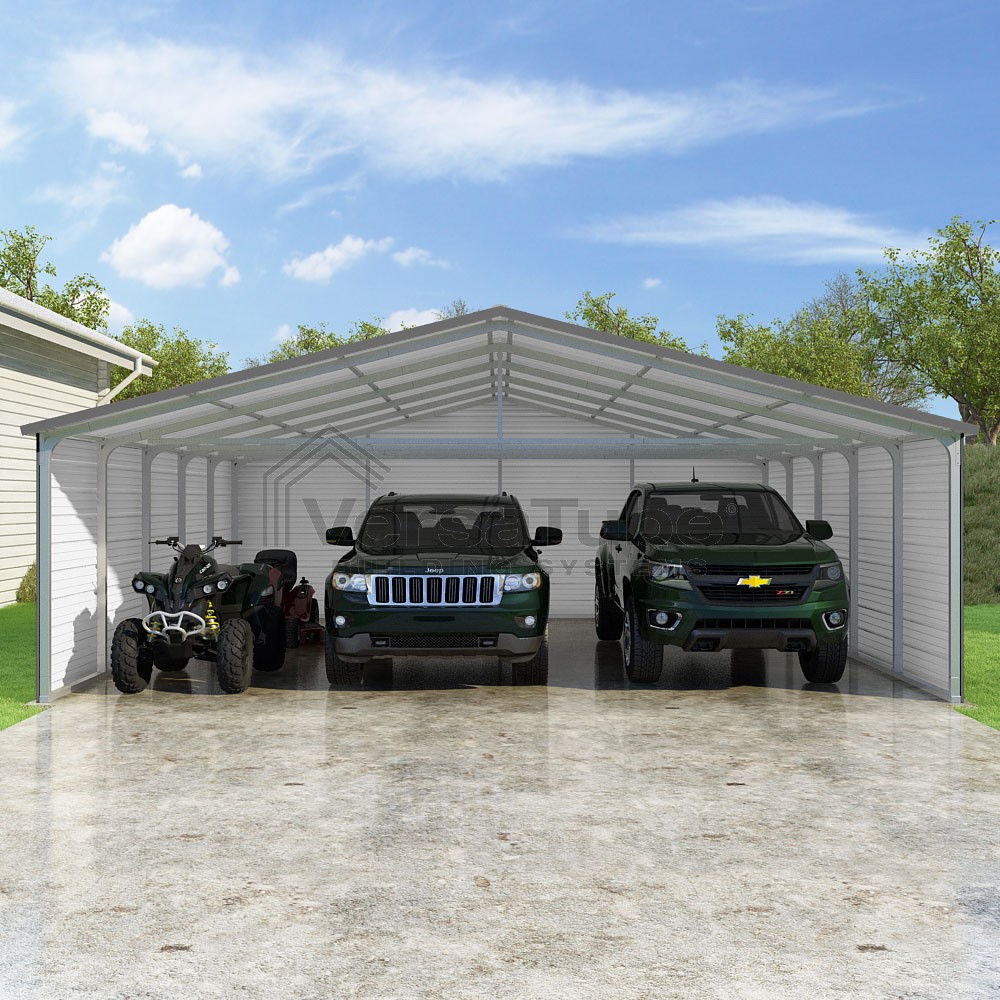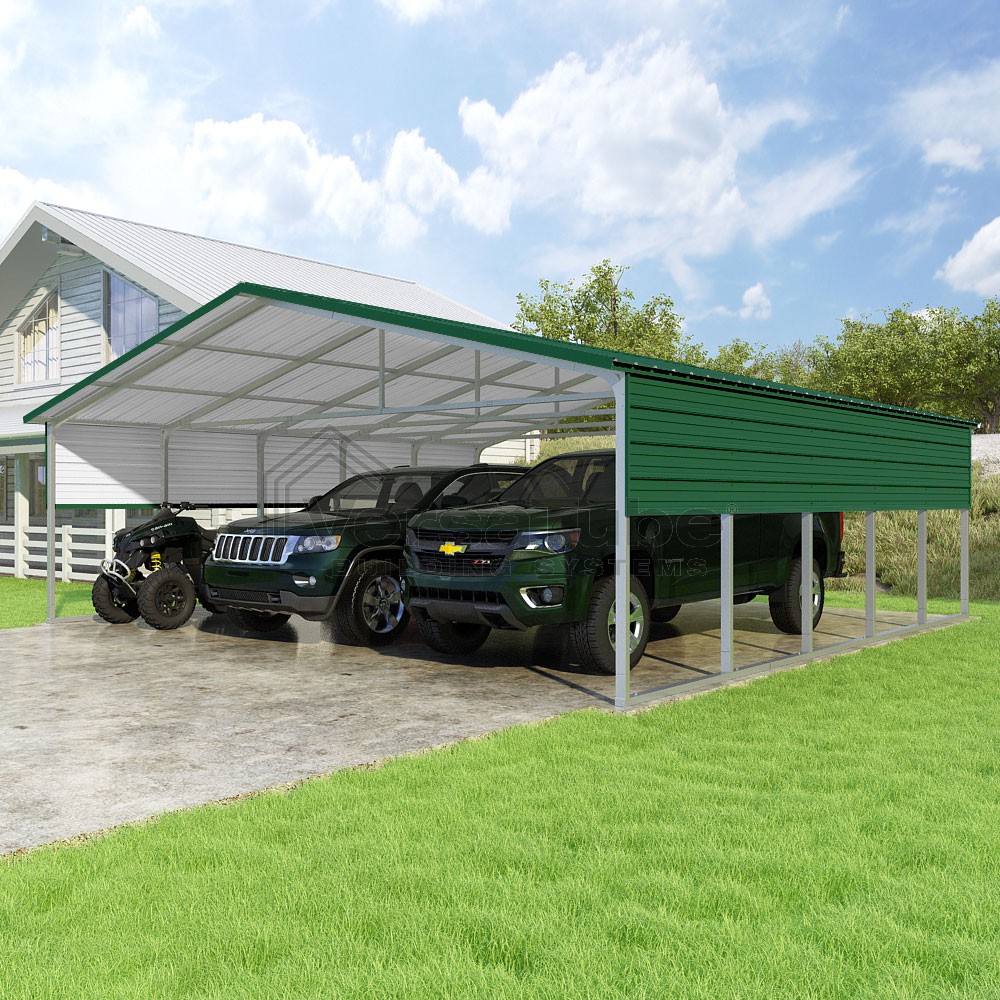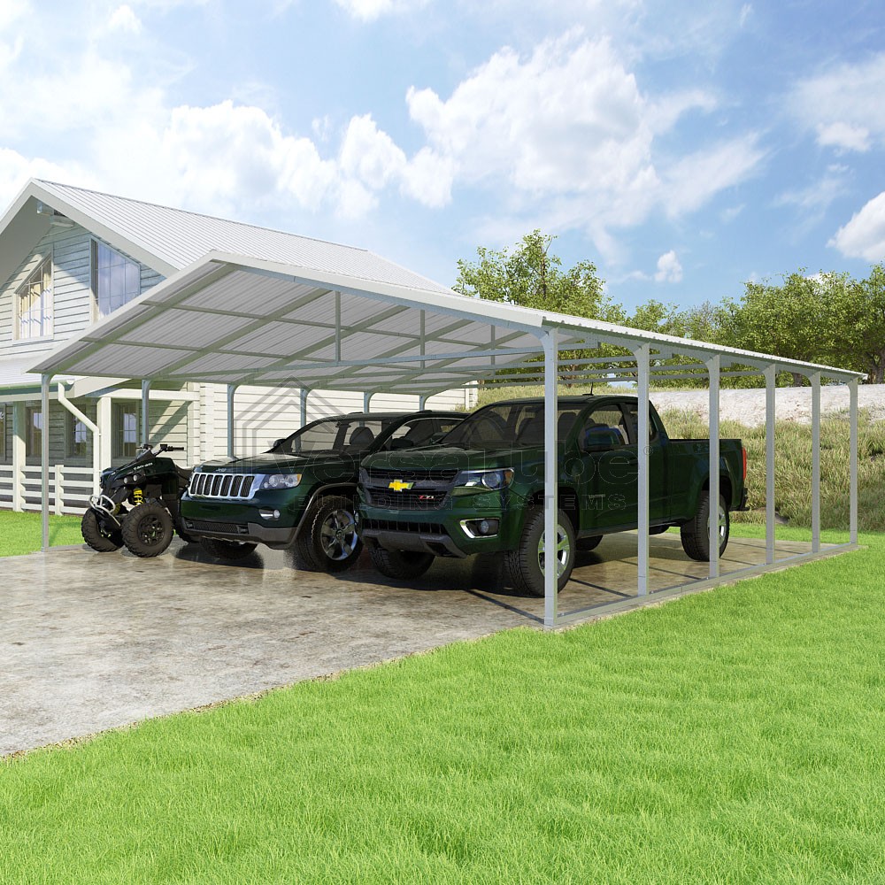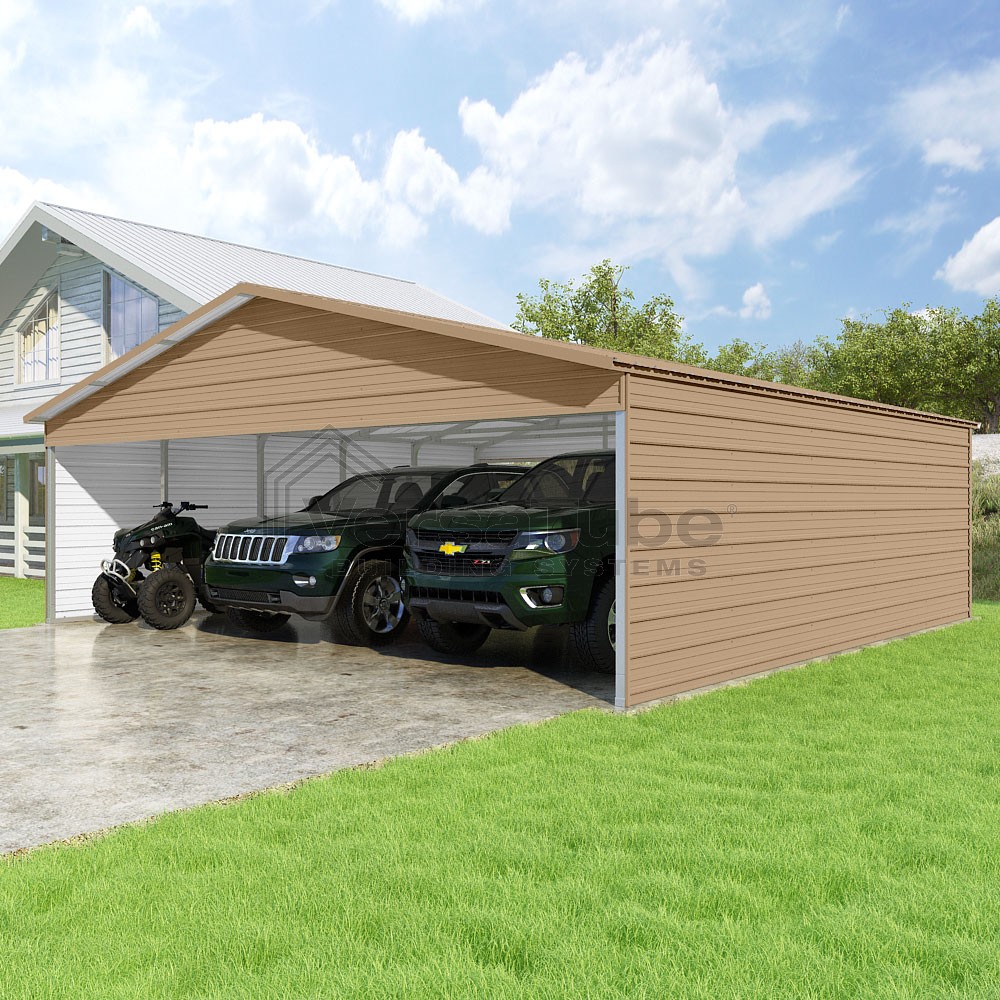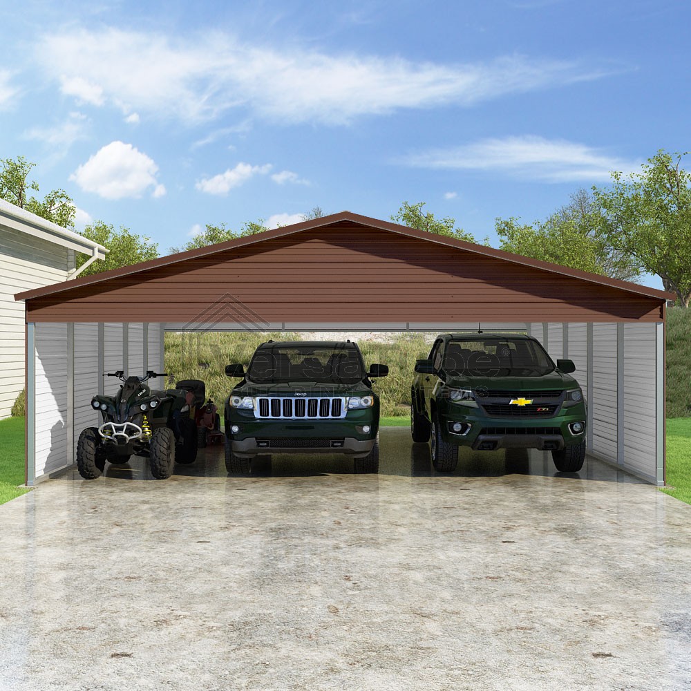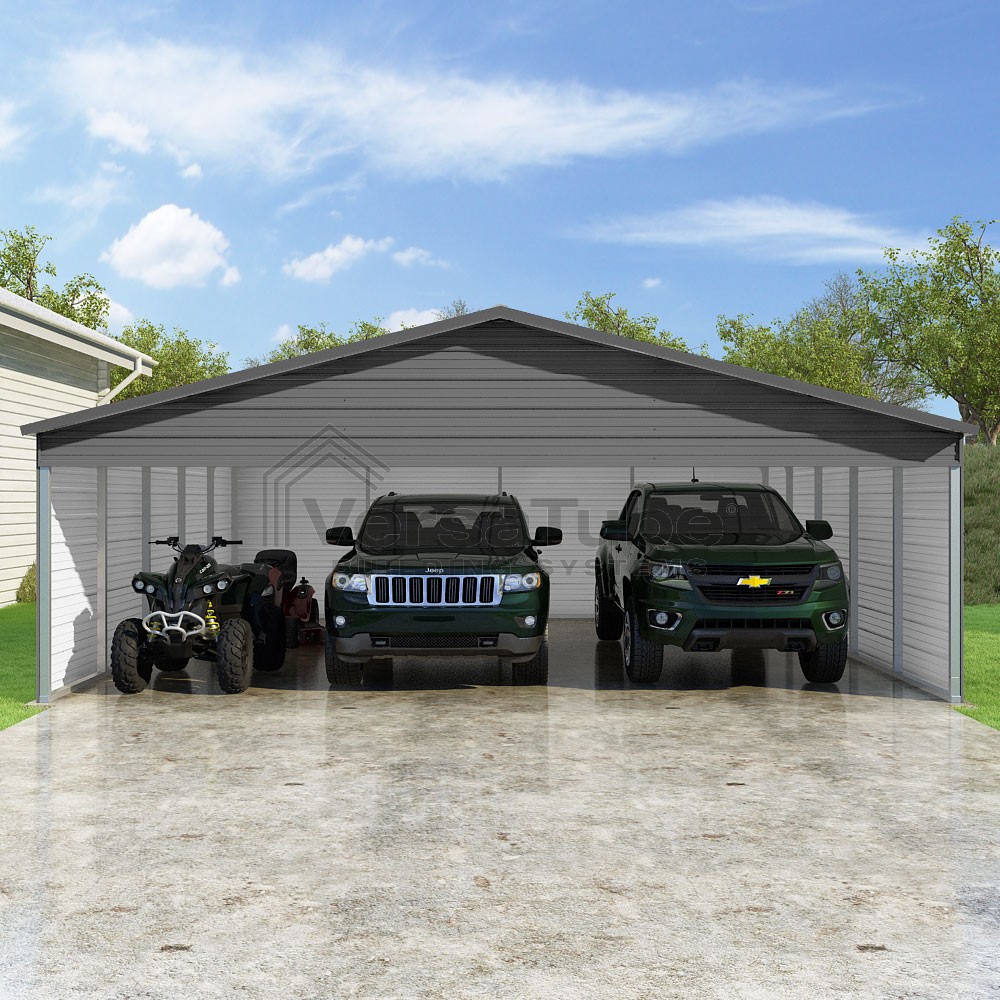 Pinnacle Series DIY carport kit features vertical sheet metal roof panels with ridge cap, gable and eave trim for an A-frame roof style and extended coverage on both ends.