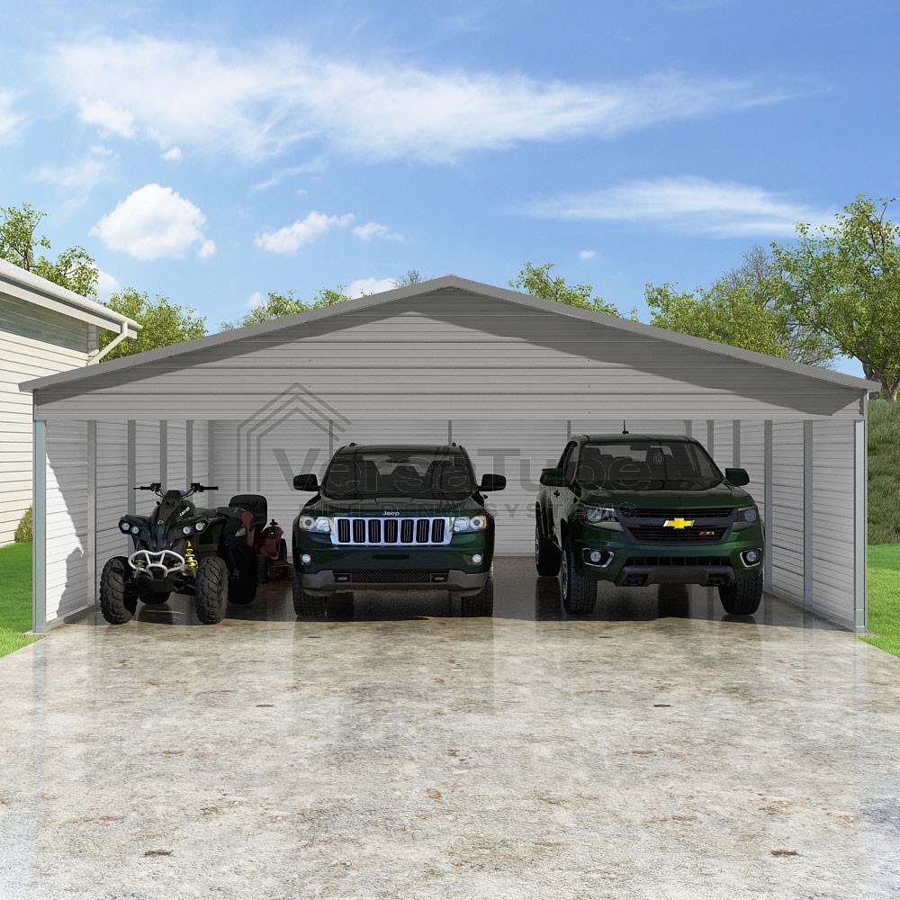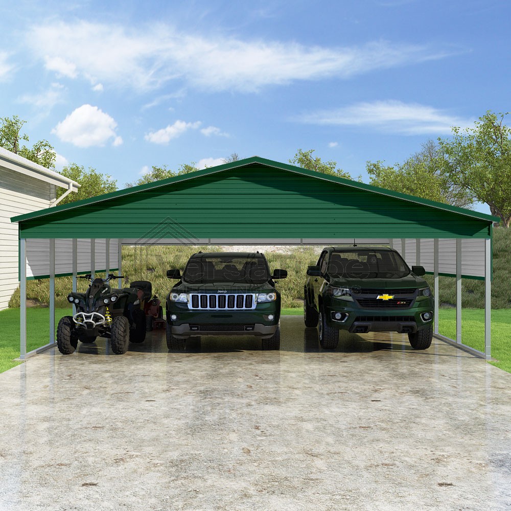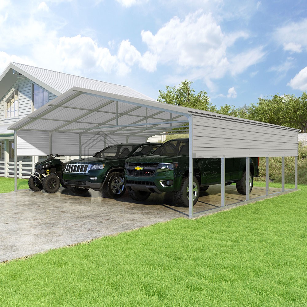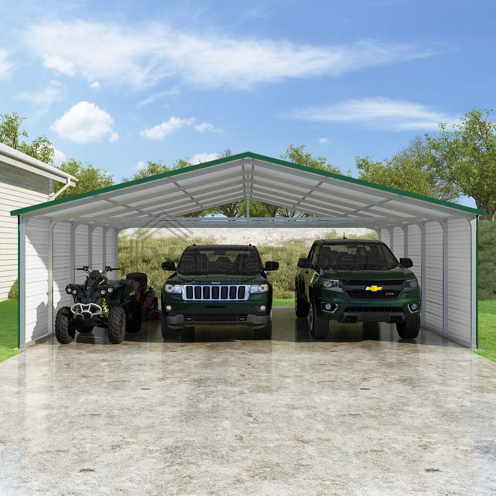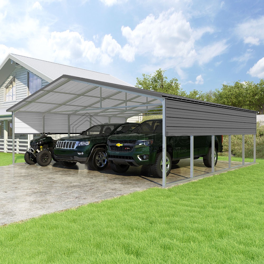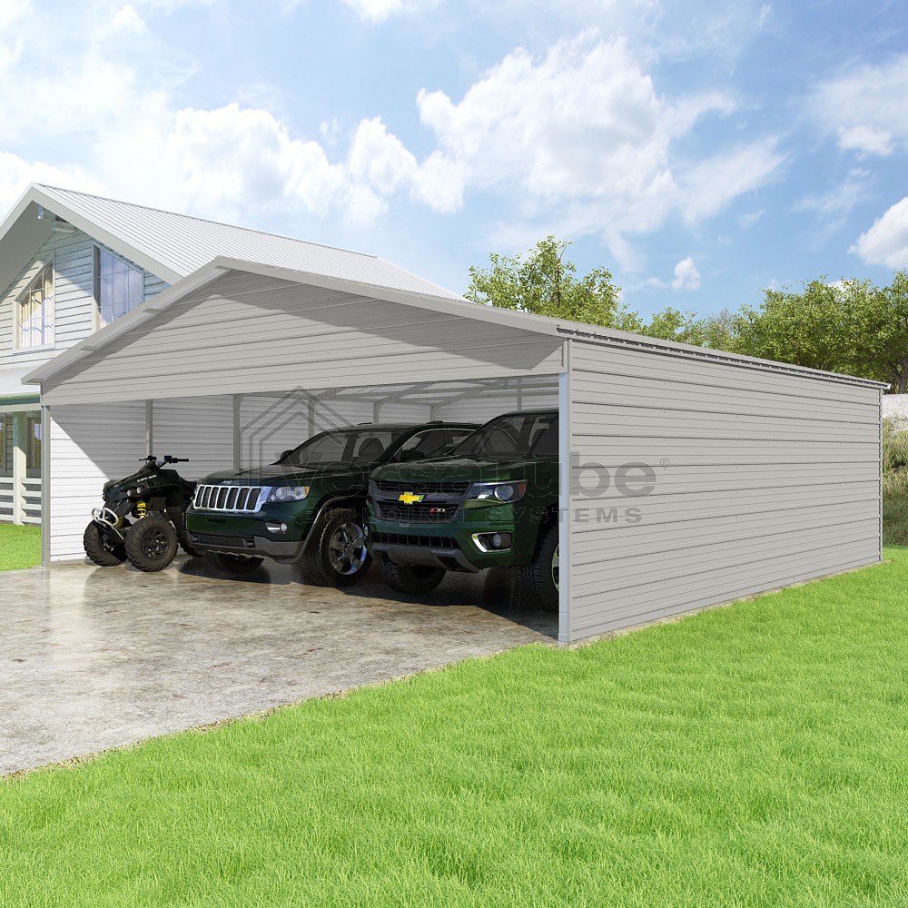 Pinnacle Series DIY carport kit features vertical sheet metal roof panels with ridge cap, gable and eave trim for an A-frame roof style and extended coverage on both ends.