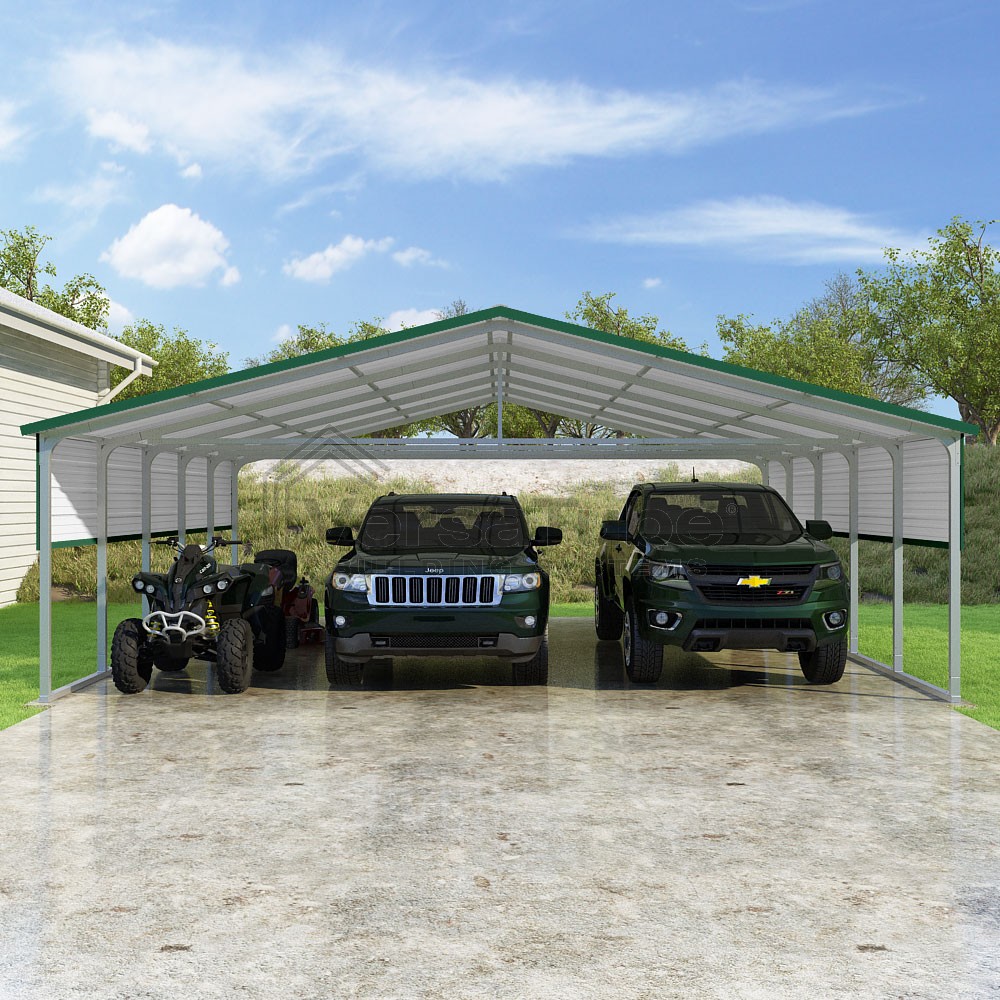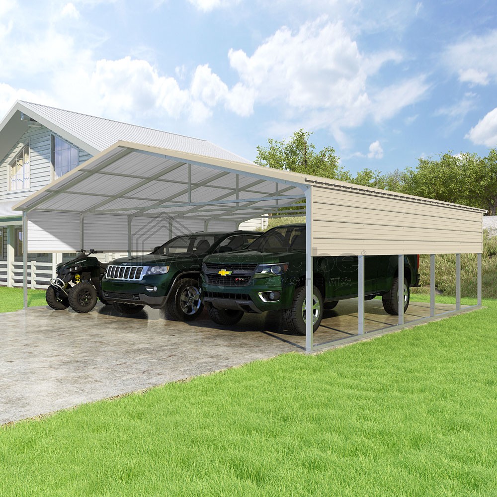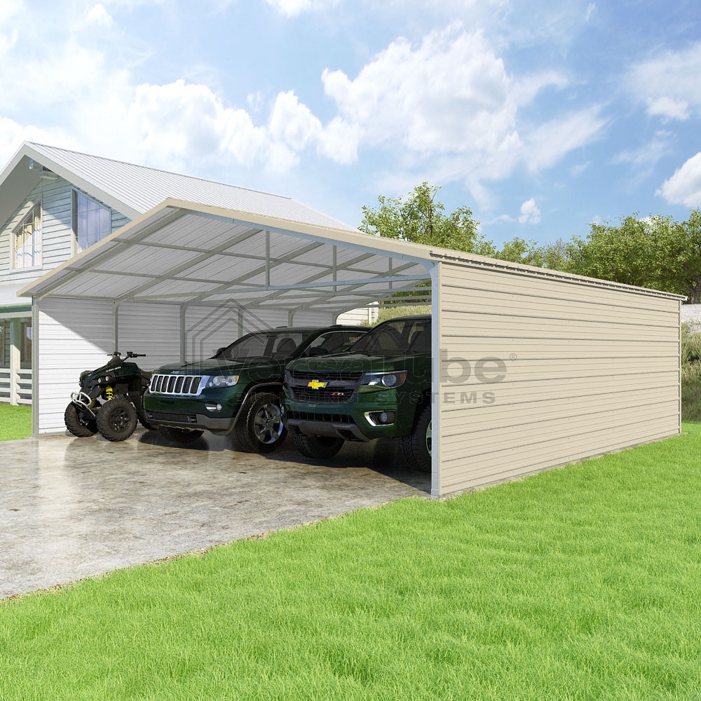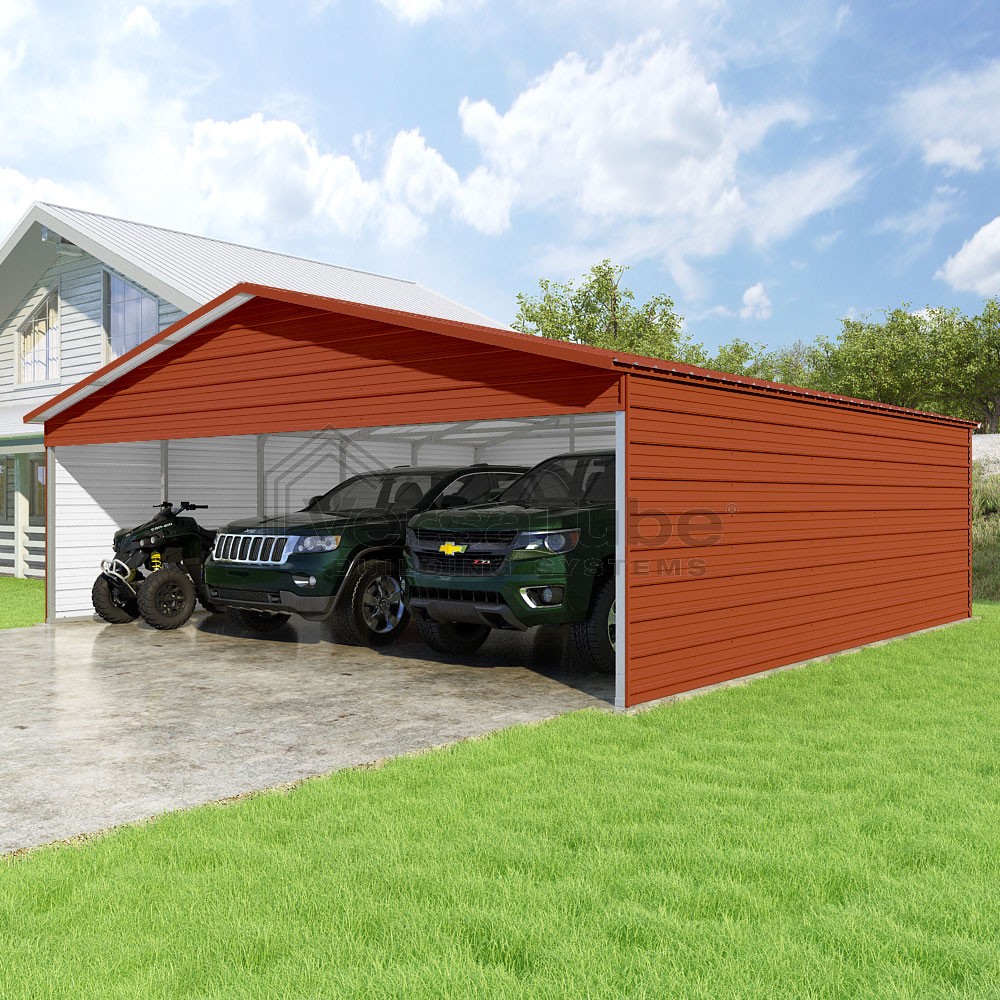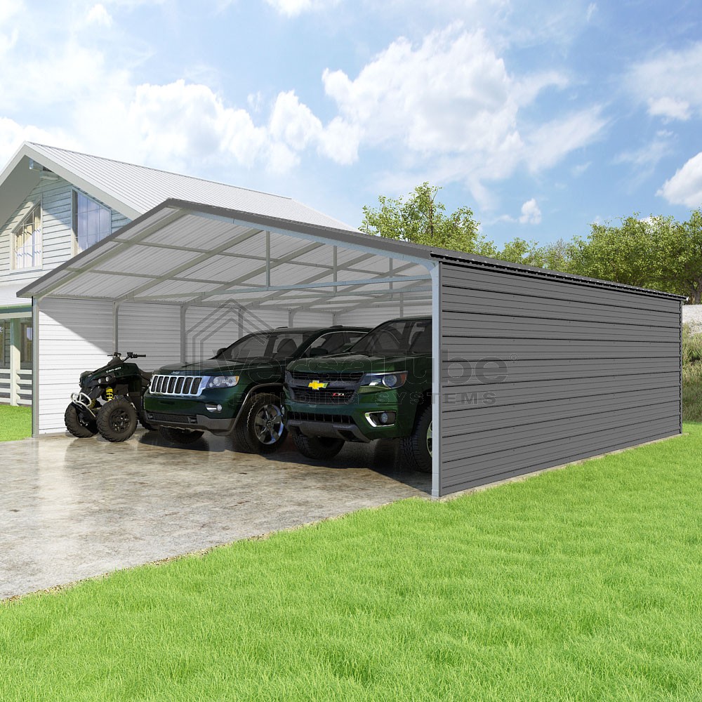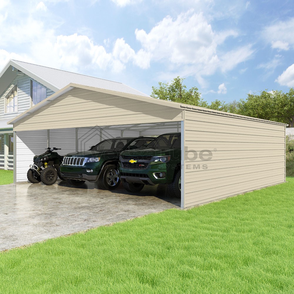 Pinnacle Series DIY carport kit features vertical sheet metal roof panels with ridge cap, gable and eave trim for an A-frame roof style and extended coverage on both ends.