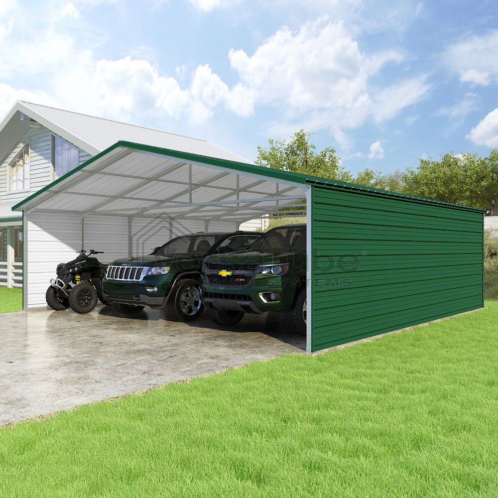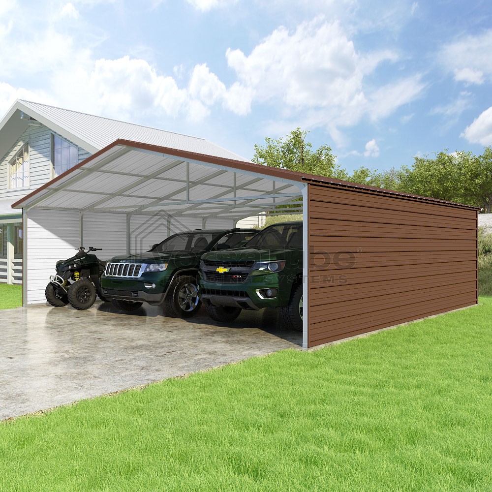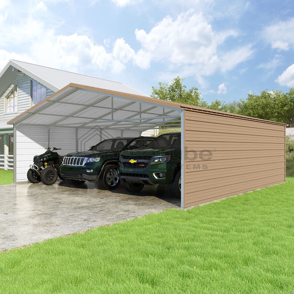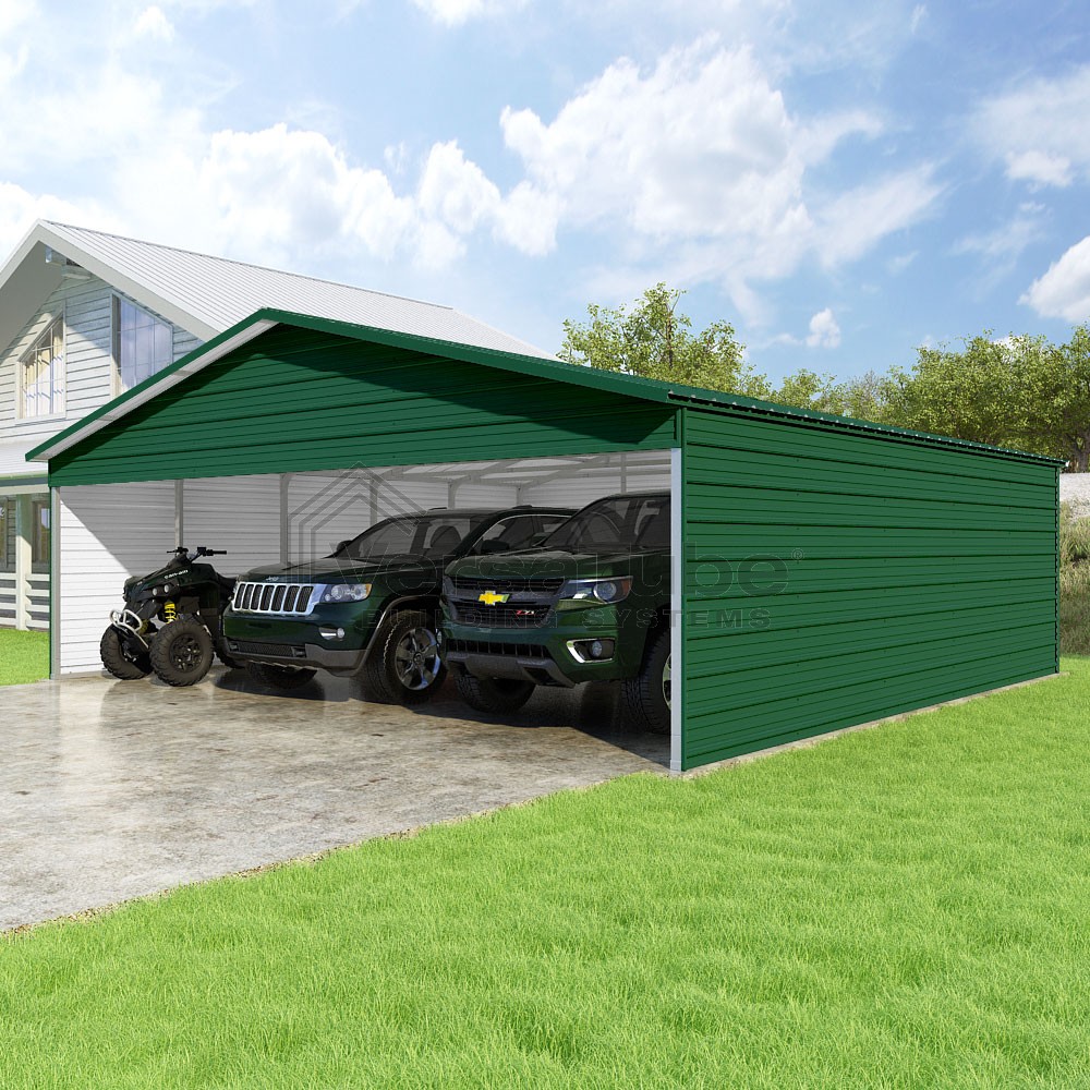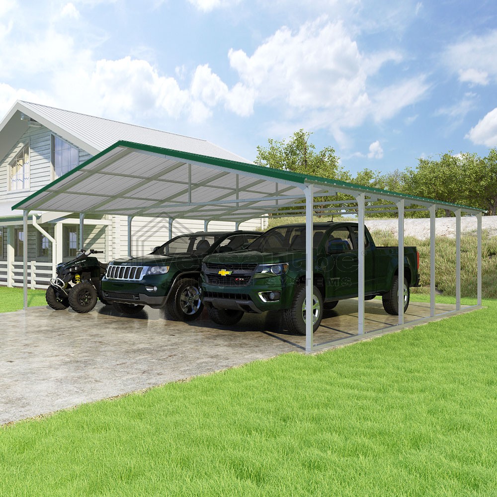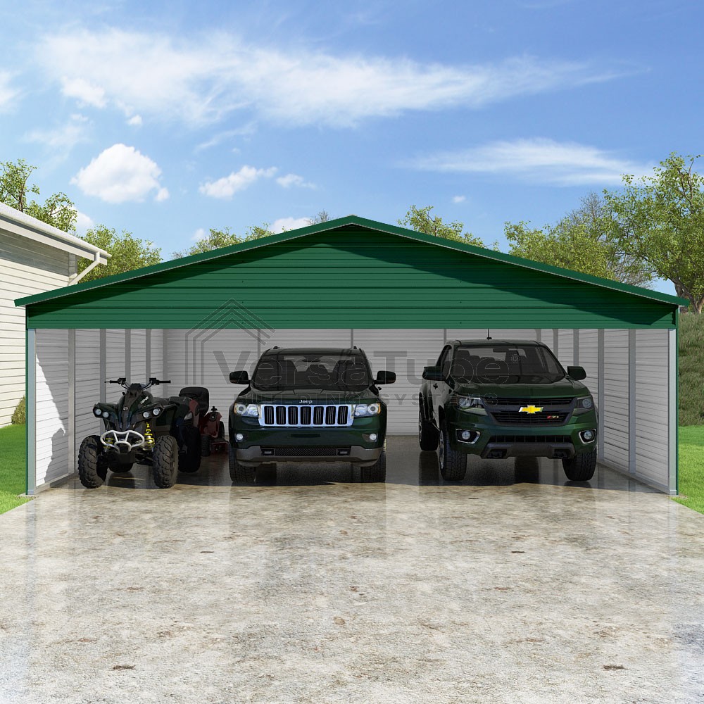 Pinnacle Series DIY carport kit features vertical sheet metal roof panels with ridge cap, gable and eave trim for an A-frame roof style and extended coverage on both ends.