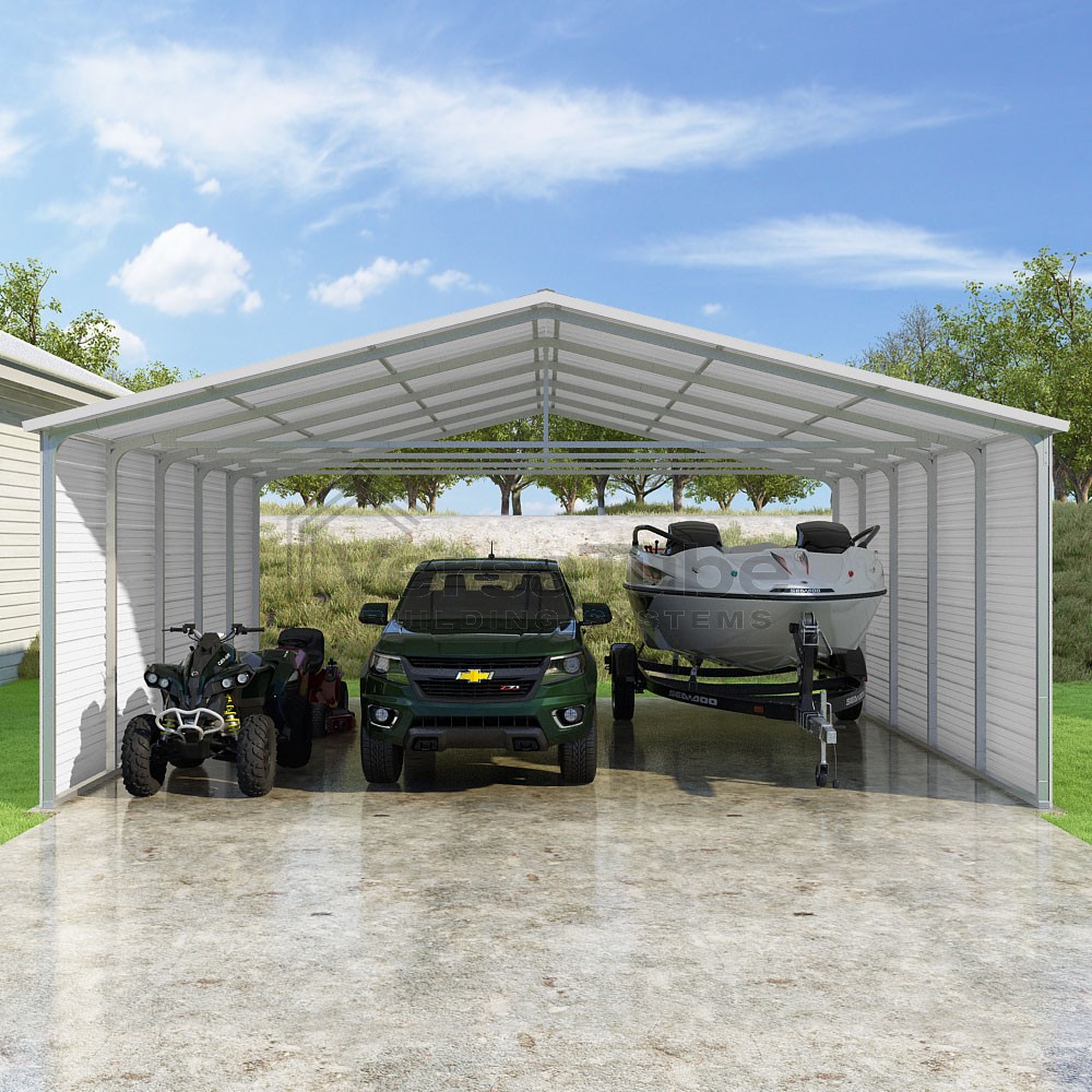 Pinnacle Series DIY carport kit features vertical sheet metal roof panels with ridge cap, gable and eave trim for an A-frame roof style and extended coverage on both ends.