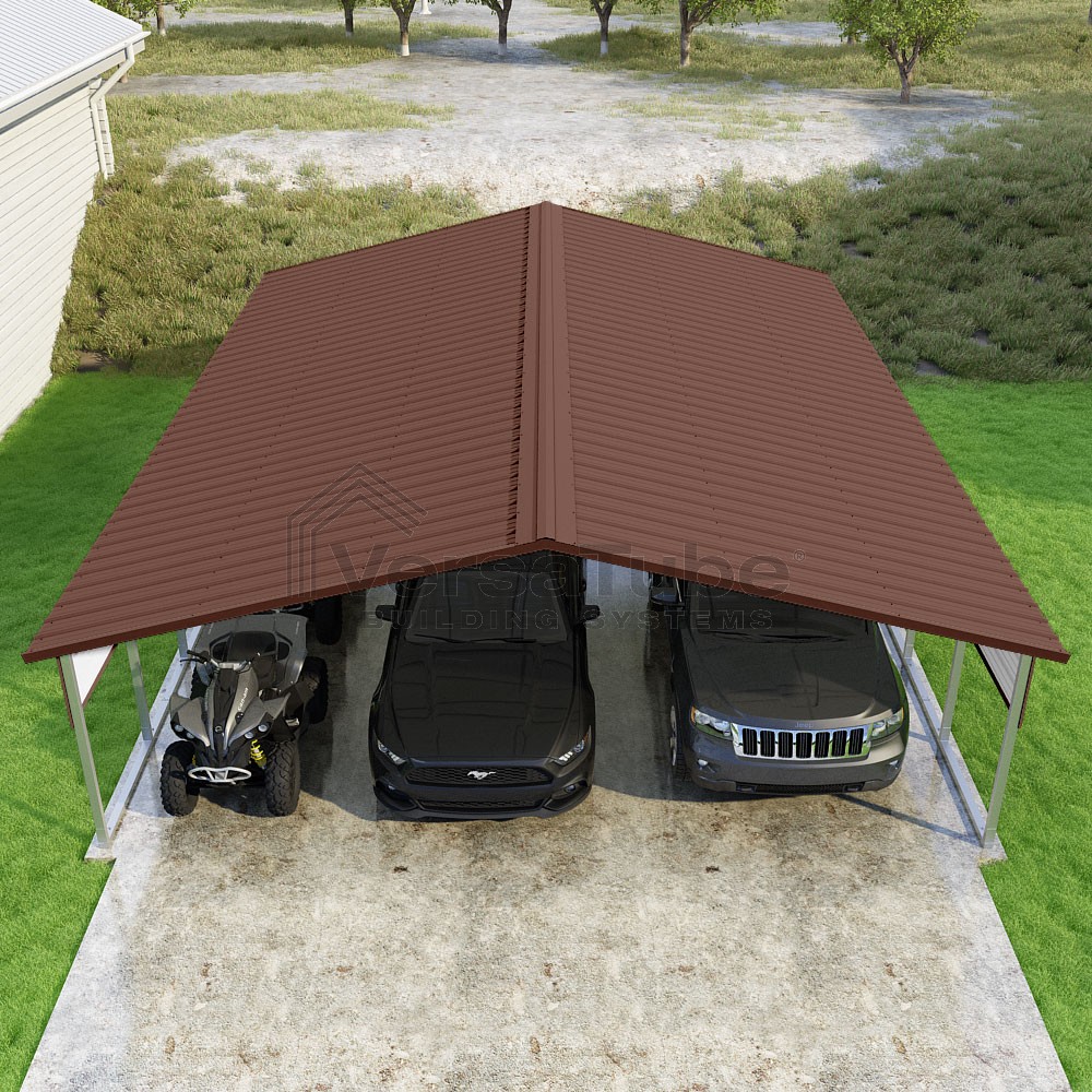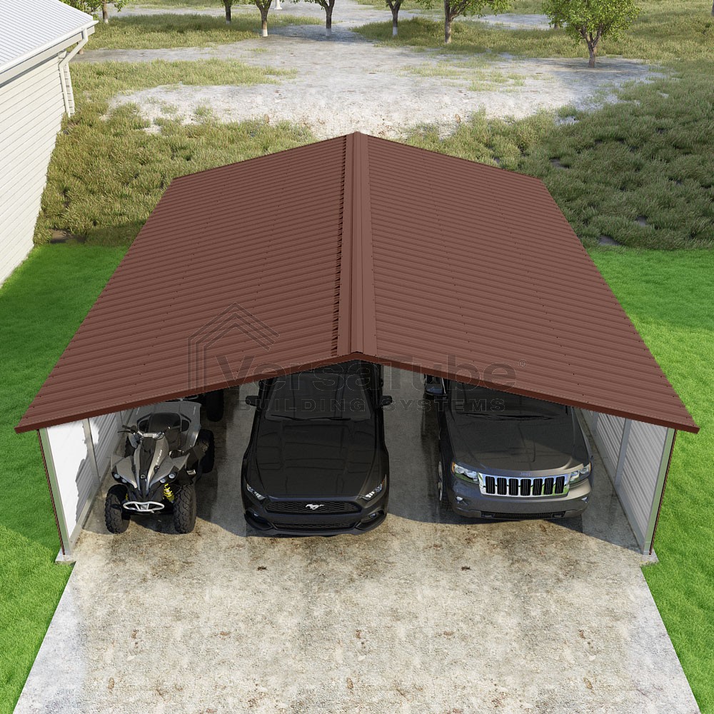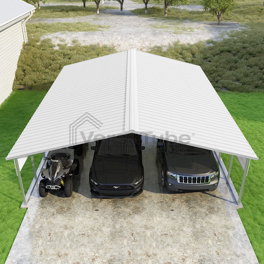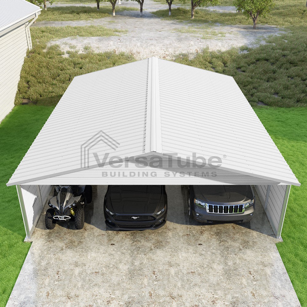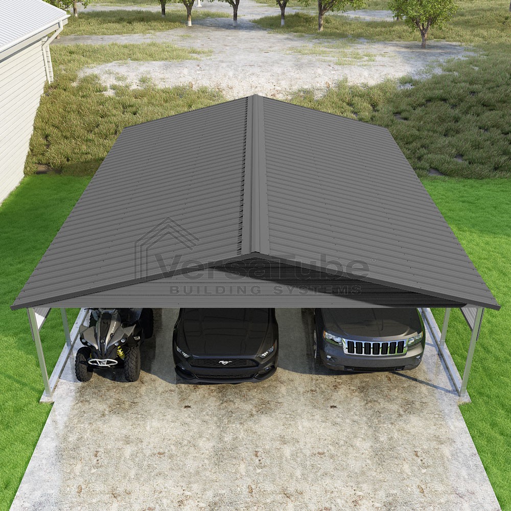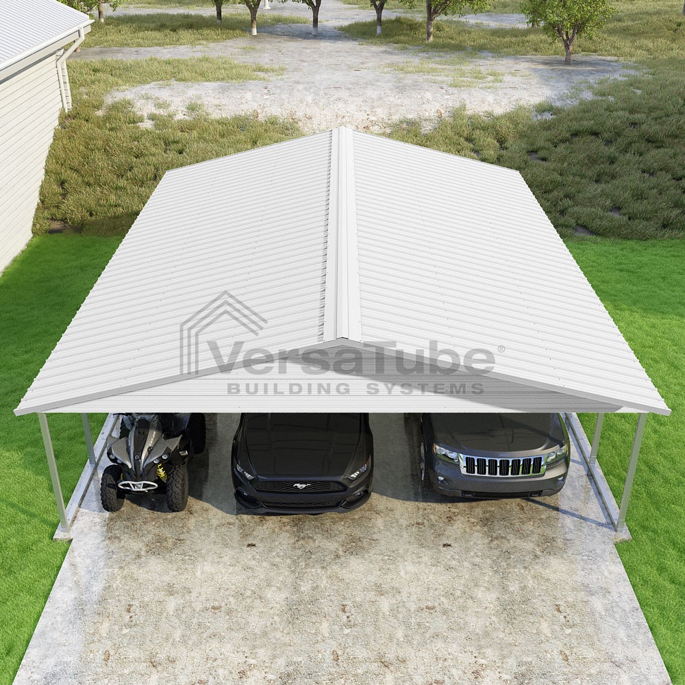 Pinnacle Series DIY carport kit features vertical sheet metal roof panels with ridge cap, gable and eave trim for an A-frame roof style and extended coverage on both ends.