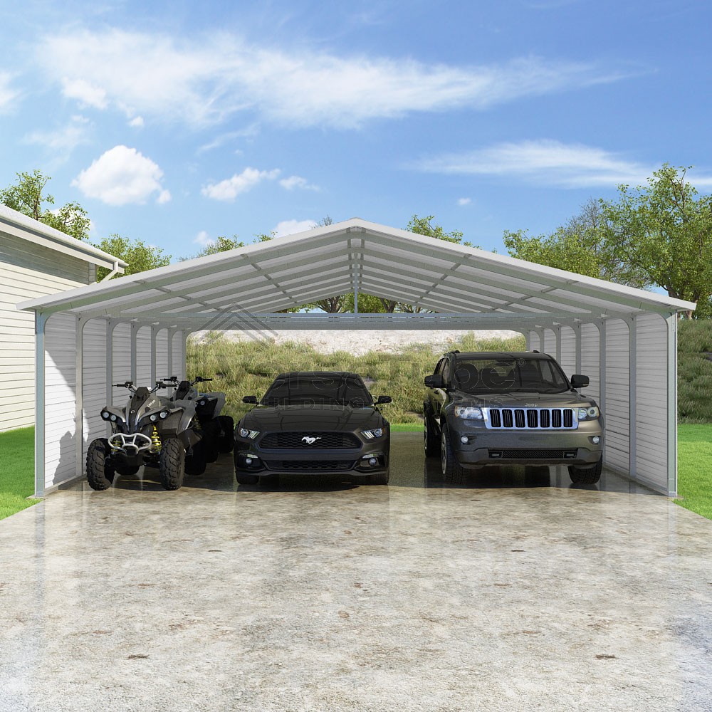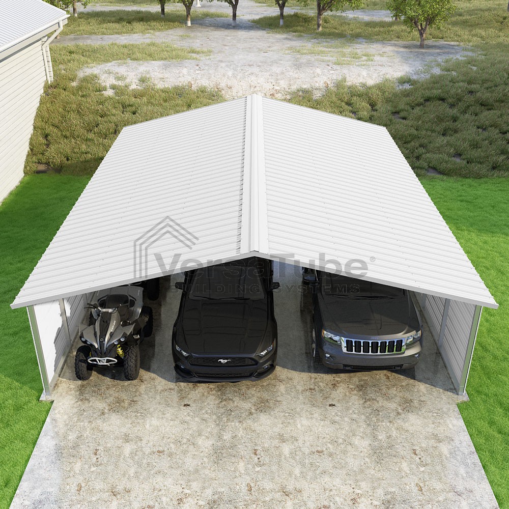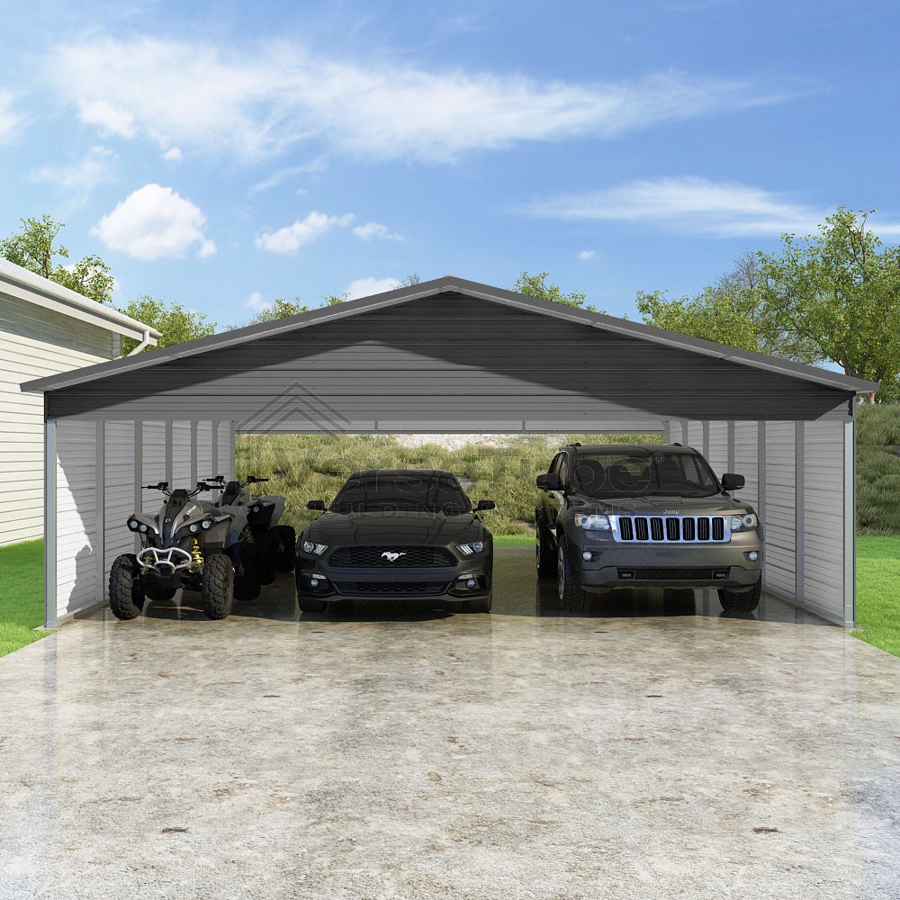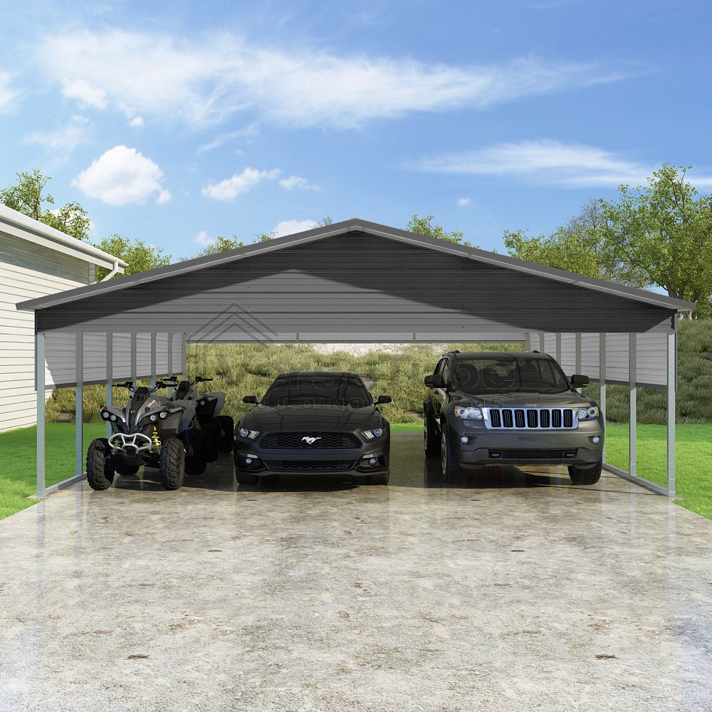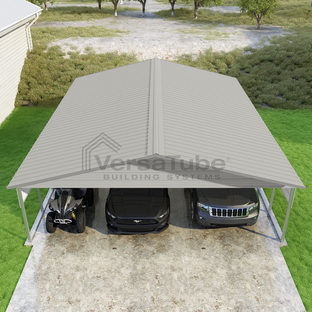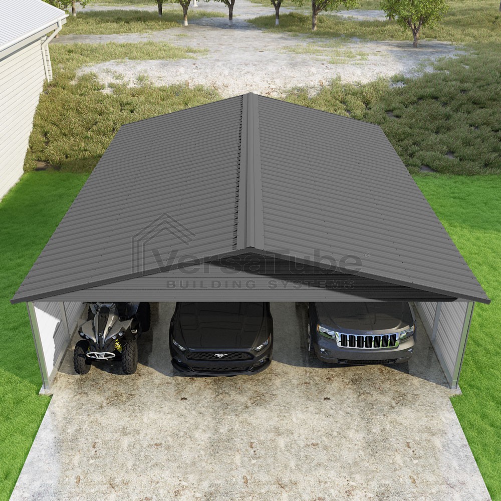 Pinnacle Series DIY carport kit features vertical sheet metal roof panels with ridge cap, gable and eave trim for an A-frame roof style and extended coverage on both ends.