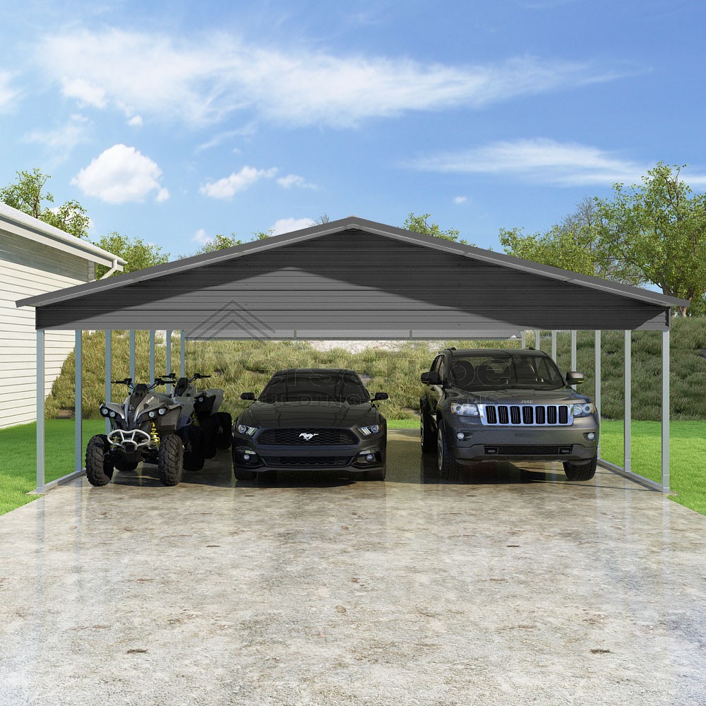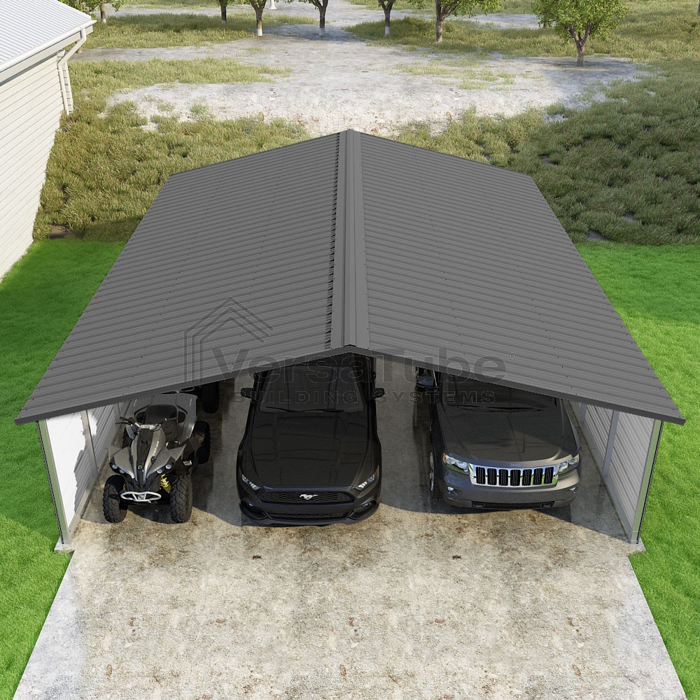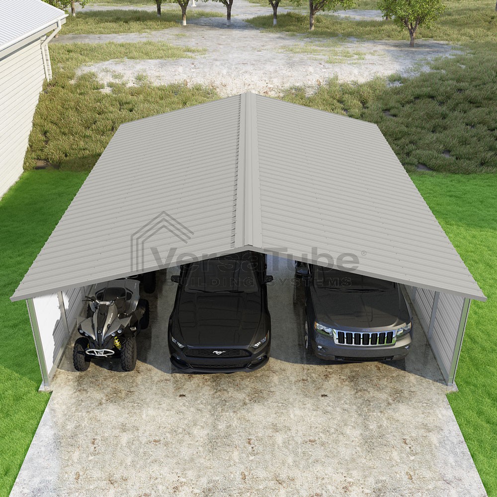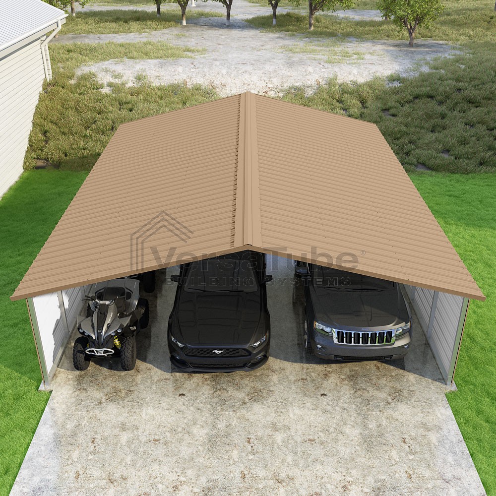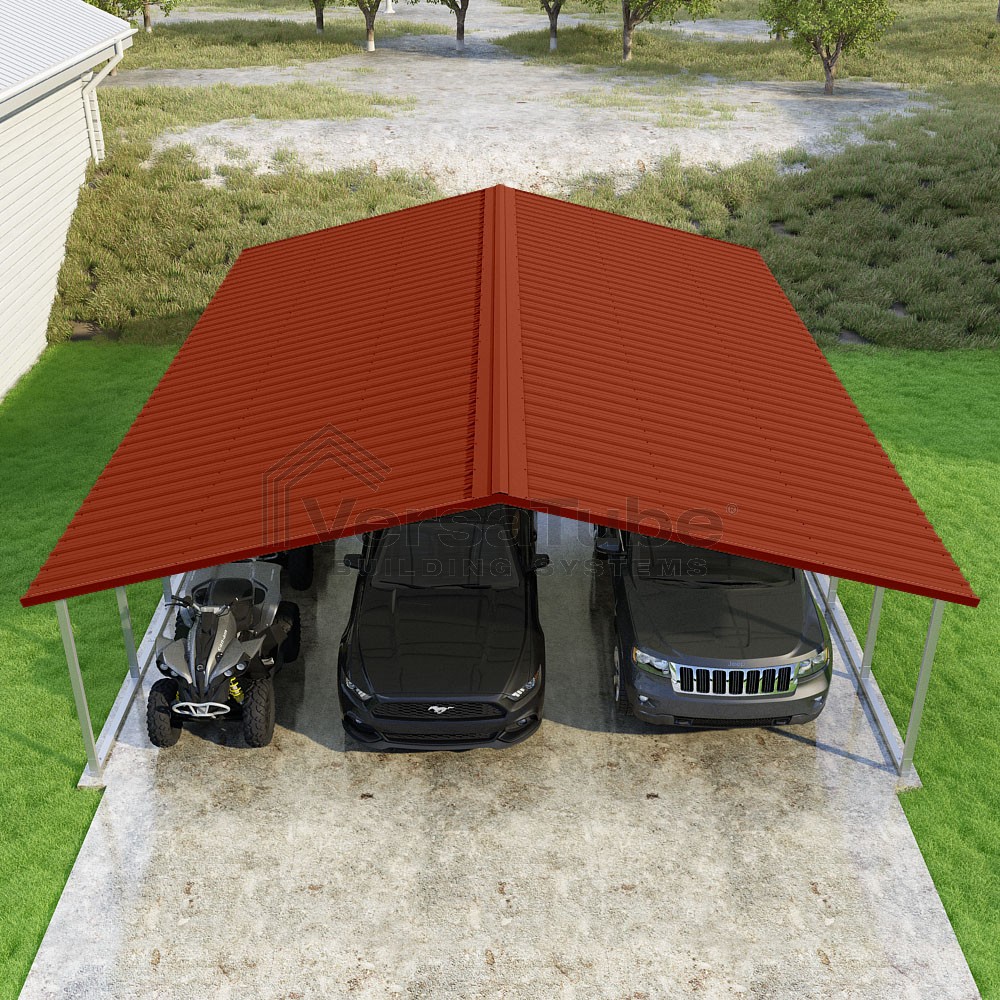 Pinnacle Series DIY carport kit features vertical sheet metal roof panels with ridge cap, gable and eave trim for an A-frame roof style and extended coverage on both ends.