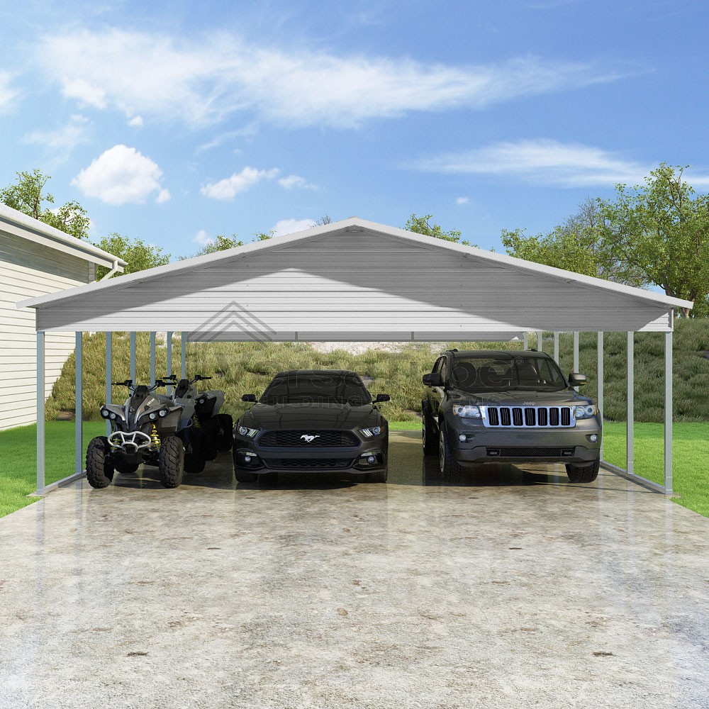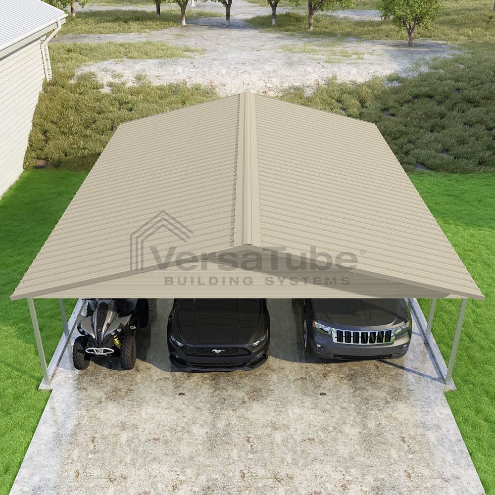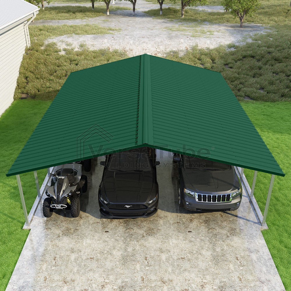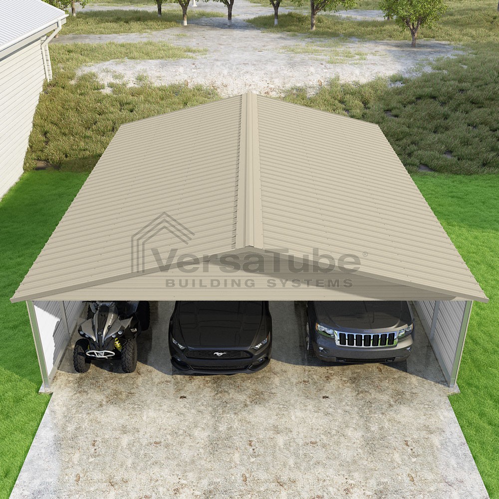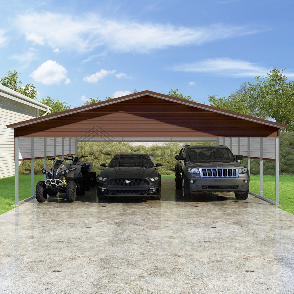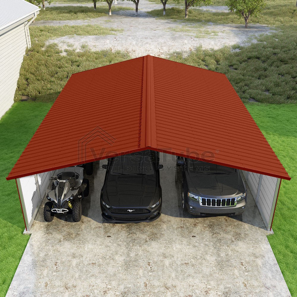 Pinnacle Series DIY carport kit features vertical sheet metal roof panels with ridge cap, gable and eave trim for an A-frame roof style and extended coverage on both ends.