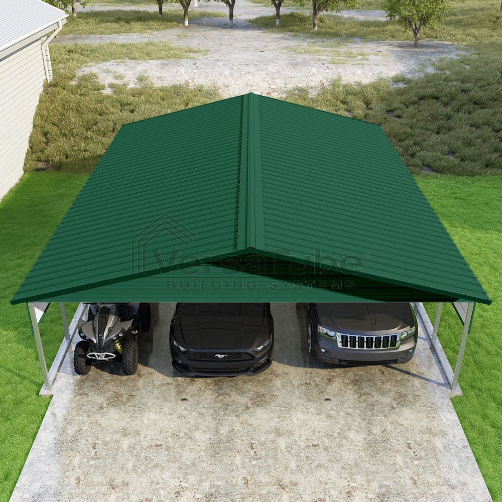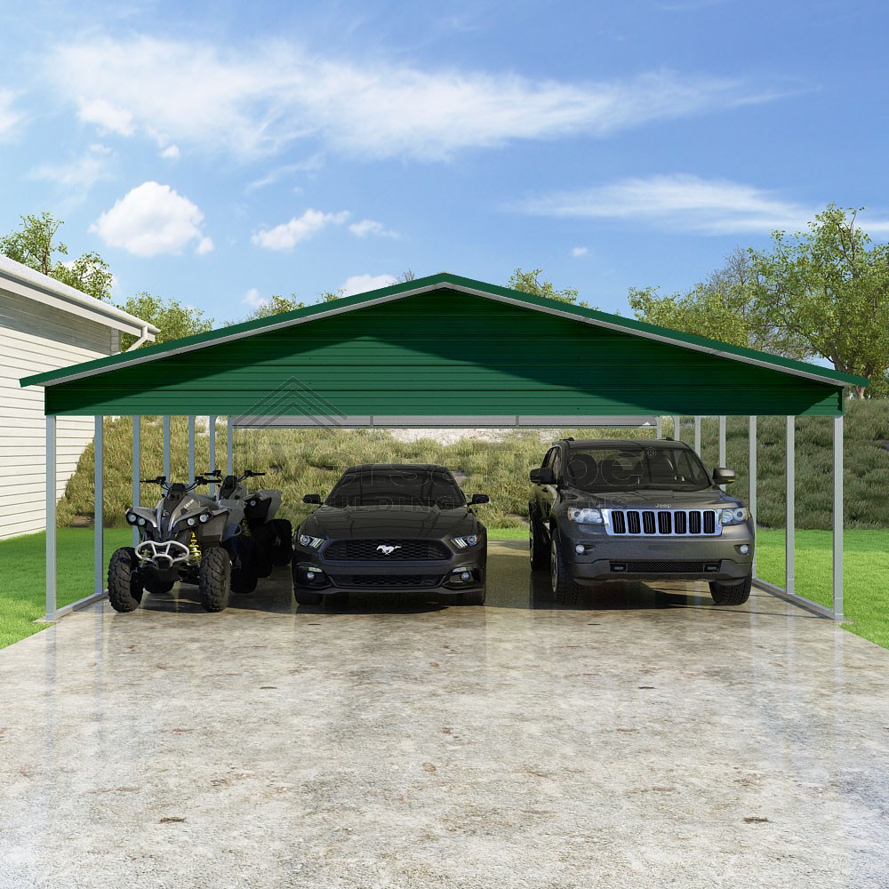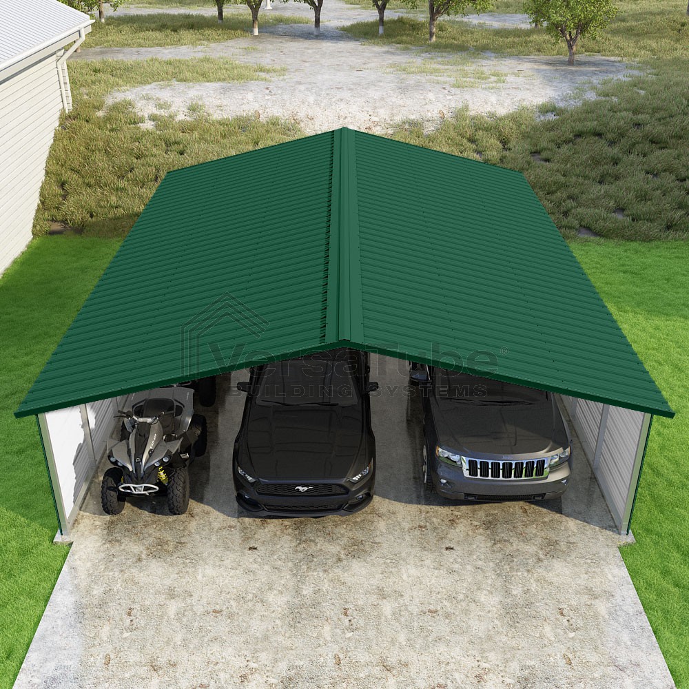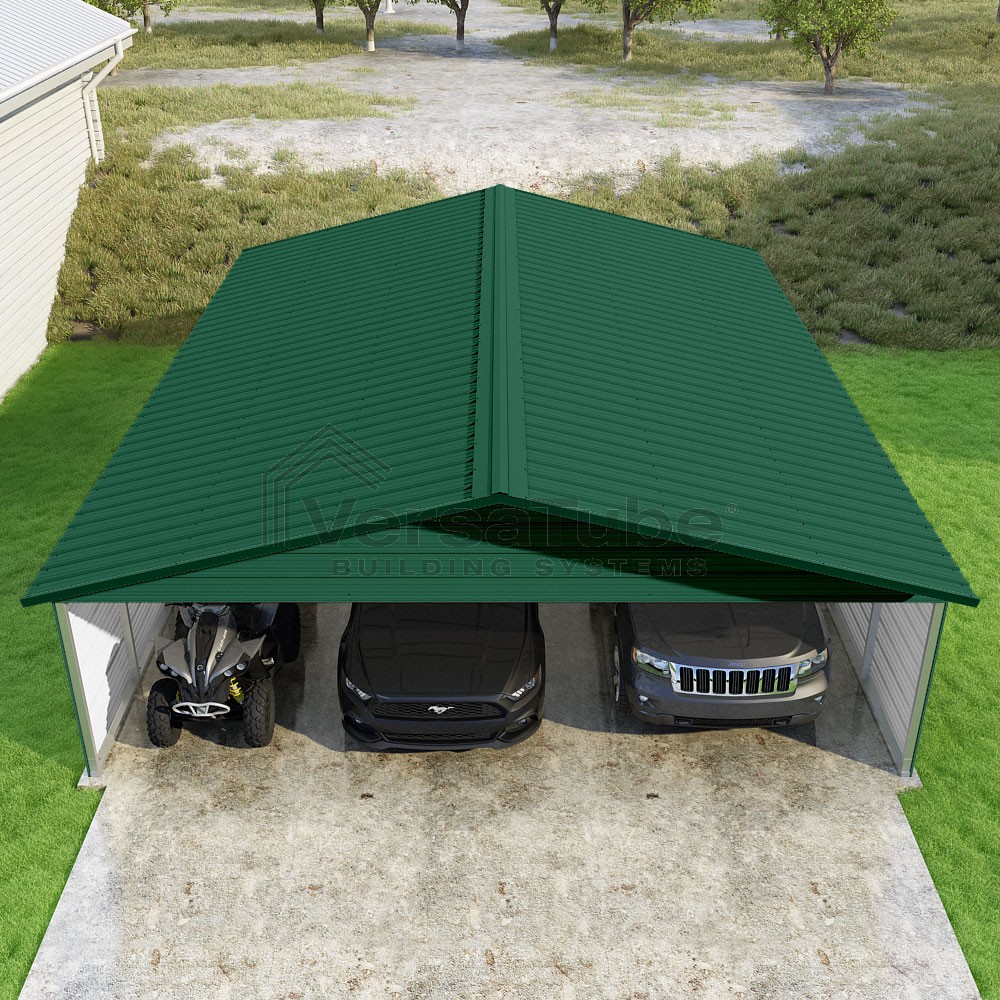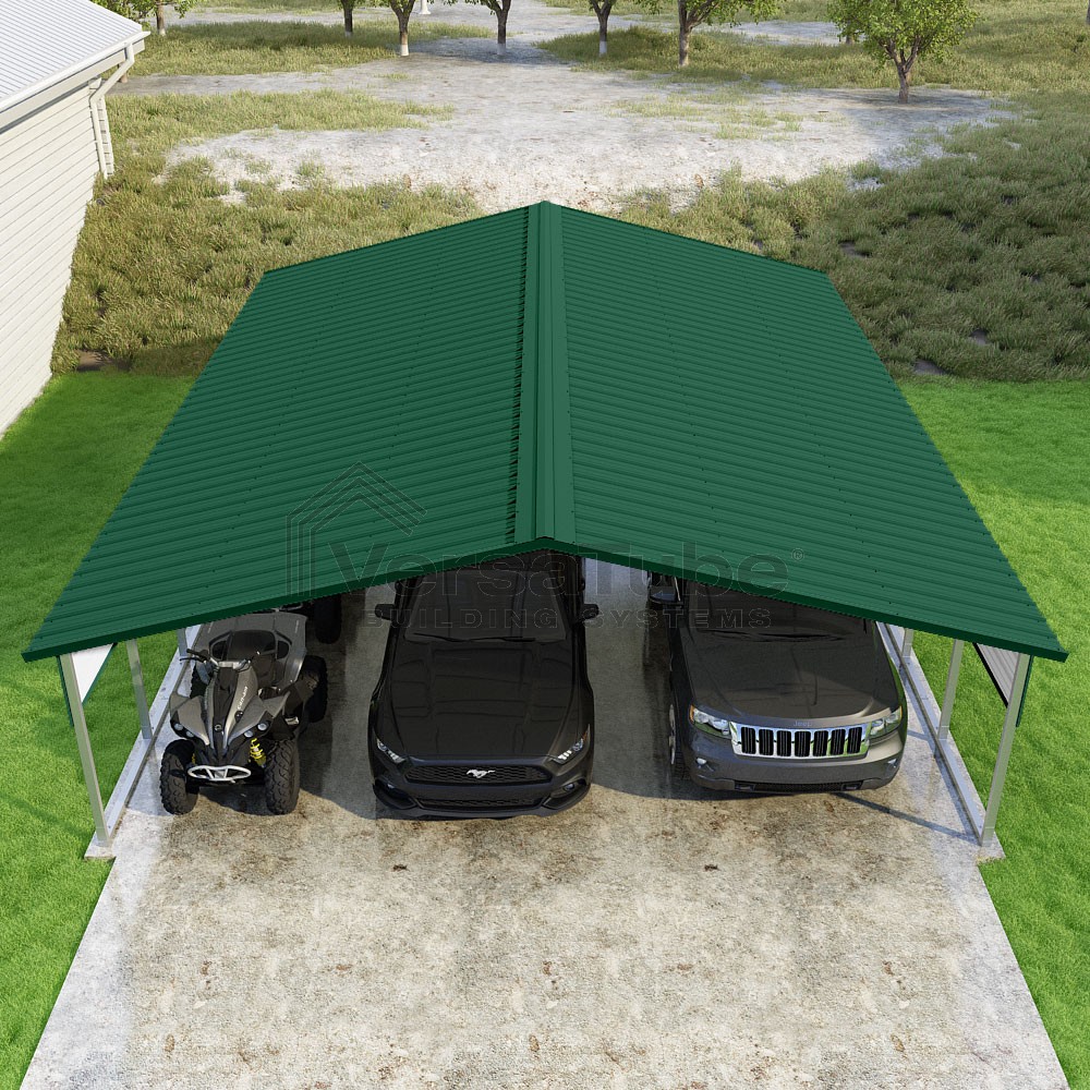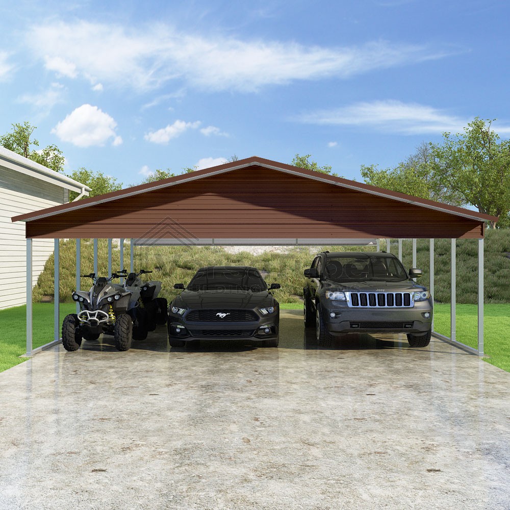 Pinnacle Series DIY carport kit features vertical sheet metal roof panels with ridge cap, gable and eave trim for an A-frame roof style and extended coverage on both ends.