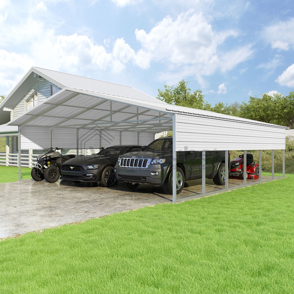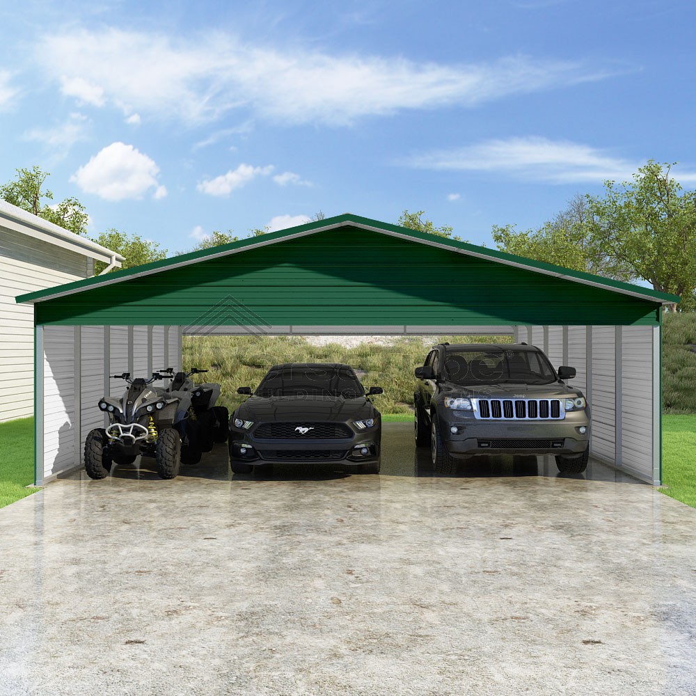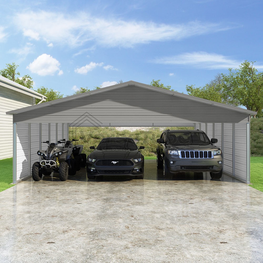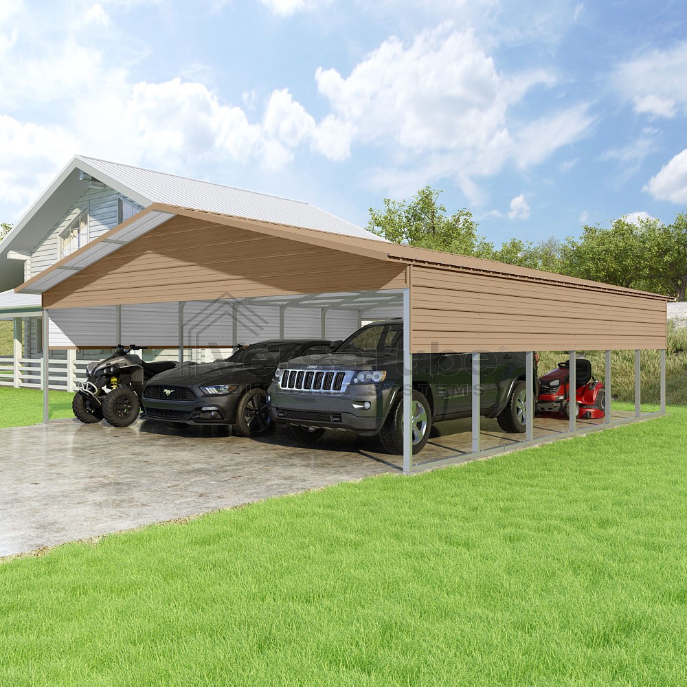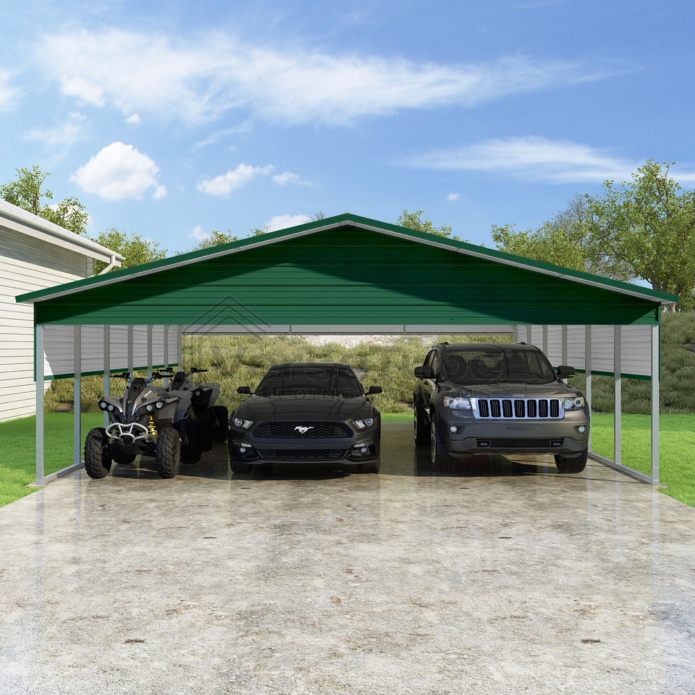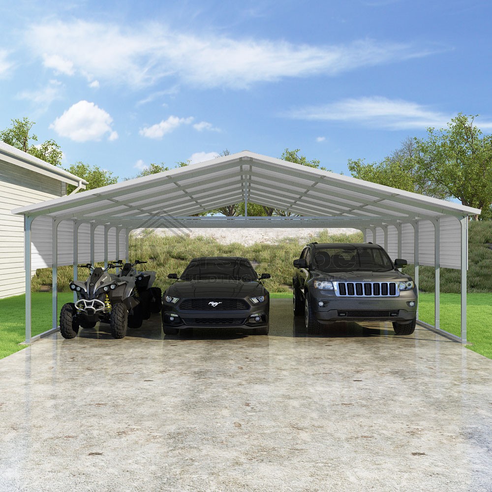 Pinnacle Series DIY carport kit features vertical sheet metal roof panels with ridge cap, gable and eave trim for an A-frame roof style and extended coverage on both ends.