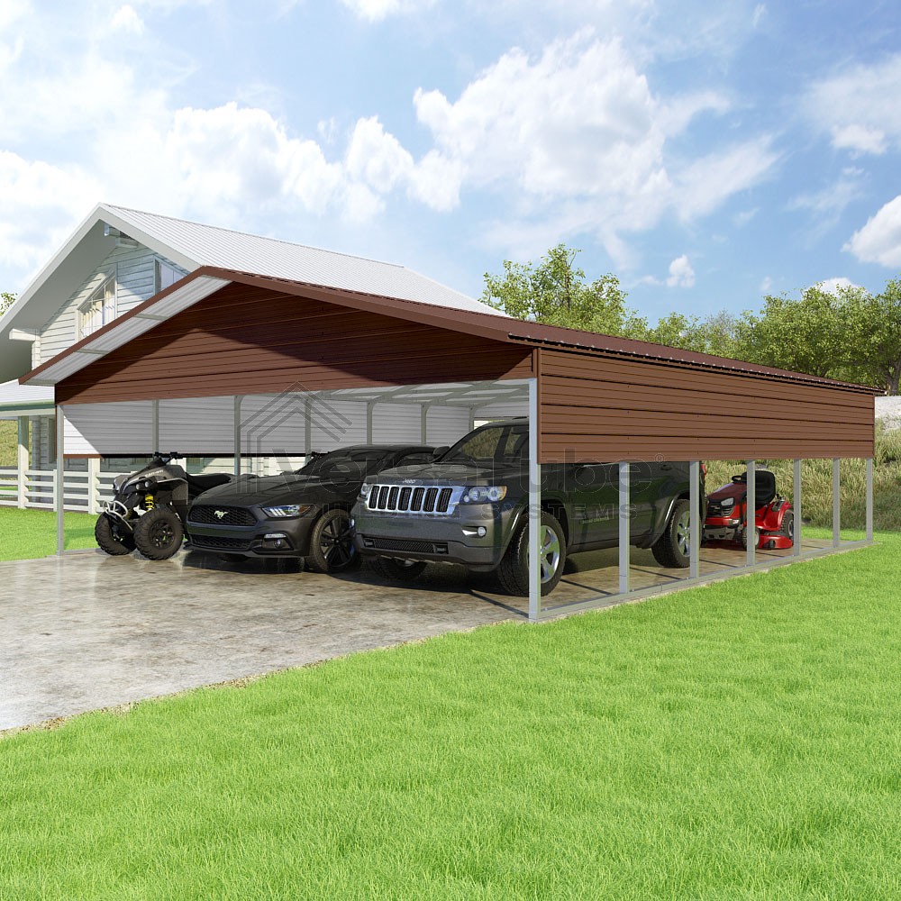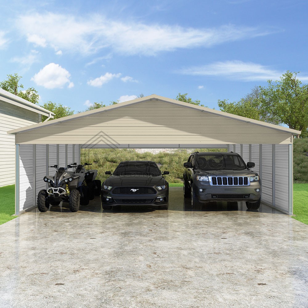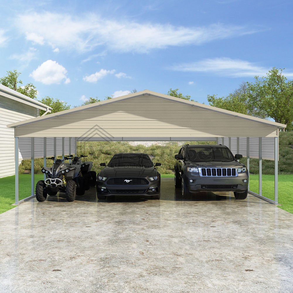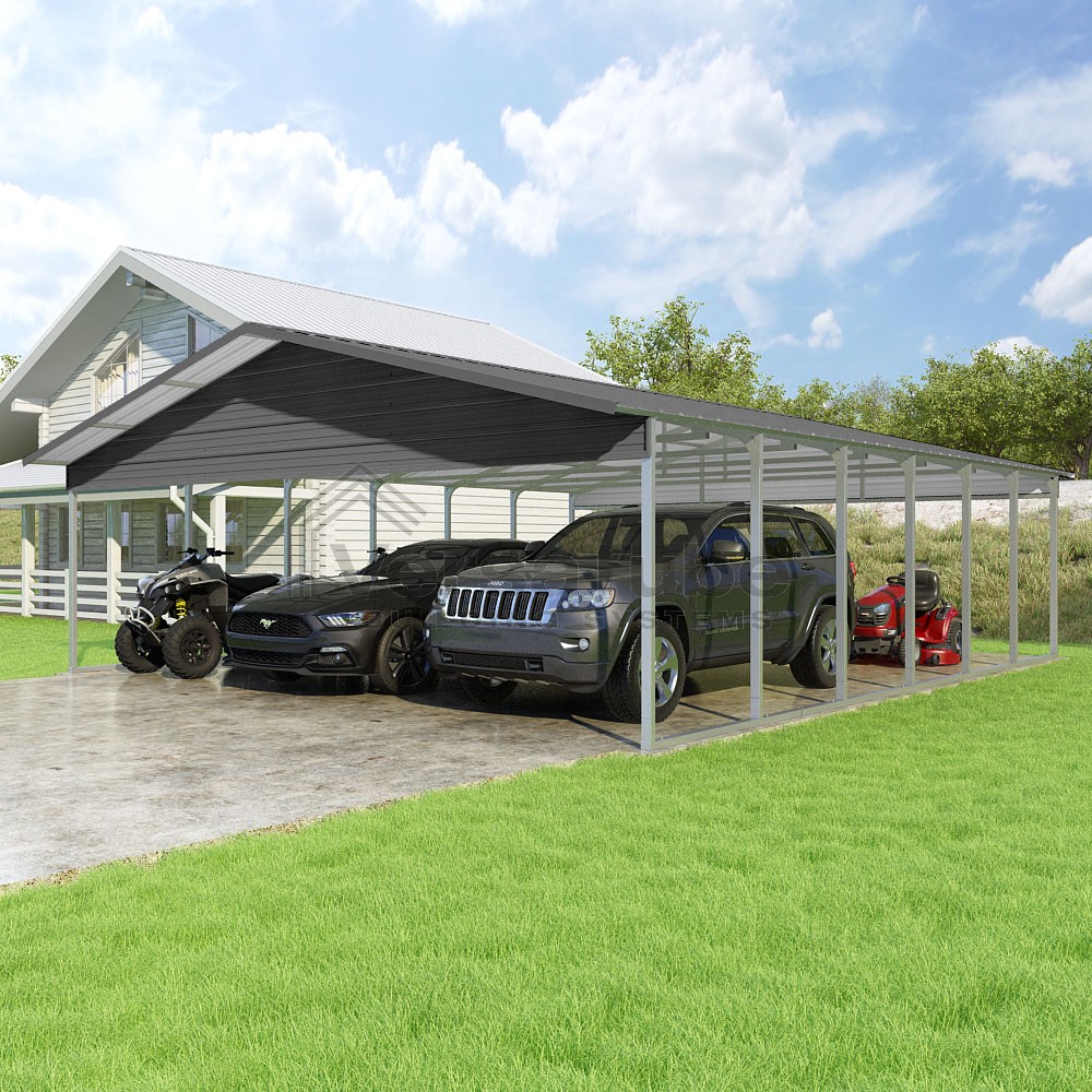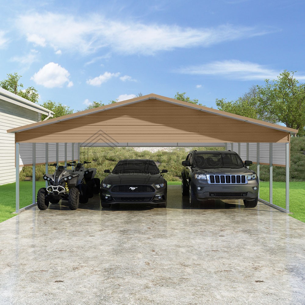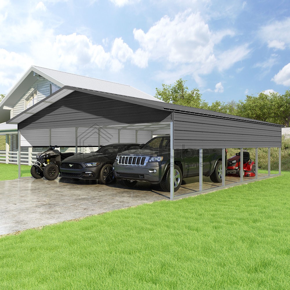 Pinnacle Series DIY carport kit features vertical sheet metal roof panels with ridge cap, gable and eave trim for an A-frame roof style and extended coverage on both ends.
