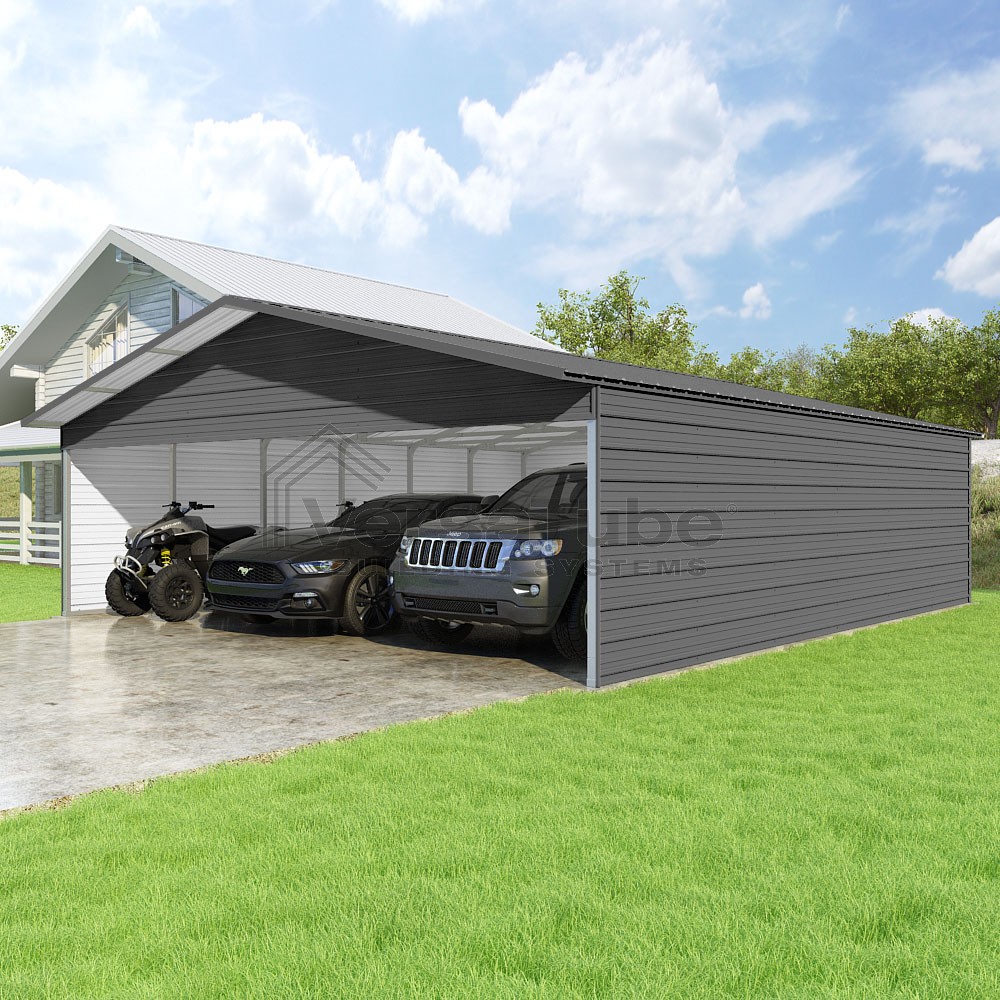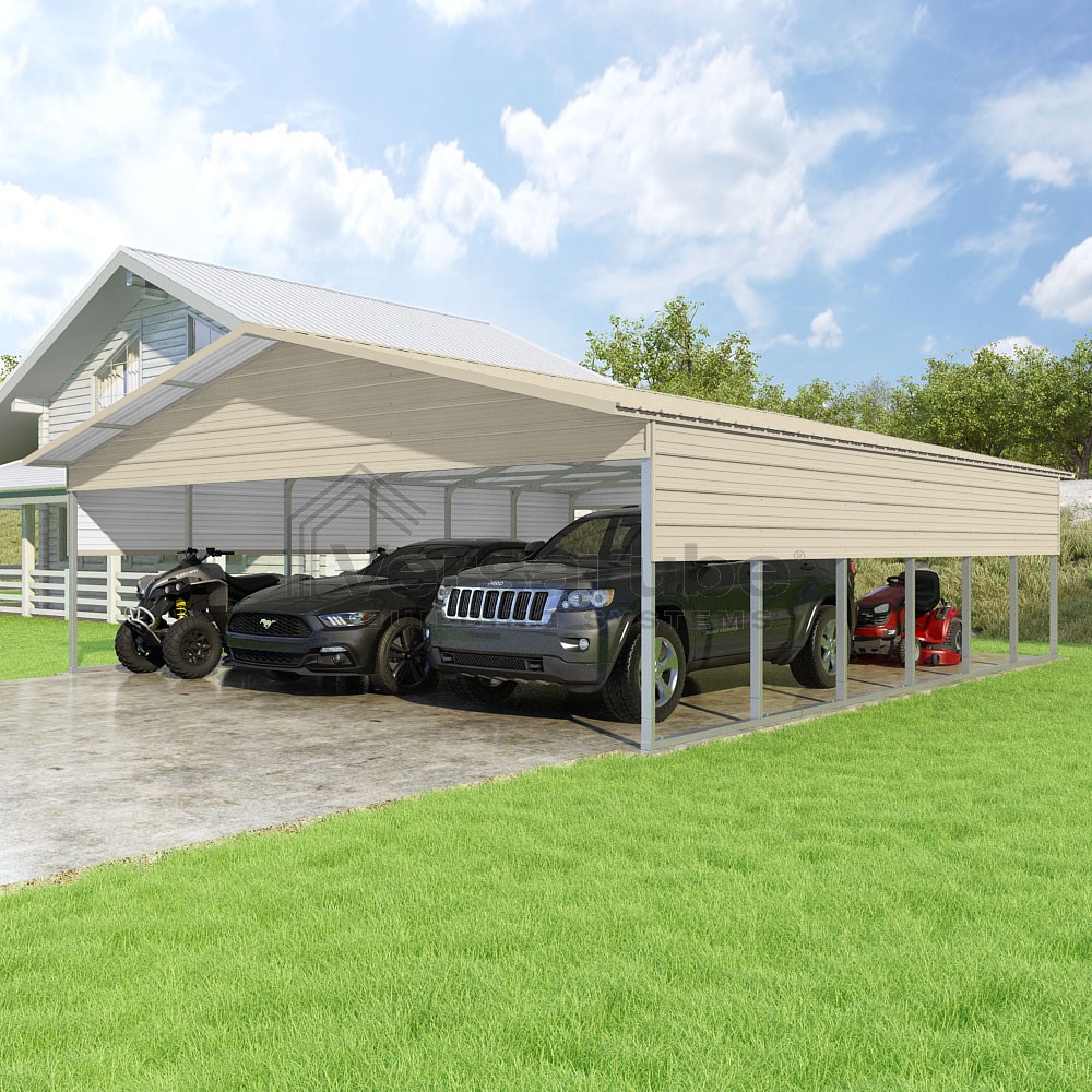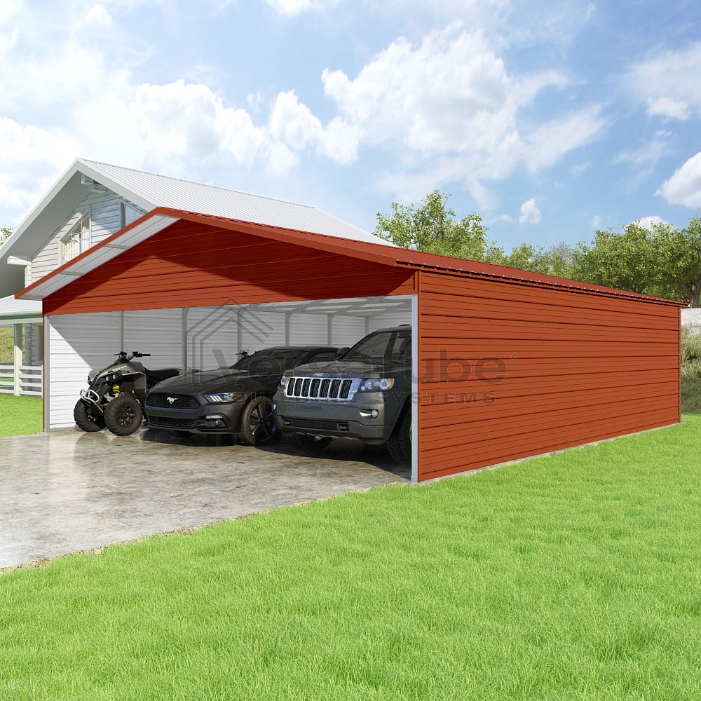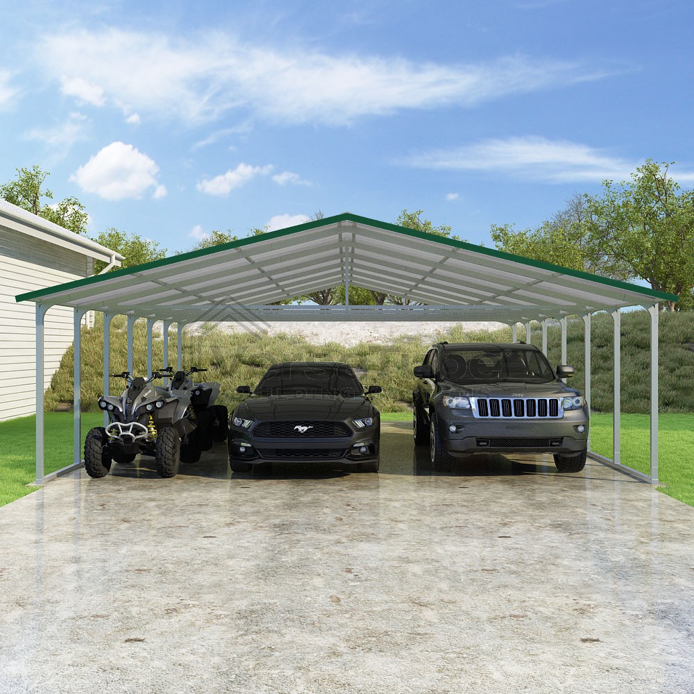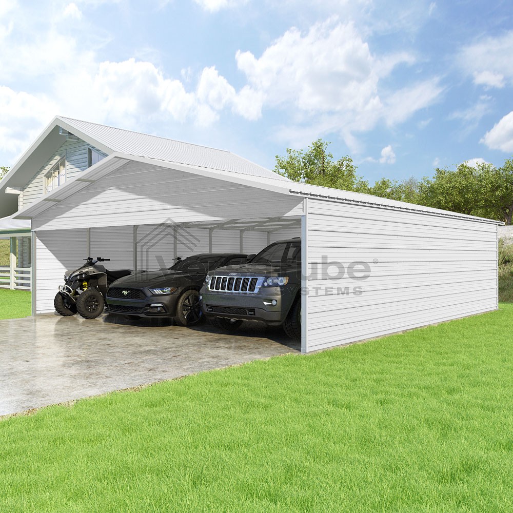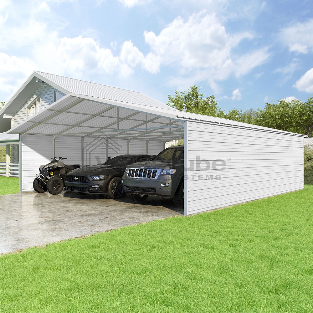Pinnacle Series DIY carport kit features vertical sheet metal roof panels with ridge cap, gable and eave trim for an A-frame roof style and extended coverage on both ends.