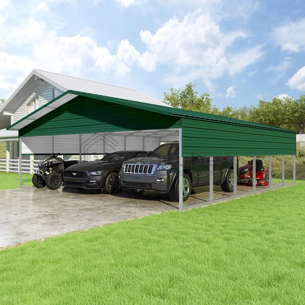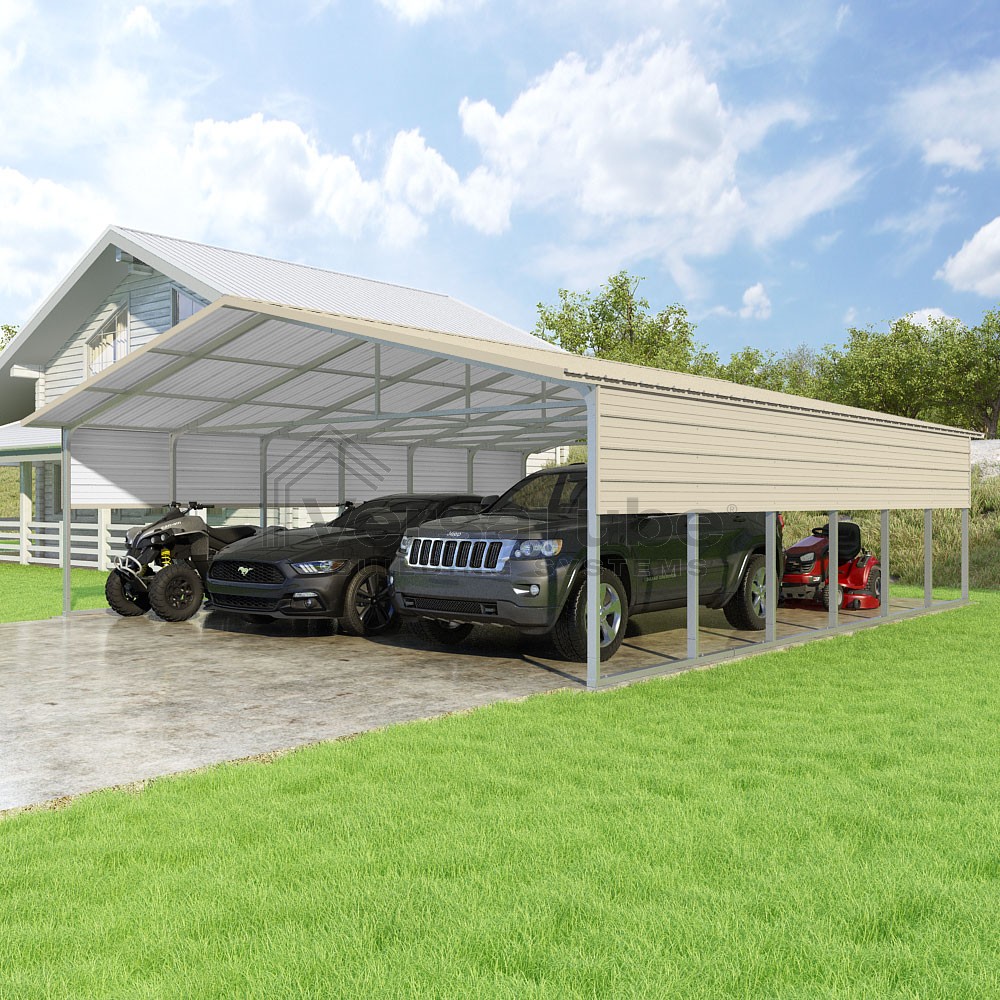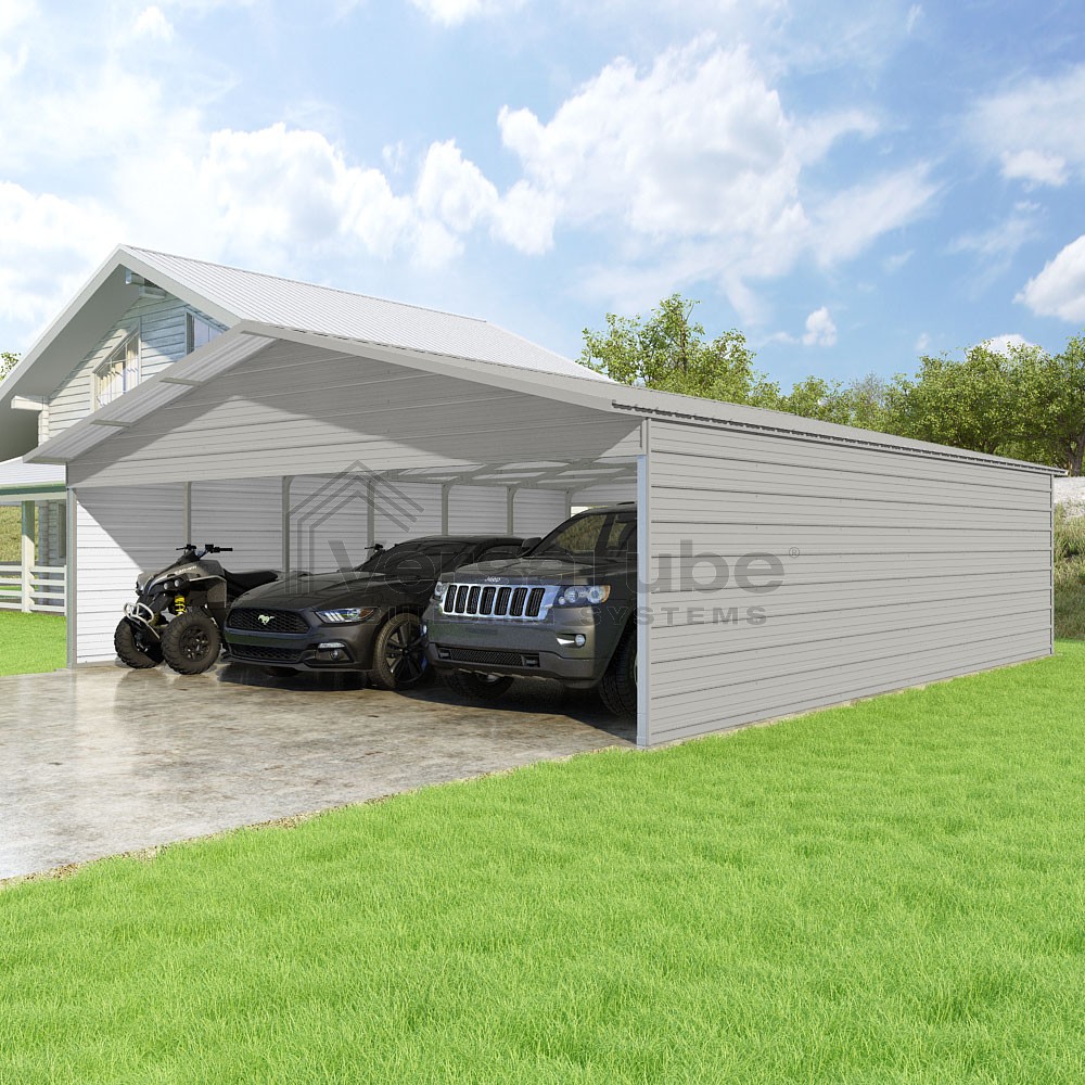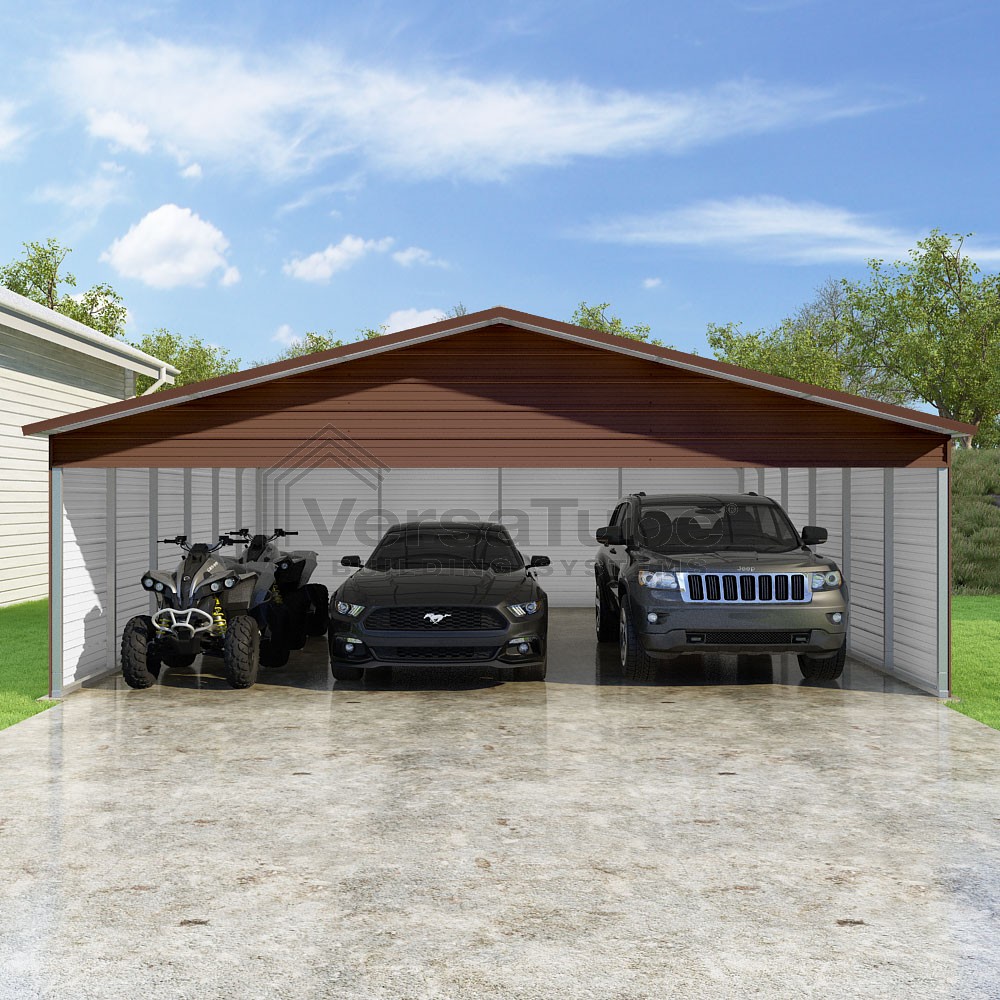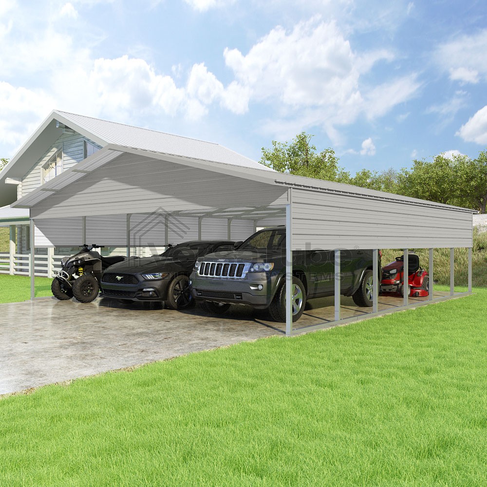 Pinnacle Series DIY carport kit features vertical sheet metal roof panels with ridge cap, gable and eave trim for an A-frame roof style and extended coverage on both ends.