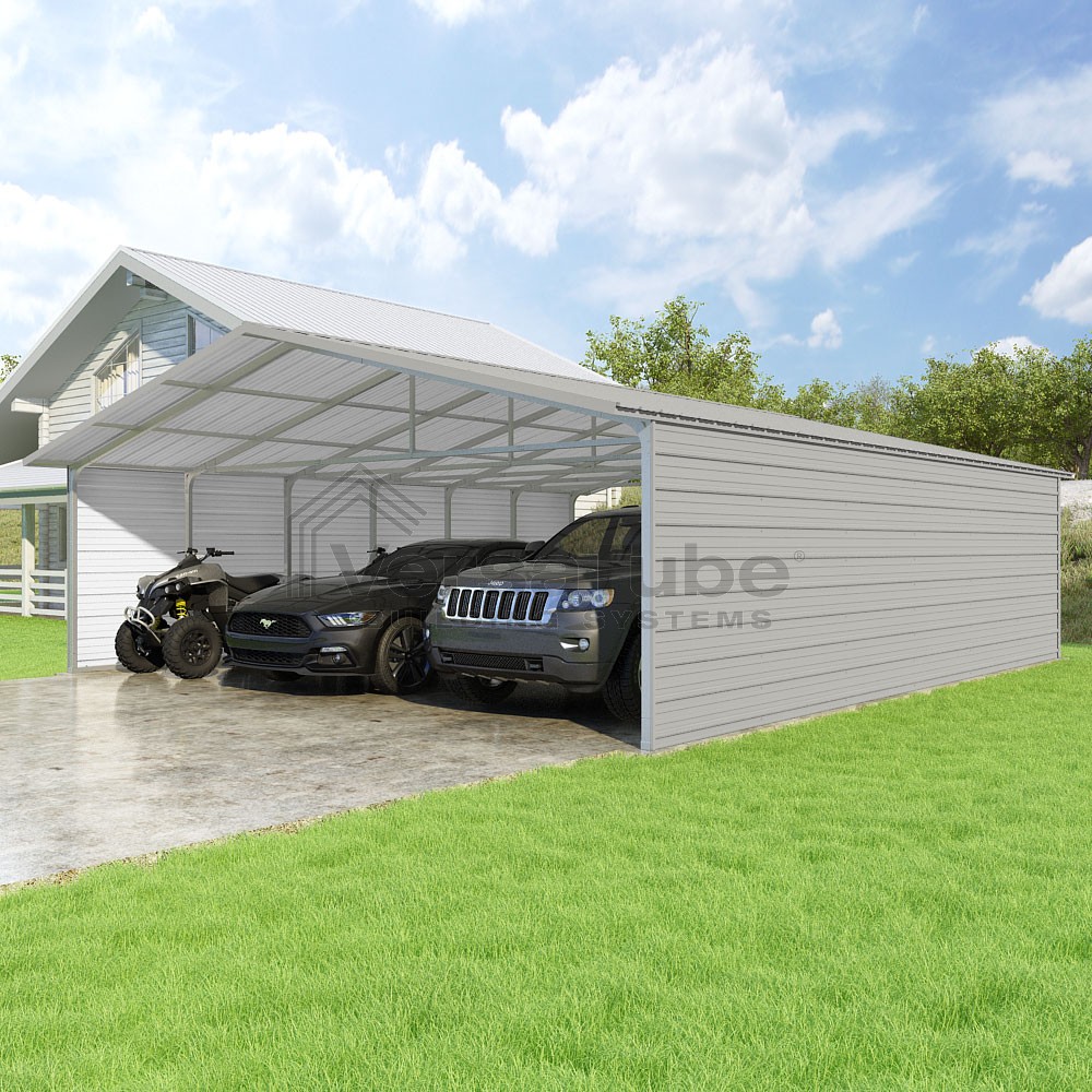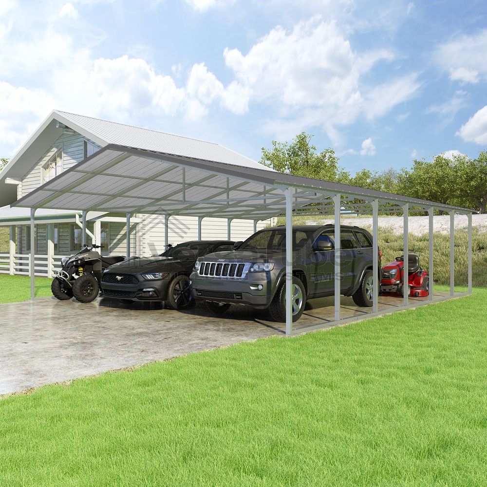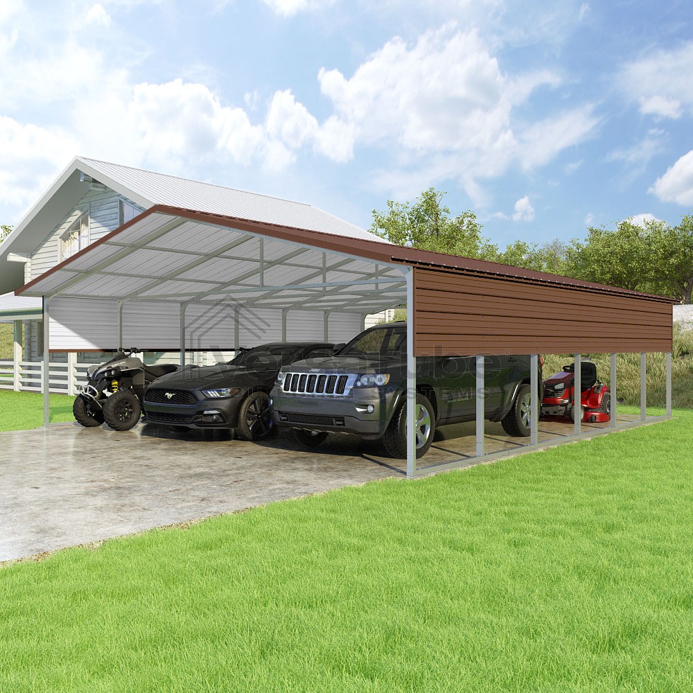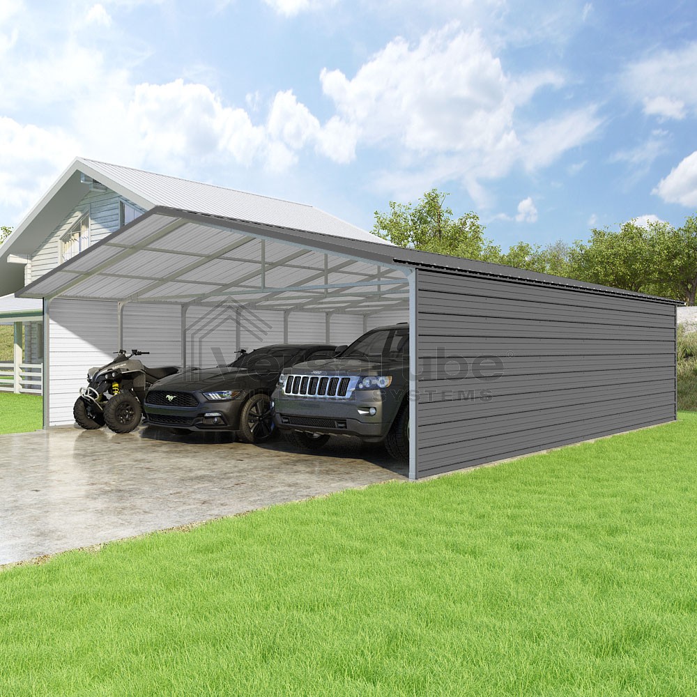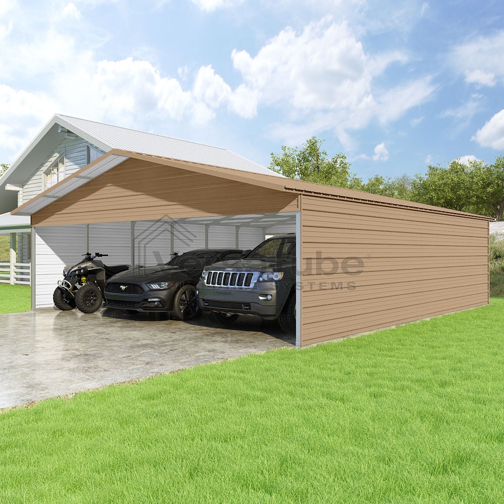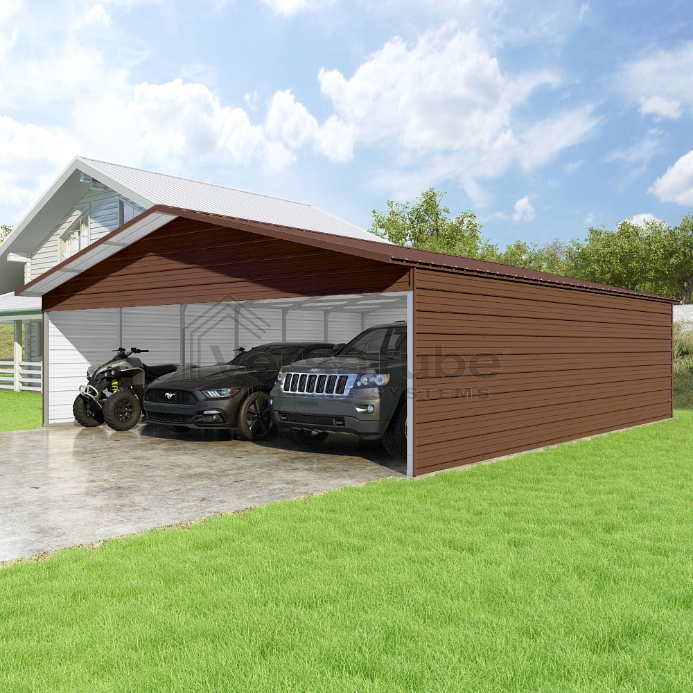 Pinnacle Series DIY carport kit features vertical sheet metal roof panels with ridge cap, gable and eave trim for an A-frame roof style and extended coverage on both ends.