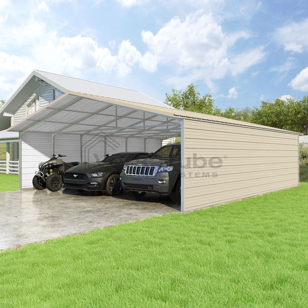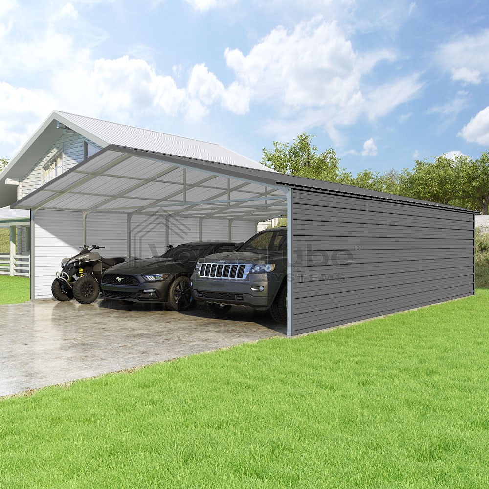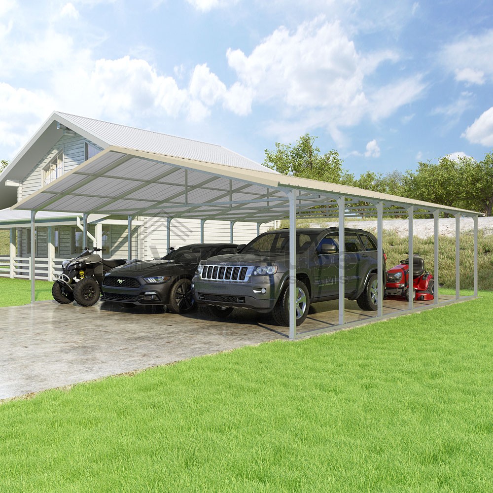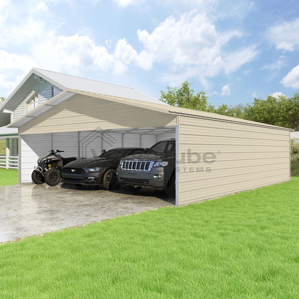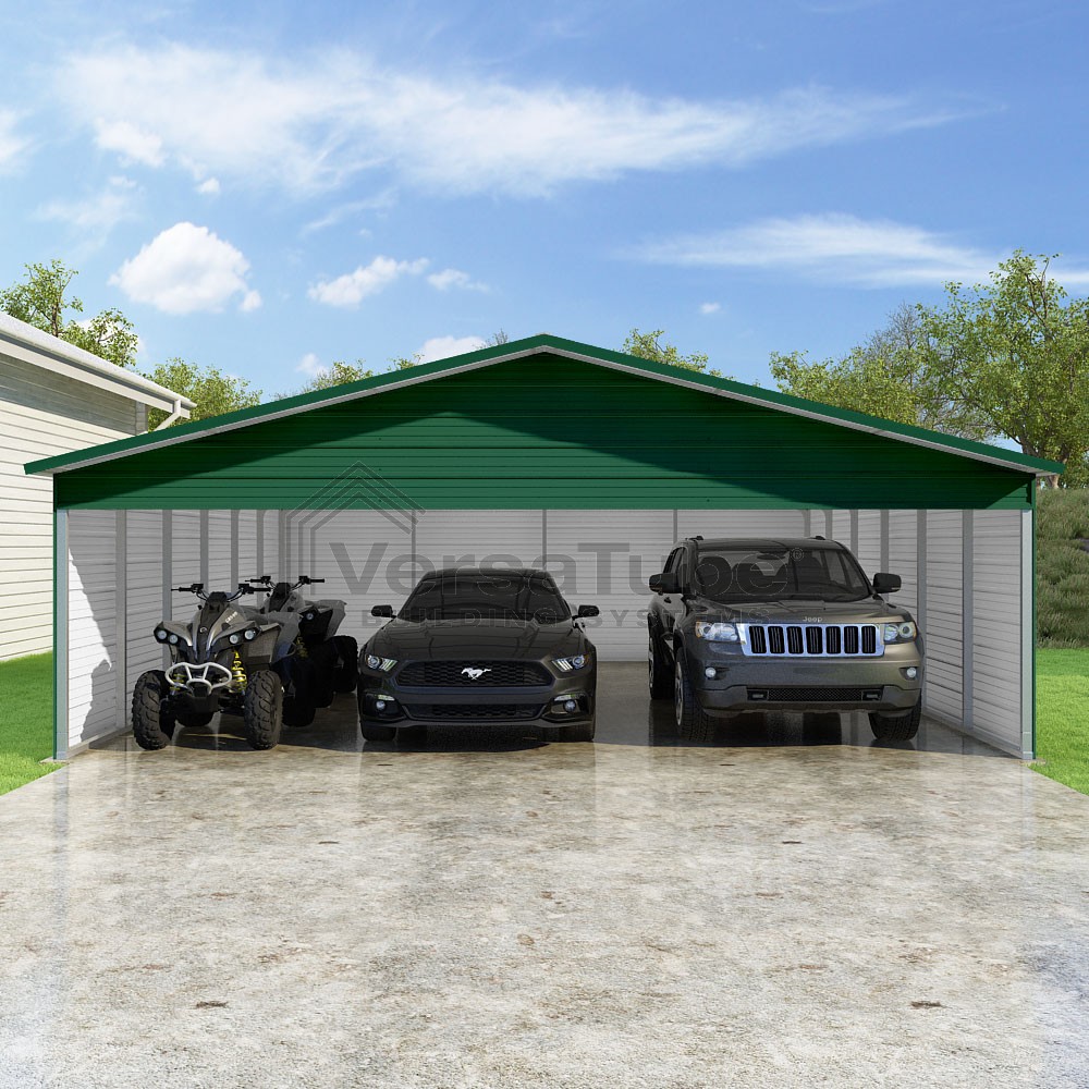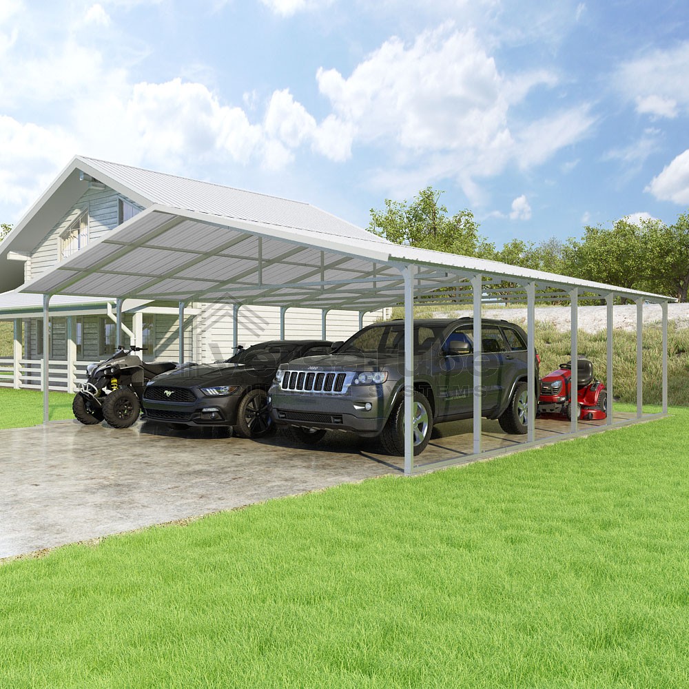 Pinnacle Series DIY carport kit features vertical sheet metal roof panels with ridge cap, gable and eave trim for an A-frame roof style and extended coverage on both ends.