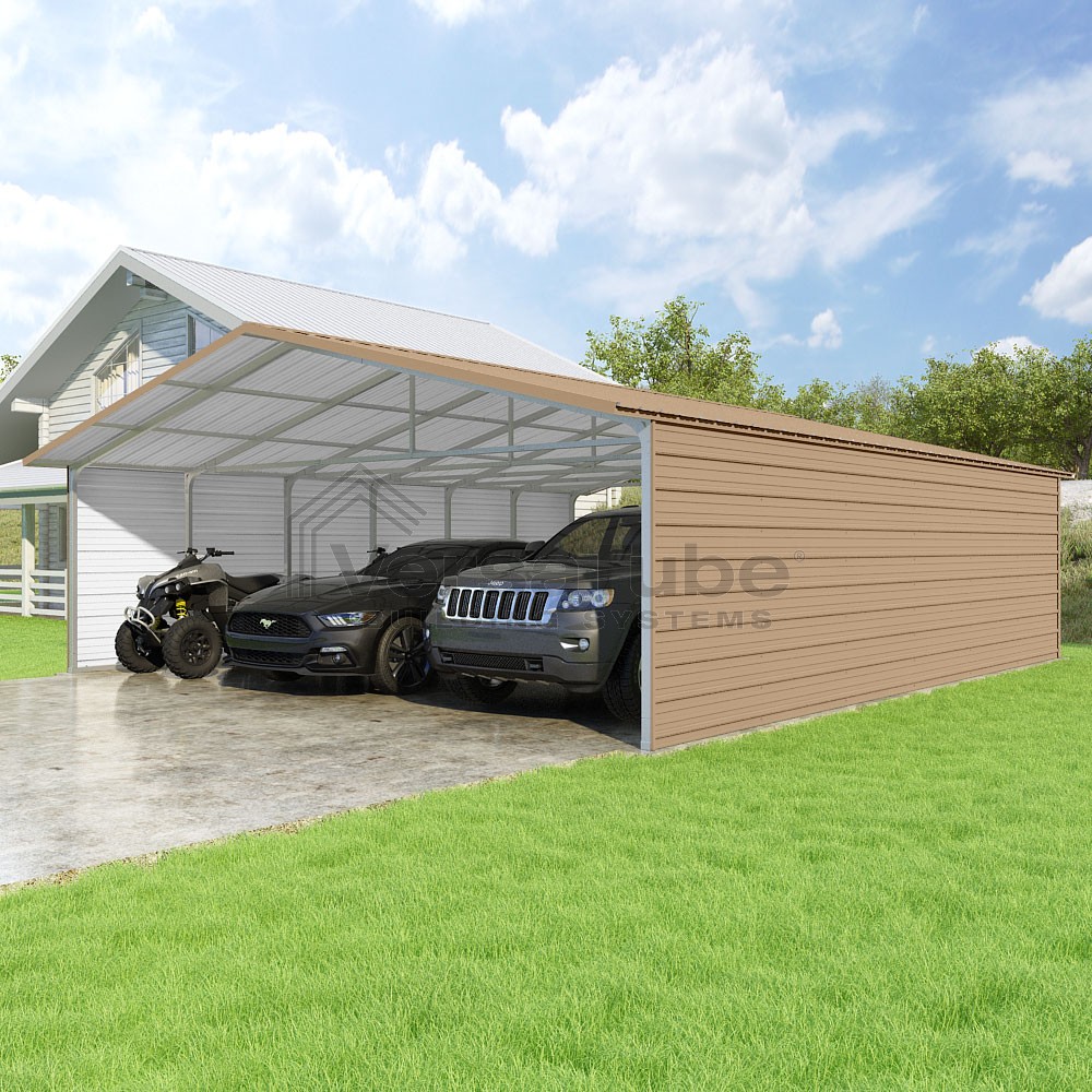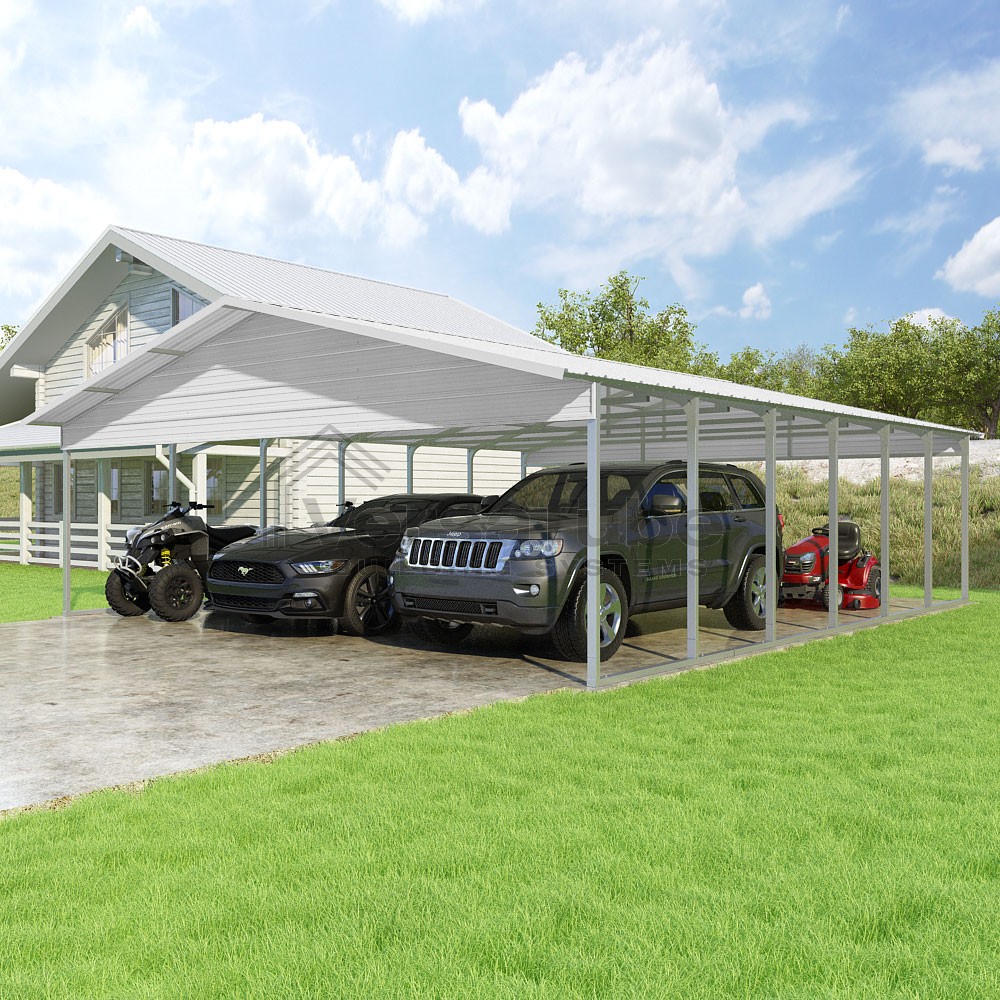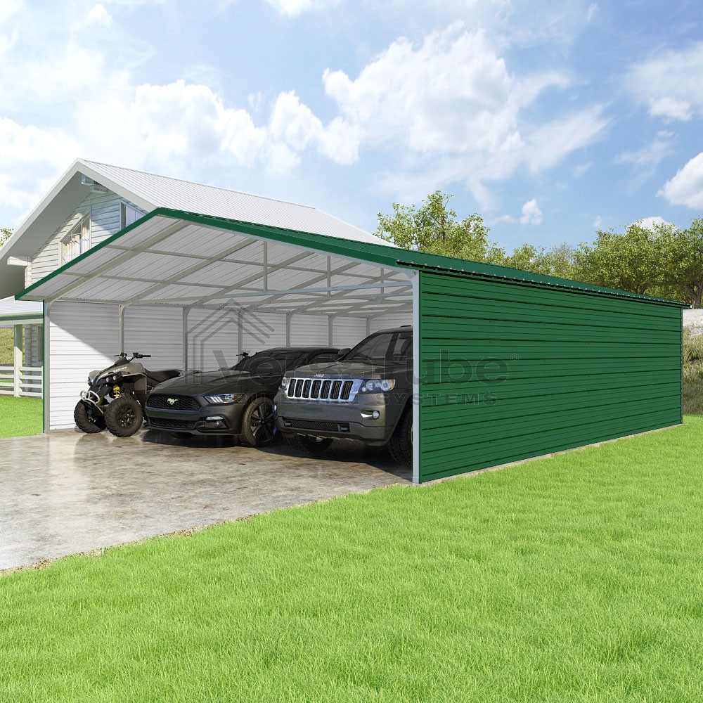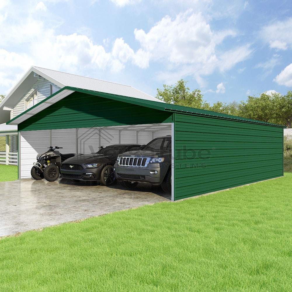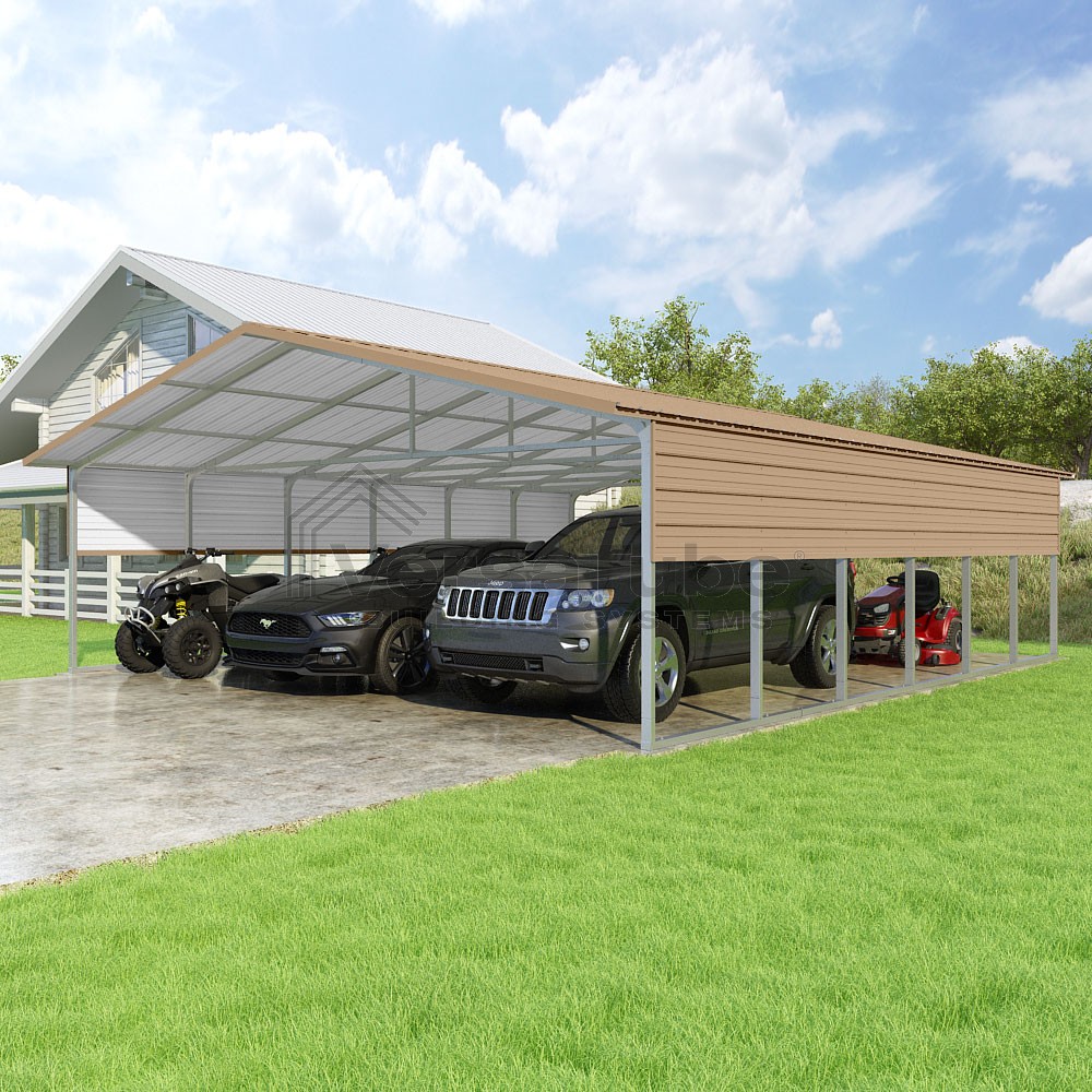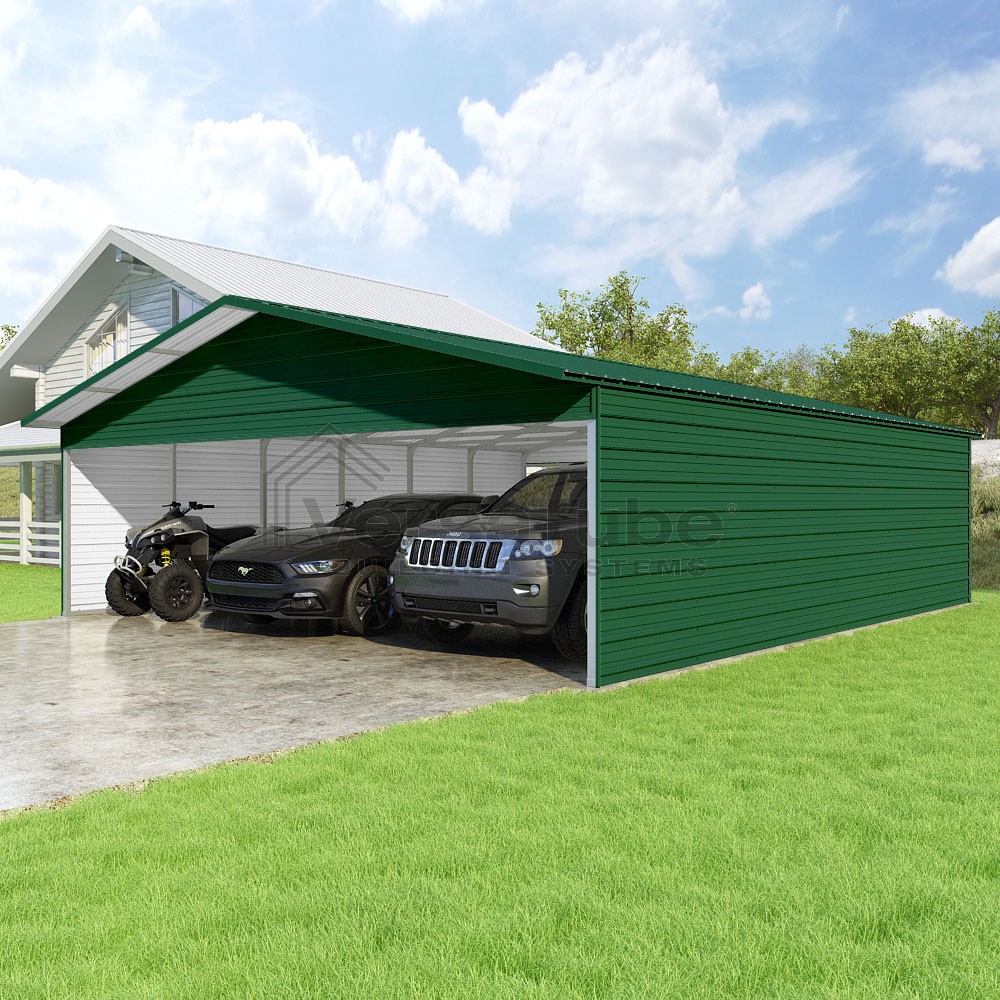 Pinnacle Series DIY carport kit features vertical sheet metal roof panels with ridge cap, gable and eave trim for an A-frame roof style and extended coverage on both ends.