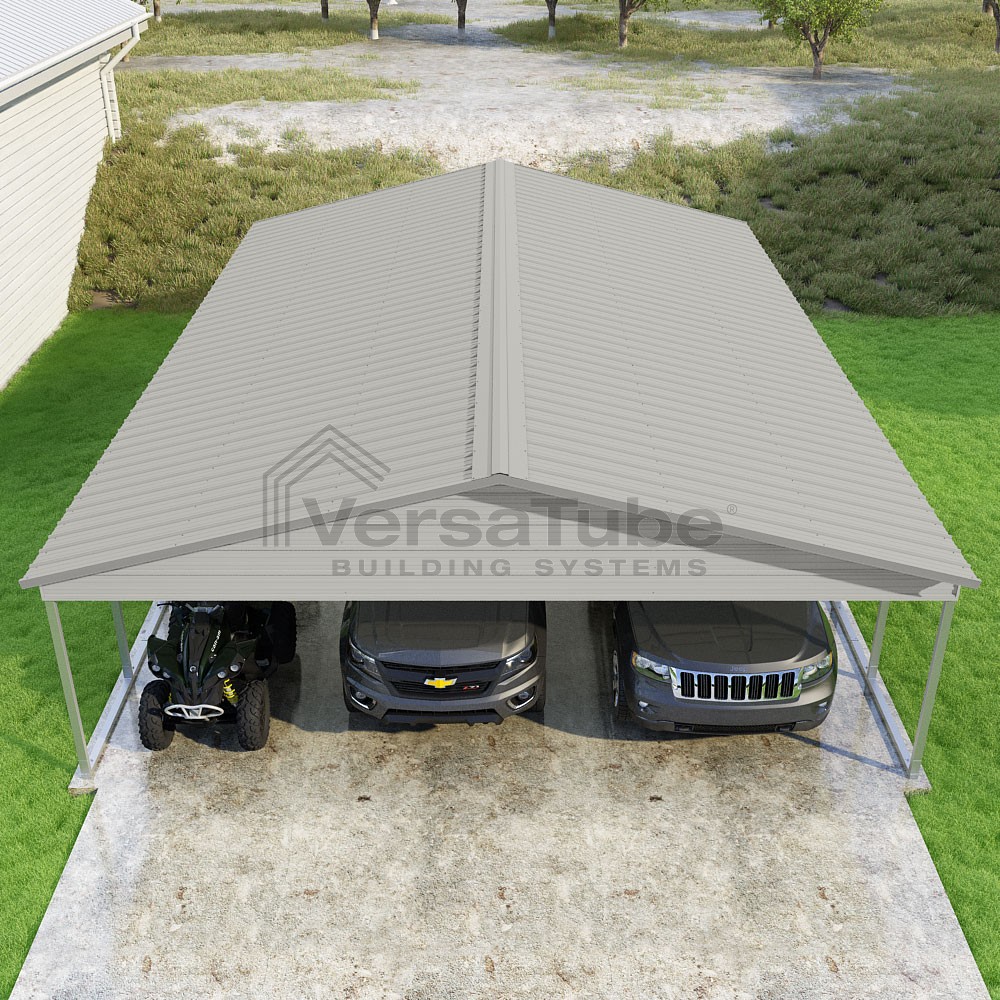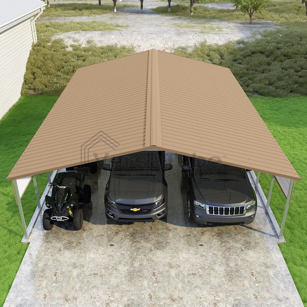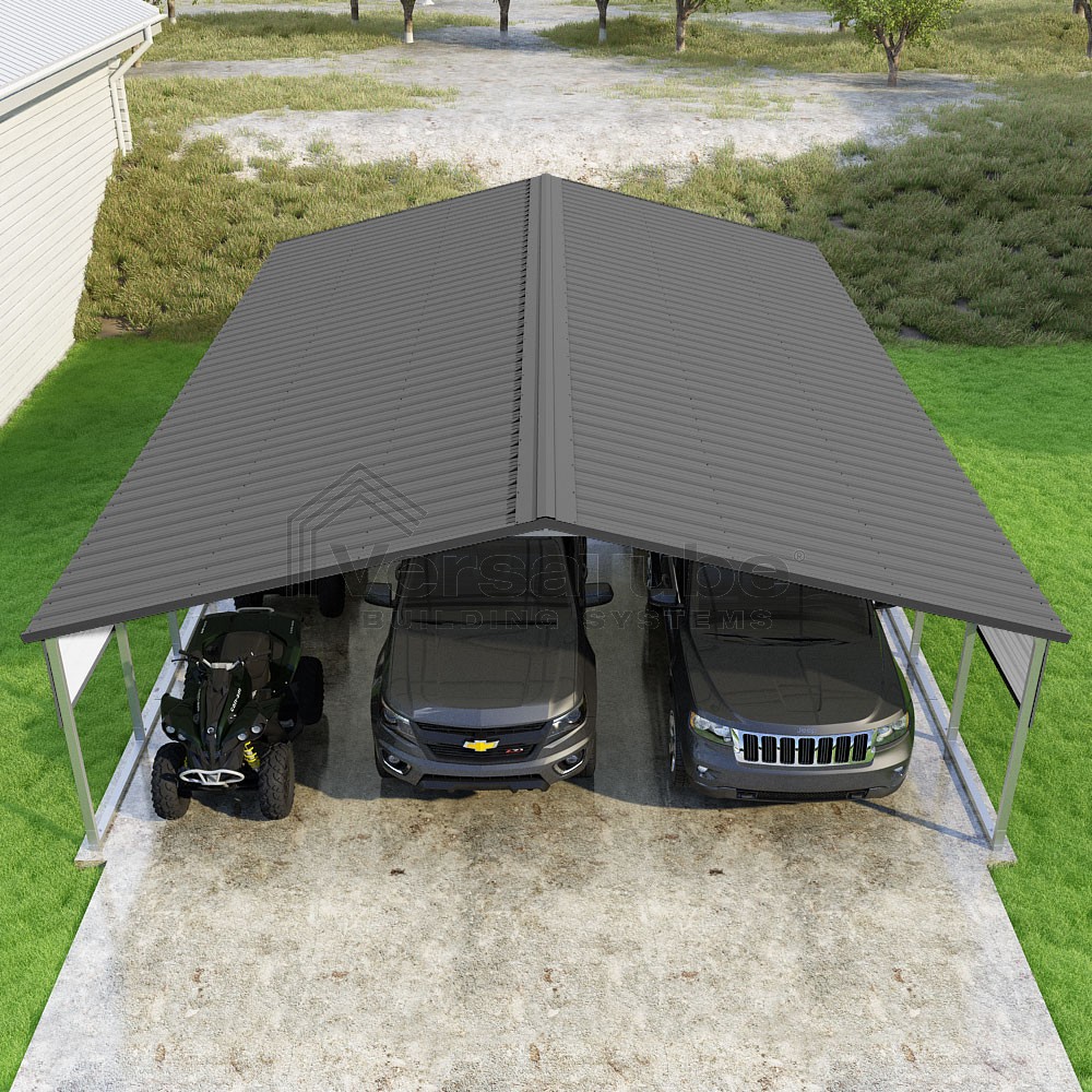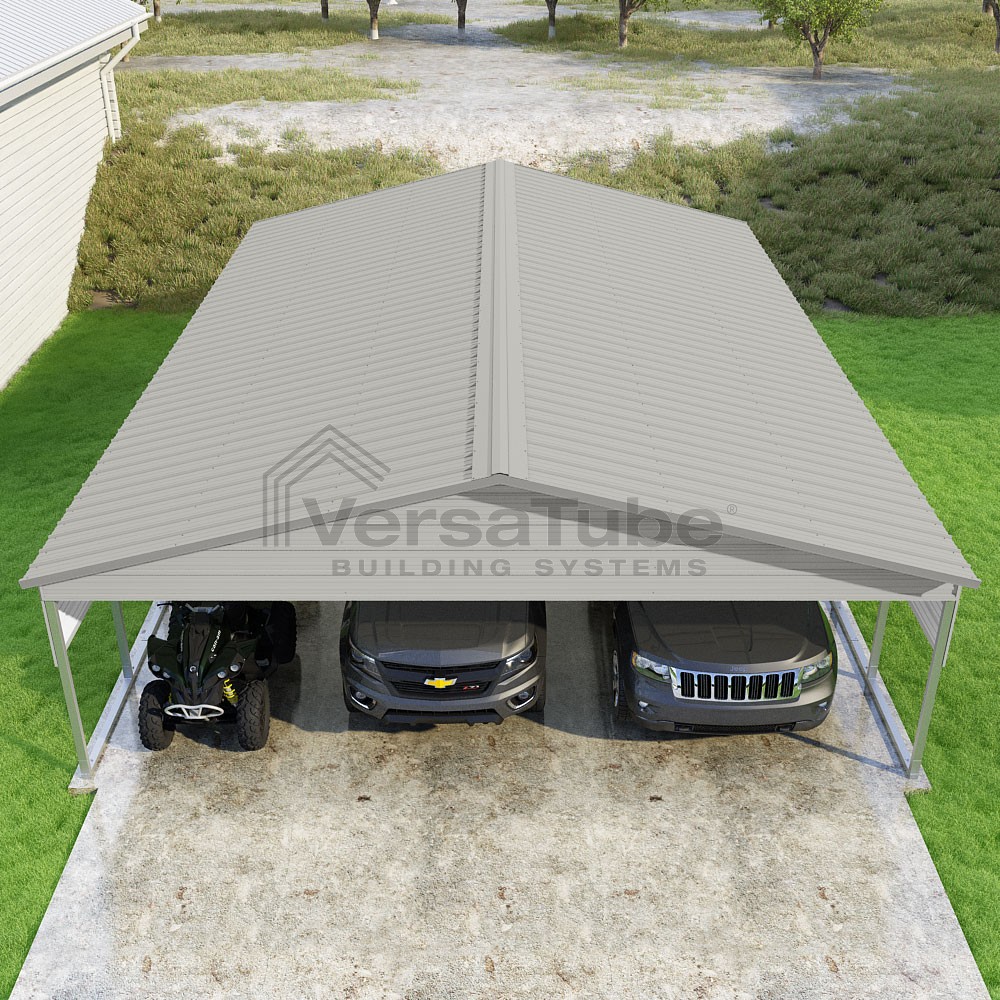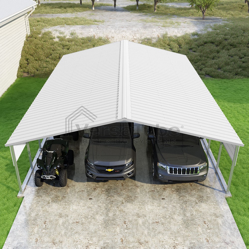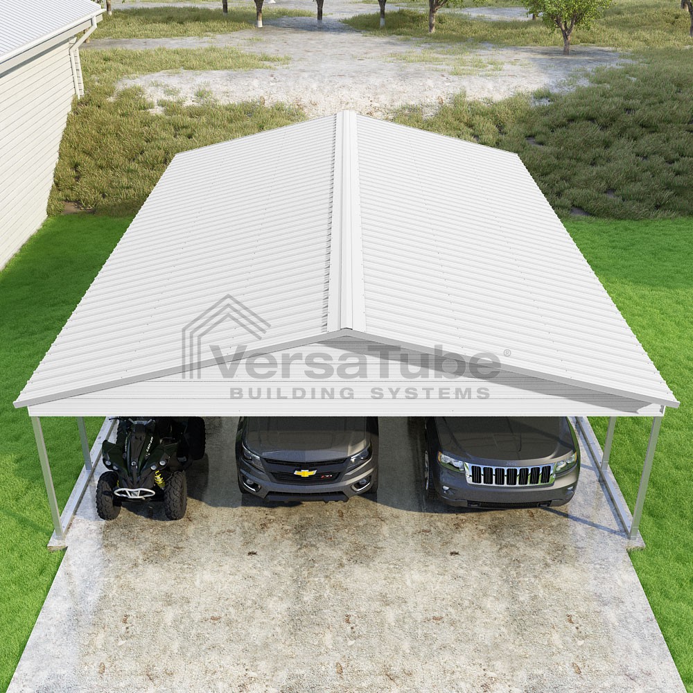 Pinnacle Series DIY carport kit features vertical sheet metal roof panels with ridge cap, gable and eave trim for an A-frame roof style and extended coverage on both ends.