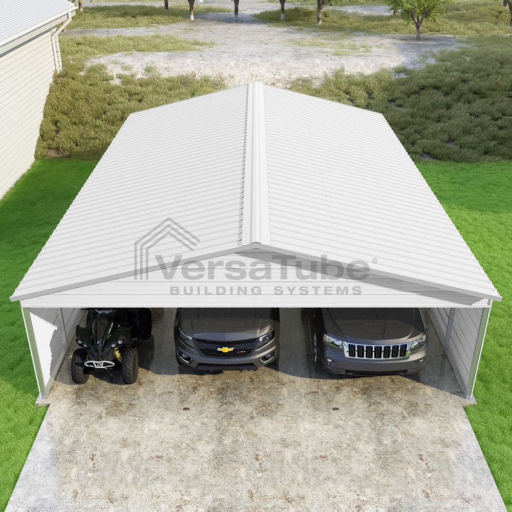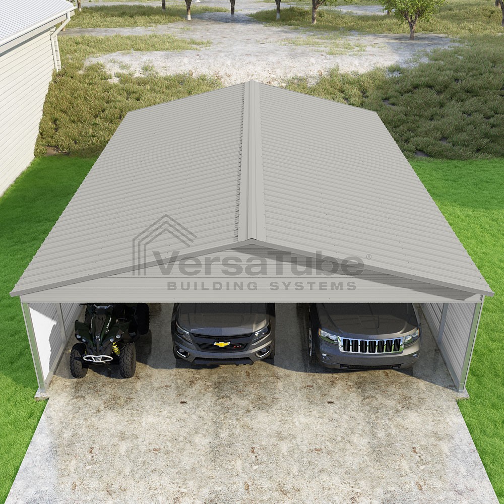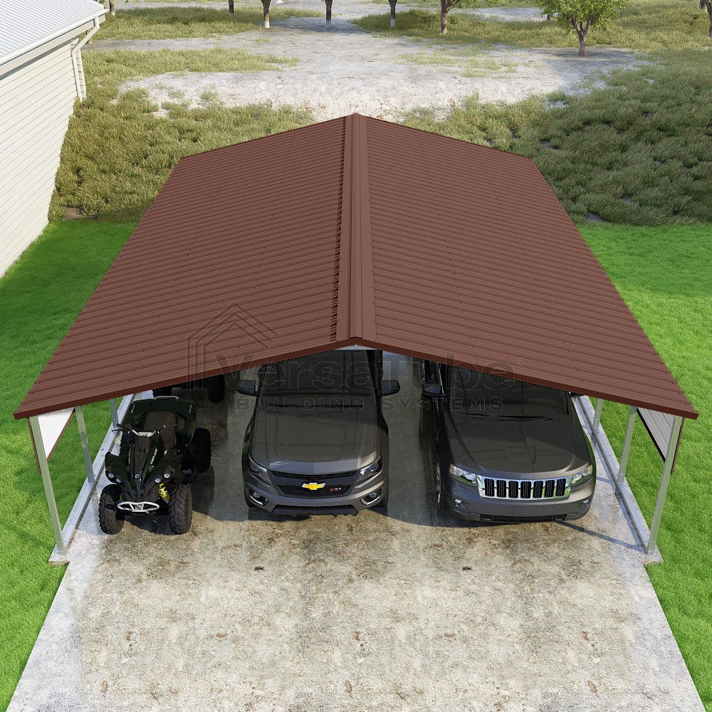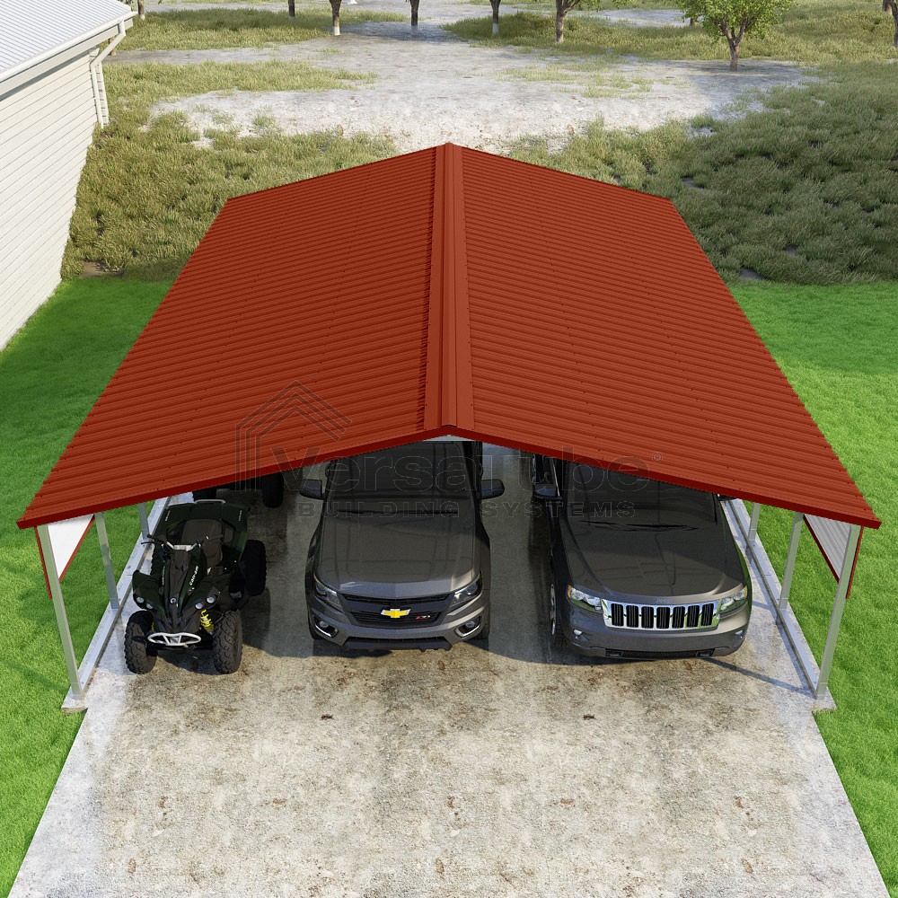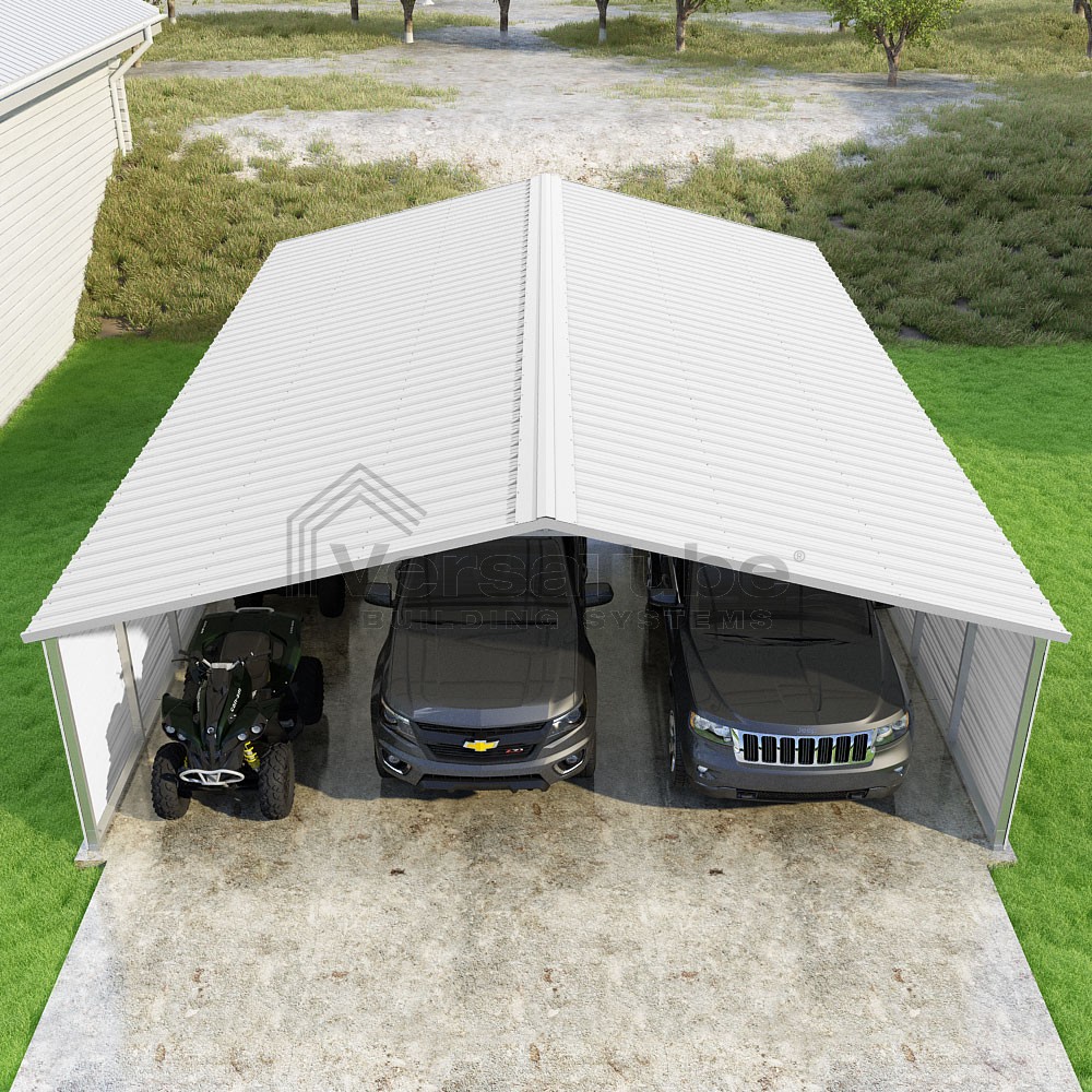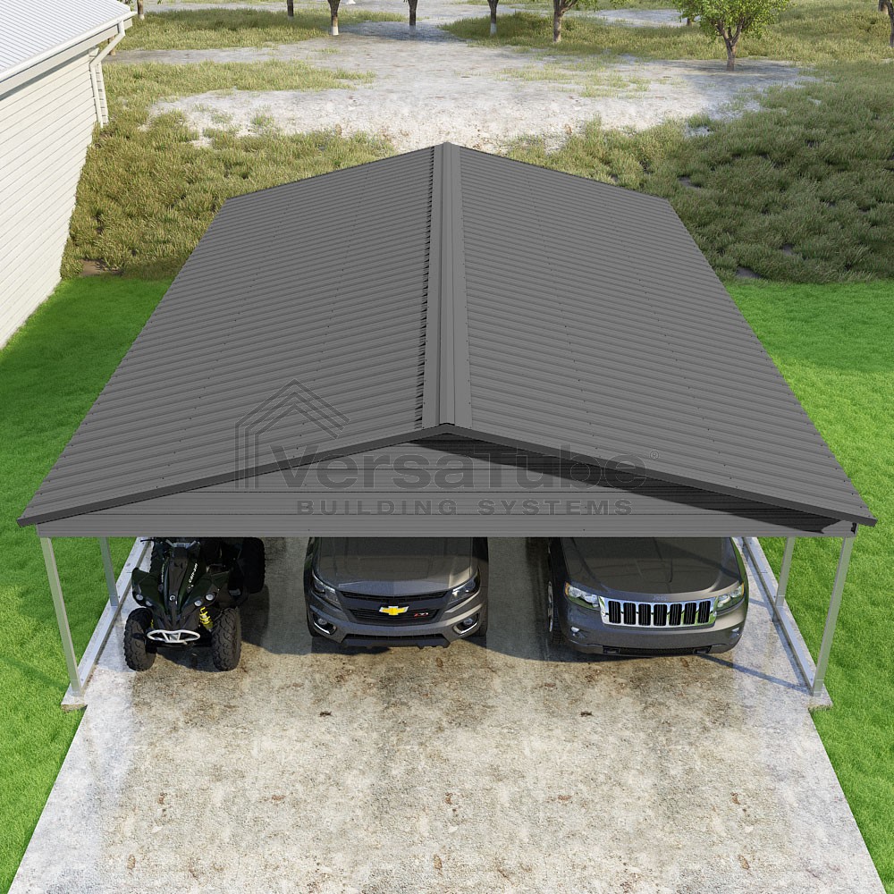 Pinnacle Series DIY carport kit features vertical sheet metal roof panels with ridge cap, gable and eave trim for an A-frame roof style and extended coverage on both ends.
