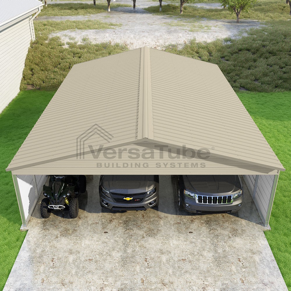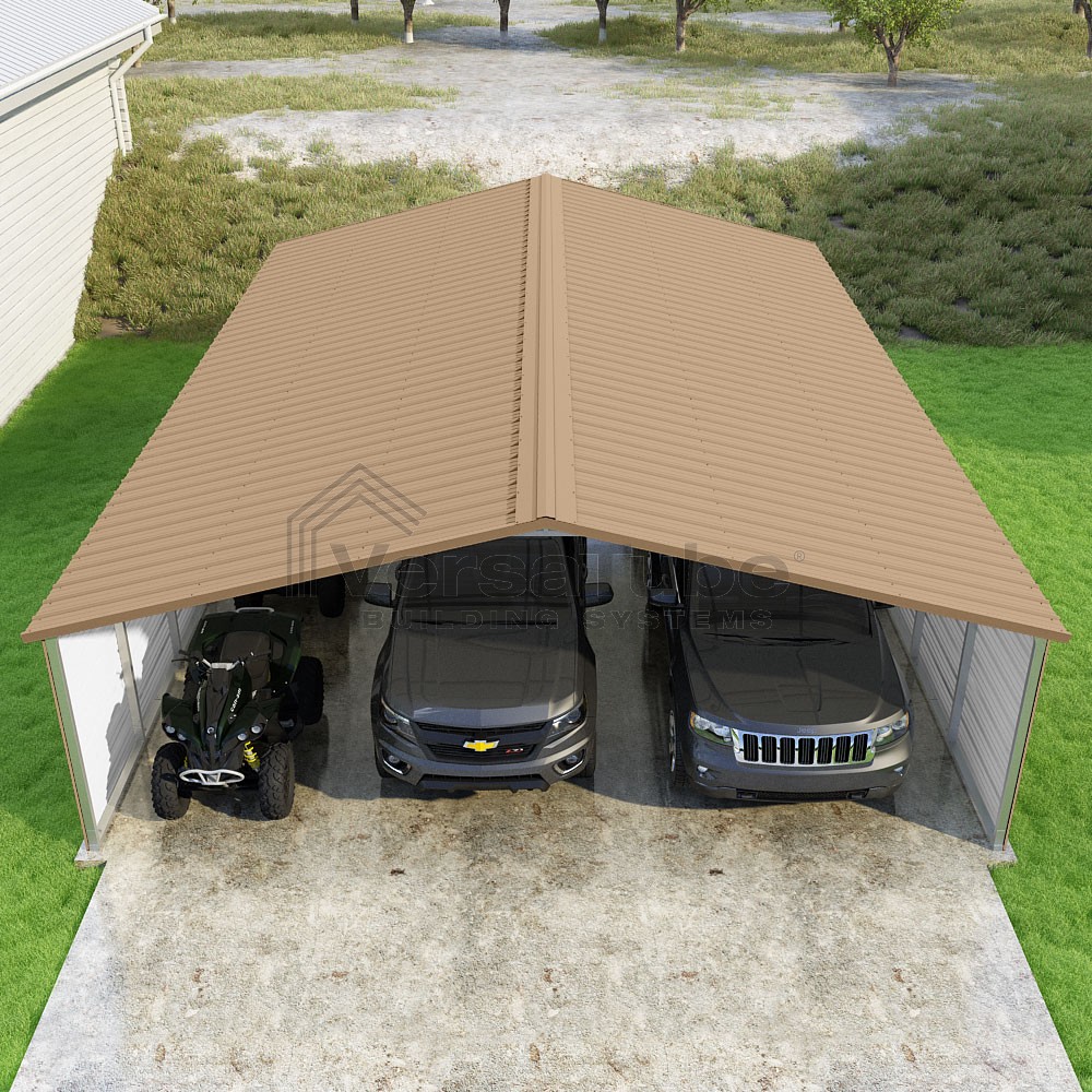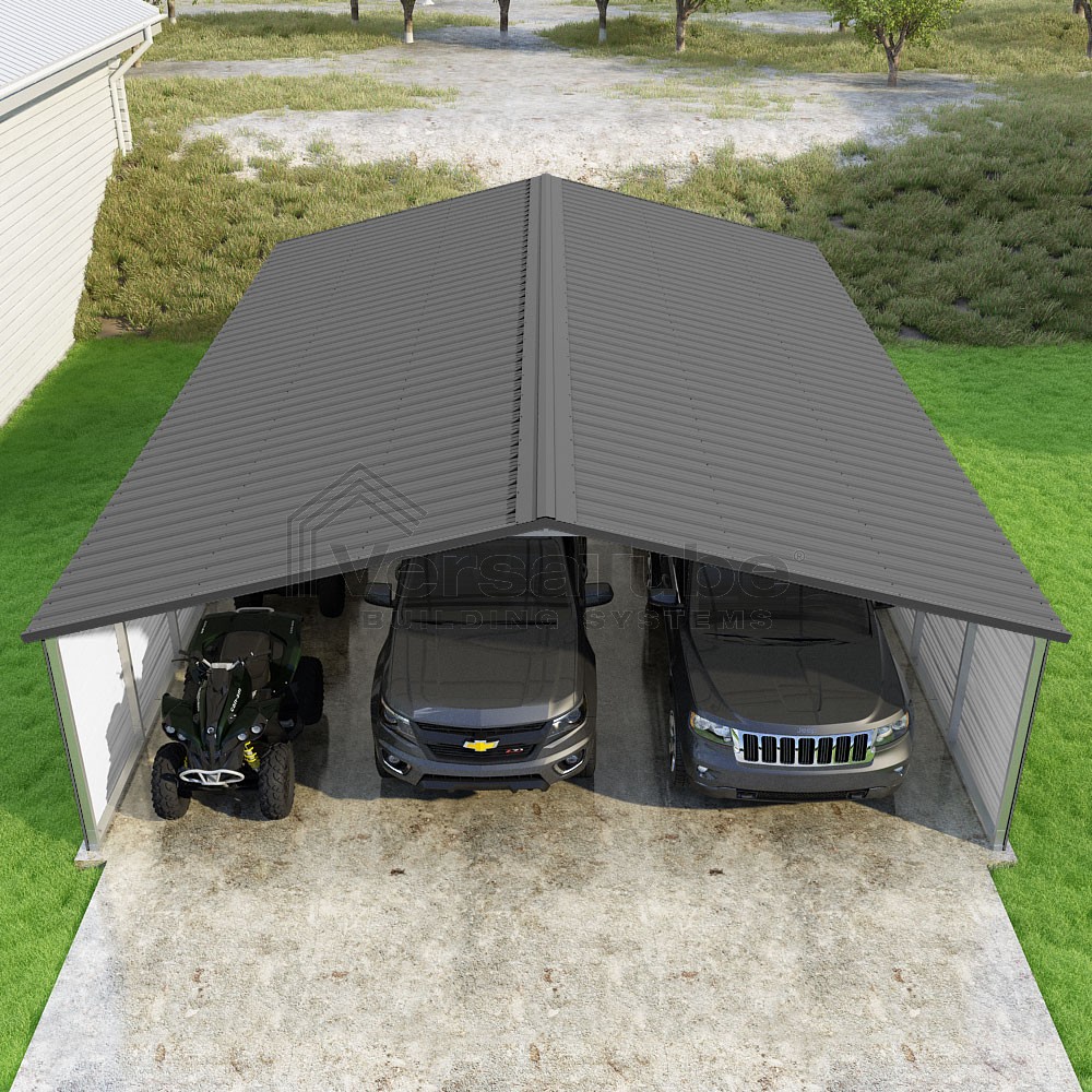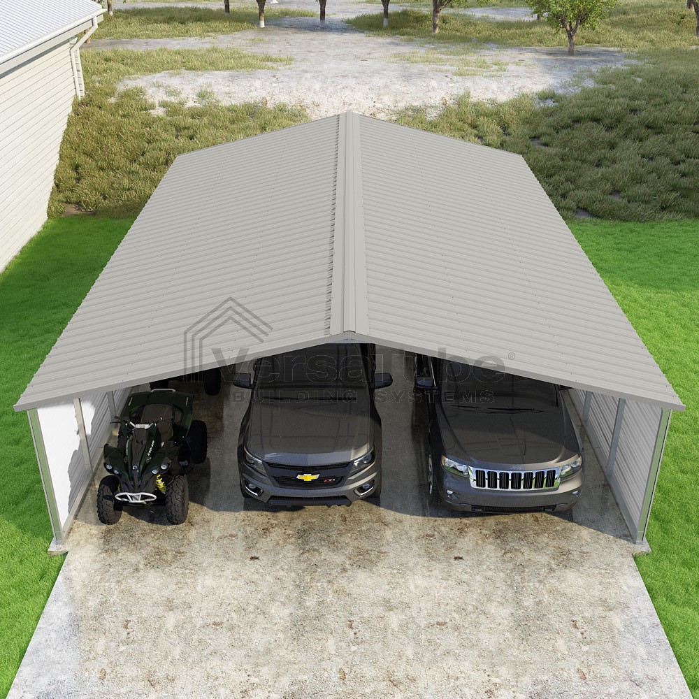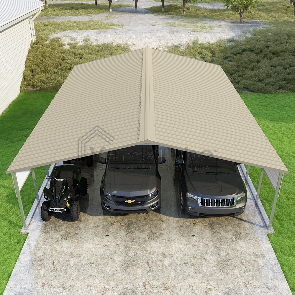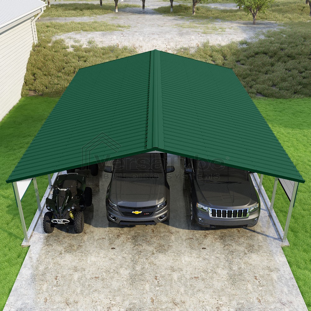 Pinnacle Series DIY carport kit features vertical sheet metal roof panels with ridge cap, gable and eave trim for an A-frame roof style and extended coverage on both ends.