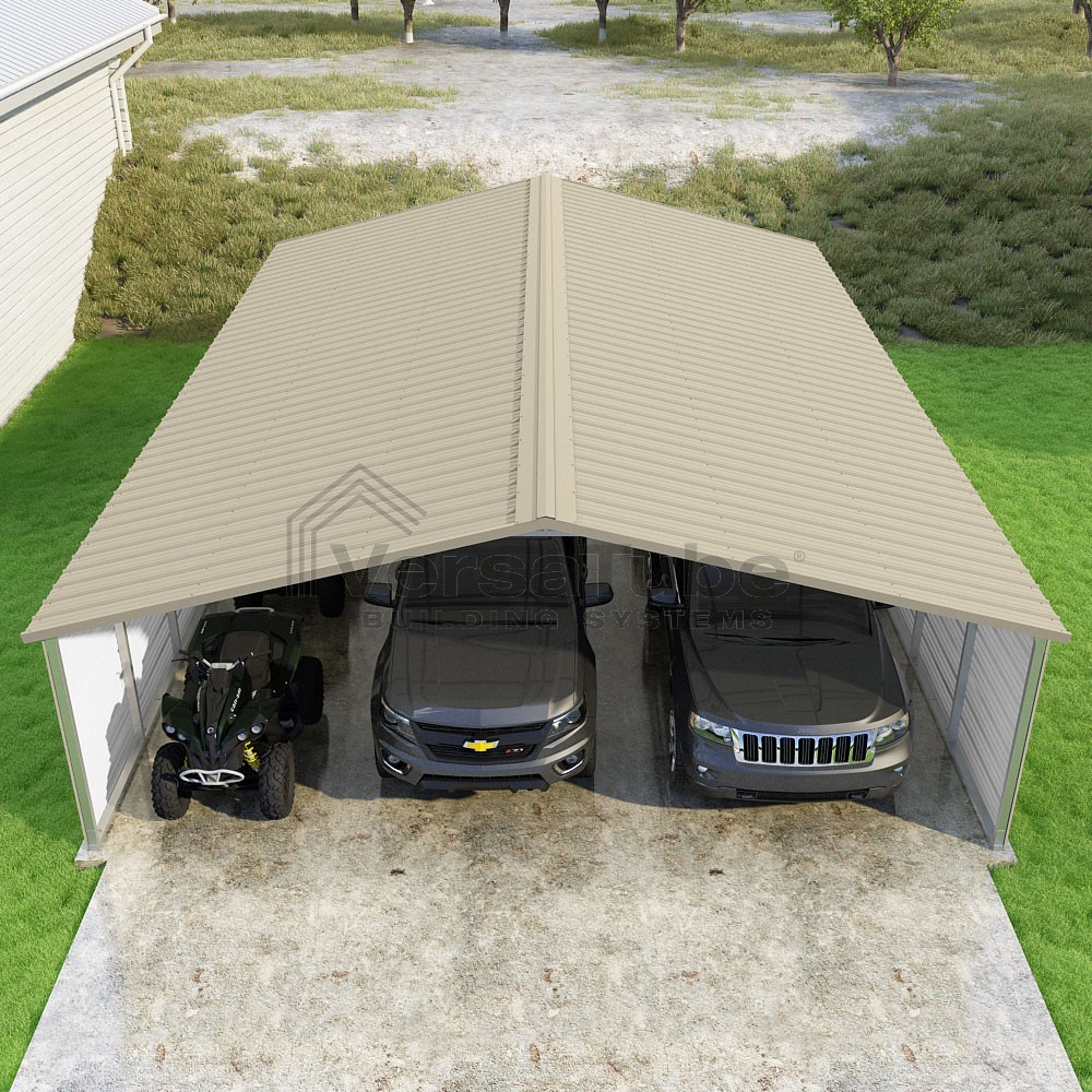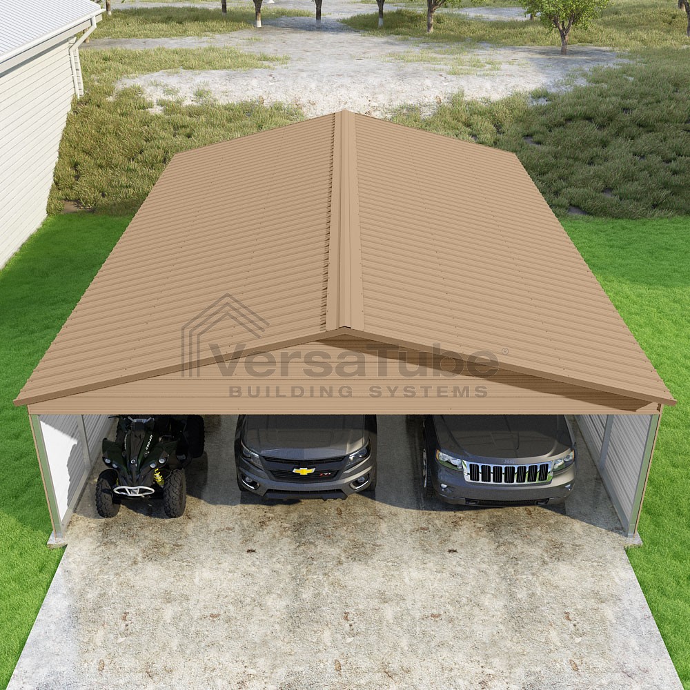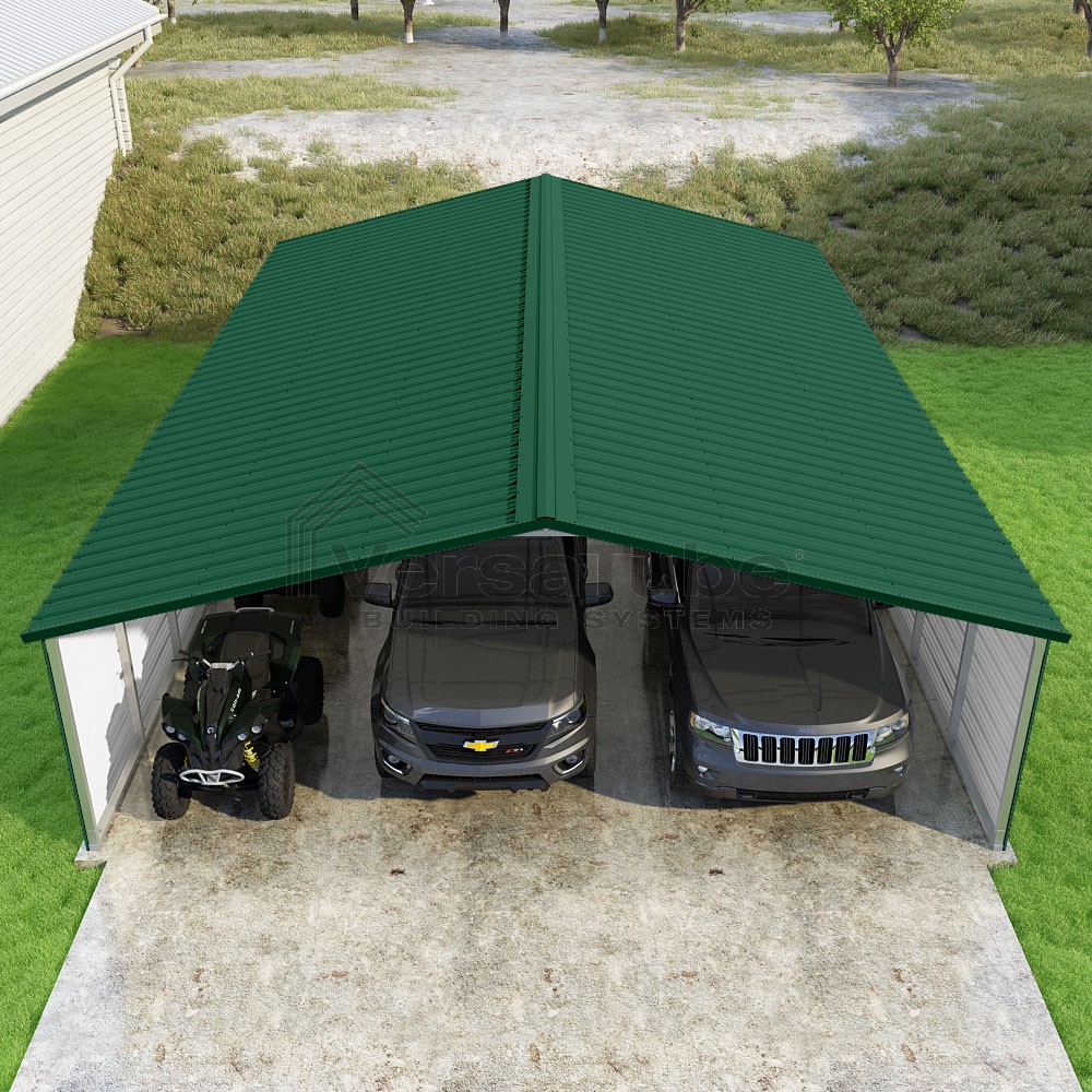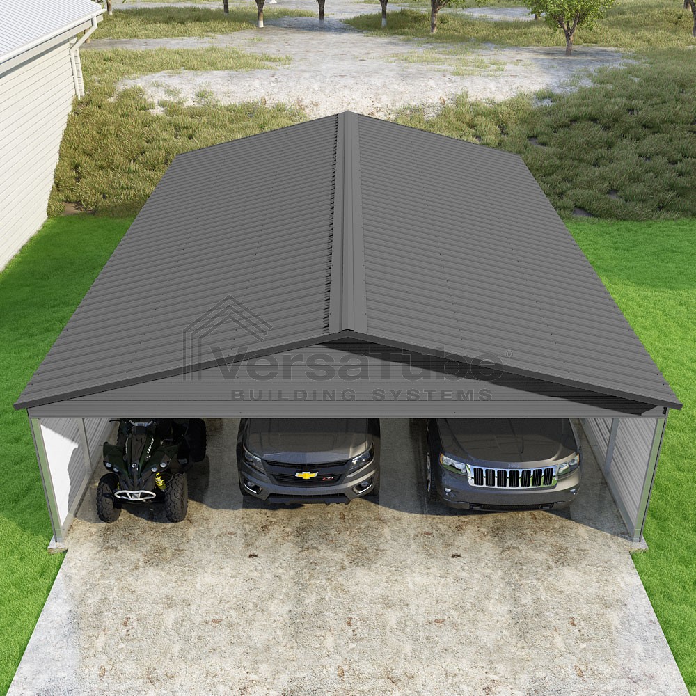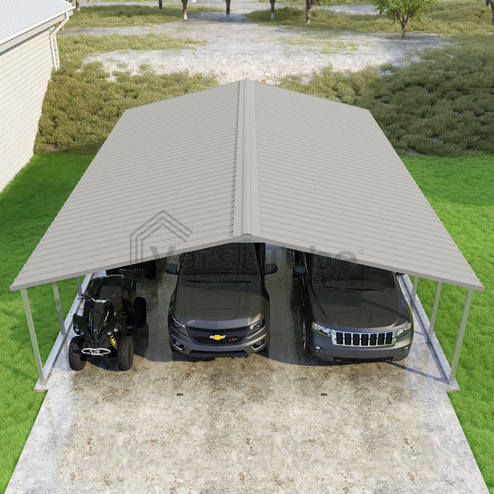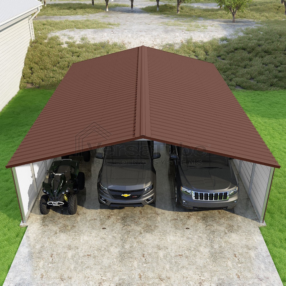 Pinnacle Series DIY carport kit features vertical sheet metal roof panels with ridge cap, gable and eave trim for an A-frame roof style and extended coverage on both ends.