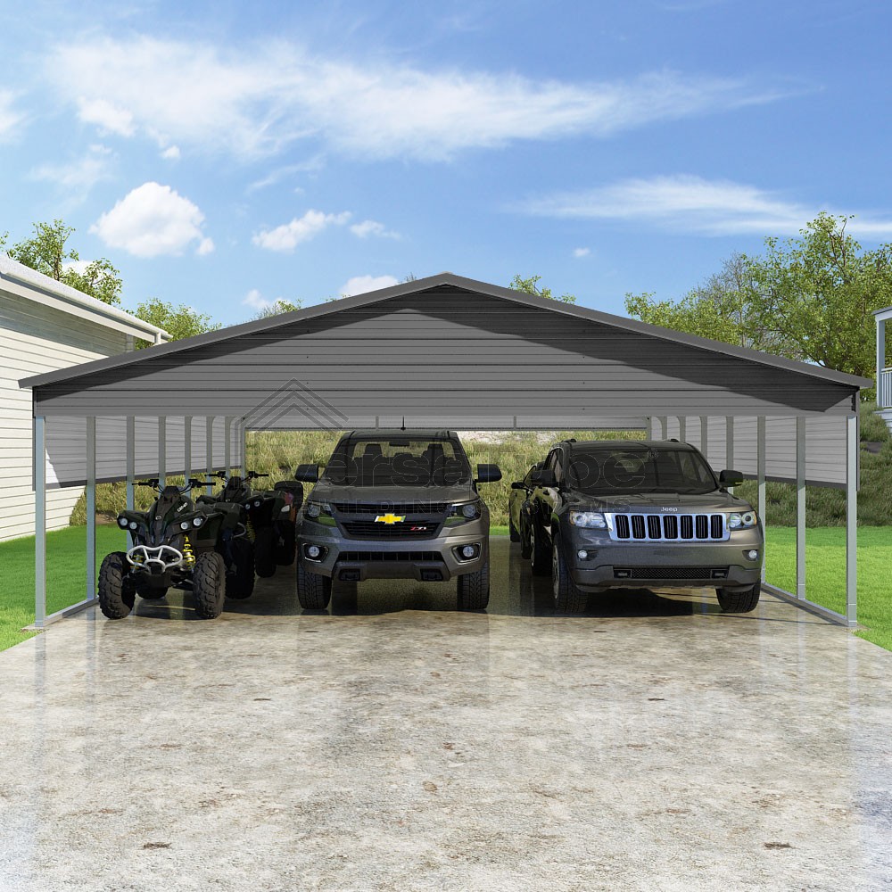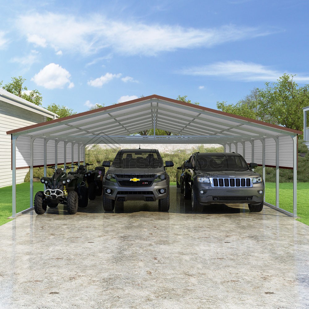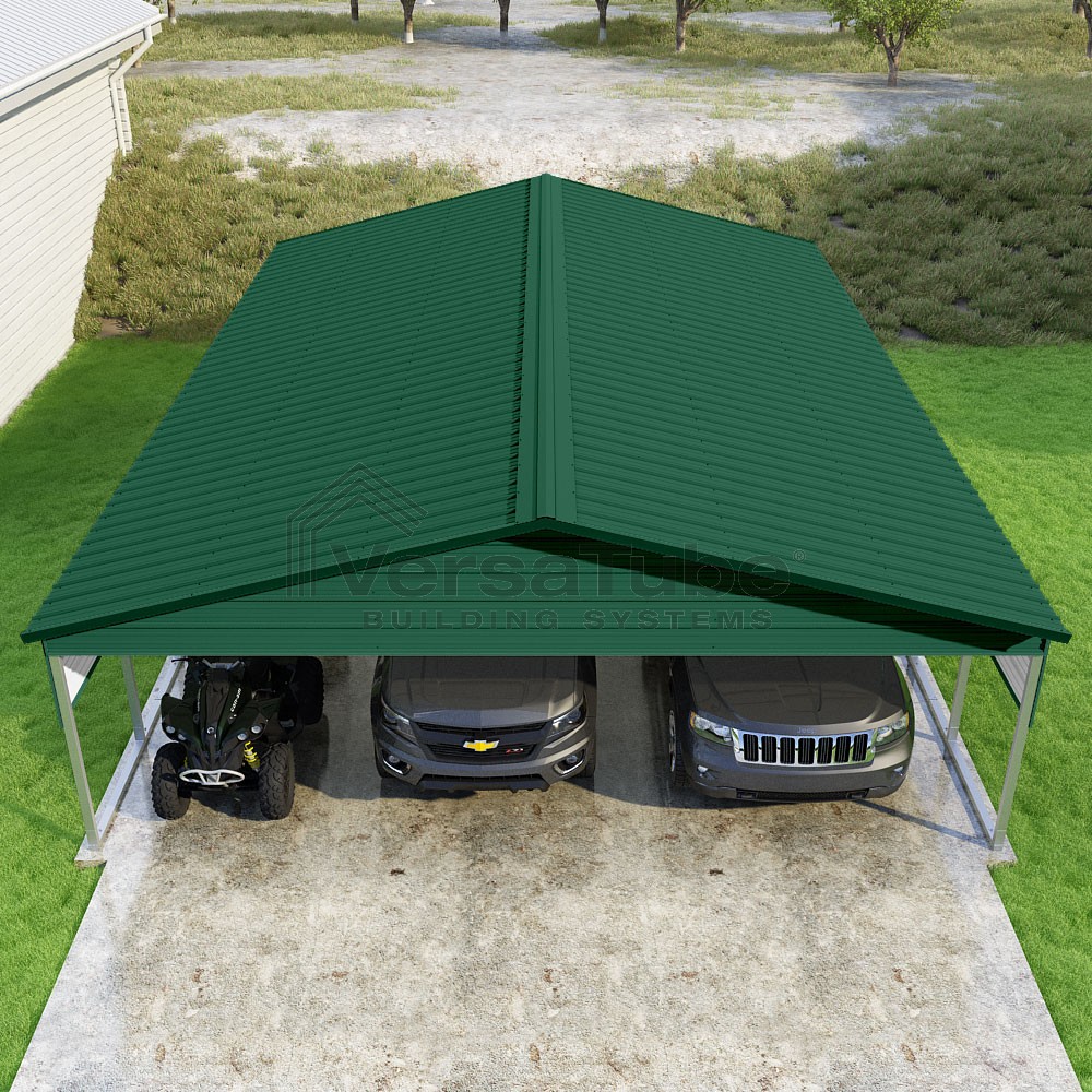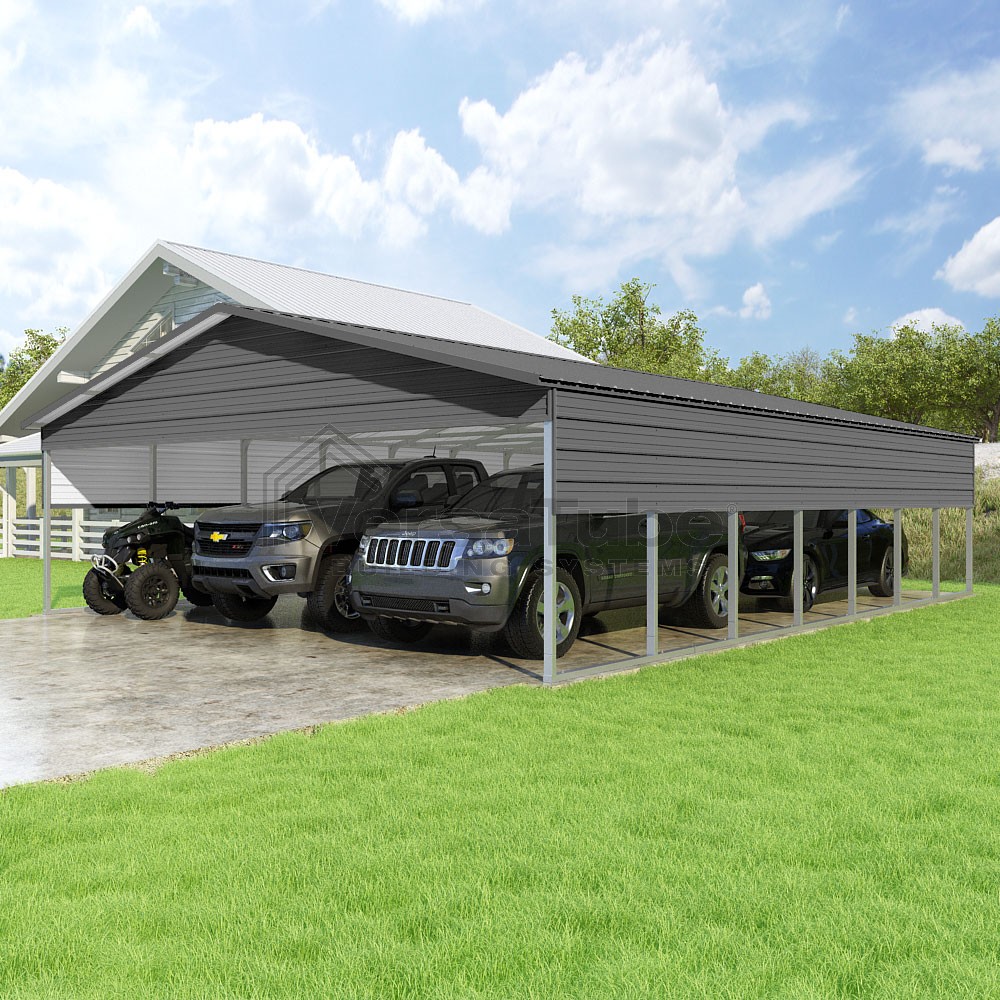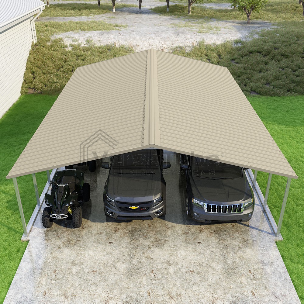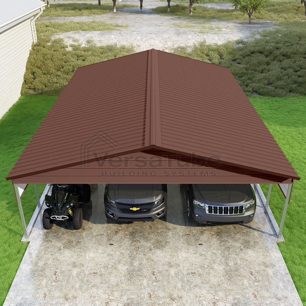 Pinnacle Series DIY carport kit features vertical sheet metal roof panels with ridge cap, gable and eave trim for an A-frame roof style and extended coverage on both ends.