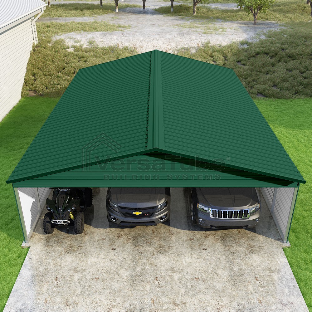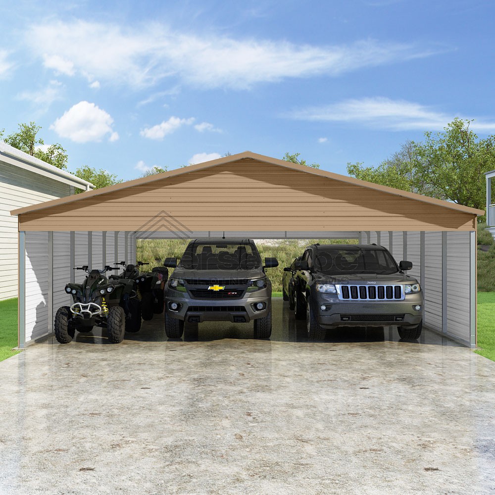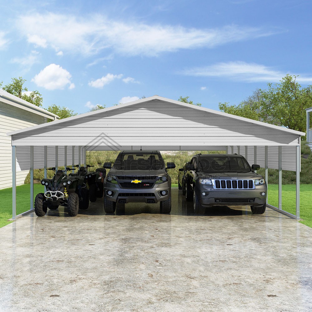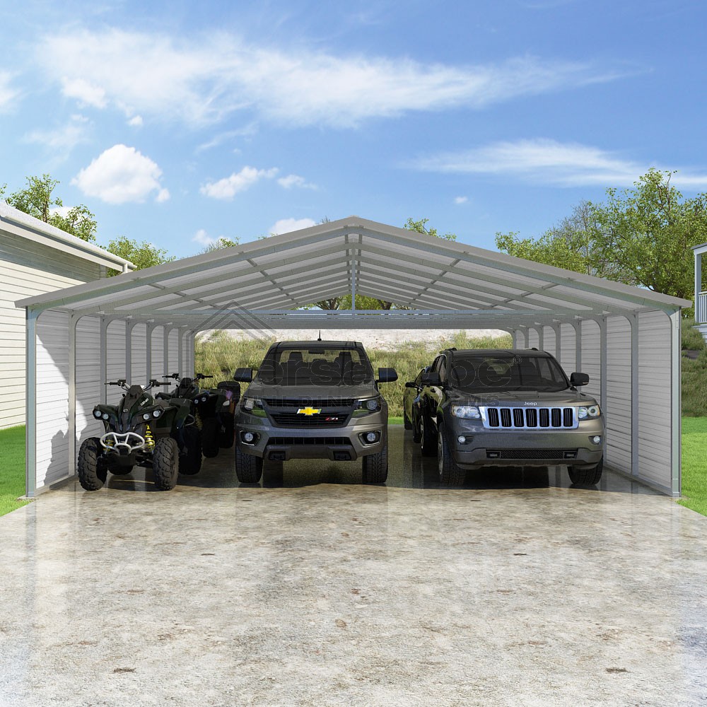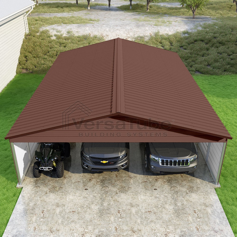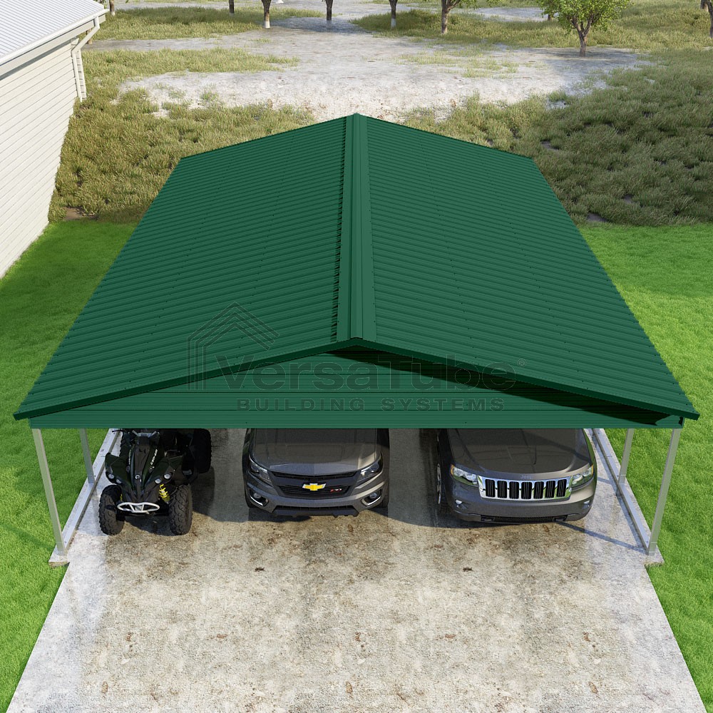 Pinnacle Series DIY carport kit features vertical sheet metal roof panels with ridge cap, gable and eave trim for an A-frame roof style and extended coverage on both ends.