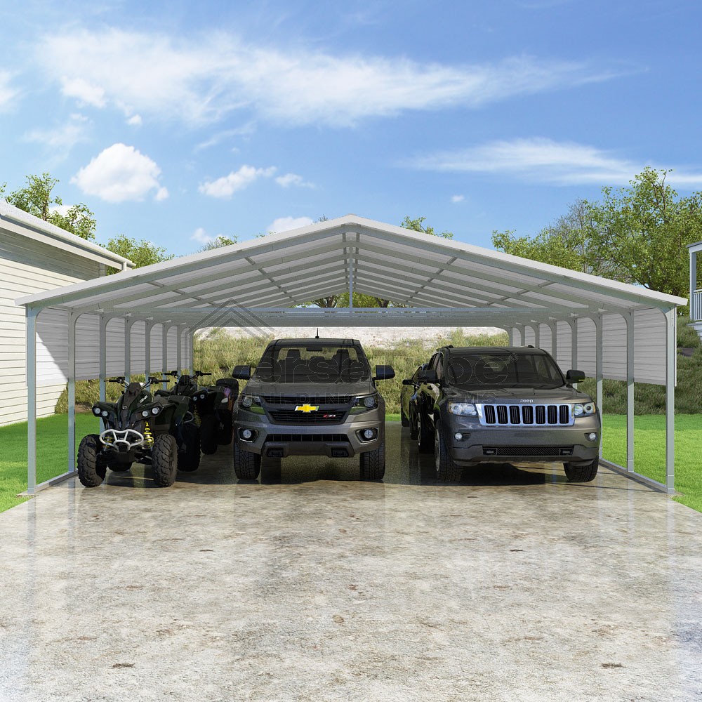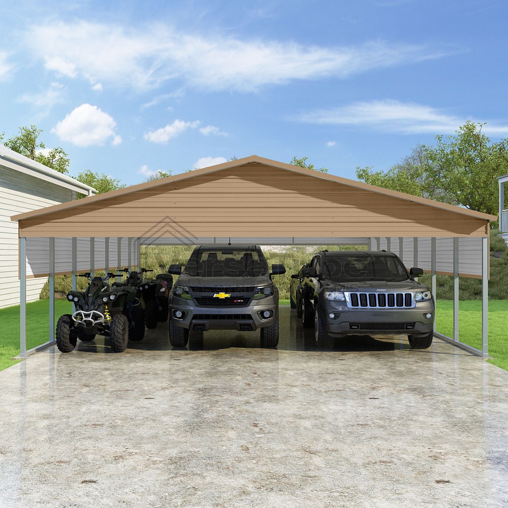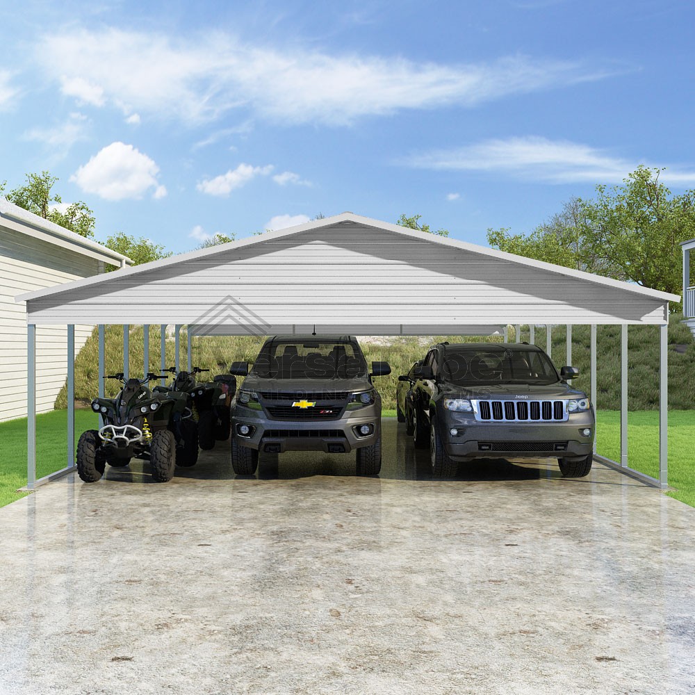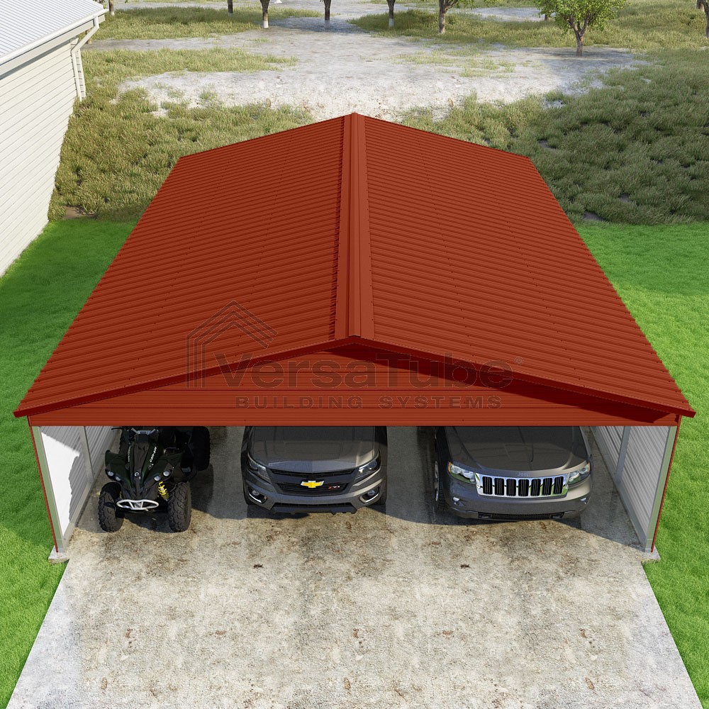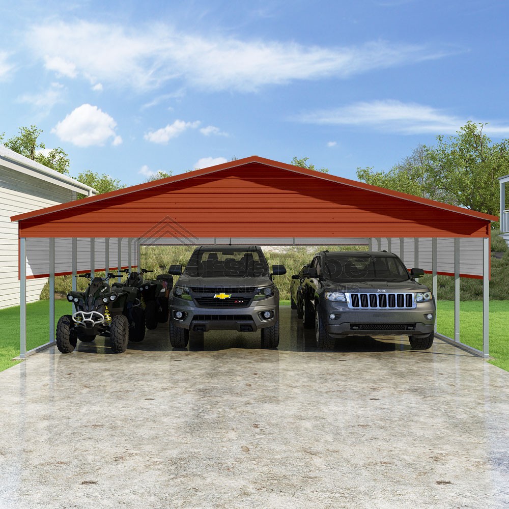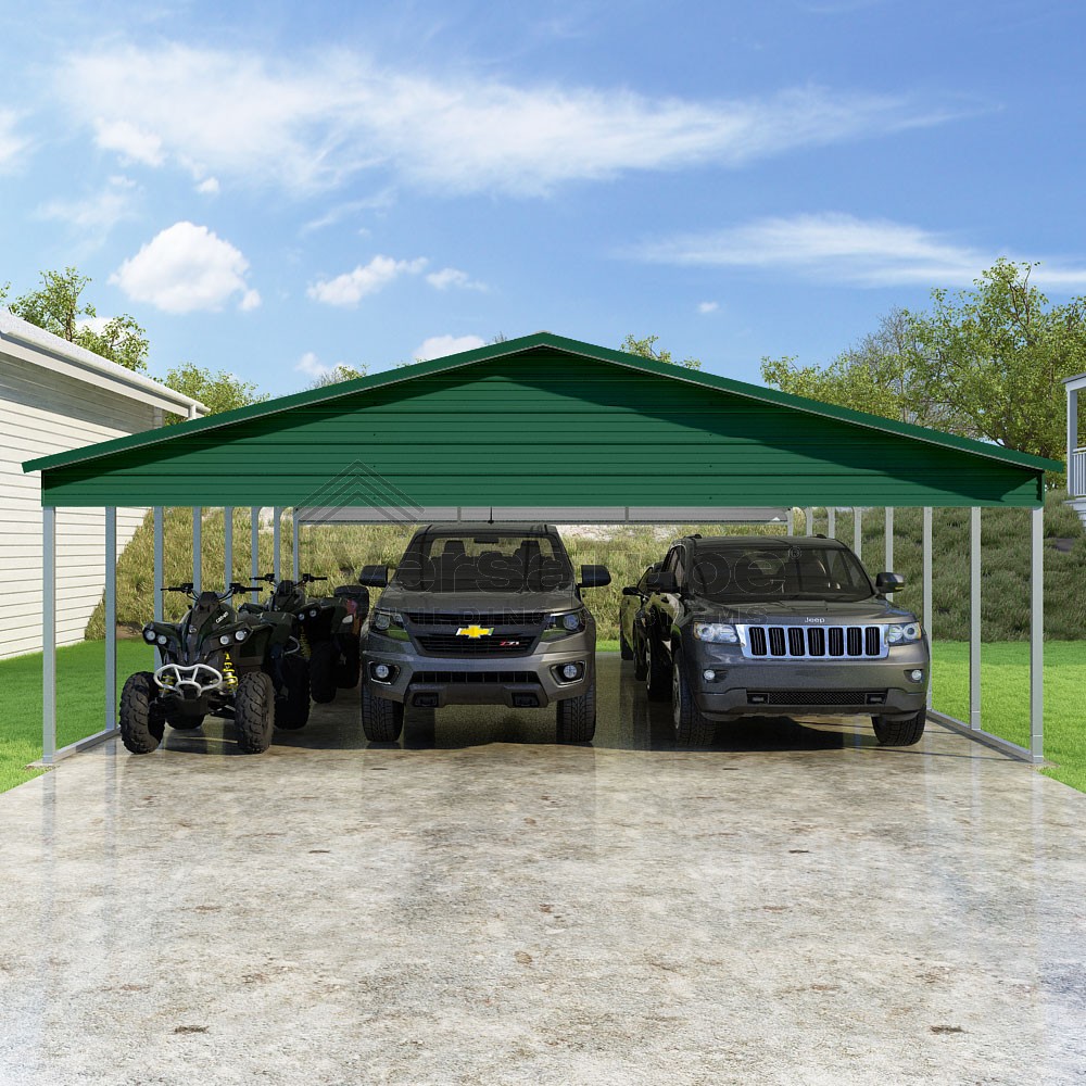 Pinnacle Series DIY carport kit features vertical sheet metal roof panels with ridge cap, gable and eave trim for an A-frame roof style and extended coverage on both ends.