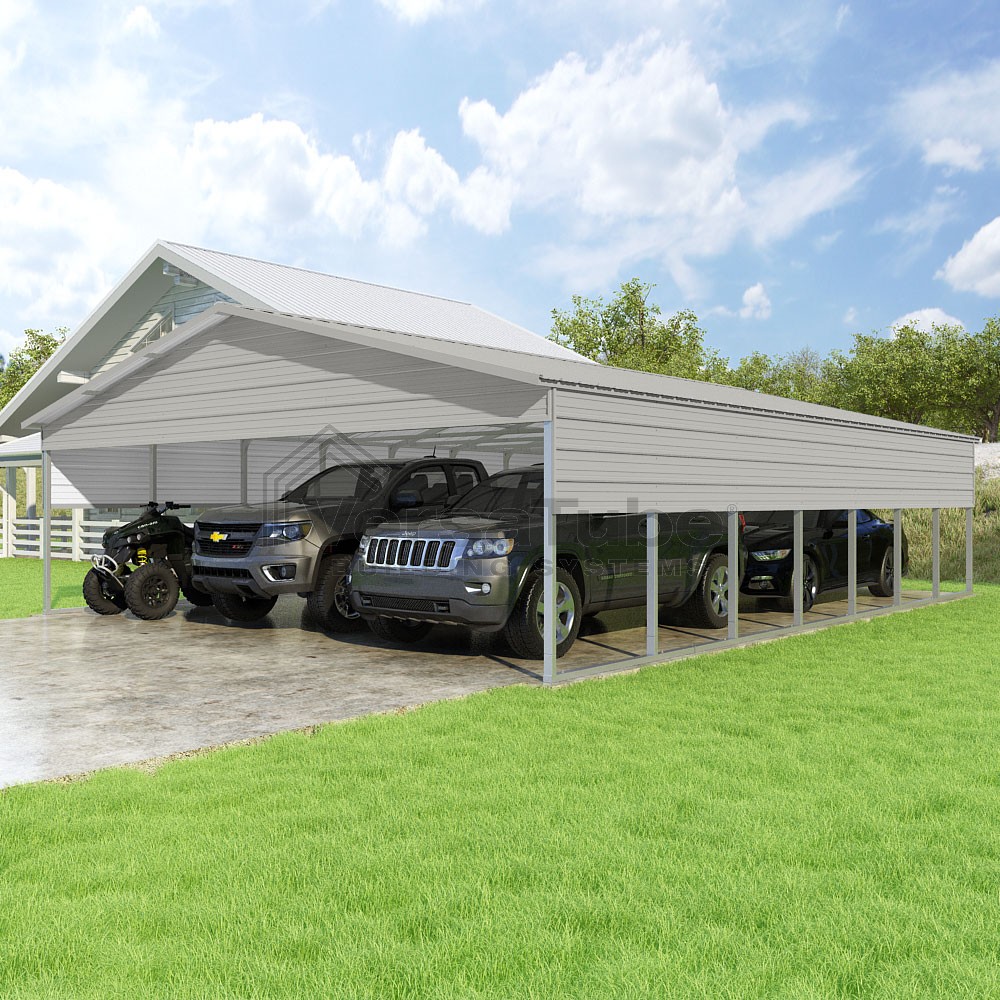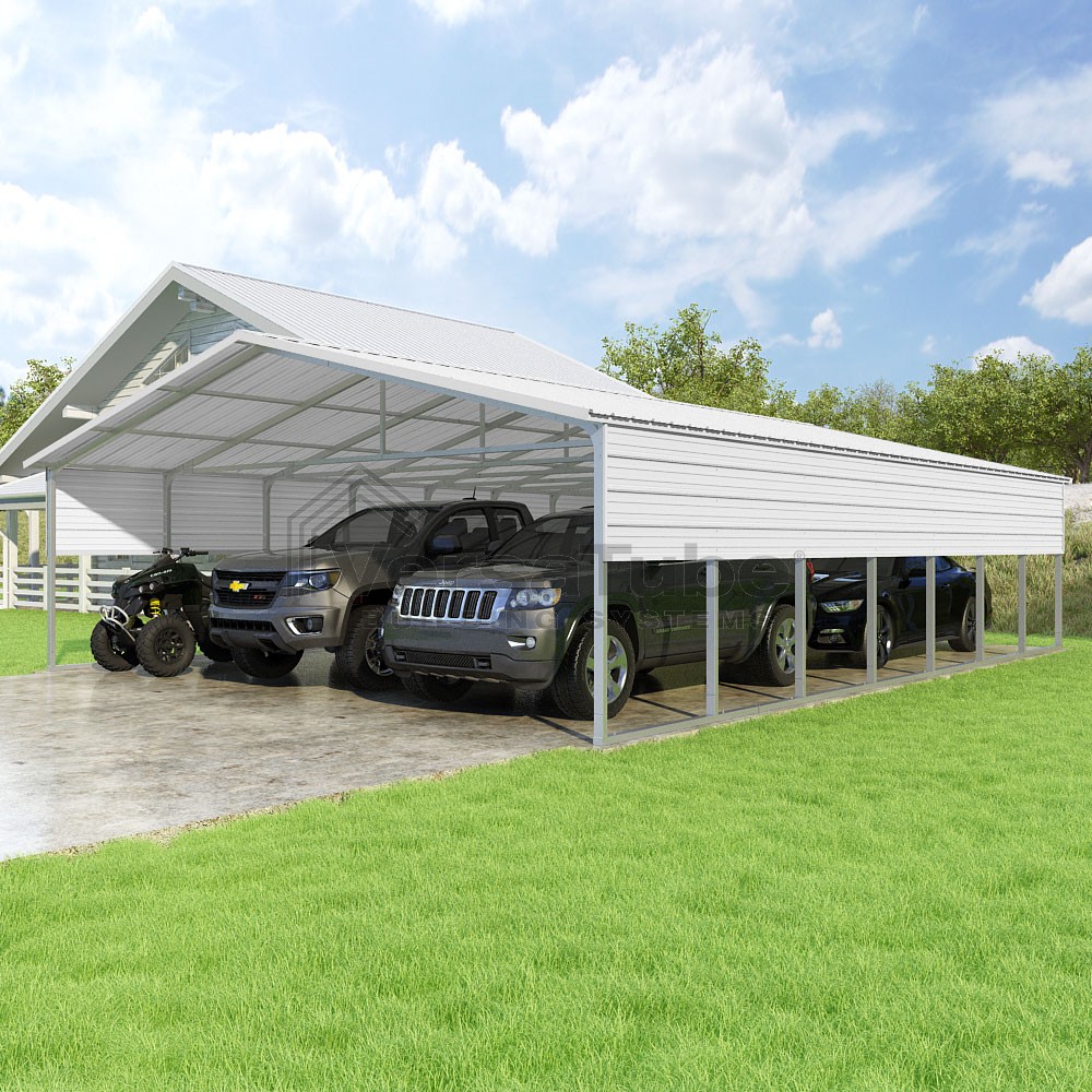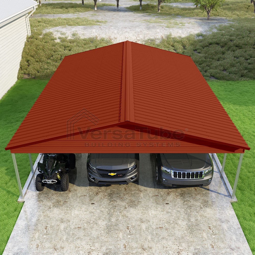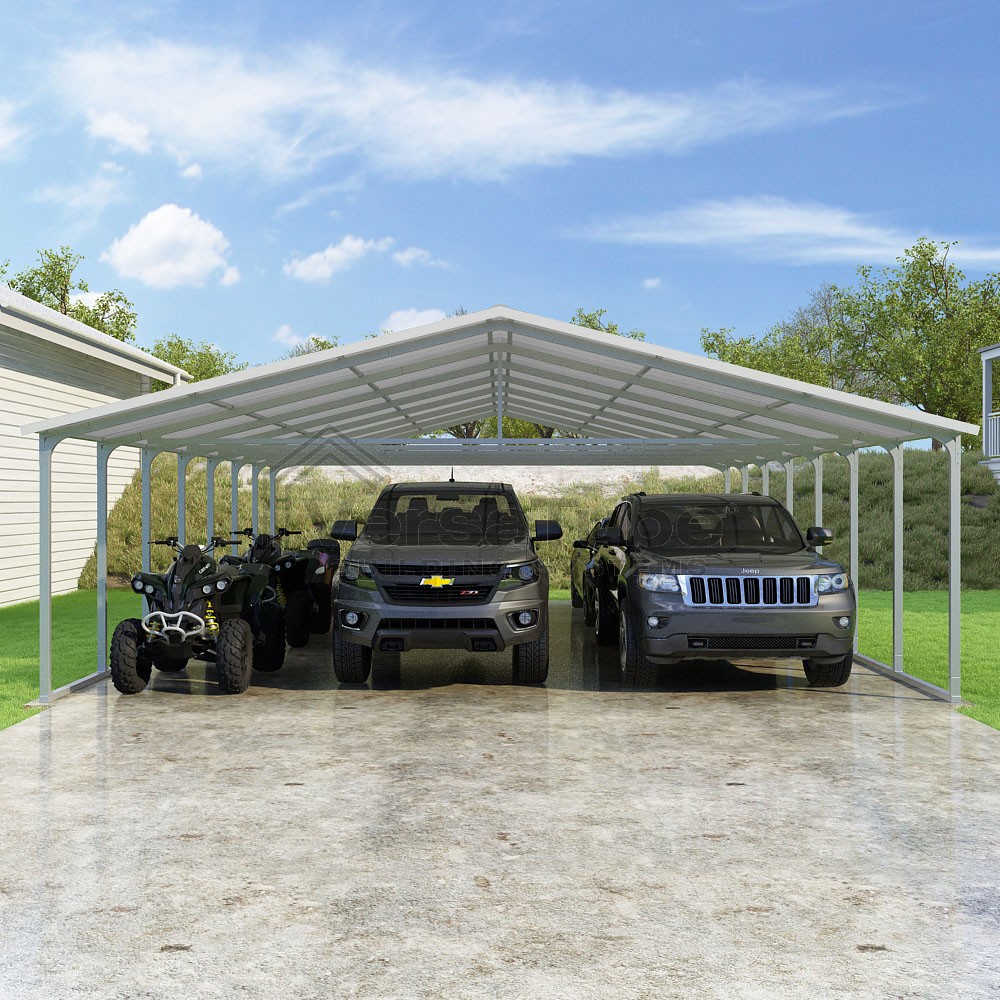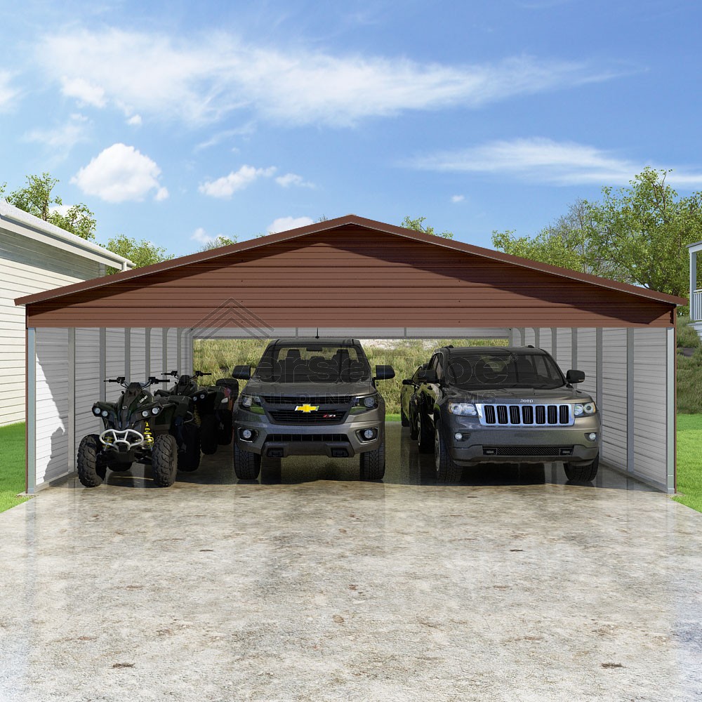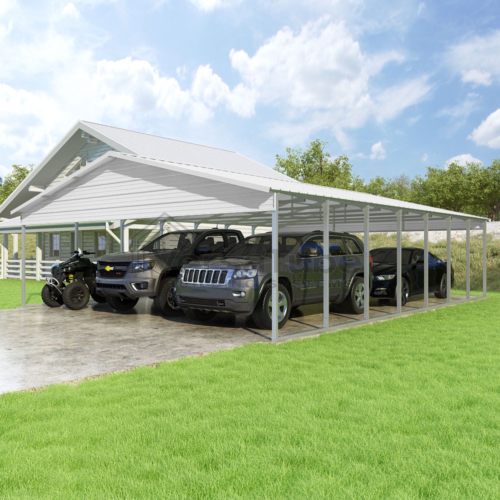 Pinnacle Series DIY carport kit features vertical sheet metal roof panels with ridge cap, gable and eave trim for an A-frame roof style and extended coverage on both ends.
