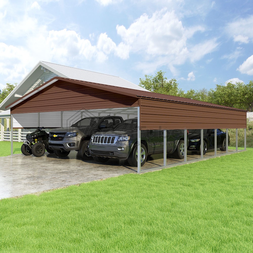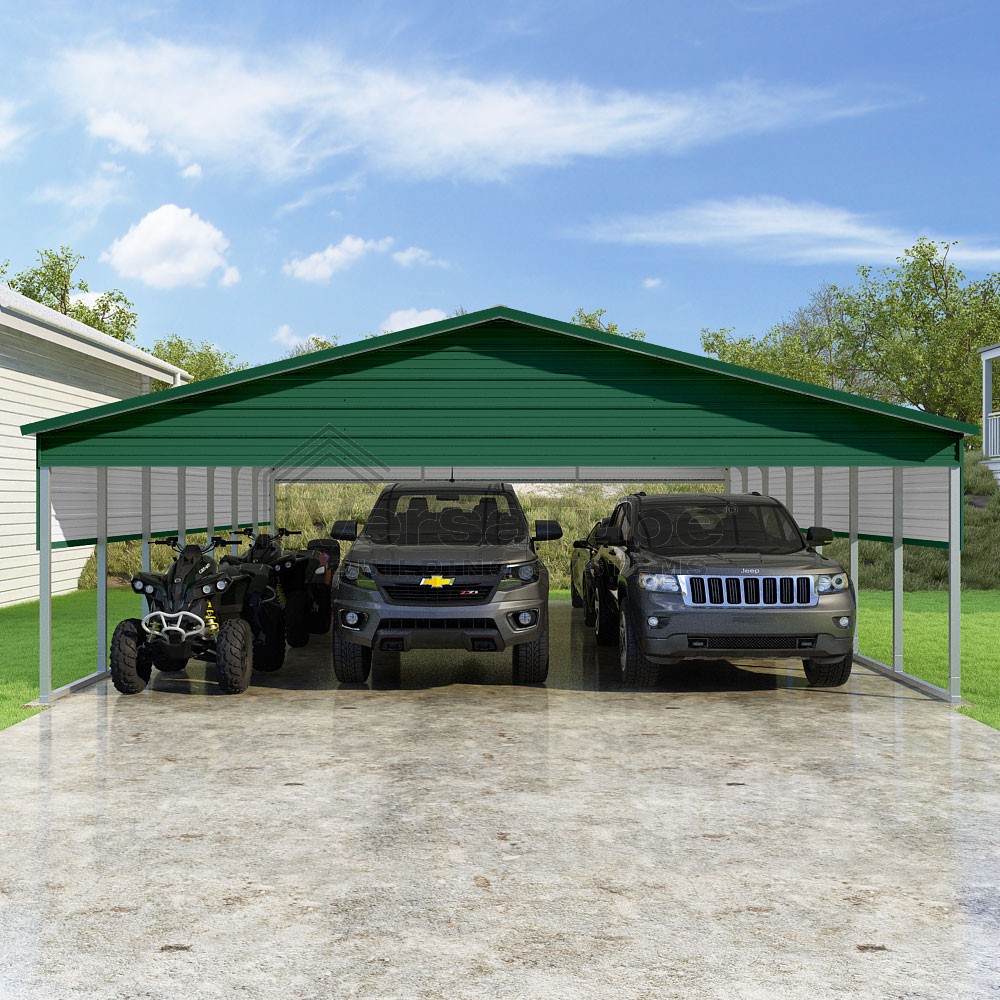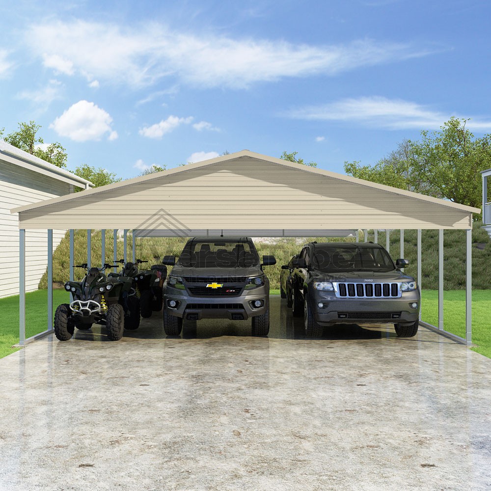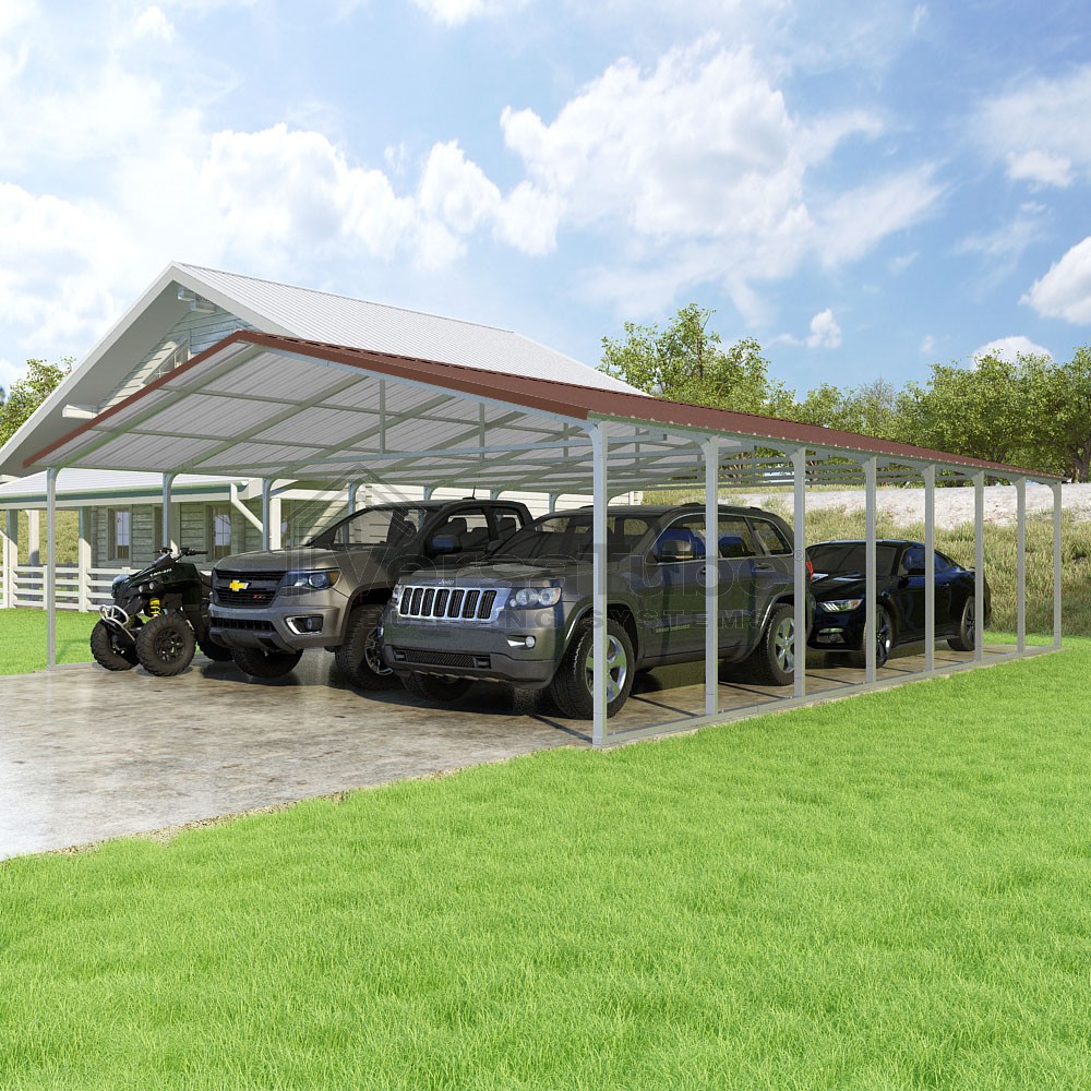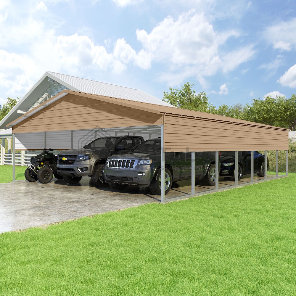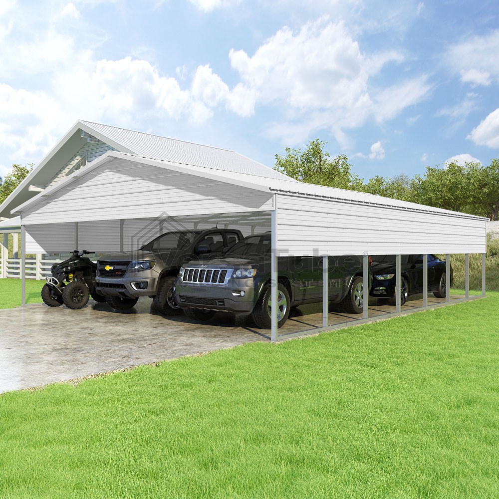 Pinnacle Series DIY carport kit features vertical sheet metal roof panels with ridge cap, gable and eave trim for an A-frame roof style and extended coverage on both ends.