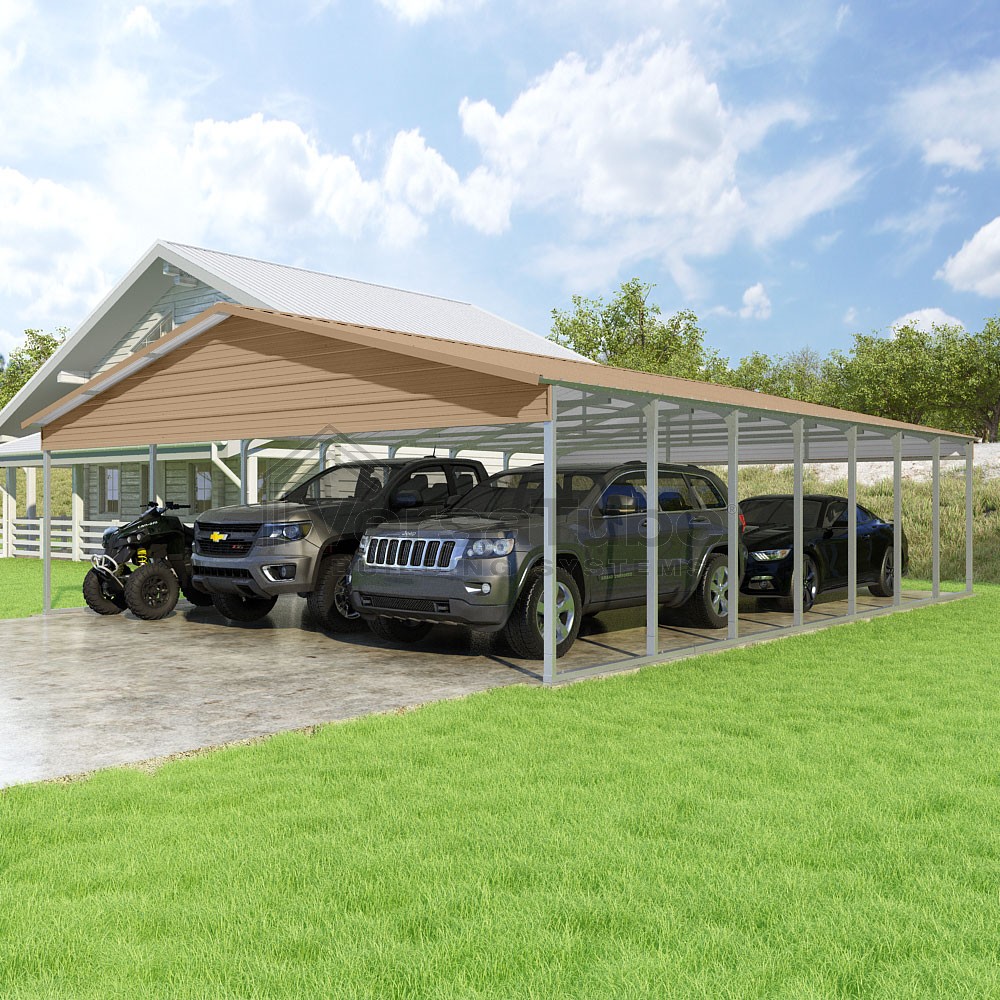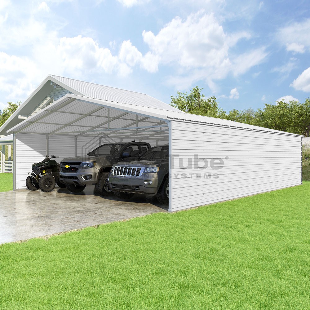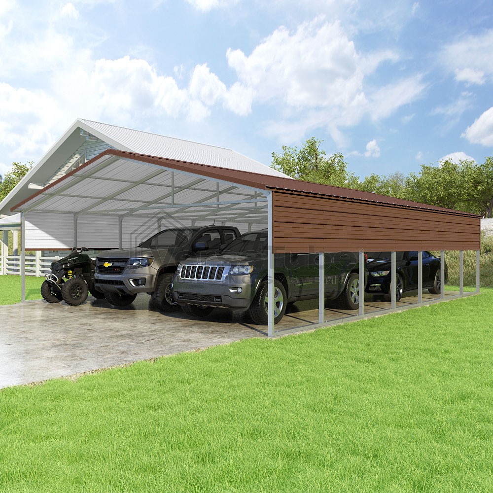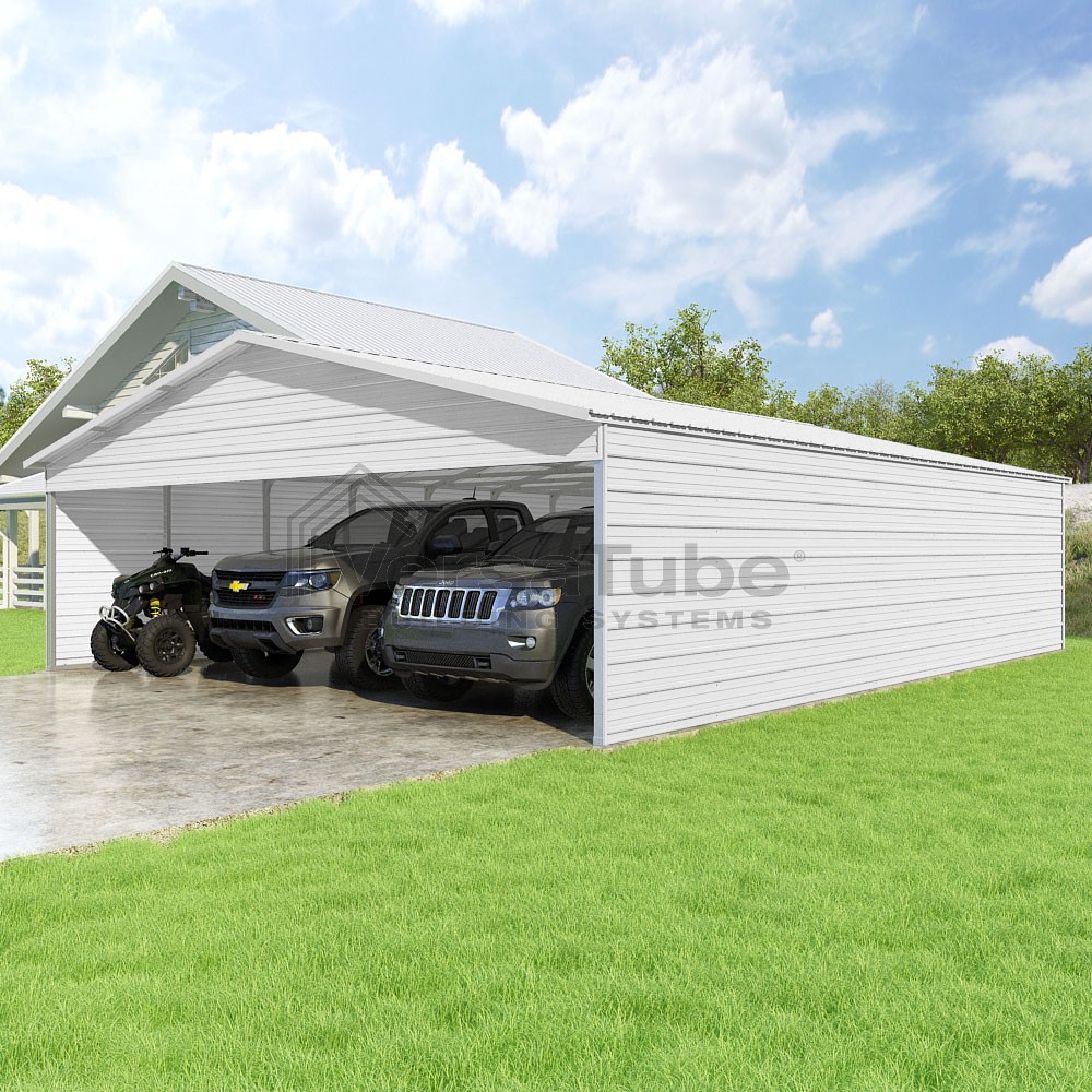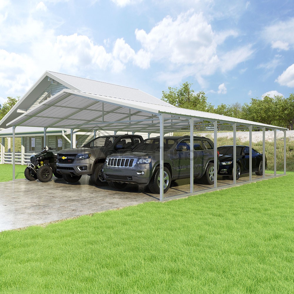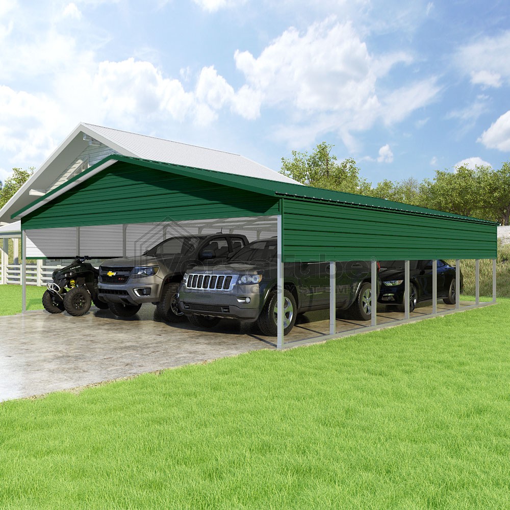 Pinnacle Series DIY carport kit features vertical sheet metal roof panels with ridge cap, gable and eave trim for an A-frame roof style and extended coverage on both ends.