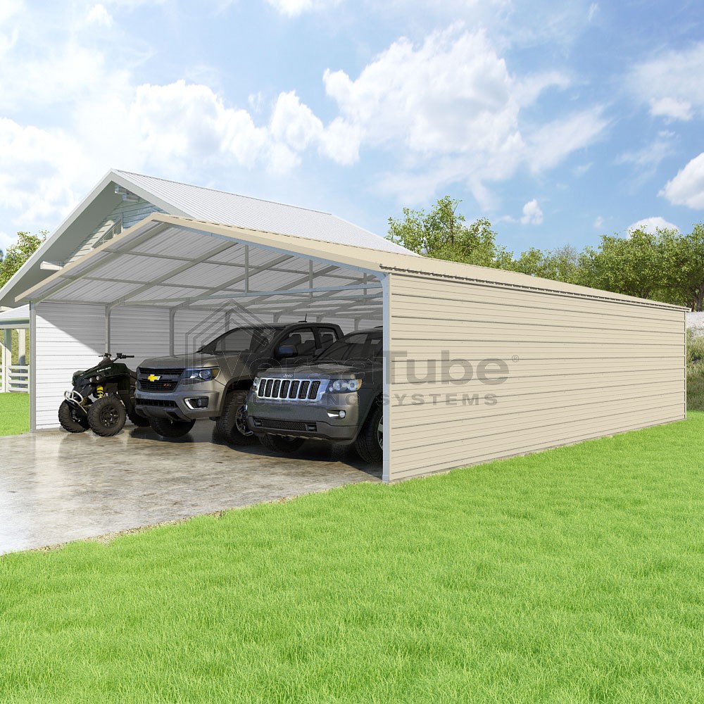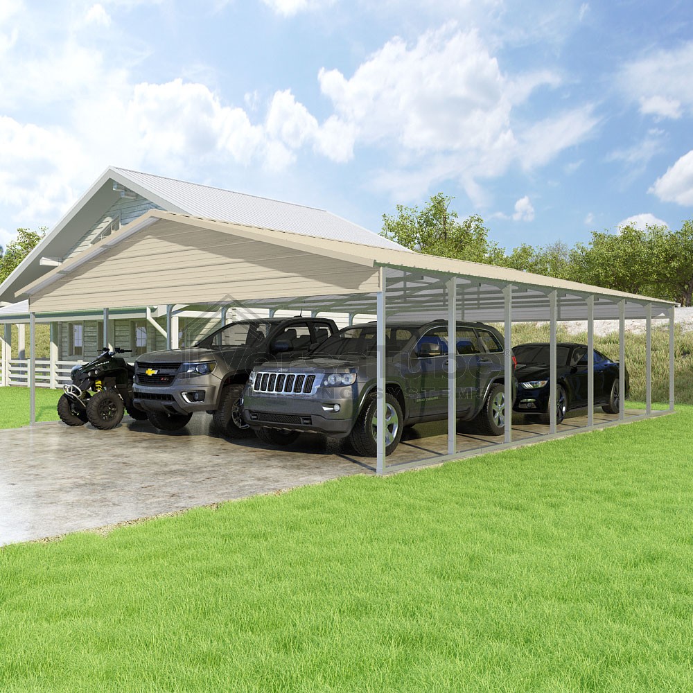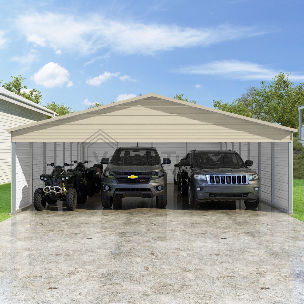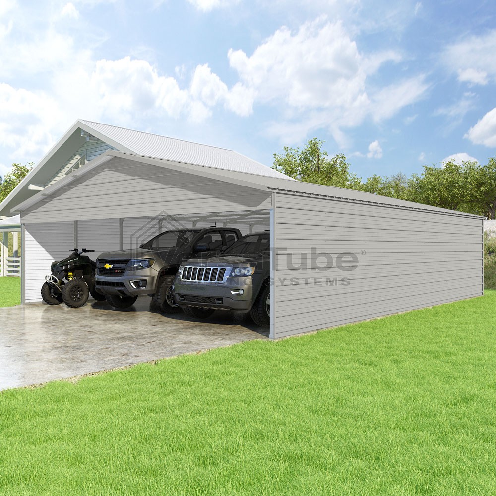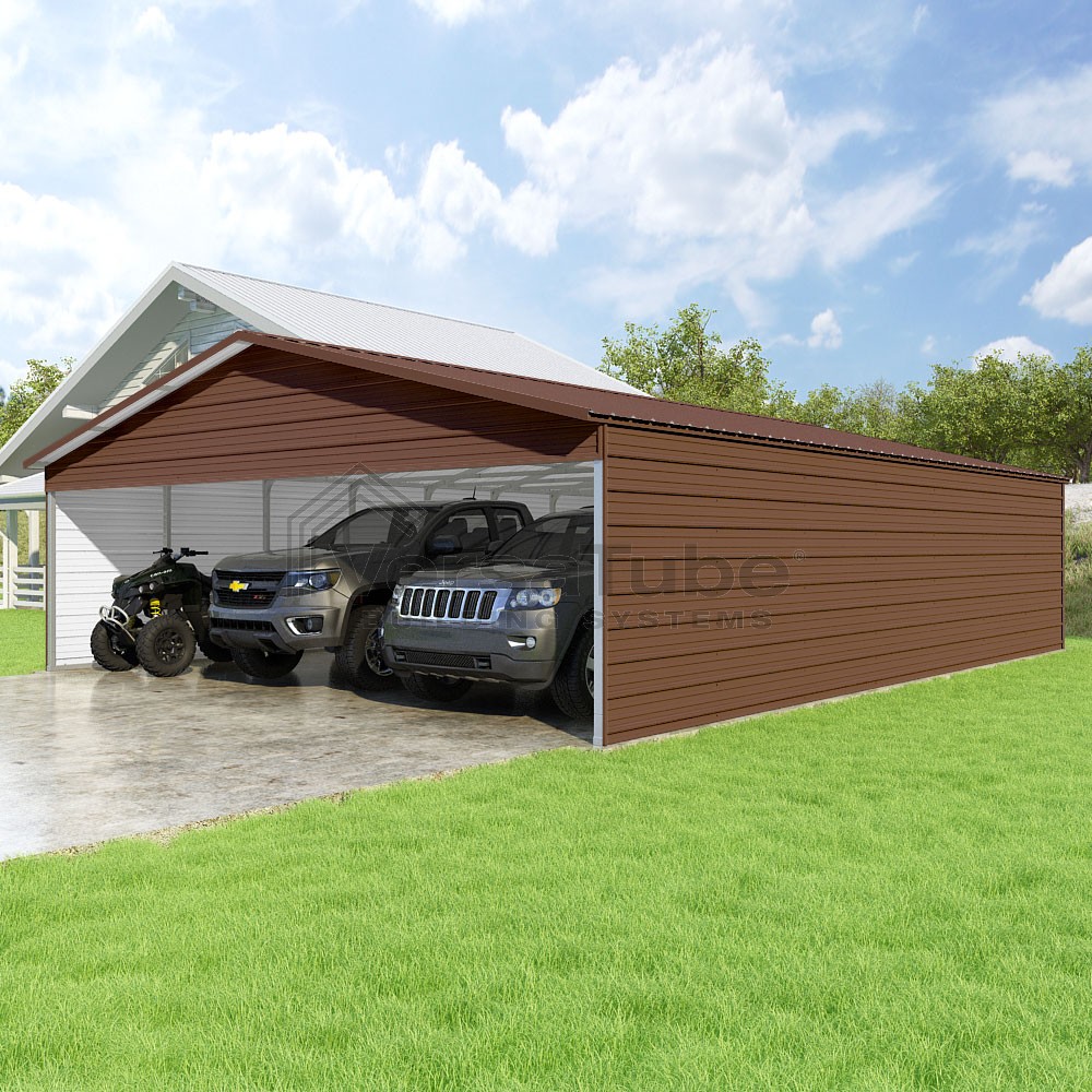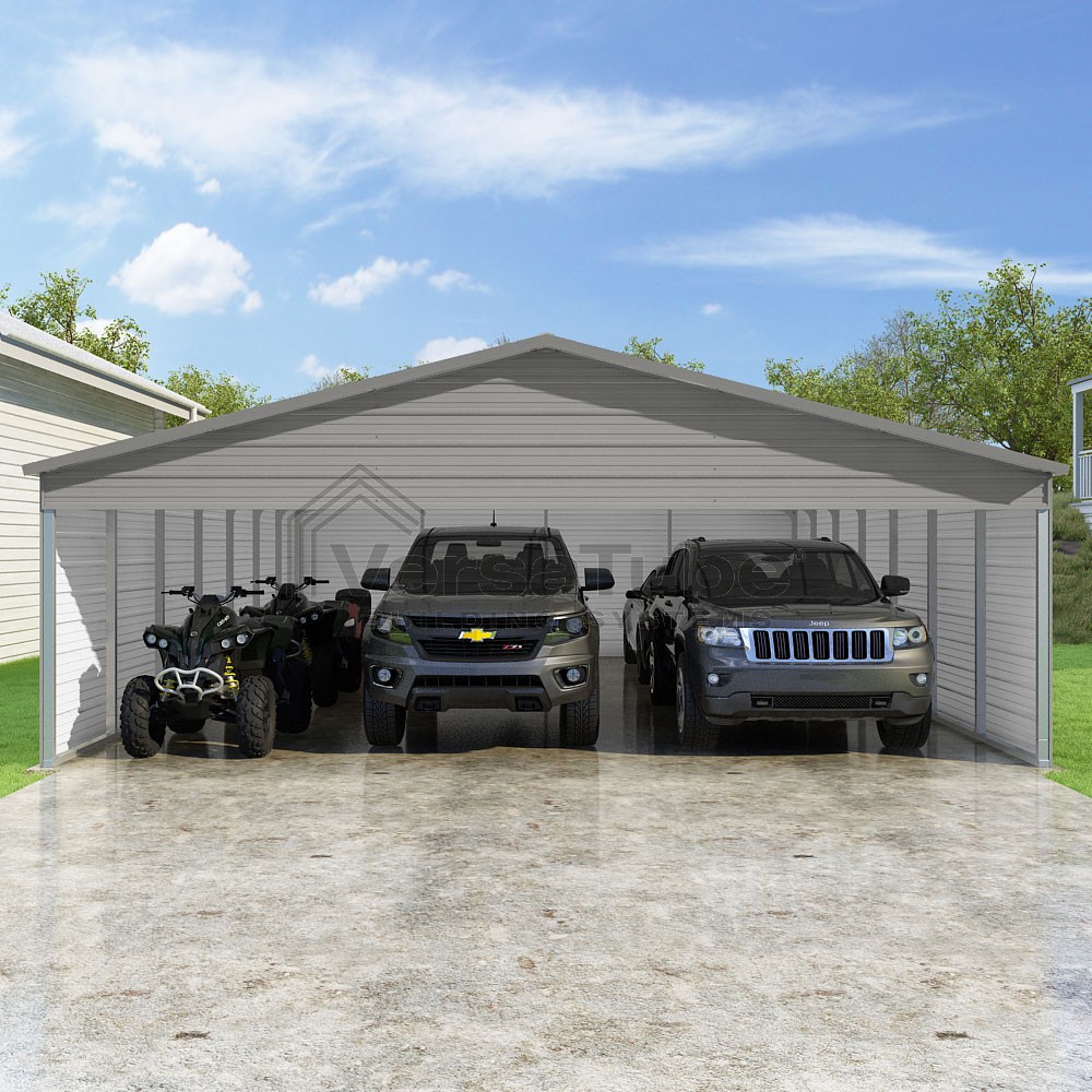 Pinnacle Series DIY carport kit features vertical sheet metal roof panels with ridge cap, gable and eave trim for an A-frame roof style and extended coverage on both ends.