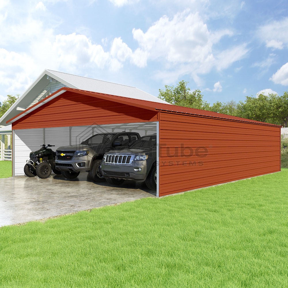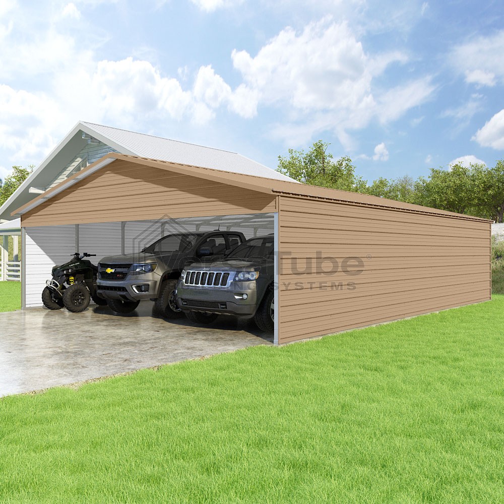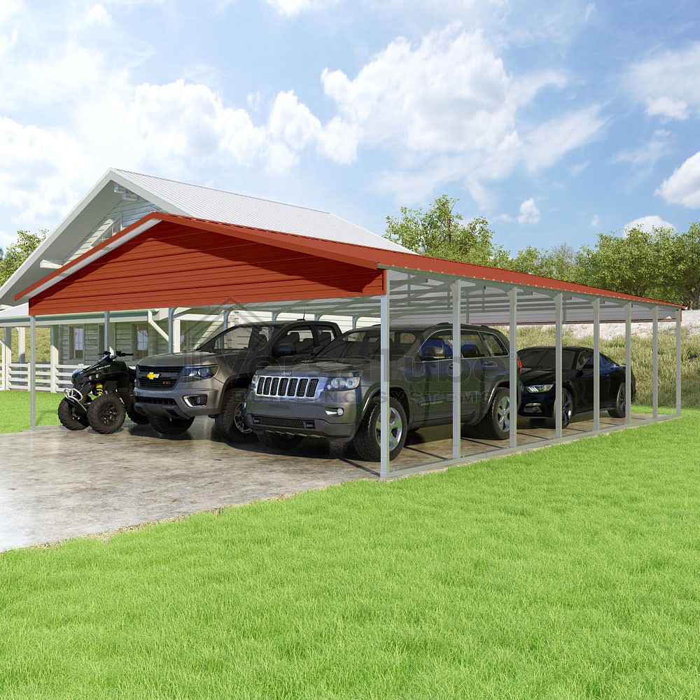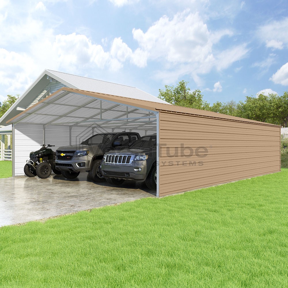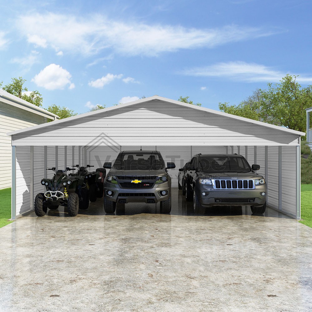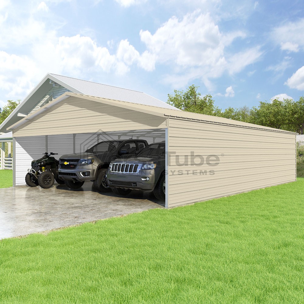 Pinnacle Series DIY carport kit features vertical sheet metal roof panels with ridge cap, gable and eave trim for an A-frame roof style and extended coverage on both ends.