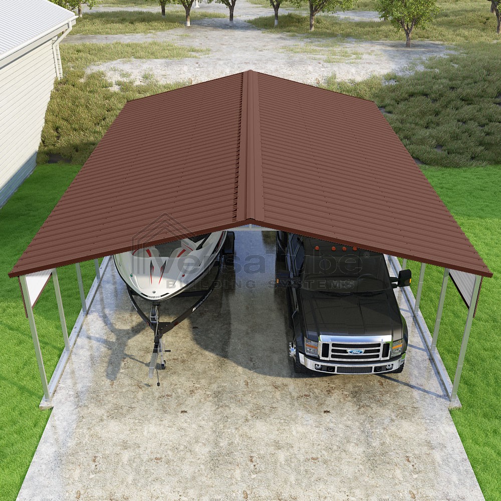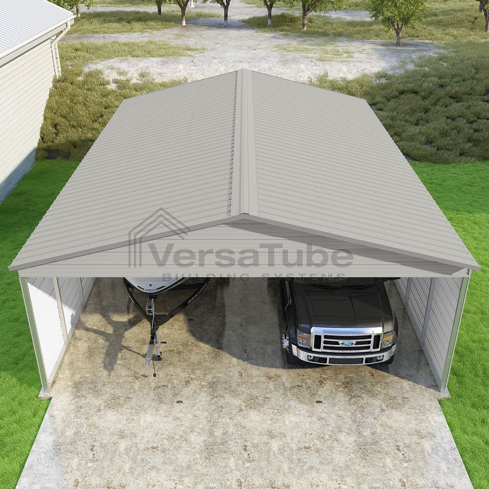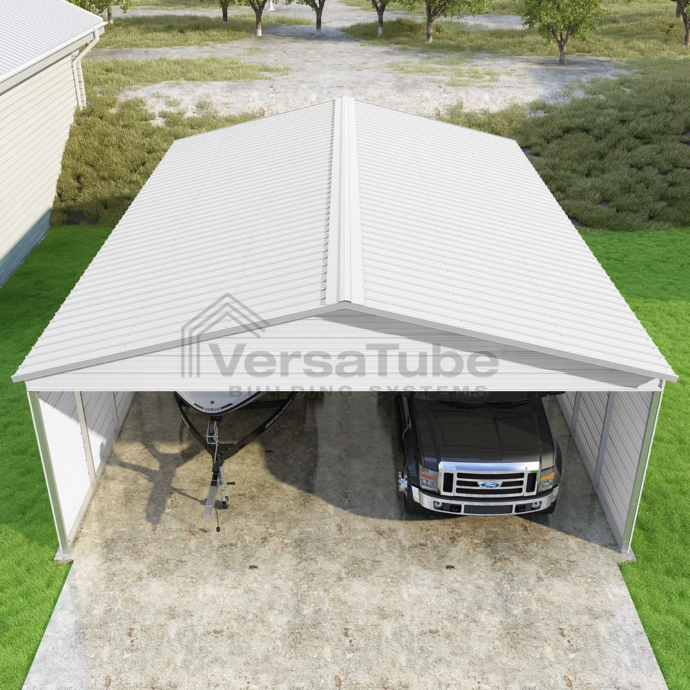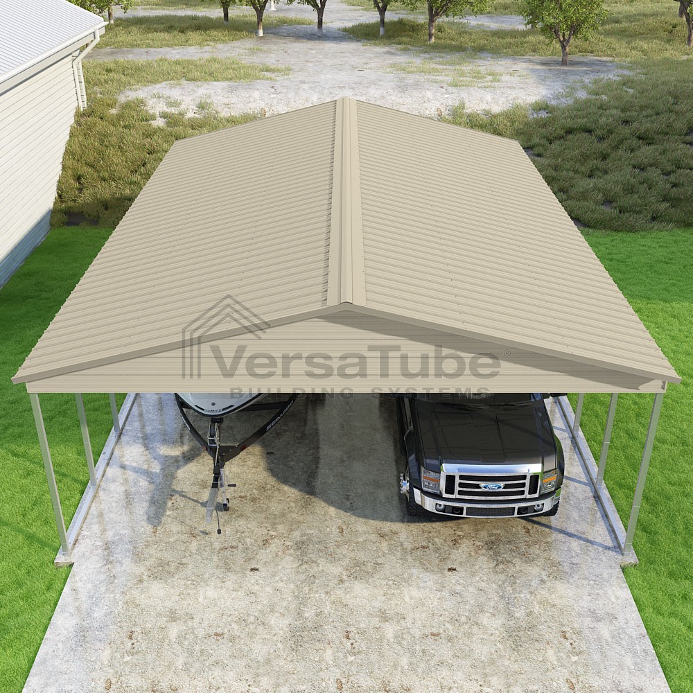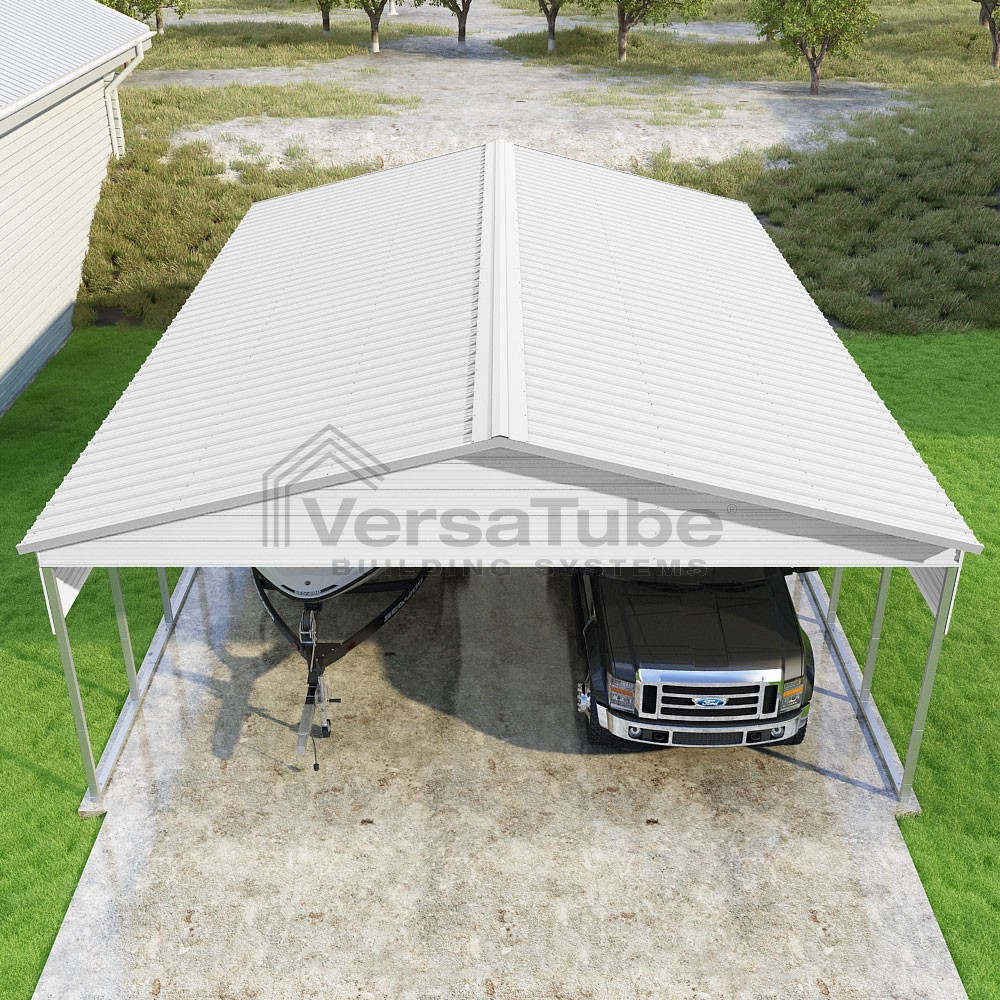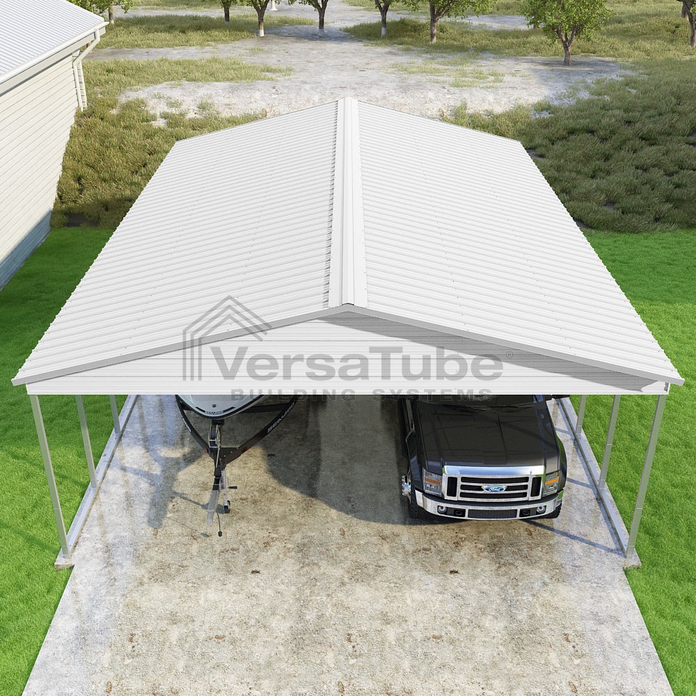 Pinnacle Series DIY carport kit features vertical sheet metal roof panels with ridge cap, gable and eave trim for an A-frame roof style and extended coverage on both ends.
