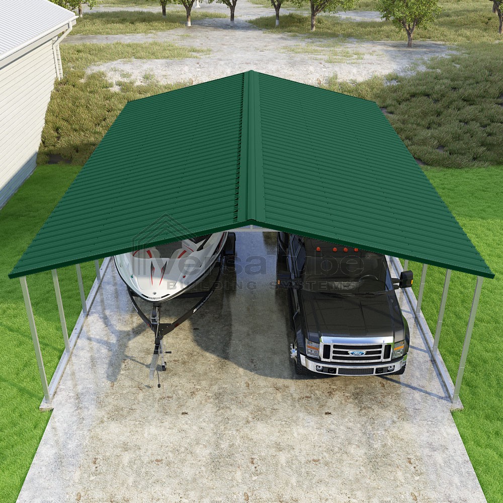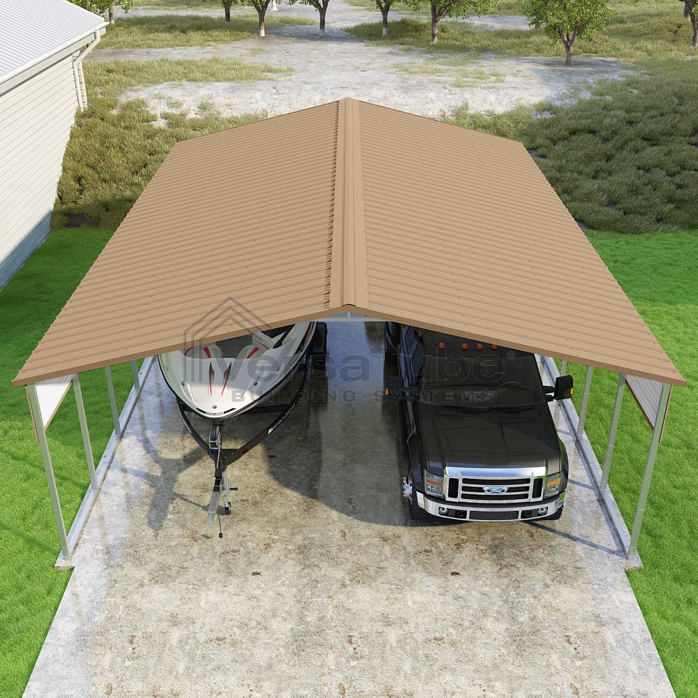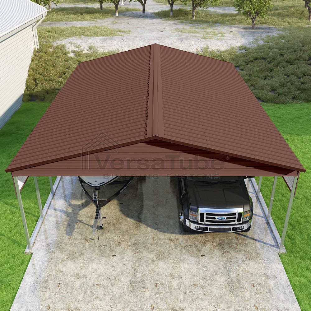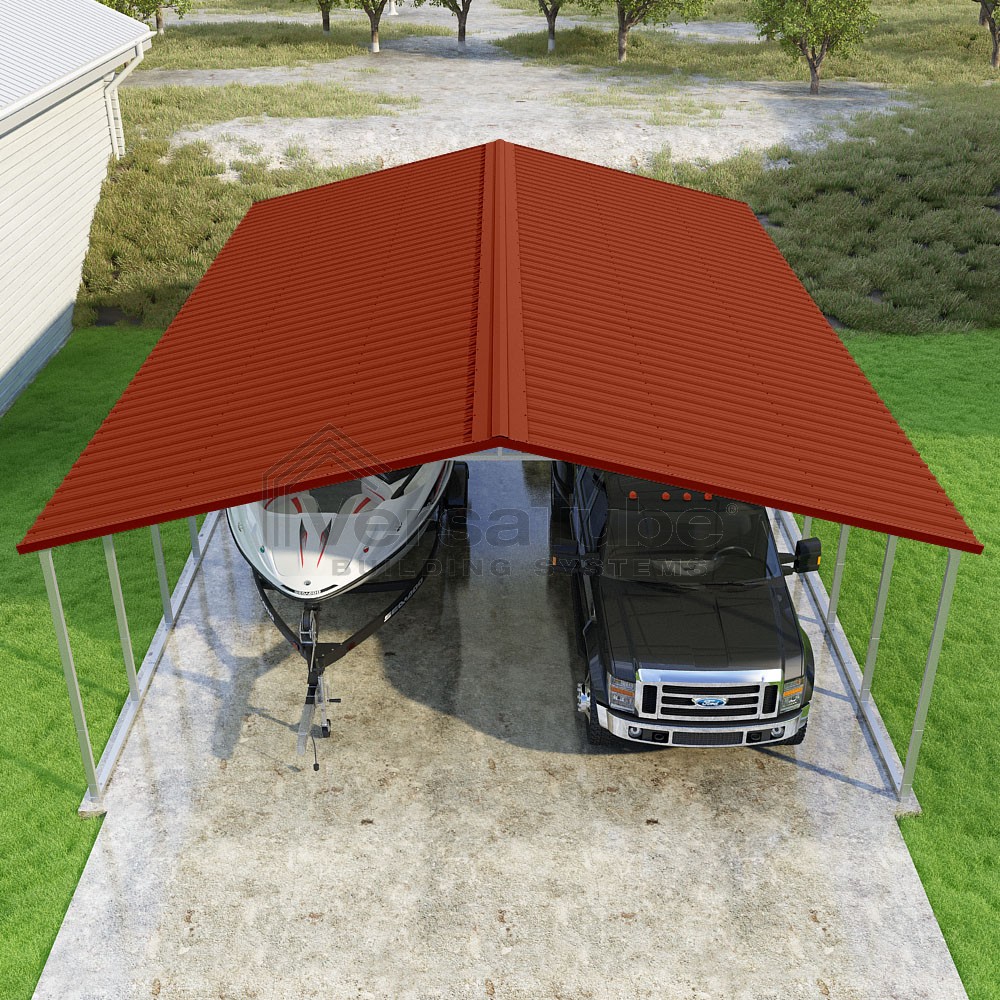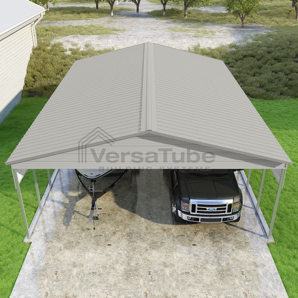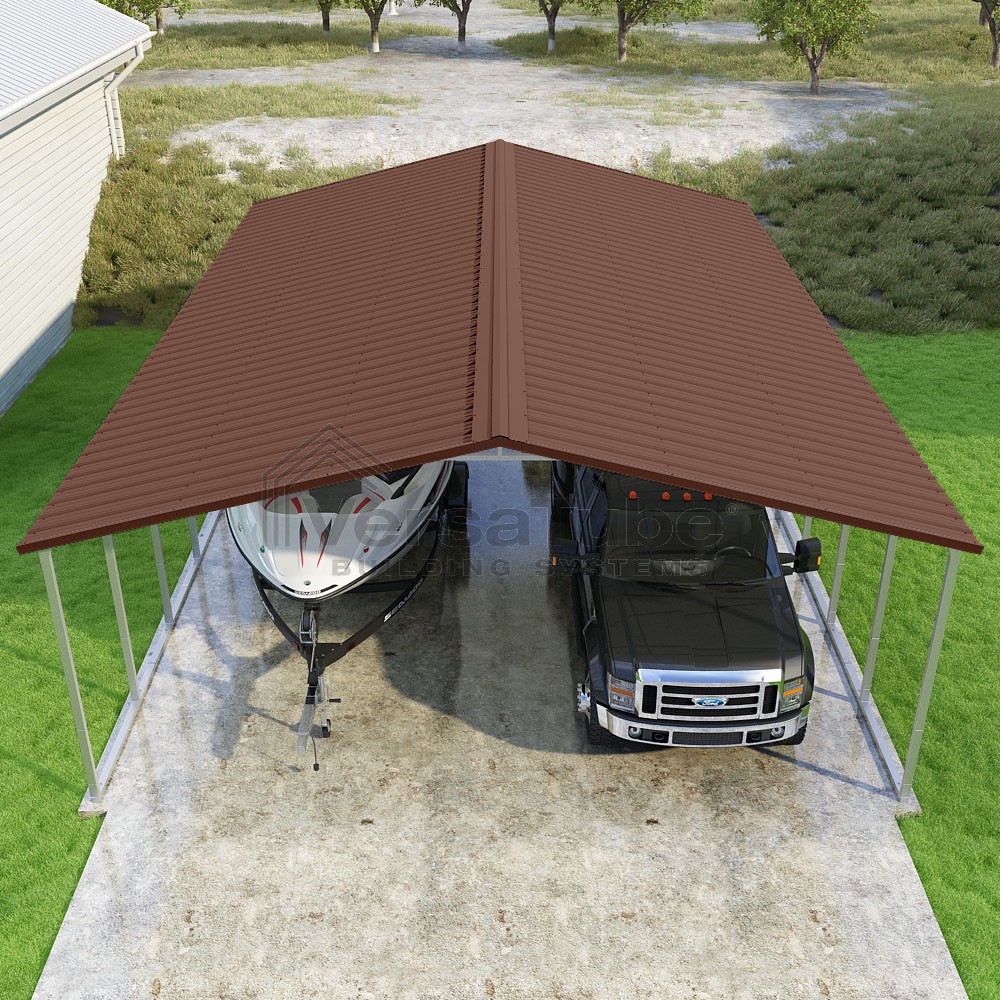 Pinnacle Series DIY carport kit features vertical sheet metal roof panels with ridge cap, gable and eave trim for an A-frame roof style and extended coverage on both ends.