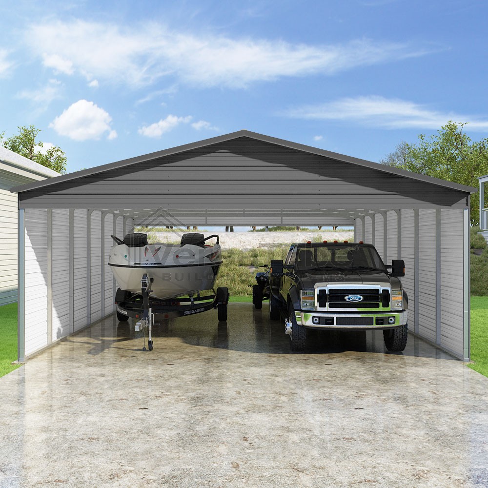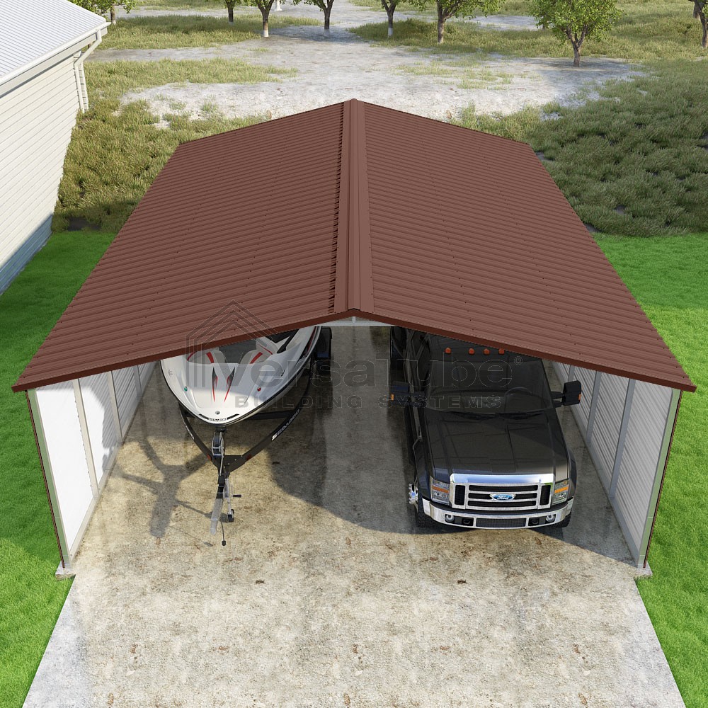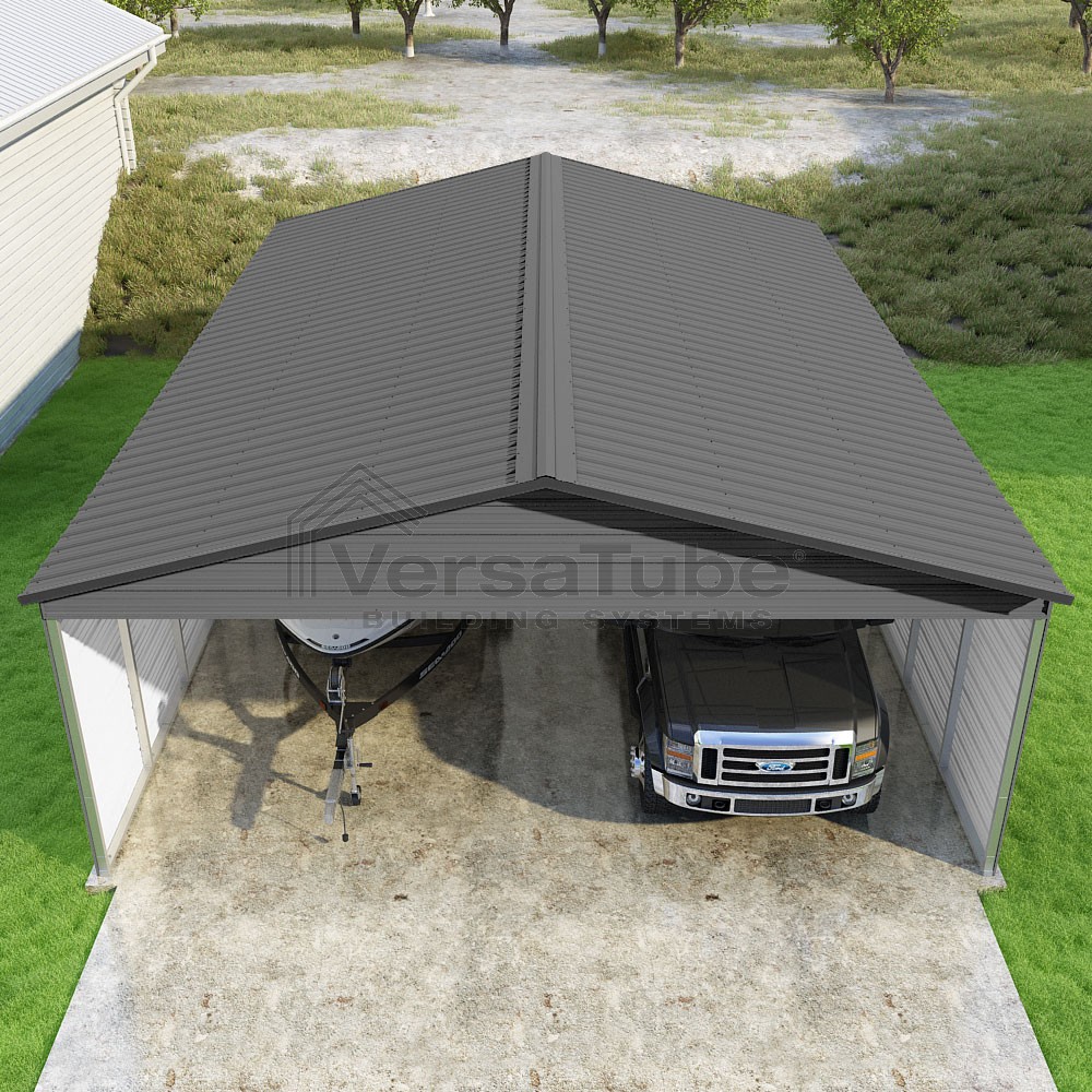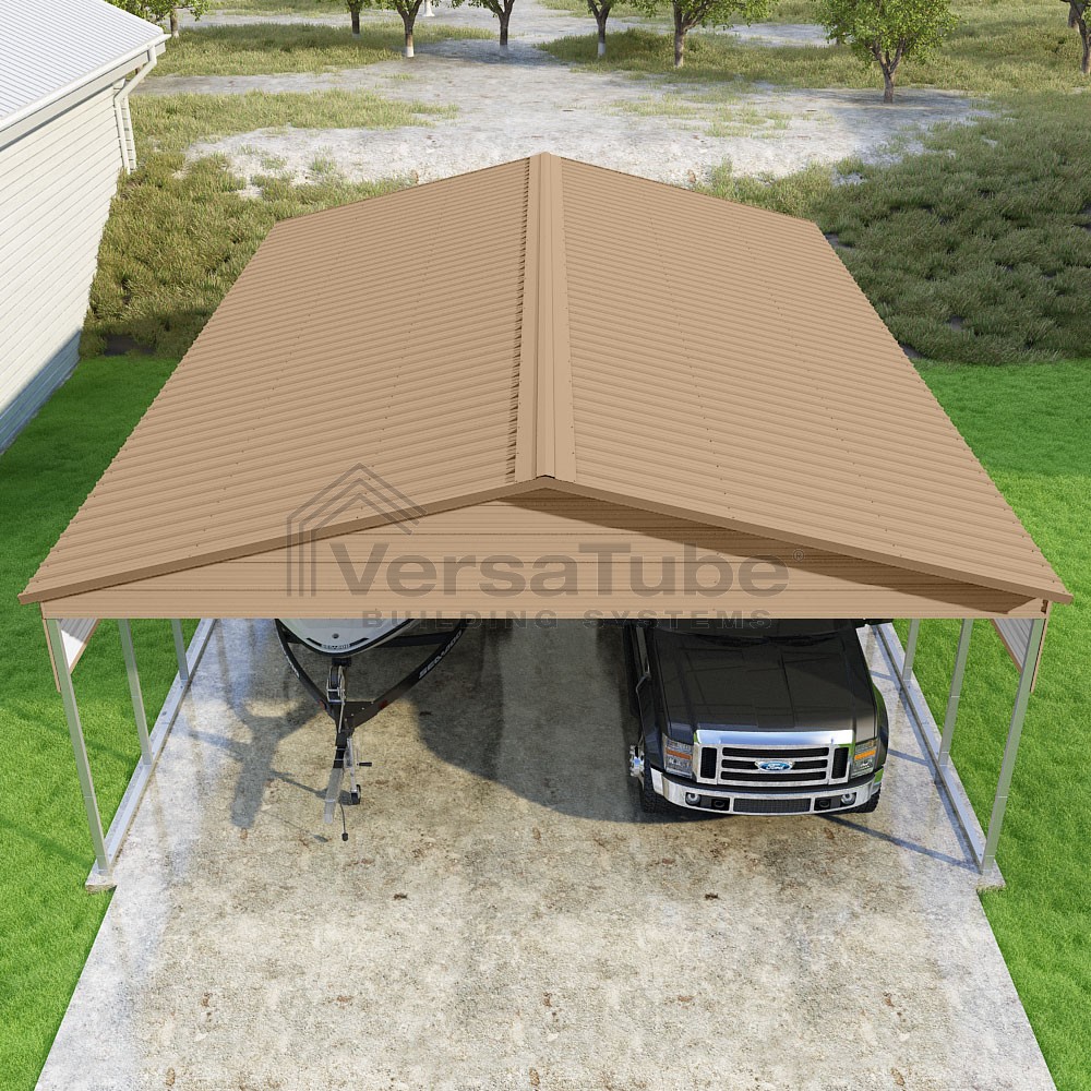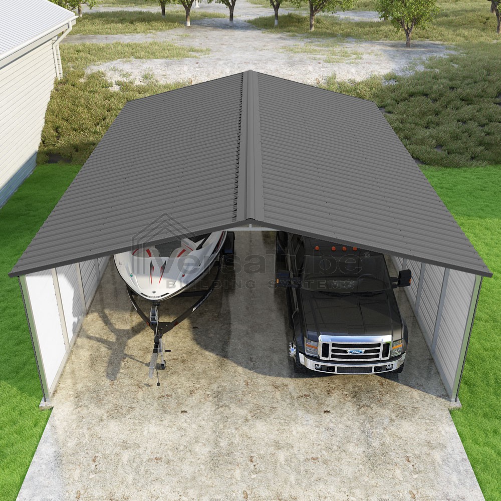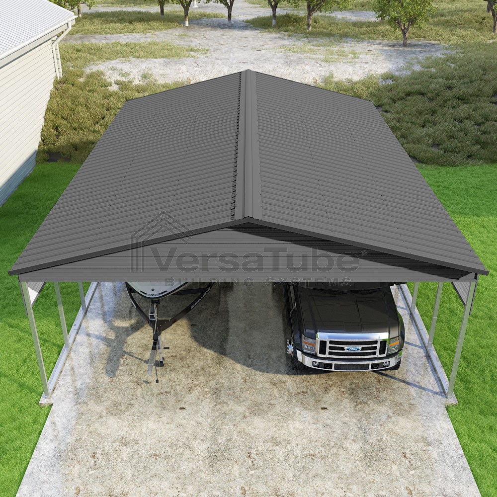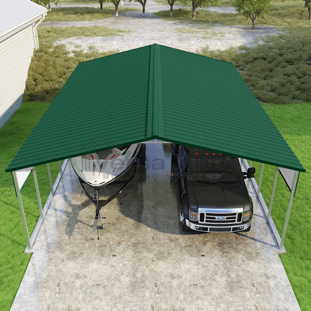 Pinnacle Series DIY carport kit features vertical sheet metal roof panels with ridge cap, gable and eave trim for an A-frame roof style and extended coverage on both ends.