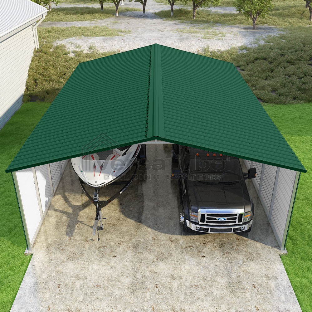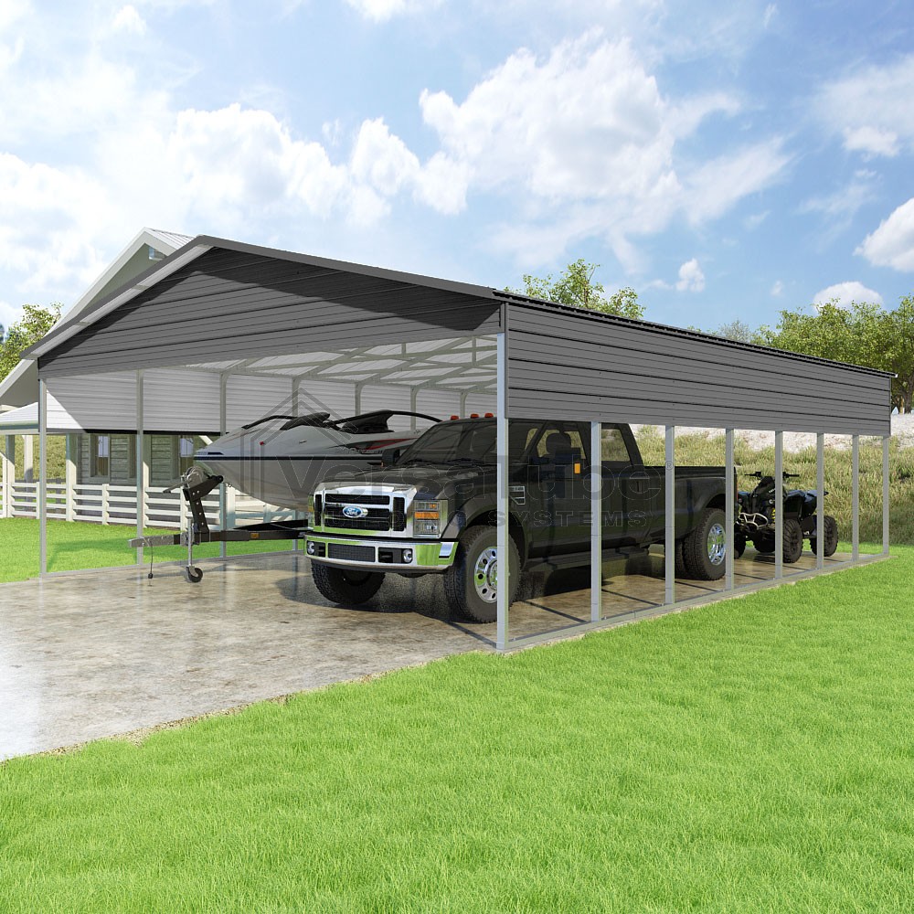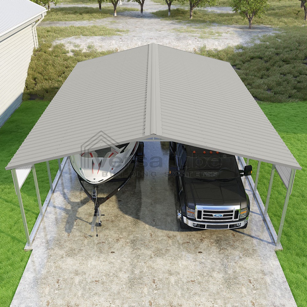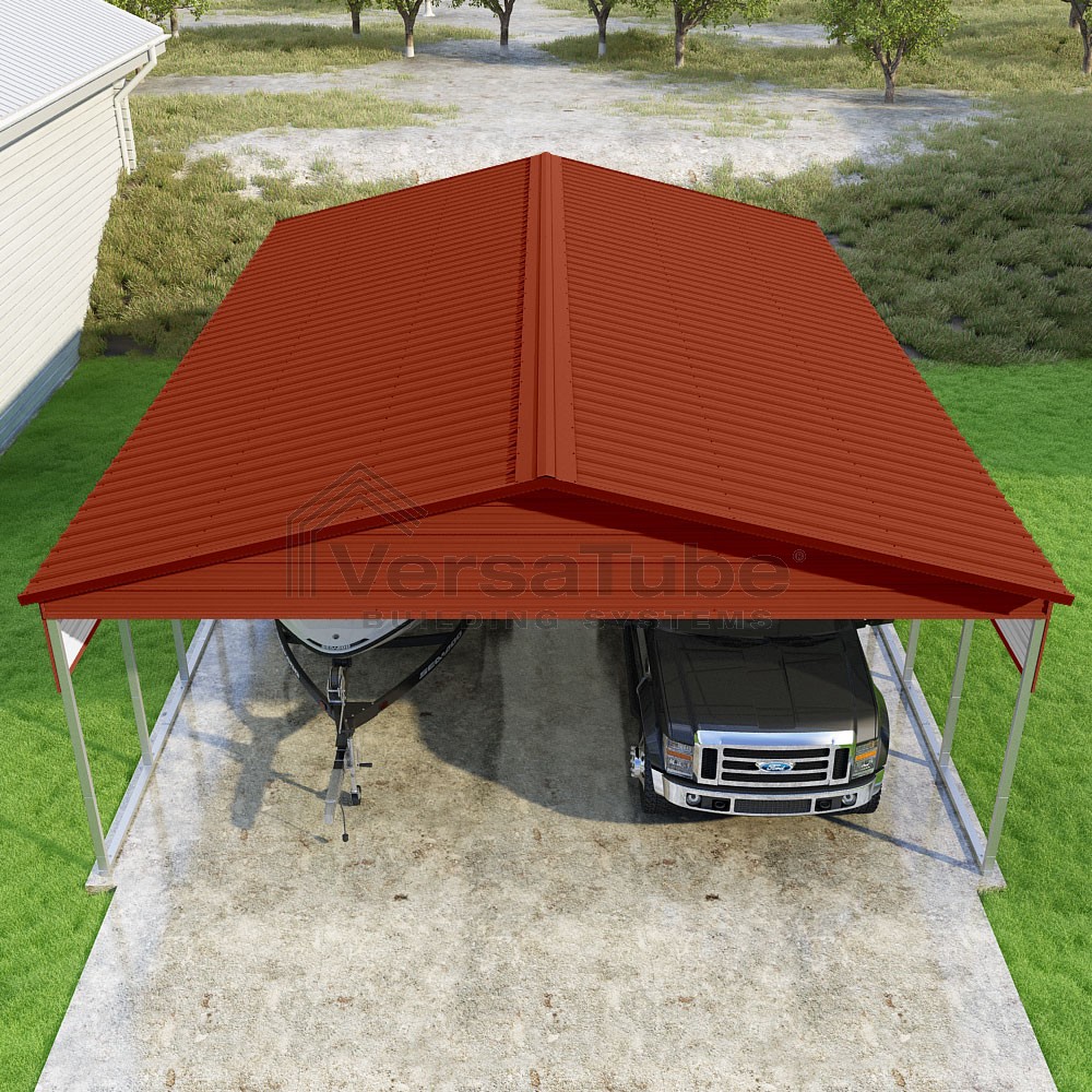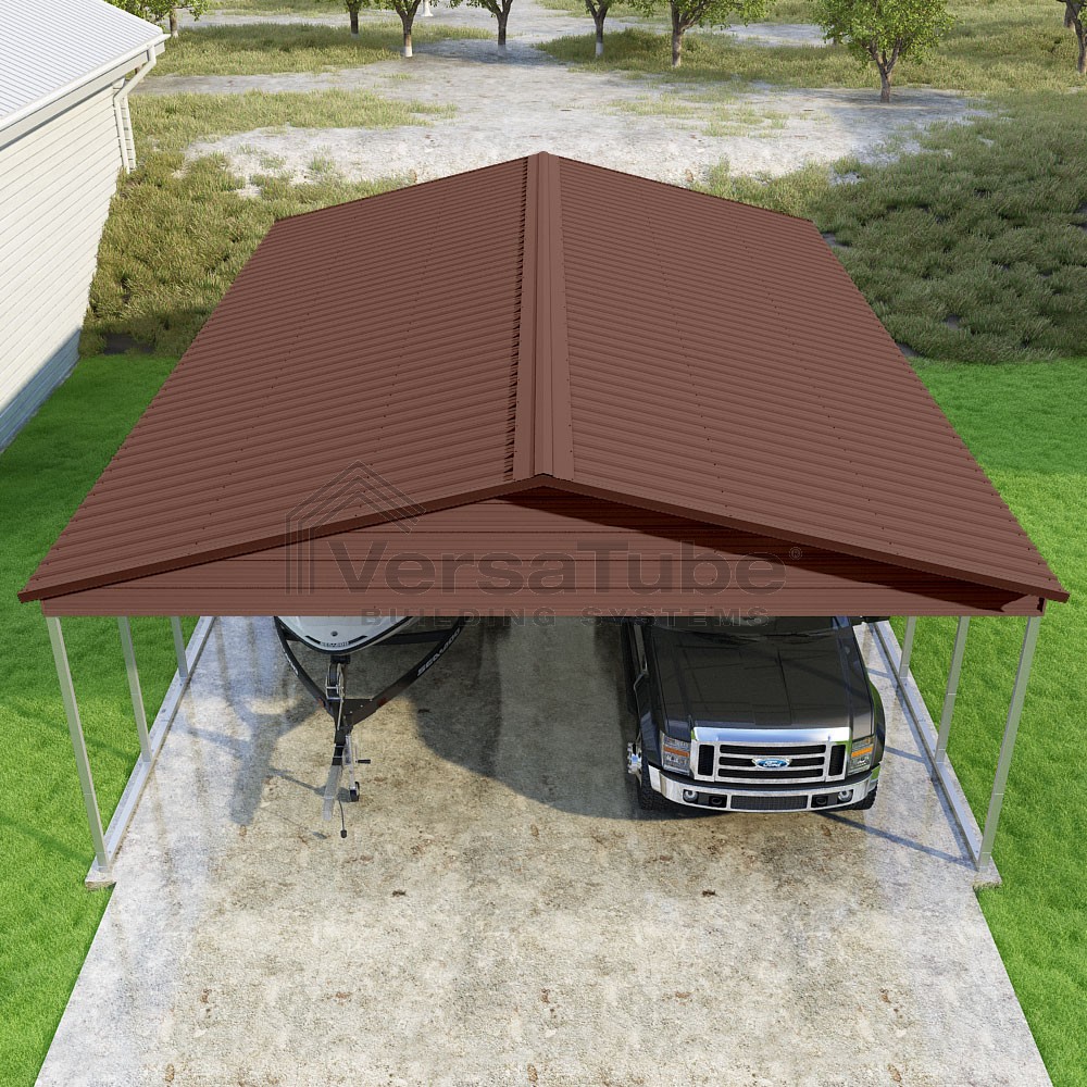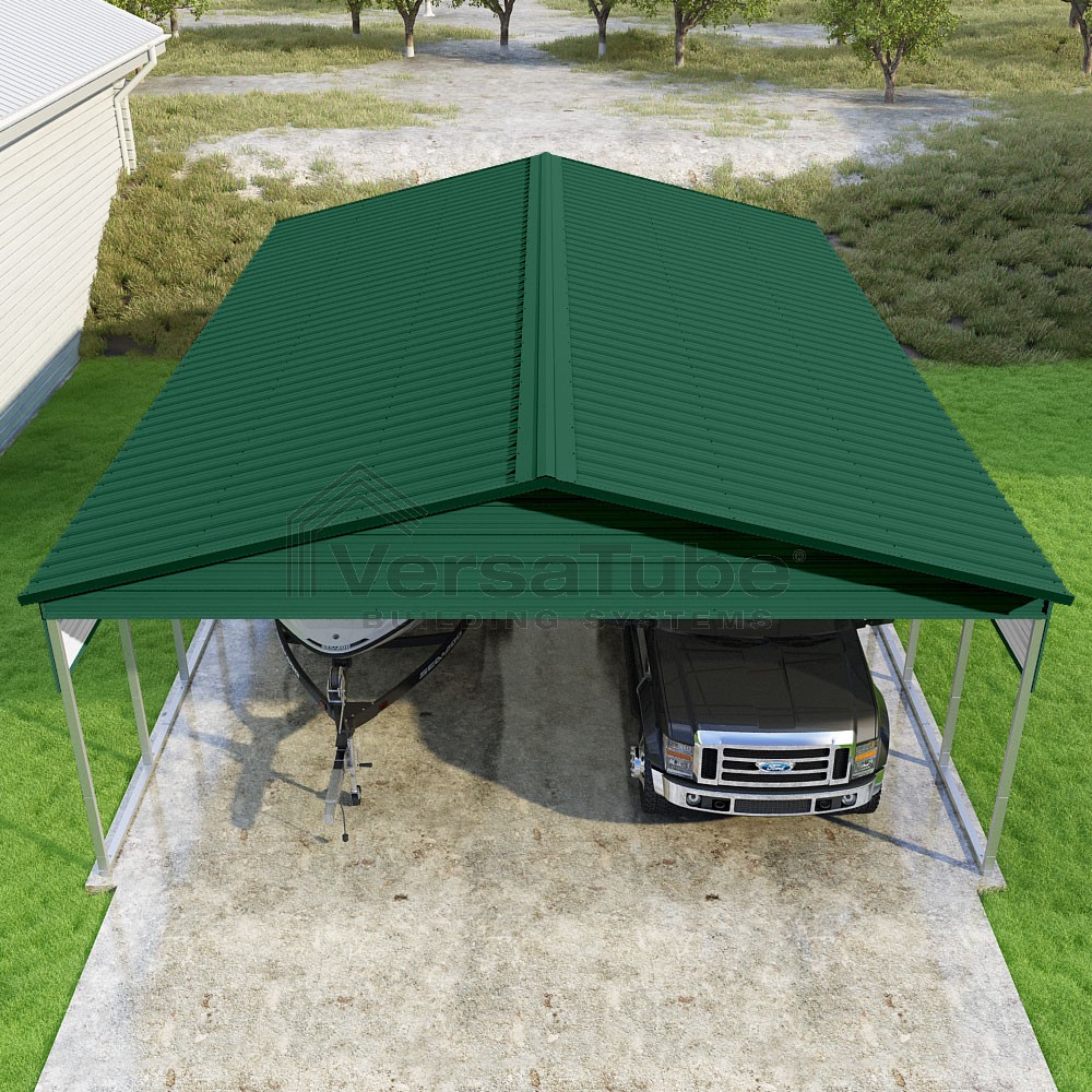 Pinnacle Series DIY carport kit features vertical sheet metal roof panels with ridge cap, gable and eave trim for an A-frame roof style and extended coverage on both ends.