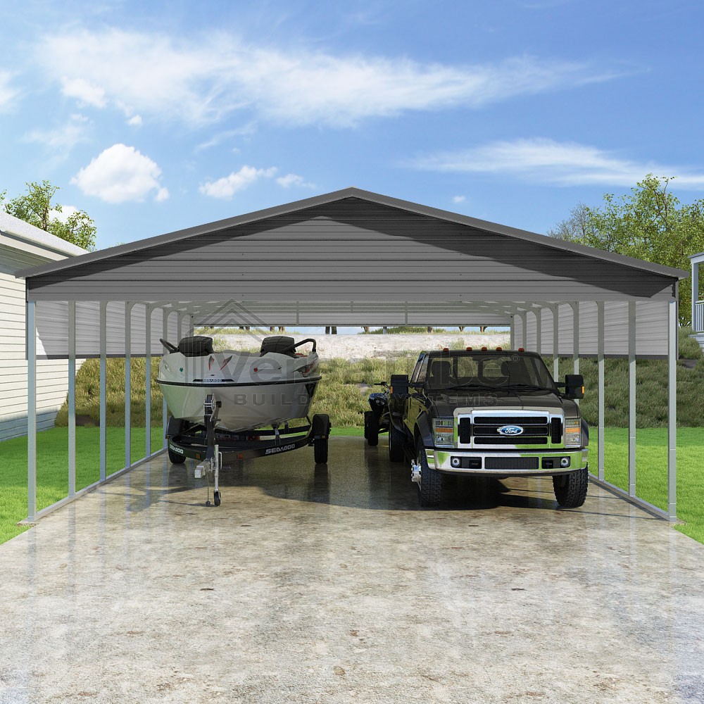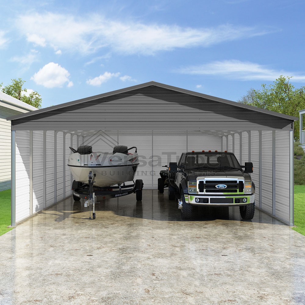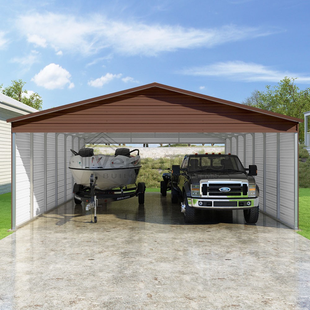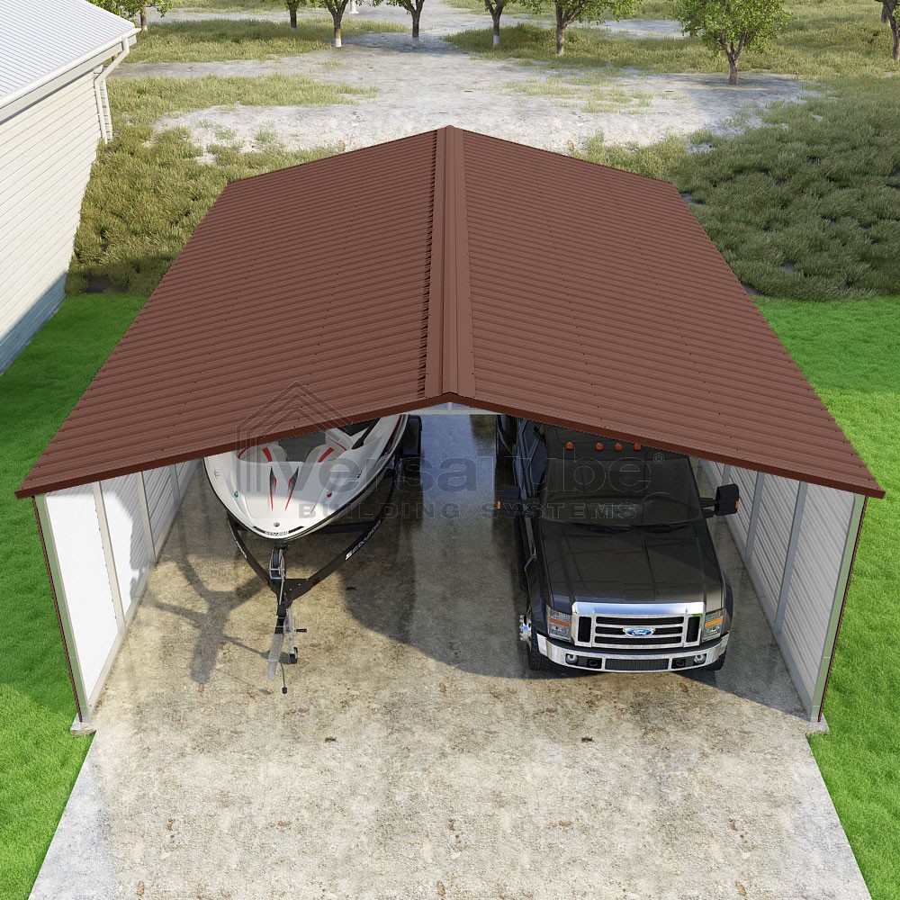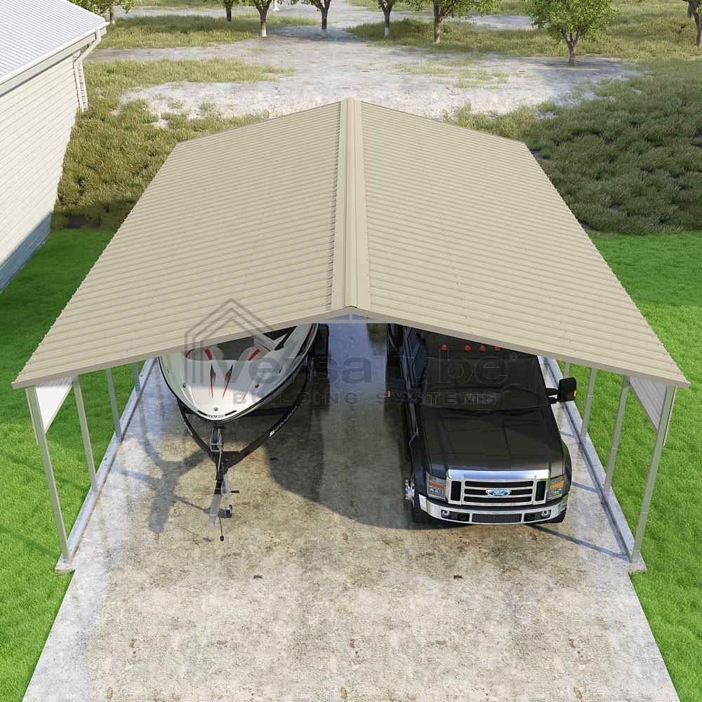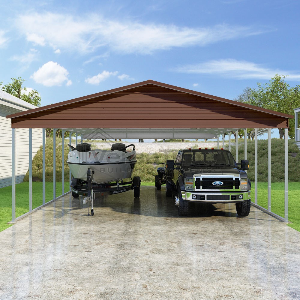 Pinnacle Series DIY carport kit features vertical sheet metal roof panels with ridge cap, gable and eave trim for an A-frame roof style and extended coverage on both ends.