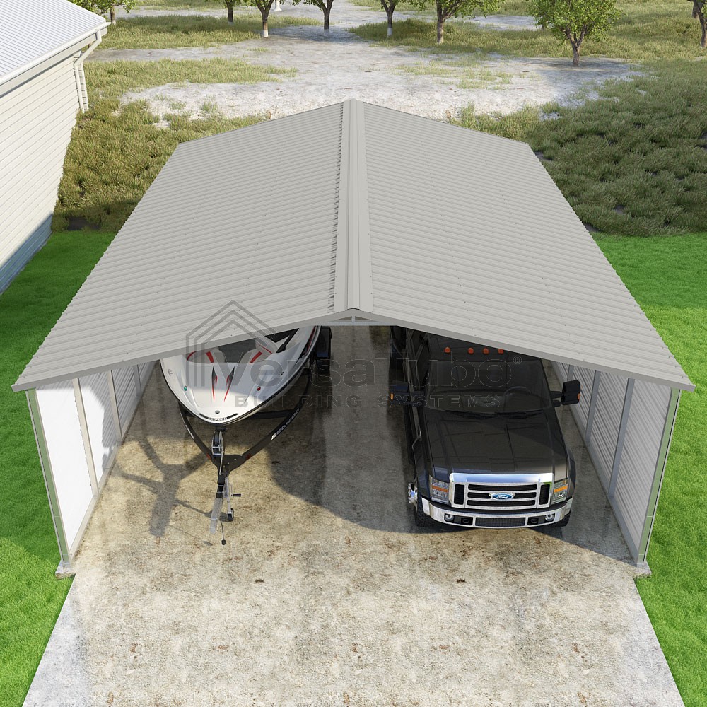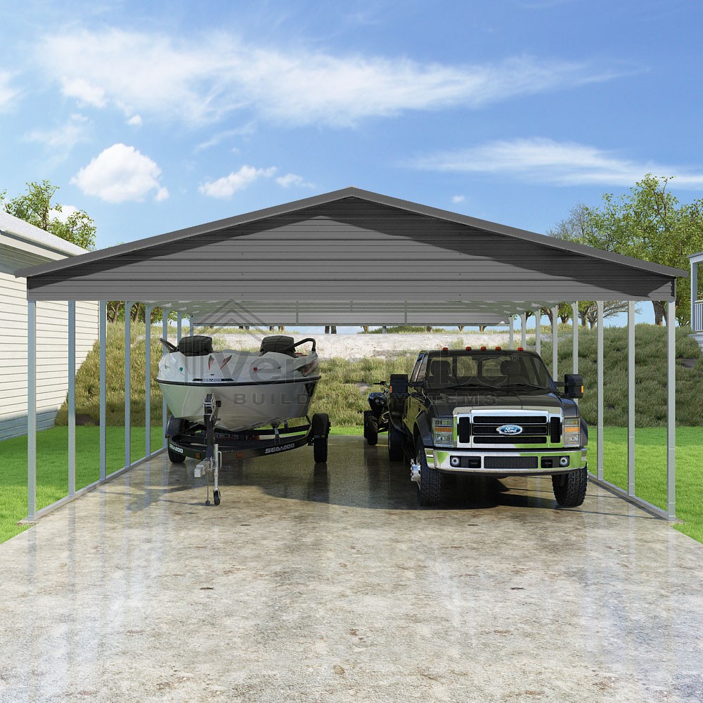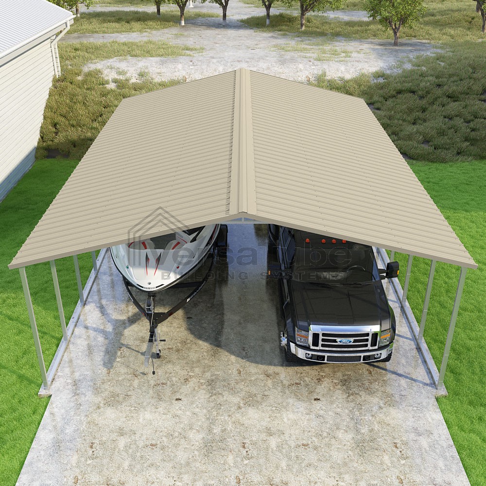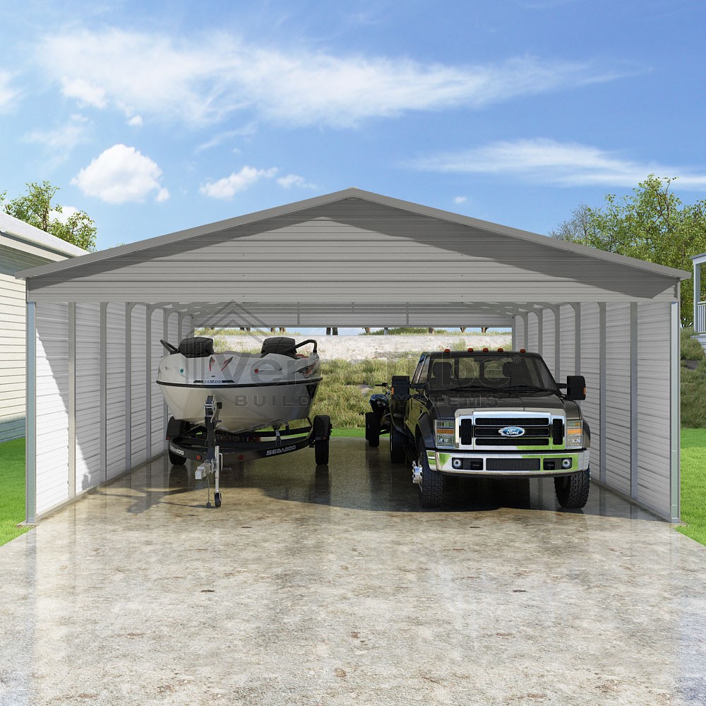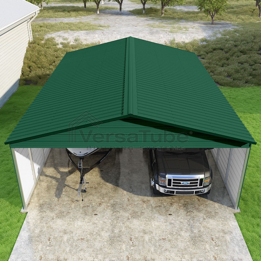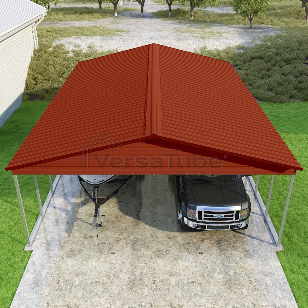 Pinnacle Series DIY carport kit features vertical sheet metal roof panels with ridge cap, gable and eave trim for an A-frame roof style and extended coverage on both ends.