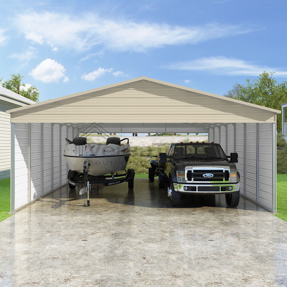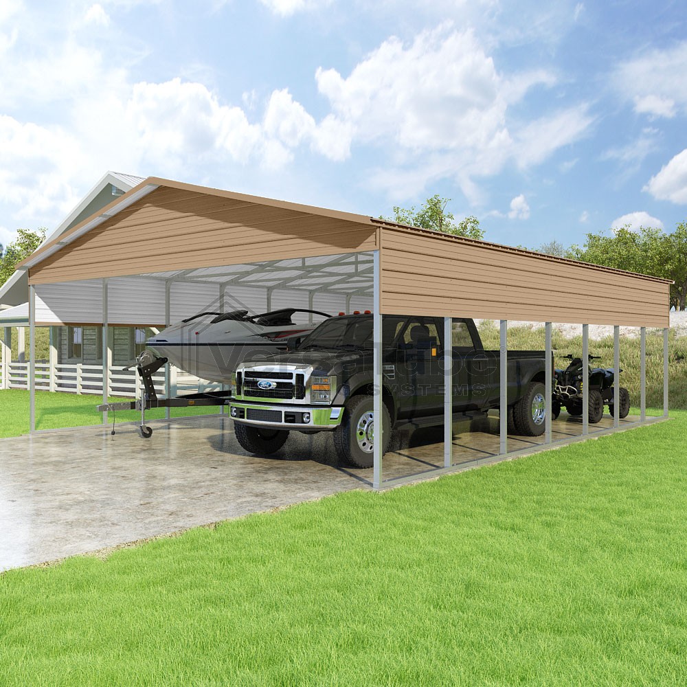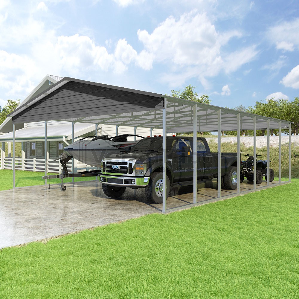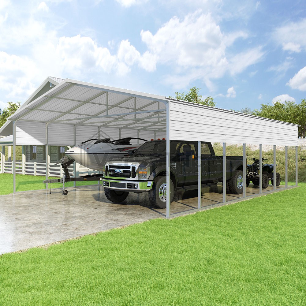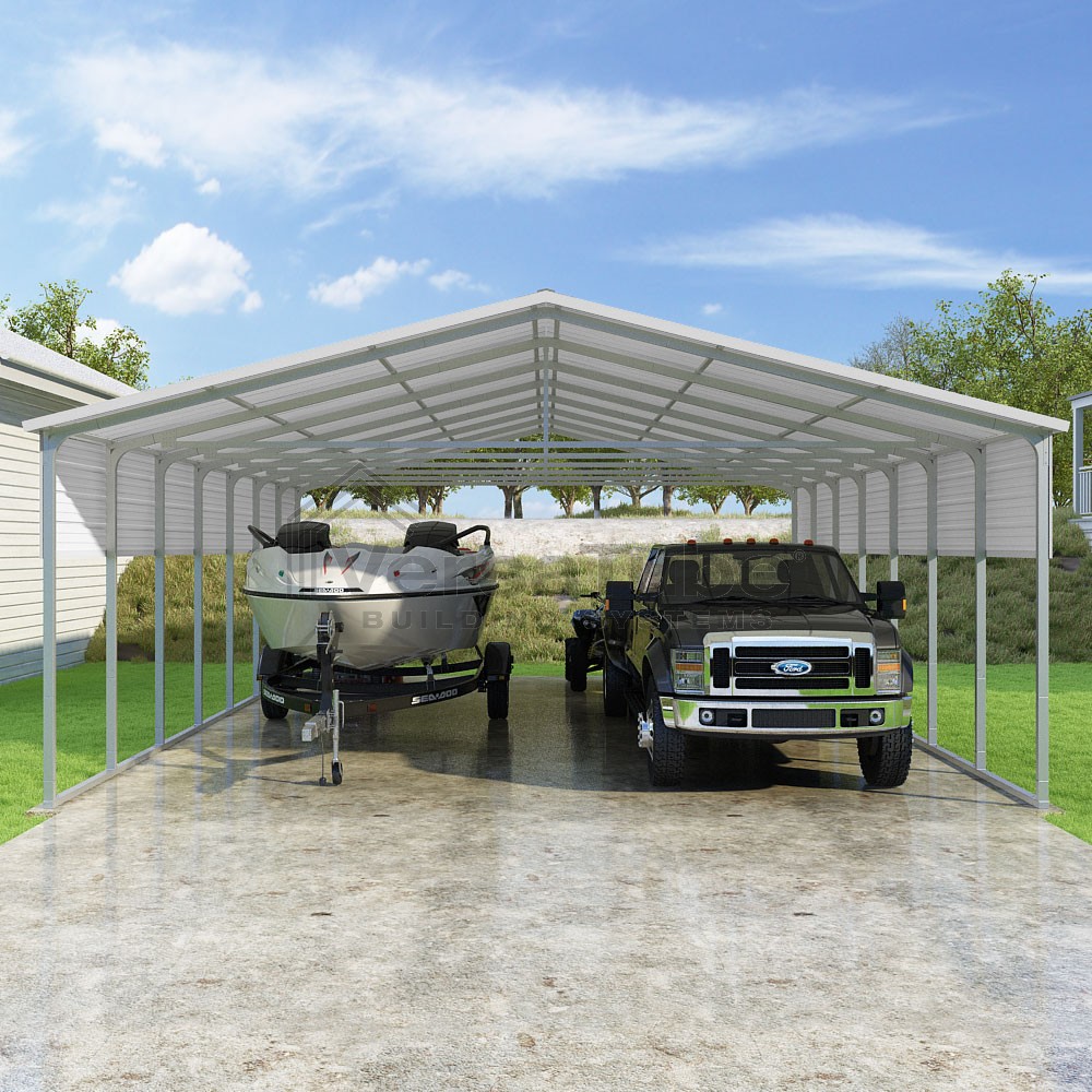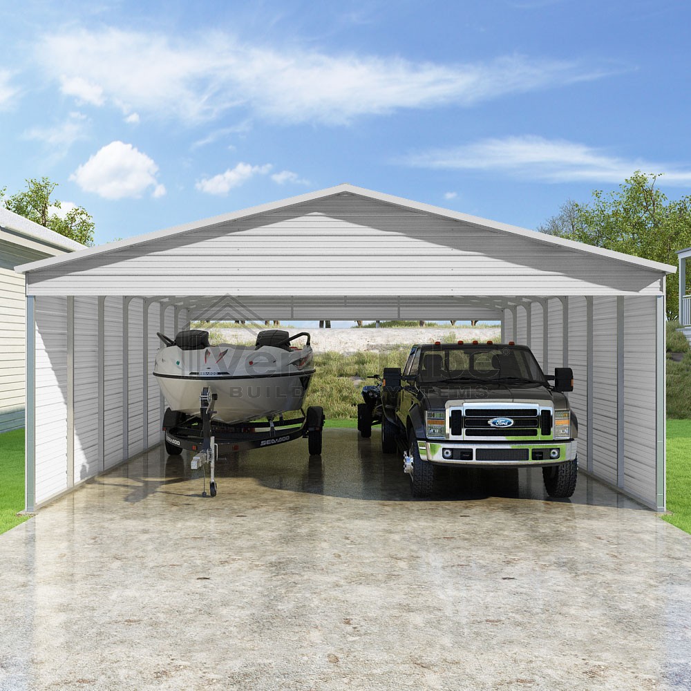 Pinnacle Series DIY carport kit features vertical sheet metal roof panels with ridge cap, gable and eave trim for an A-frame roof style and extended coverage on both ends.