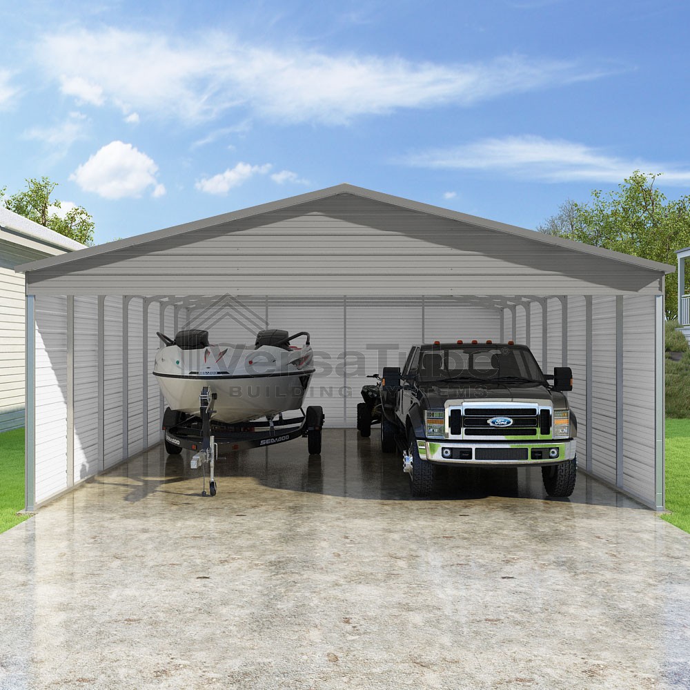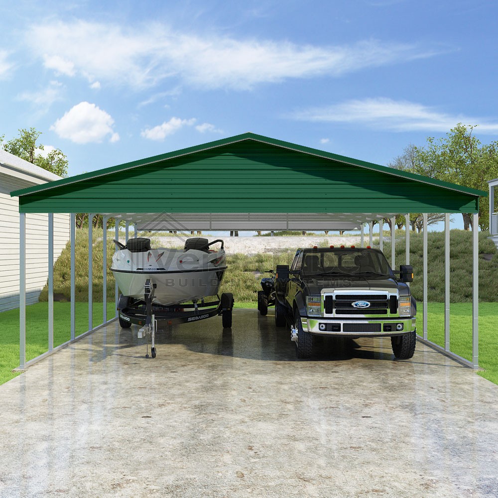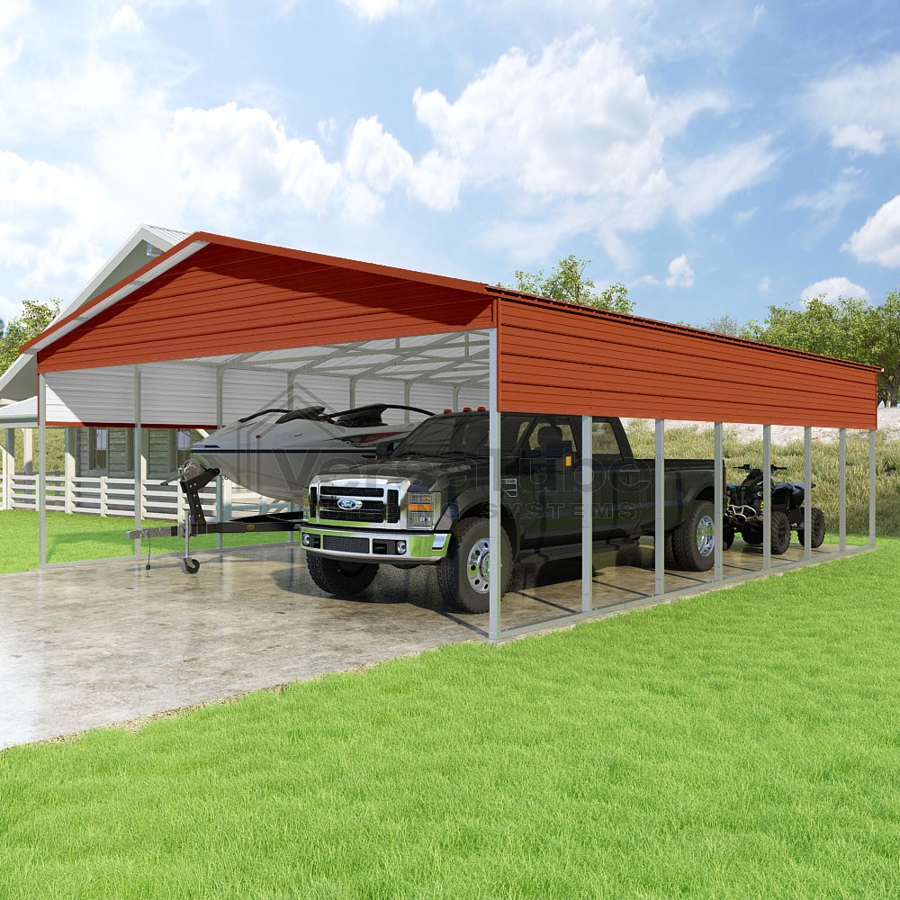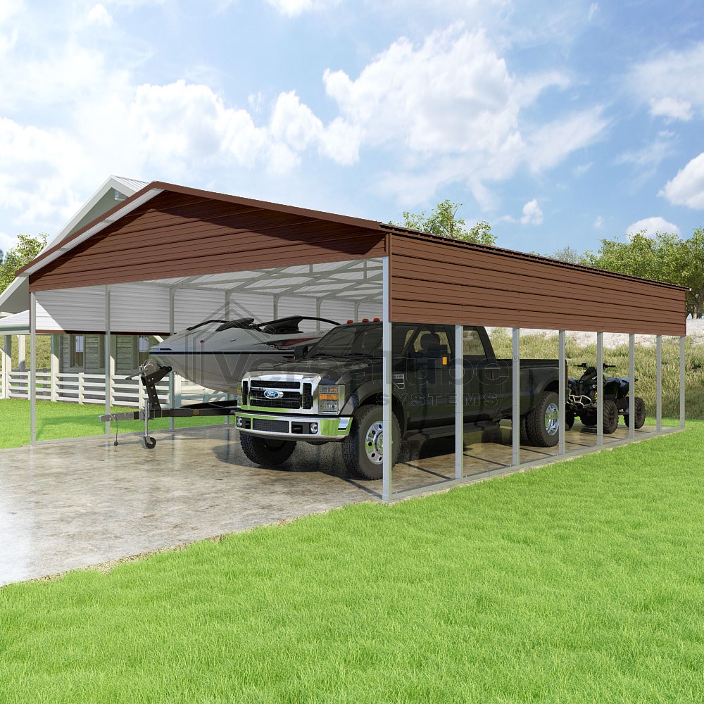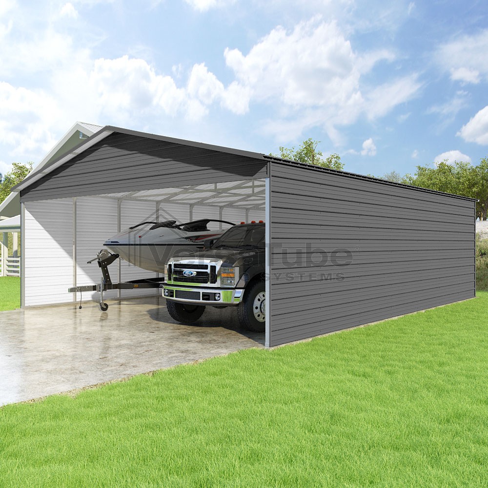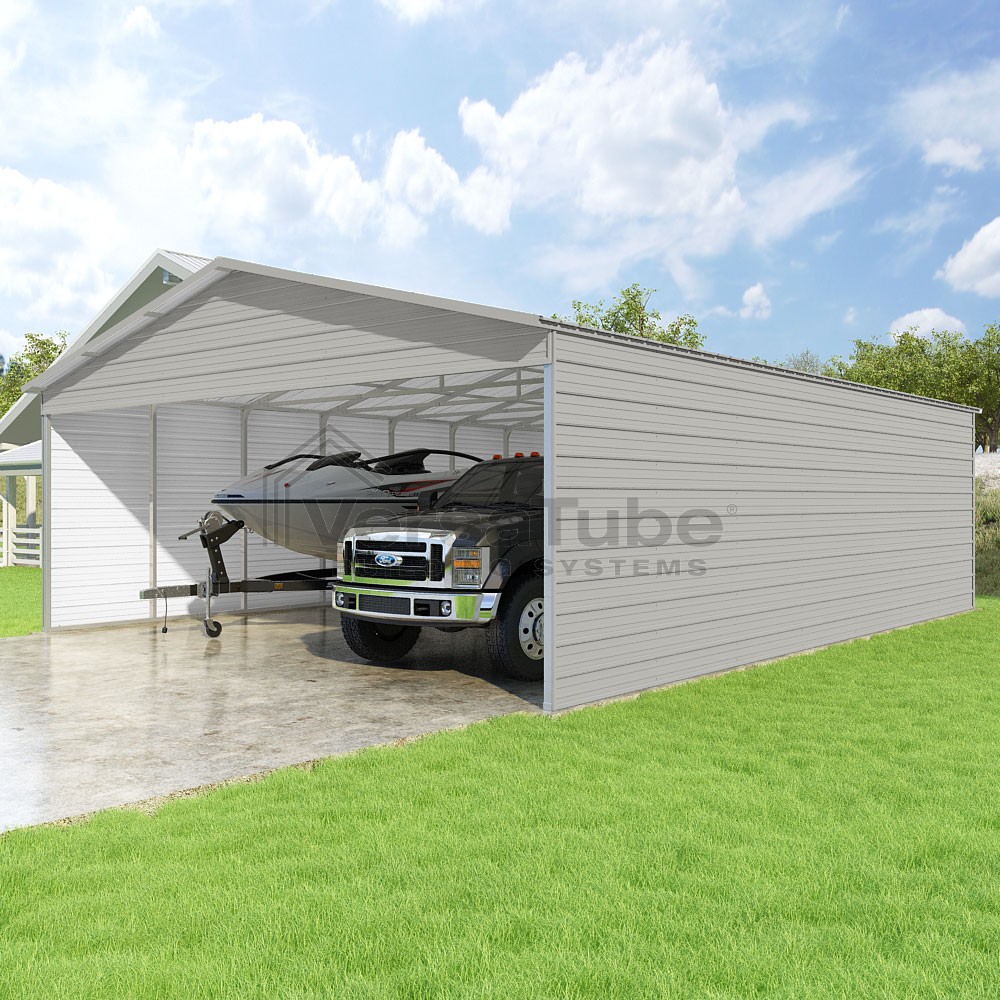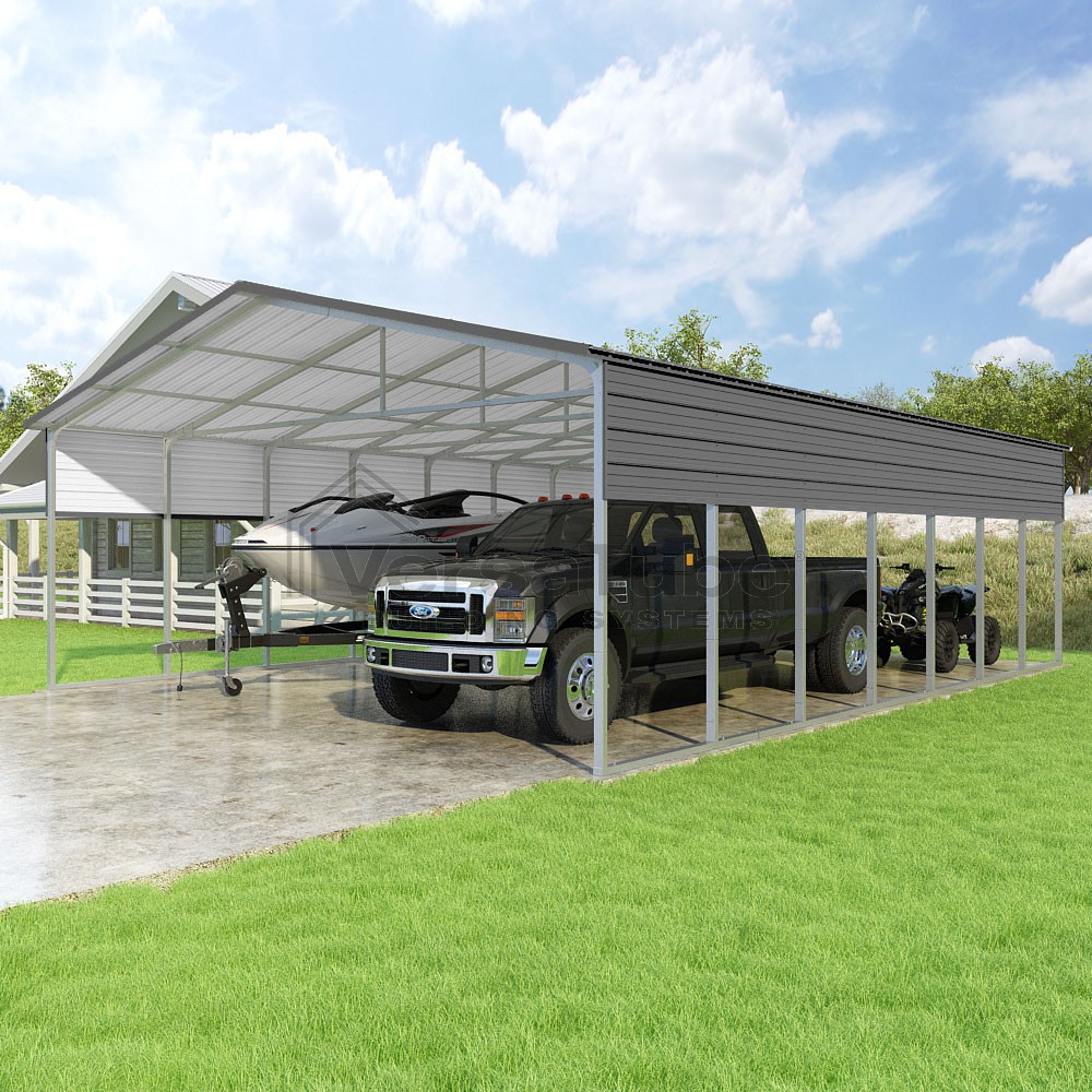 Pinnacle Series DIY carport kit features vertical sheet metal roof panels with ridge cap, gable and eave trim for an A-frame roof style and extended coverage on both ends.
