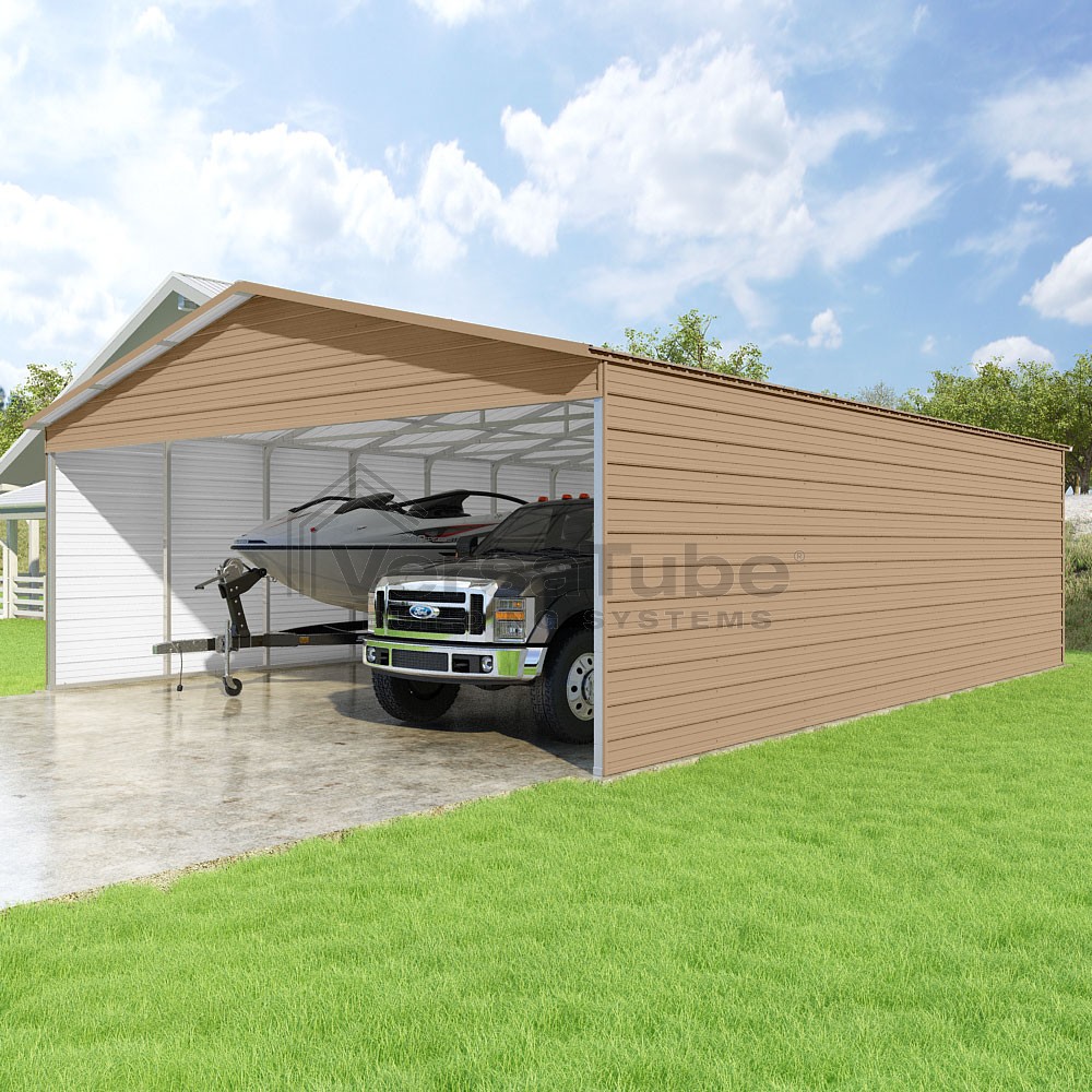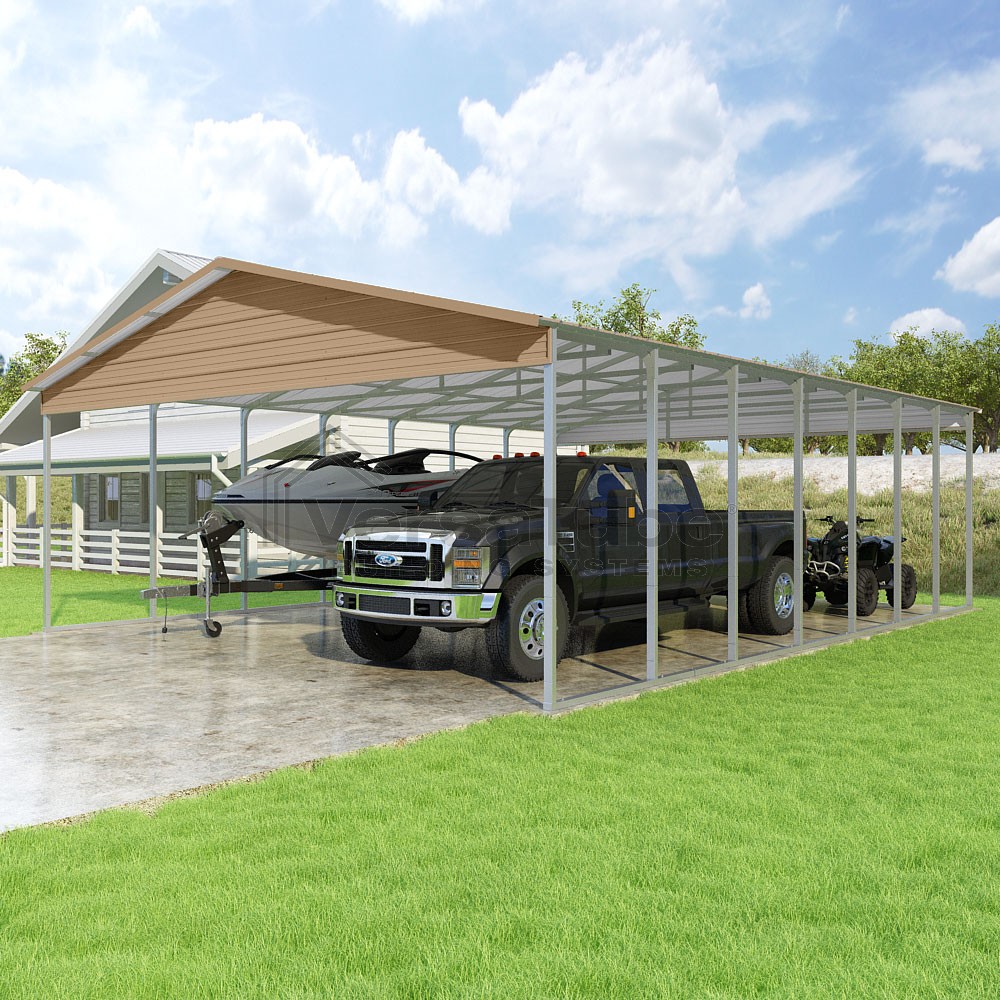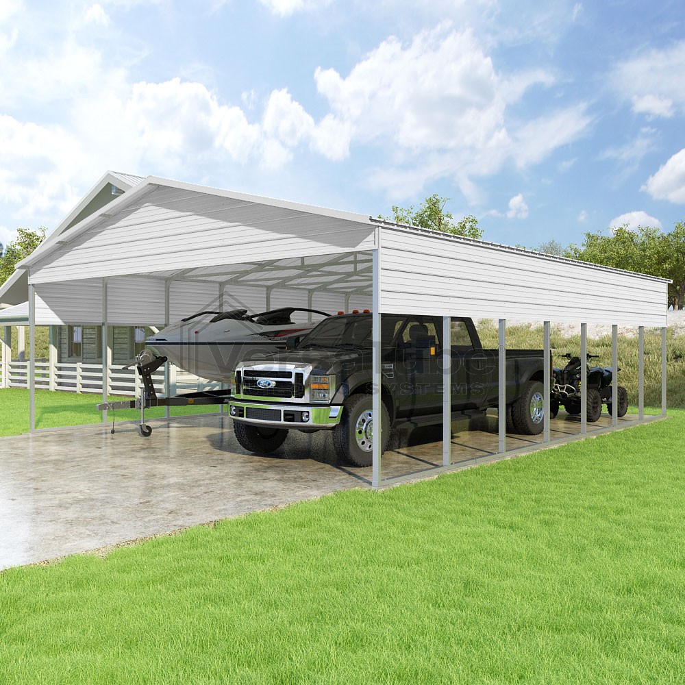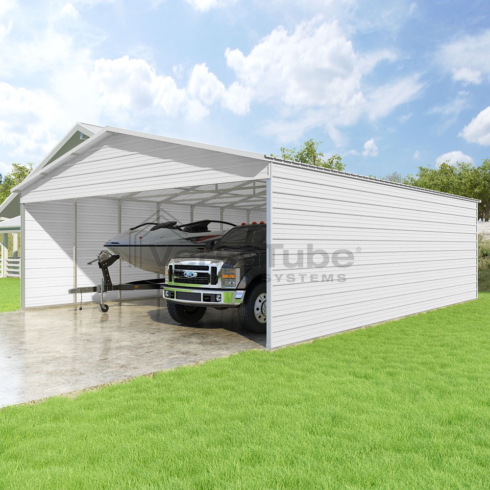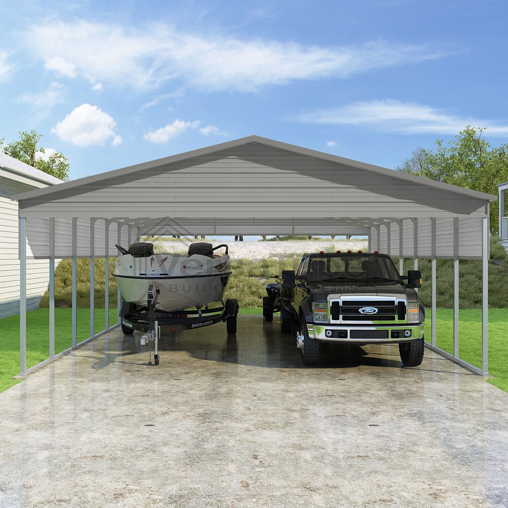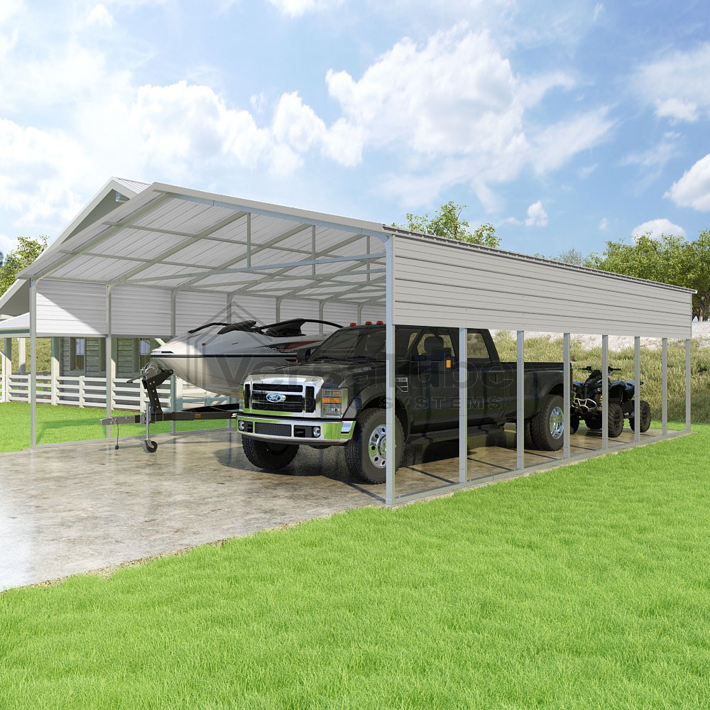 Pinnacle Series DIY carport kit features vertical sheet metal roof panels with ridge cap, gable and eave trim for an A-frame roof style and extended coverage on both ends.