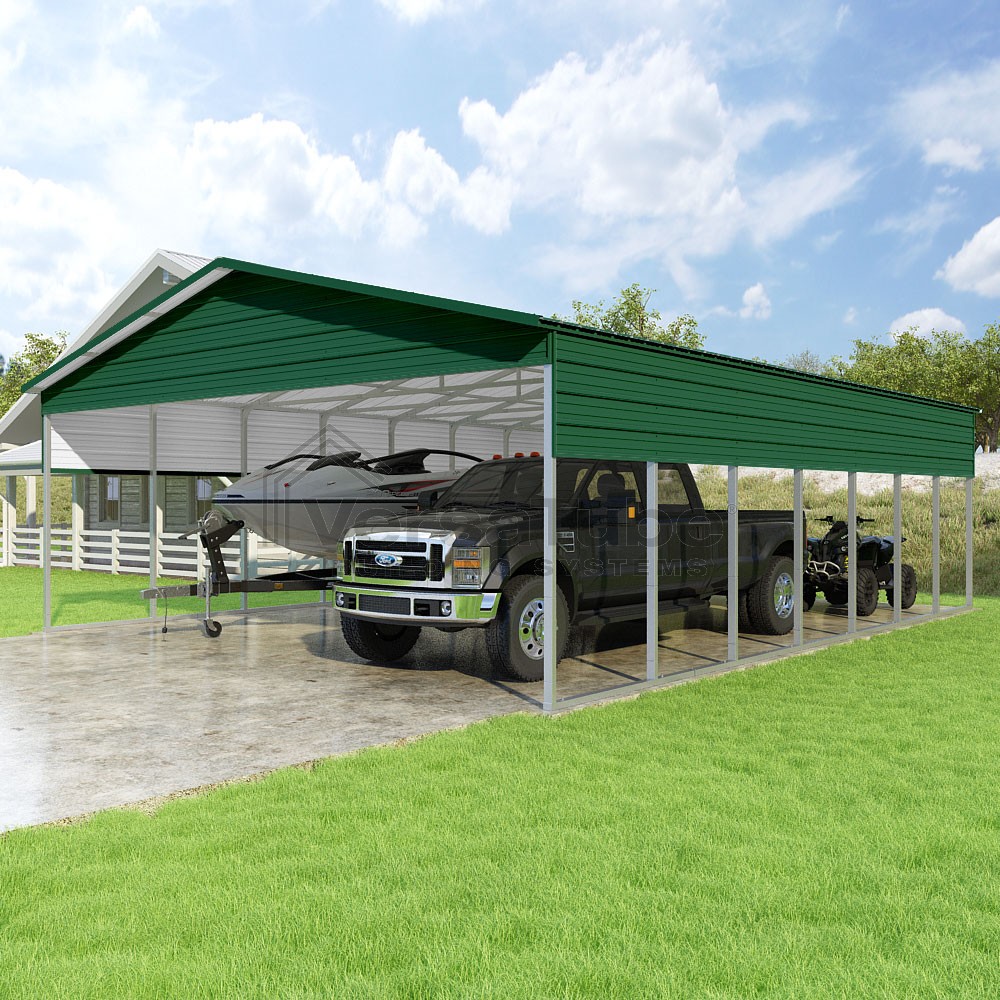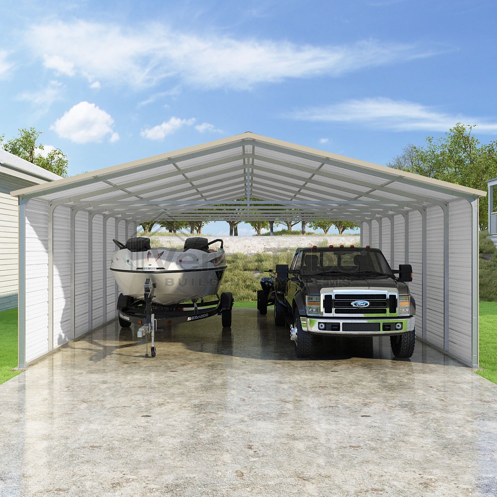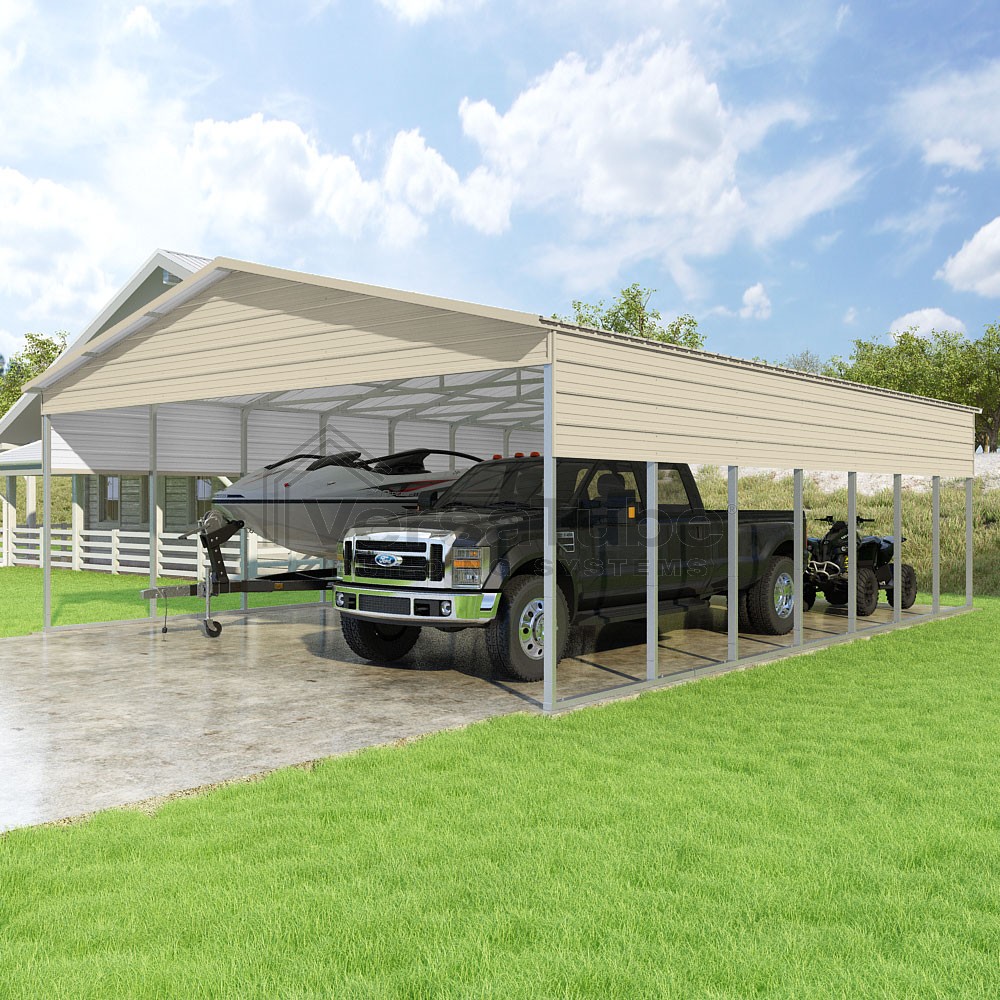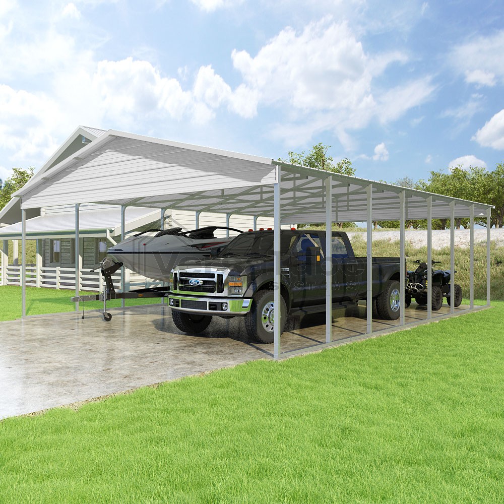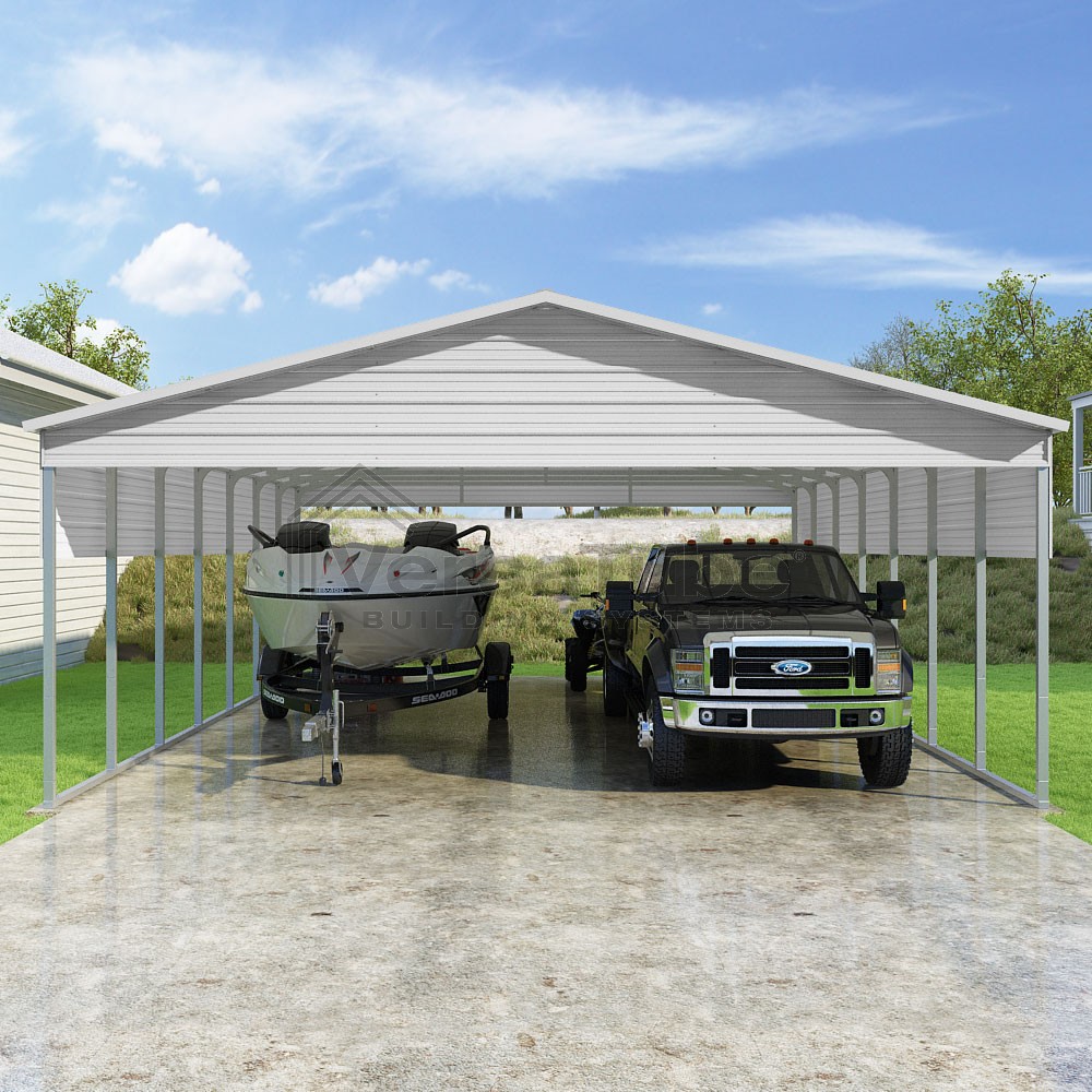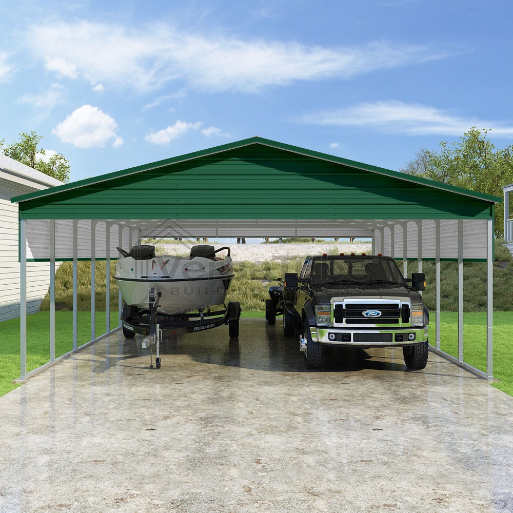Pinnacle Series DIY carport kit features vertical sheet metal roof panels with ridge cap, gable and eave trim for an A-frame roof style and extended coverage on both ends.